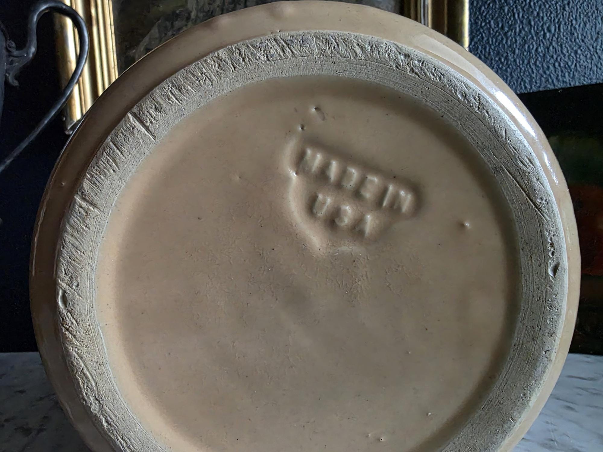 The base is clearly marked with an impressed "MADE IN USA" stamp, identifying it as an authentic piece of domestic pottery, likely from the mid-20th century. The bowl is in excellent vintage condition, showing minimal surface wear and an attractive, light speckled patina on the interior that only adds to its historical character. With no visible cracks or structural repairs, this robust stoneware piece is a perfect addition for collectors of McCoy, Robinson Ransbottom, or general Ohio-valley pottery, as well as anyone looking to add a touch of rustic, "Cottagecore" charm to their modern kitchen.
