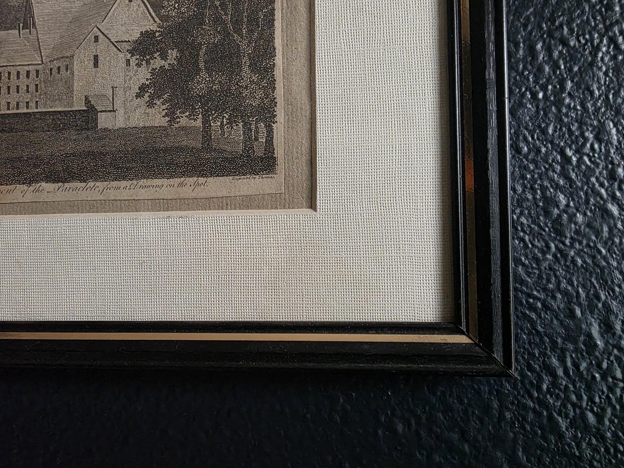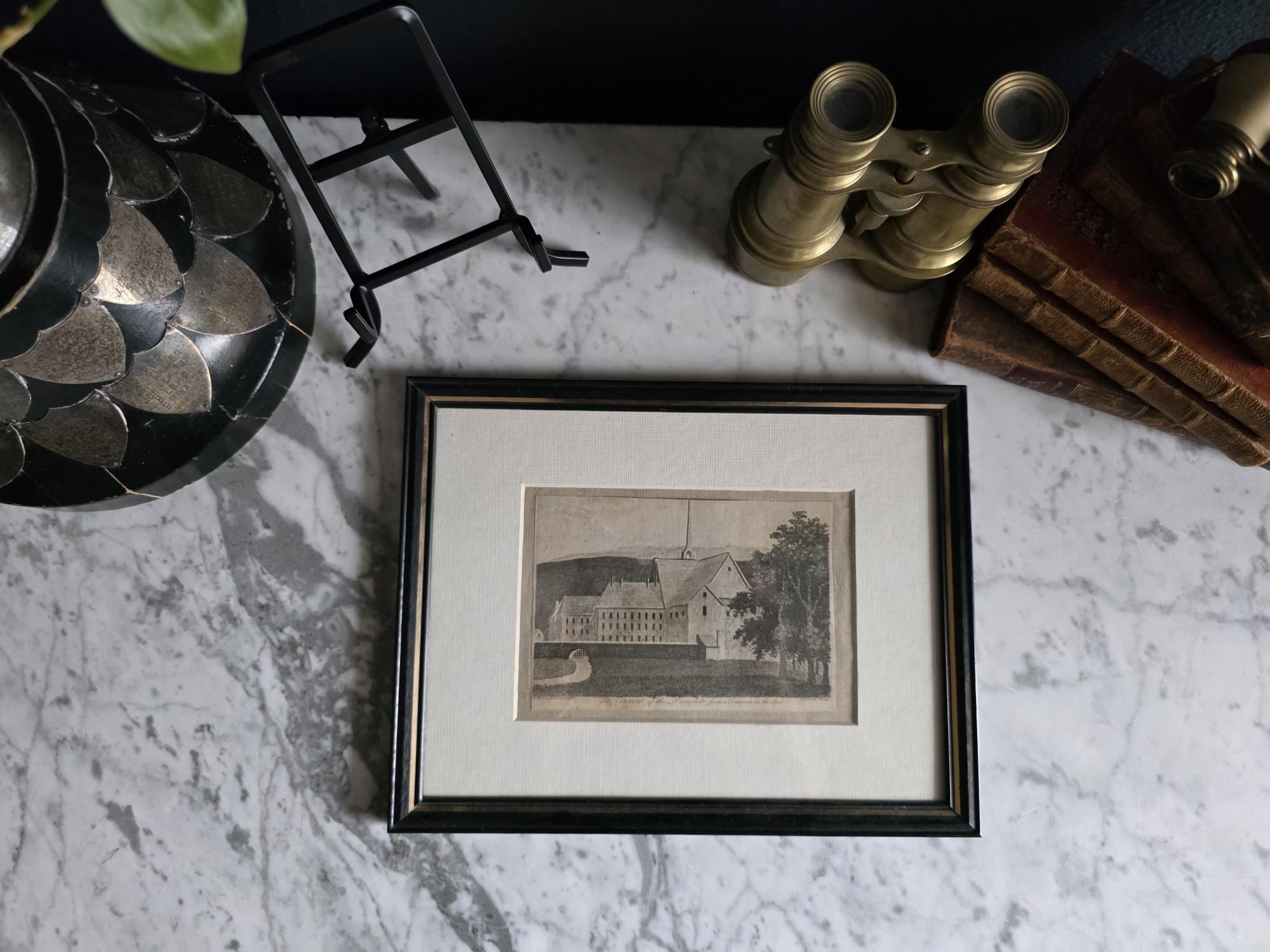 The engraving is housed in a handsome vintage black metal frame with a delicate gold-toned inner lip that provides a sophisticated contrast. It is professionally matted with a textured, neutral-toned fabric mat that adds depth and a tactile quality to the presentation. The combination of the 18th-century paper and the mid-century style framing makes it a versatile piece that bridges the gap between traditional and modern decor. It is ready to display and would be a scholarly addition to a gallery wall, a library, or an office. This piece can be displayed in an easel or hang from the metal frame structure.