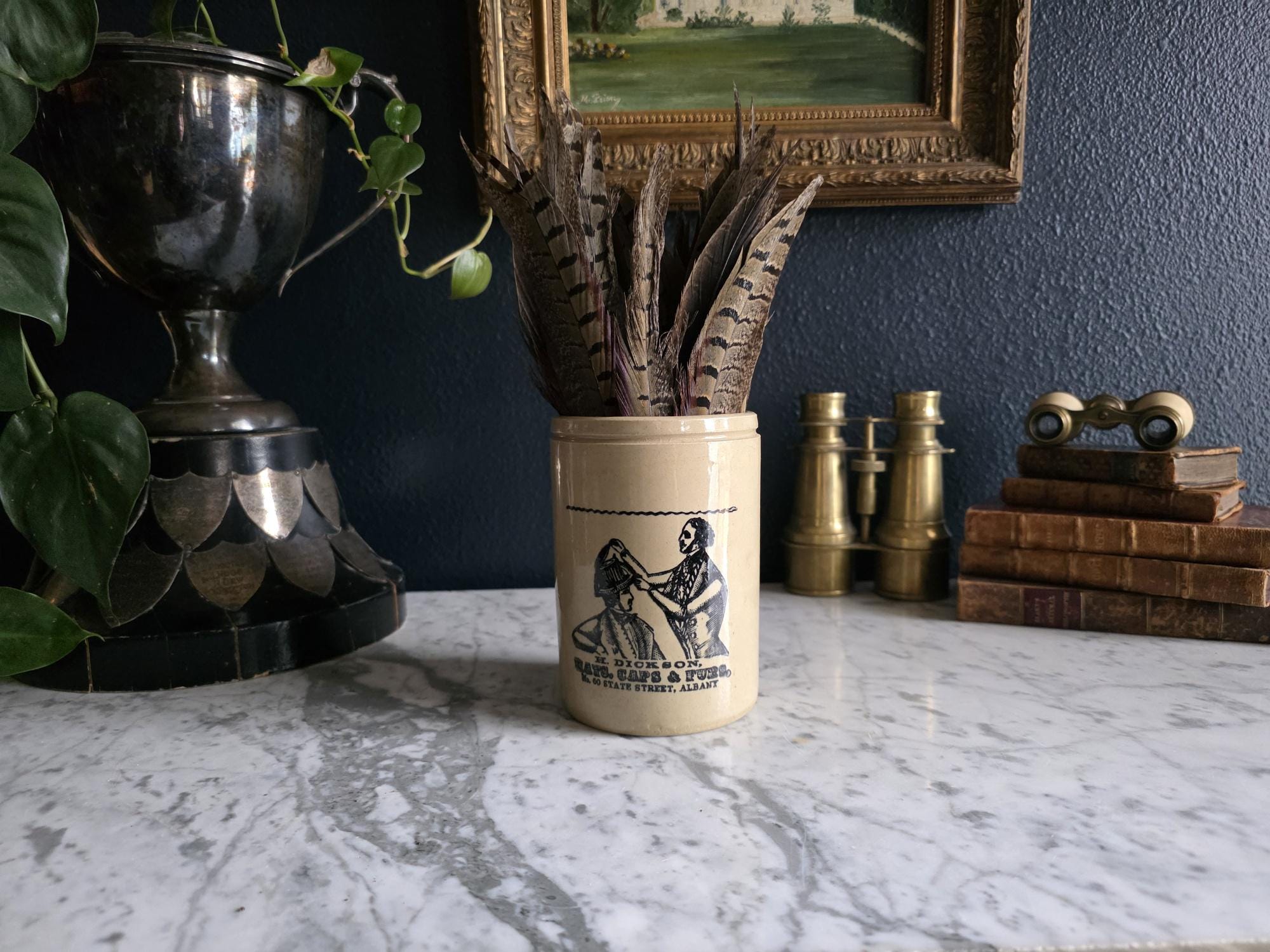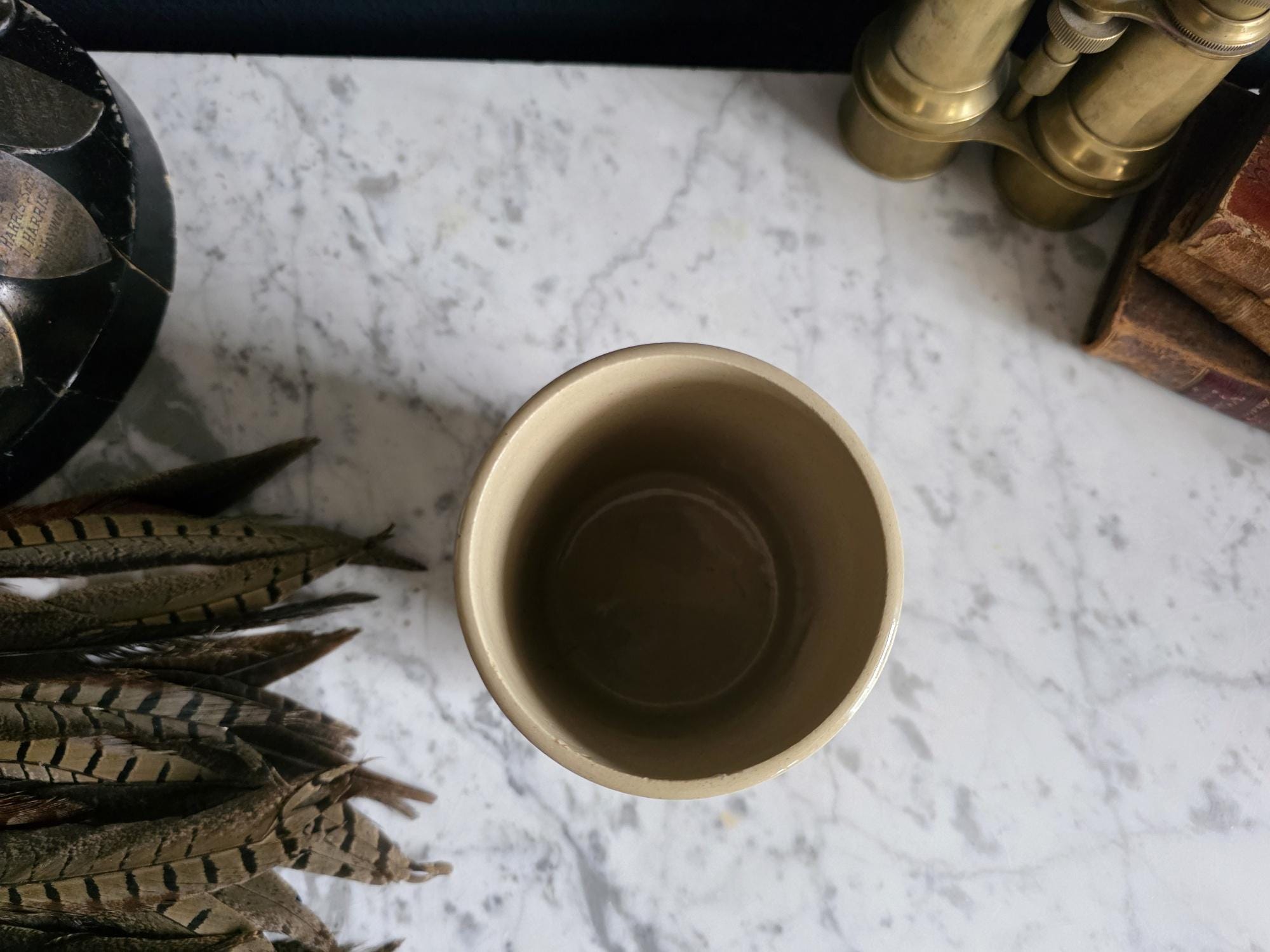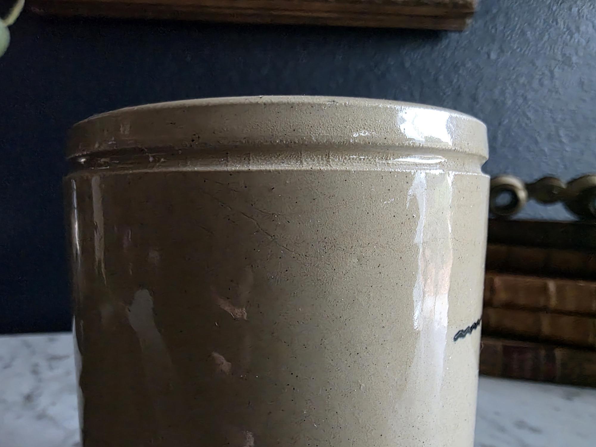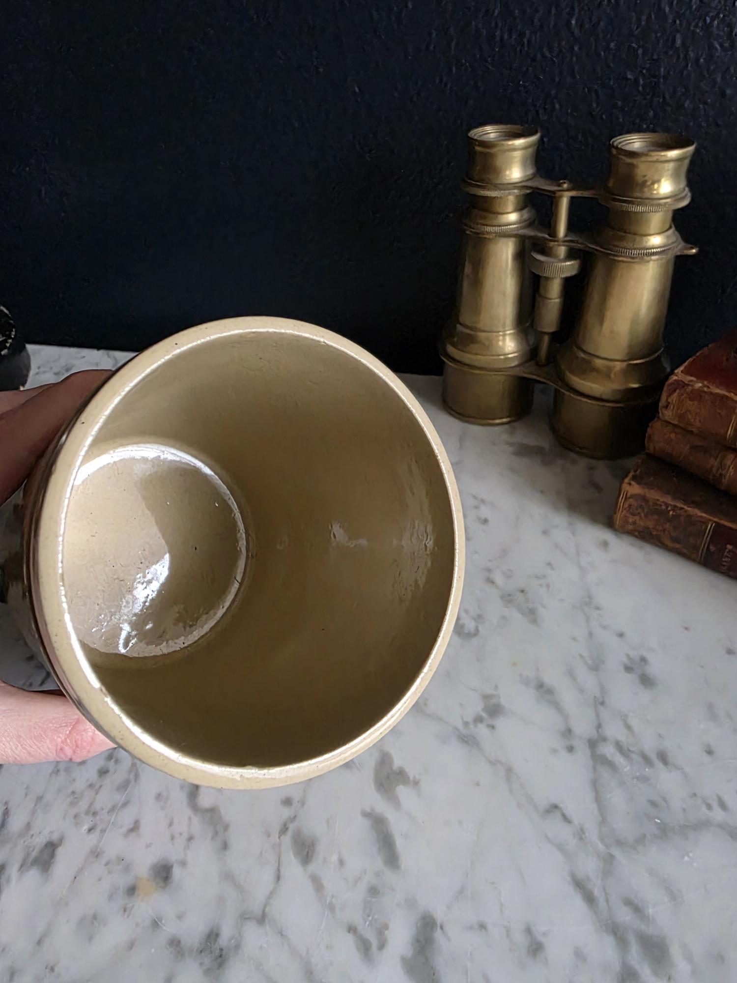 This versatile crock is an ideal addition to a curated bookshelf, a primitive kitchen display, or a gentleman’s dressing room. It serves beautifully as a unique vessel for pheasant feathers or dried botanicals, a sophisticated holder for desk accessories, or simply as a conversation-starting accent piece that bridges the gap between industrial utility and vintage charm.