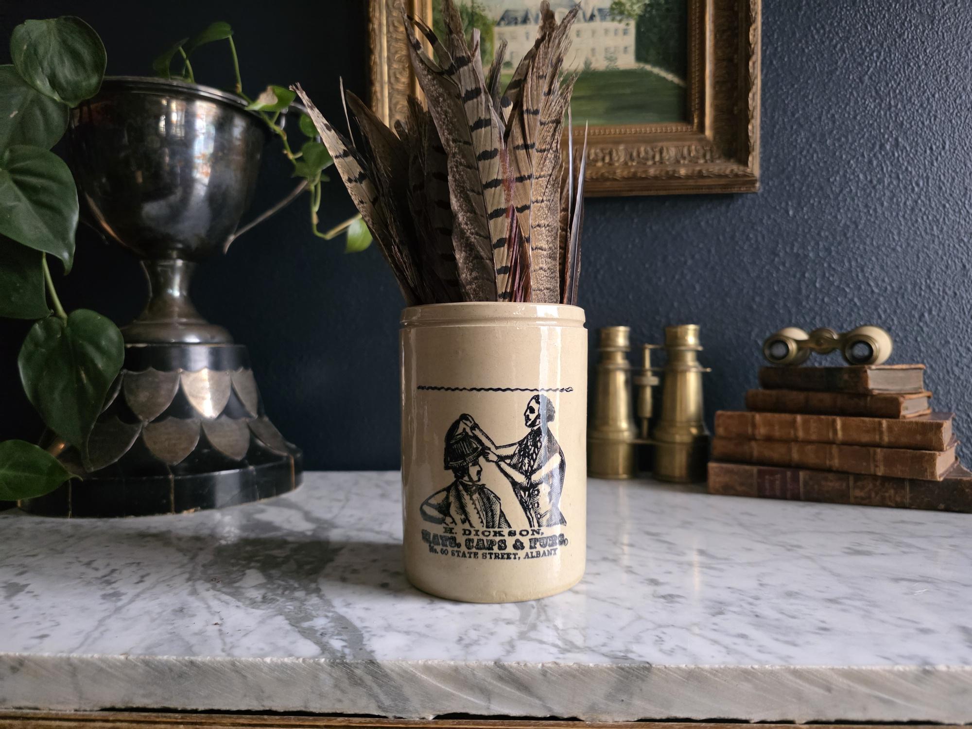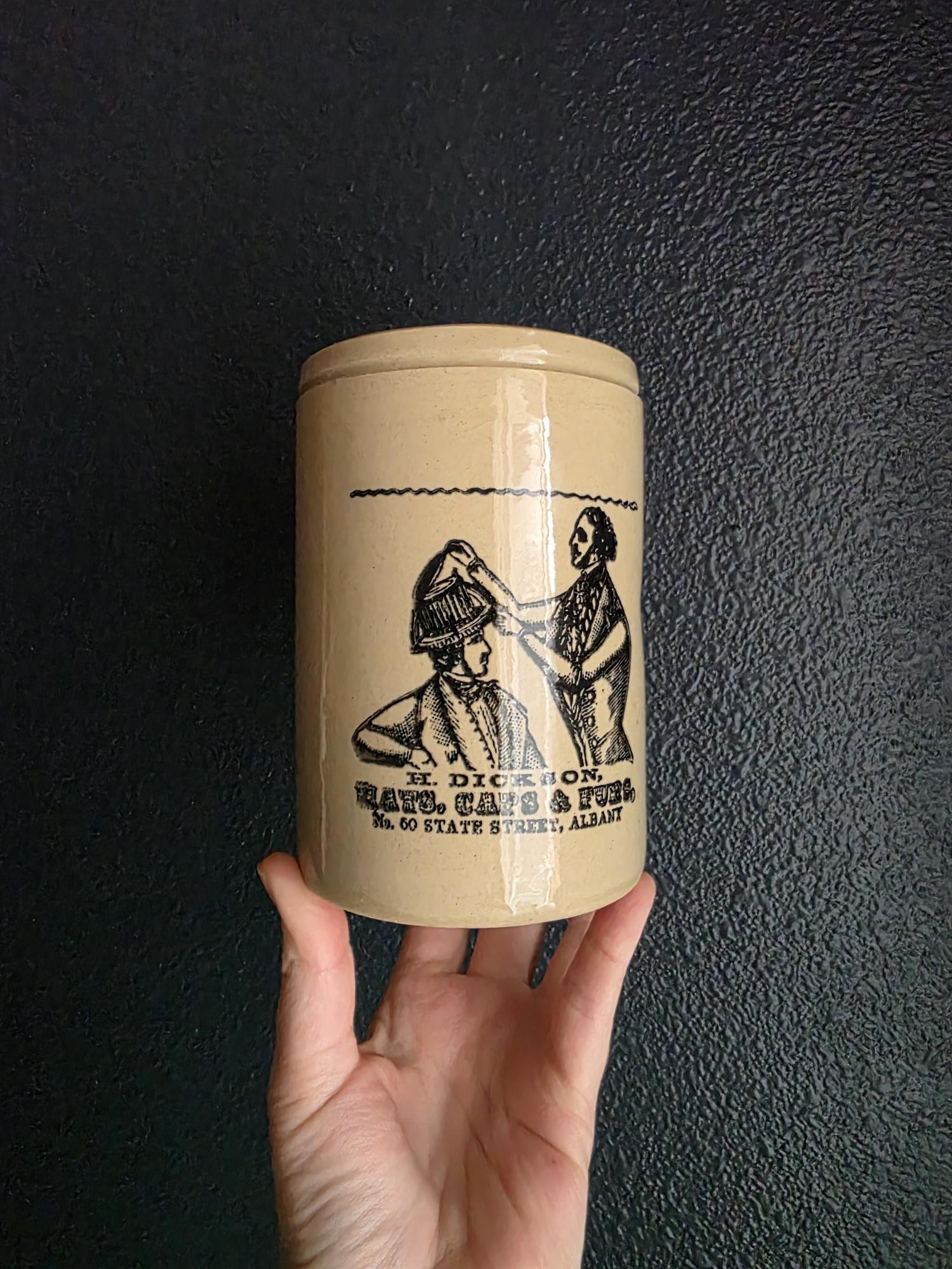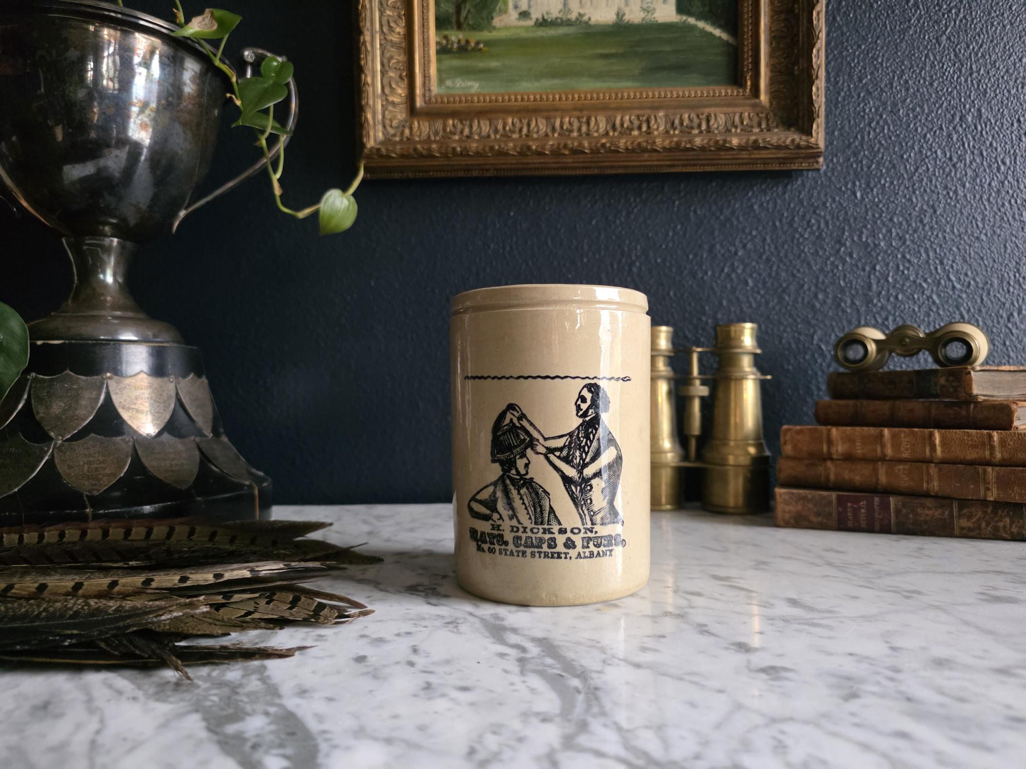 This distinguished stoneware crock captures the essence of 19th-century commerce with a striking black transferware design. The front features a highly detailed advertisement for "H. Dickson, Hats, Caps & Furs," located at No. 60 State Street in Albany. The graphic illustrates a classic haberdashery scene, depicting a hatter meticulously fitting a gentleman with a tall hat, evoking a sense of old-world craftsmanship and Victorian style. The warm, honey-toned glaze provides a beautiful contrast to the crisp black typography and illustration, making it a standout graphic piece for any collection.