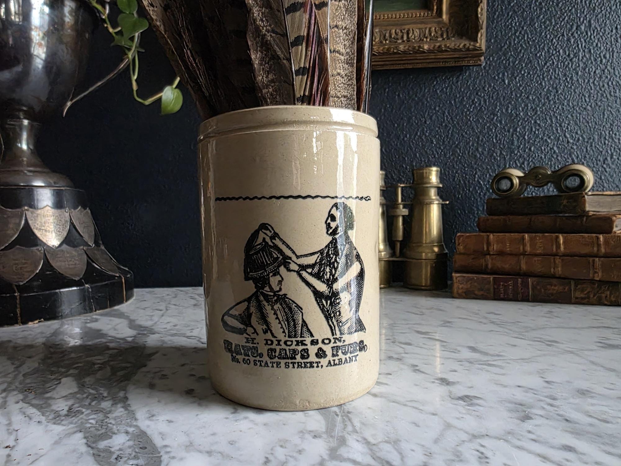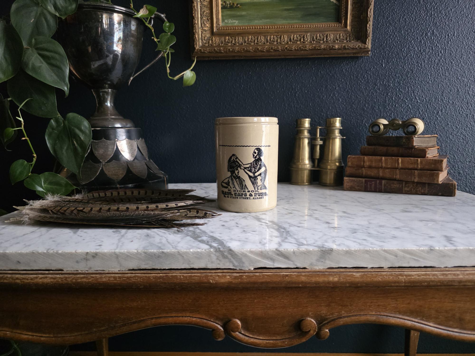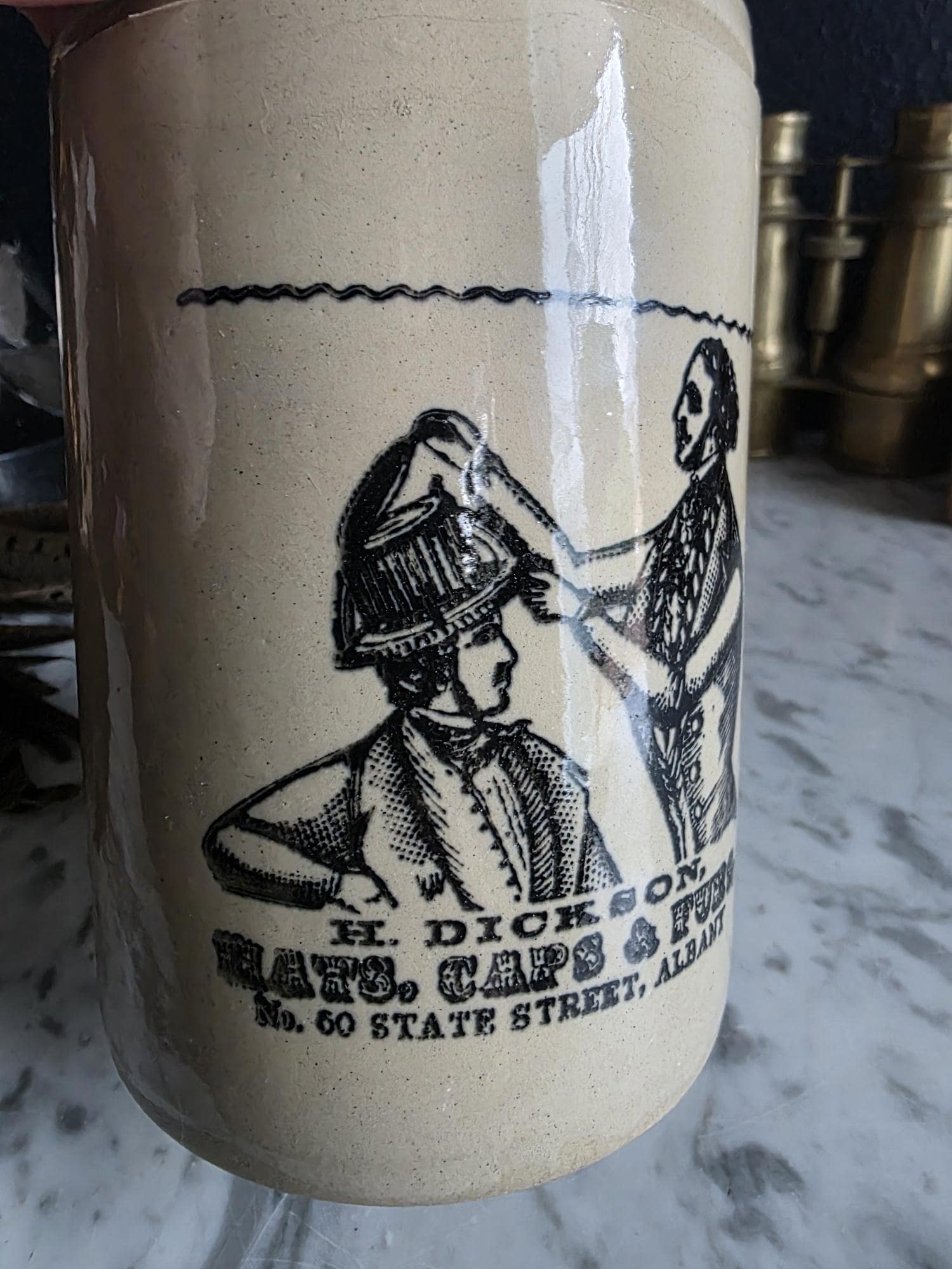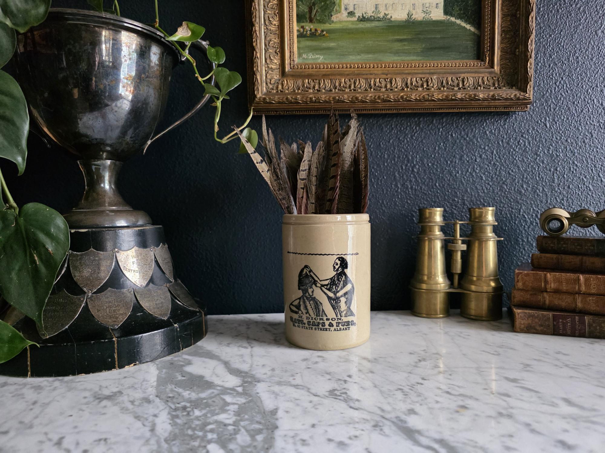 This distinguished stoneware crock captures the essence of 19th-century commerce with a striking black transferware design. The front features a highly detailed advertisement for "H. Dickson, Hats, Caps & Furs," located at No. 60 State Street in Albany. The graphic illustrates a classic haberdashery scene, depicting a hatter meticulously fitting a gentleman with a tall hat, evoking a sense of old-world craftsmanship and Victorian style. The warm, honey-toned glaze provides a beautiful contrast to the crisp black typography and illustration, making it a standout graphic piece for any collection.