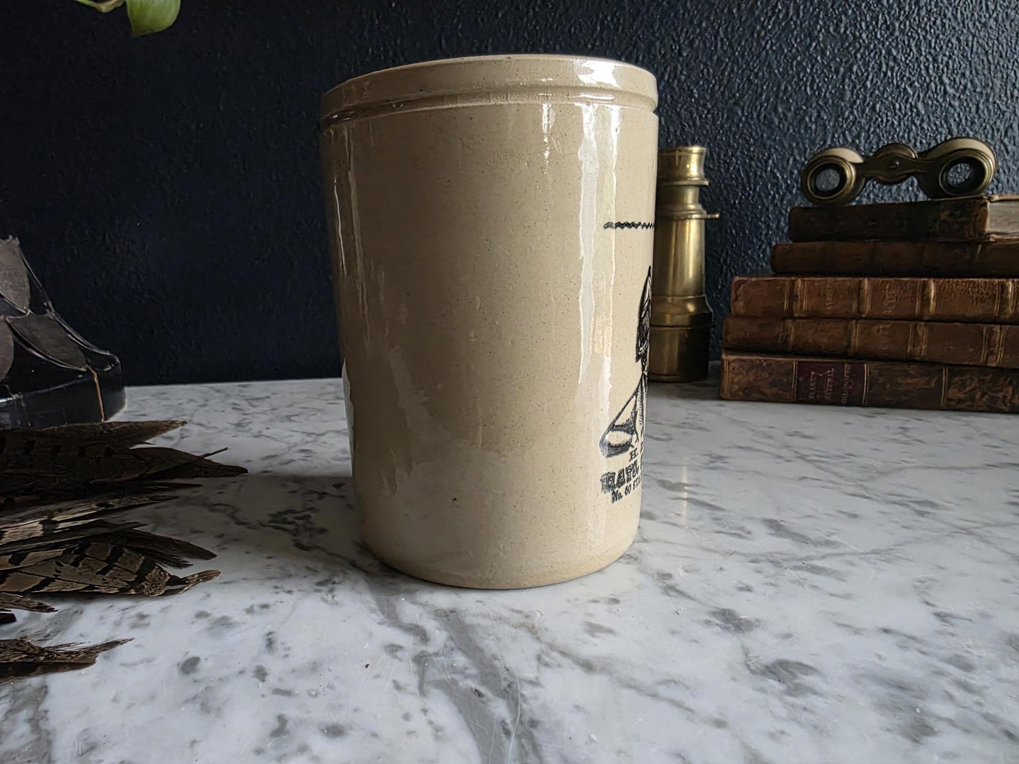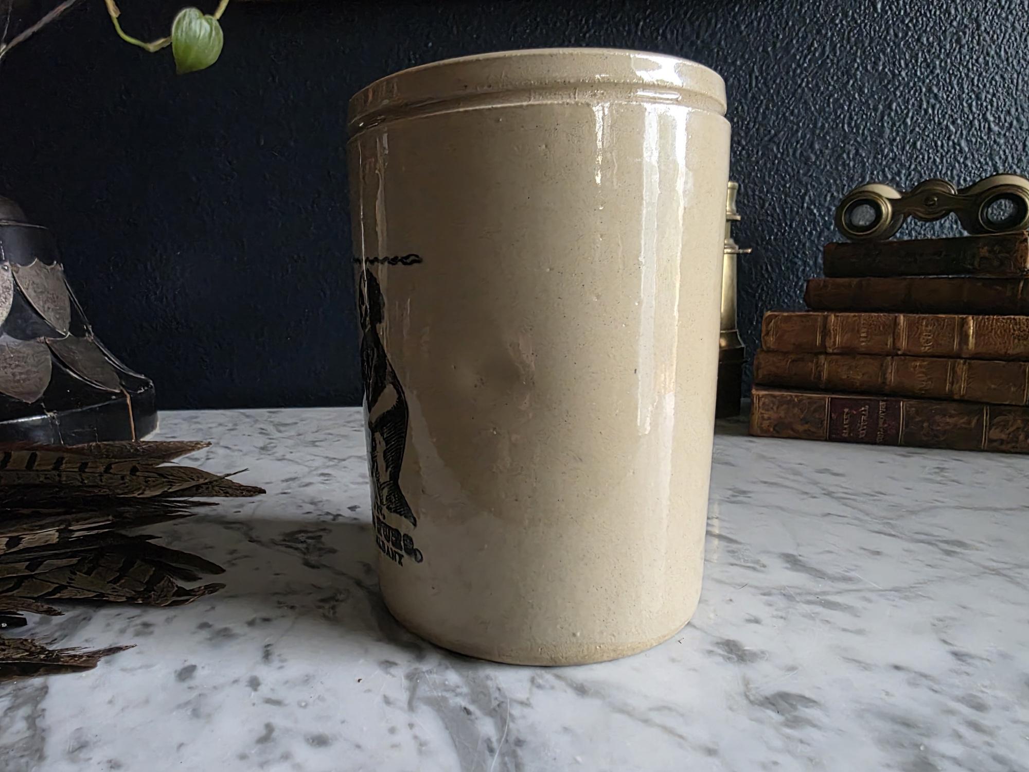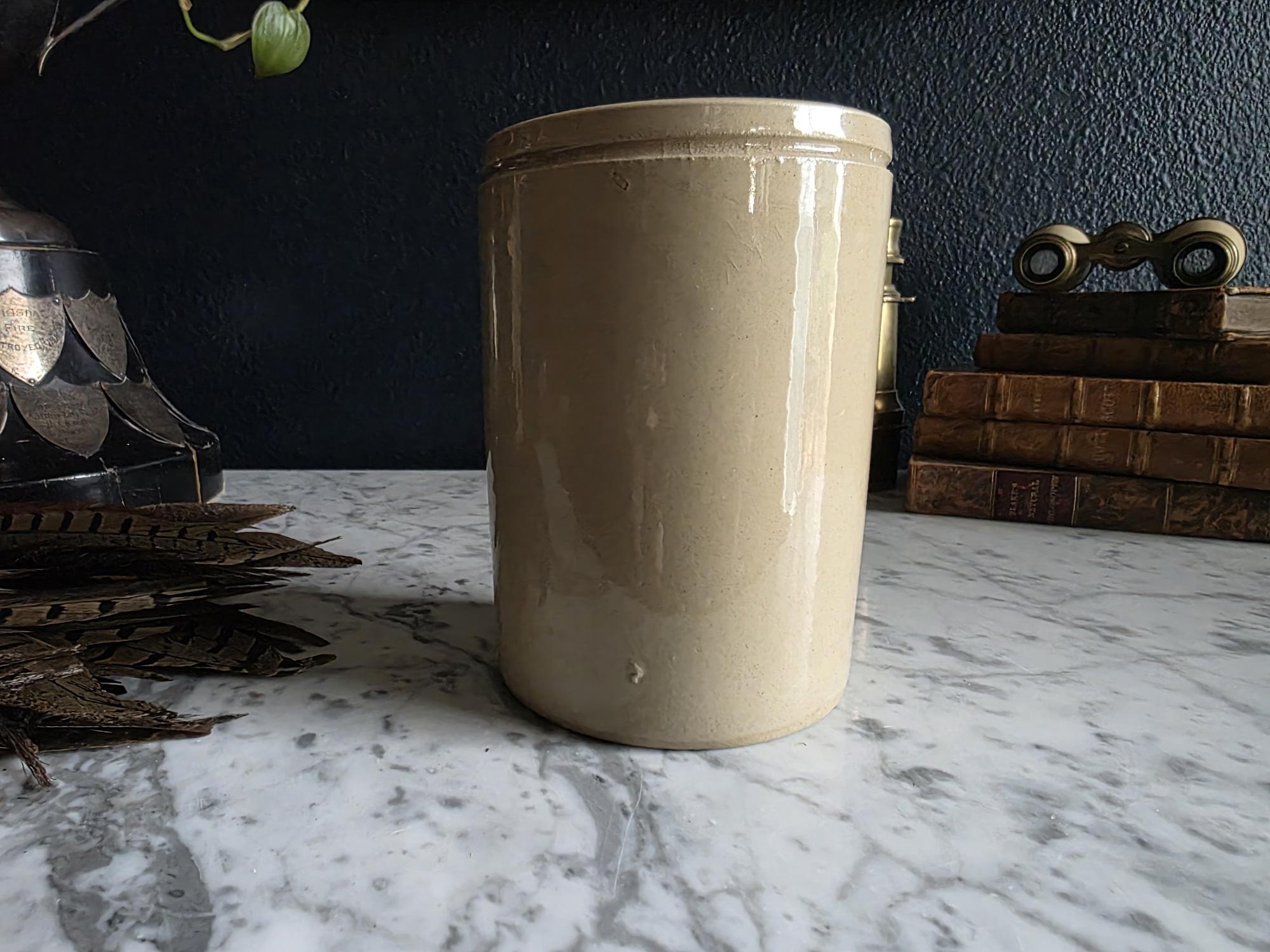 Crafted with a sturdy, cylindrical silhouette, this jar is as functional as it is decorative. While the advertisement points to a historic New York address, the base is marked "Made in England" alongside an impressed maker's mark and a numerical stamp, indicating its origin as a high-quality piece of English ceramic-ware. The interior and exterior surfaces boast a smooth, glossy finish that highlights the natural variations in the stoneware.