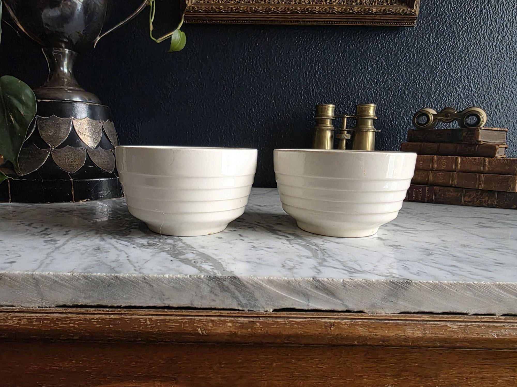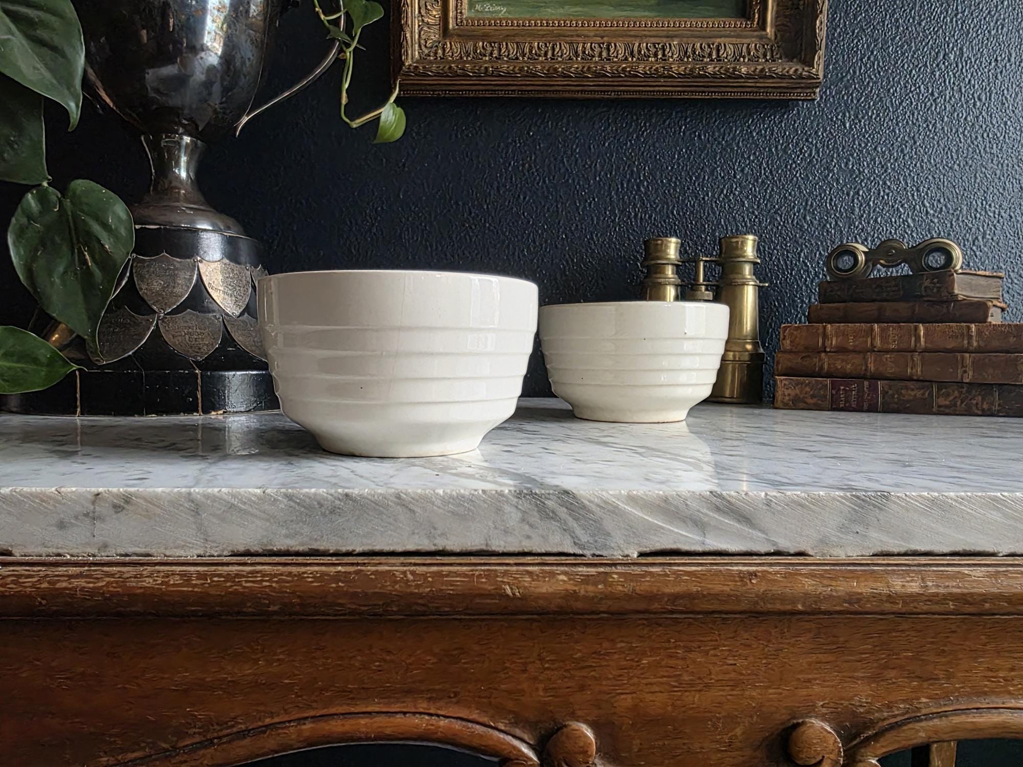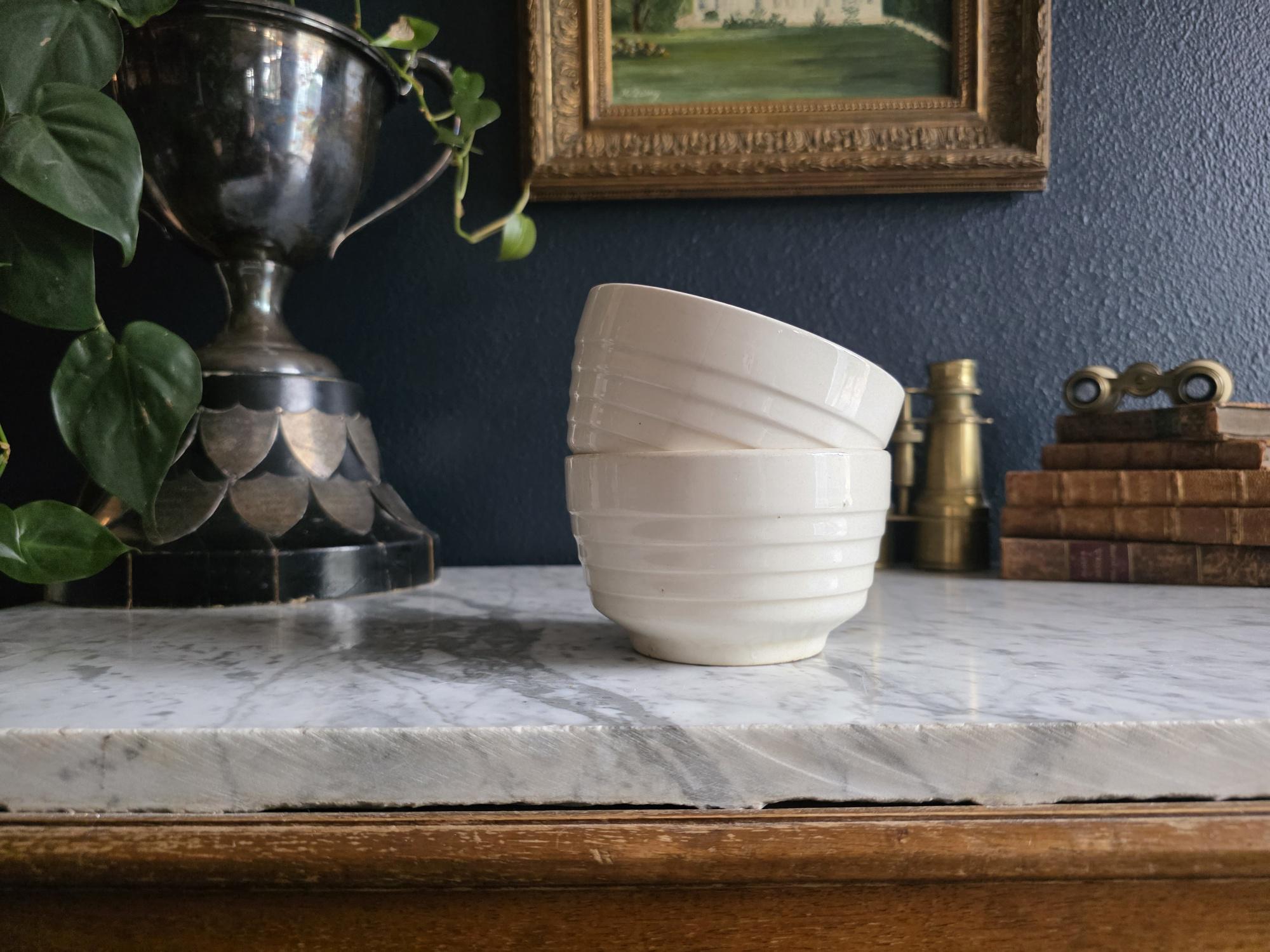 This set of two small vintage ironstone bowls showcases a clean, utilitarian design. Each bowl features a classic cream-colored glaze and a distinctive banded or "beehive" ribbed texture encircling the exterior, adding a subtle architectural element to their simple, rounded silhouettes. Their heavy, durable construction is characteristic of traditional ironstone, making them as practical for modern kitchen use as they are for decorative display on an open shelf or in a primitive hutch.