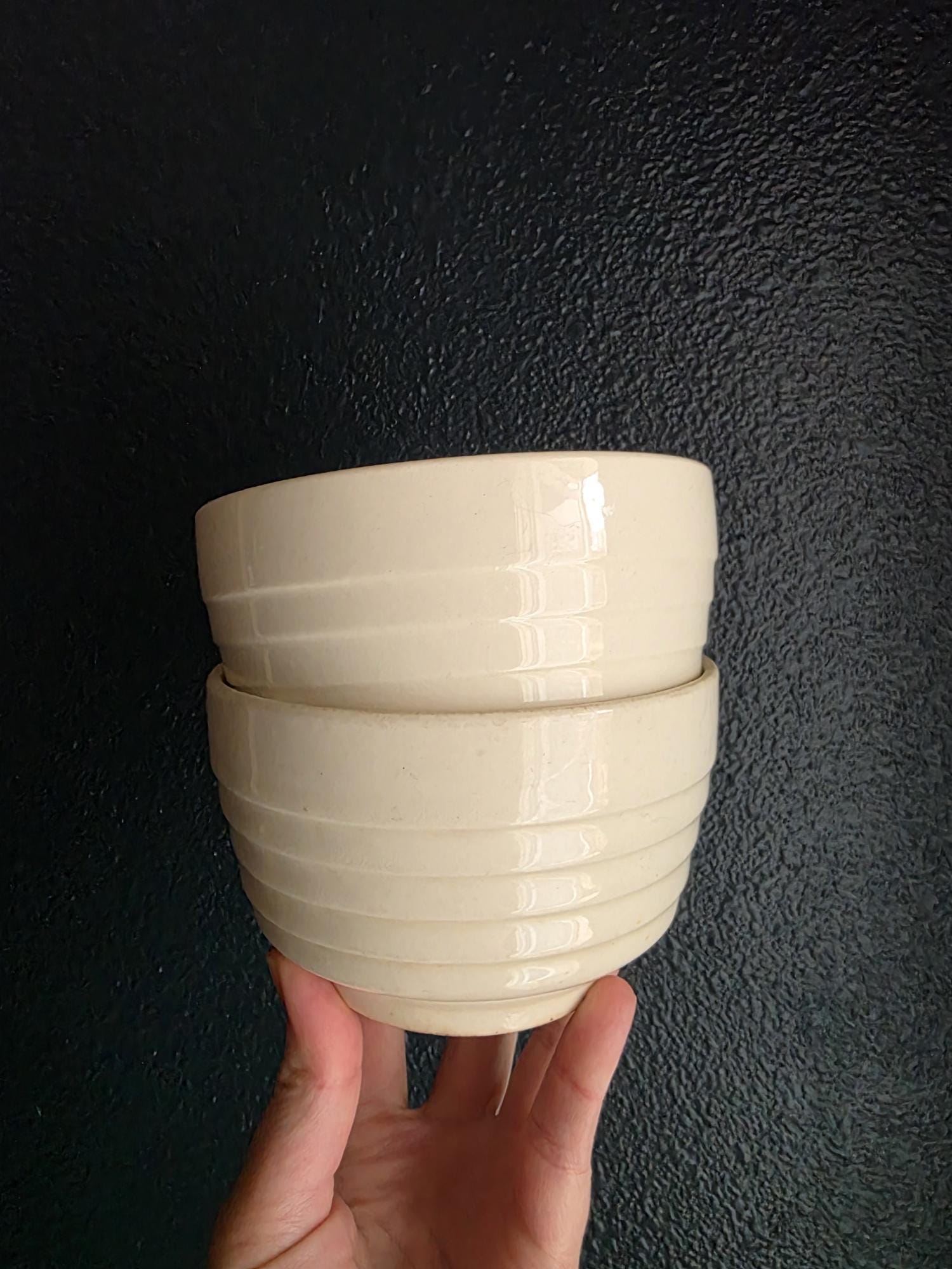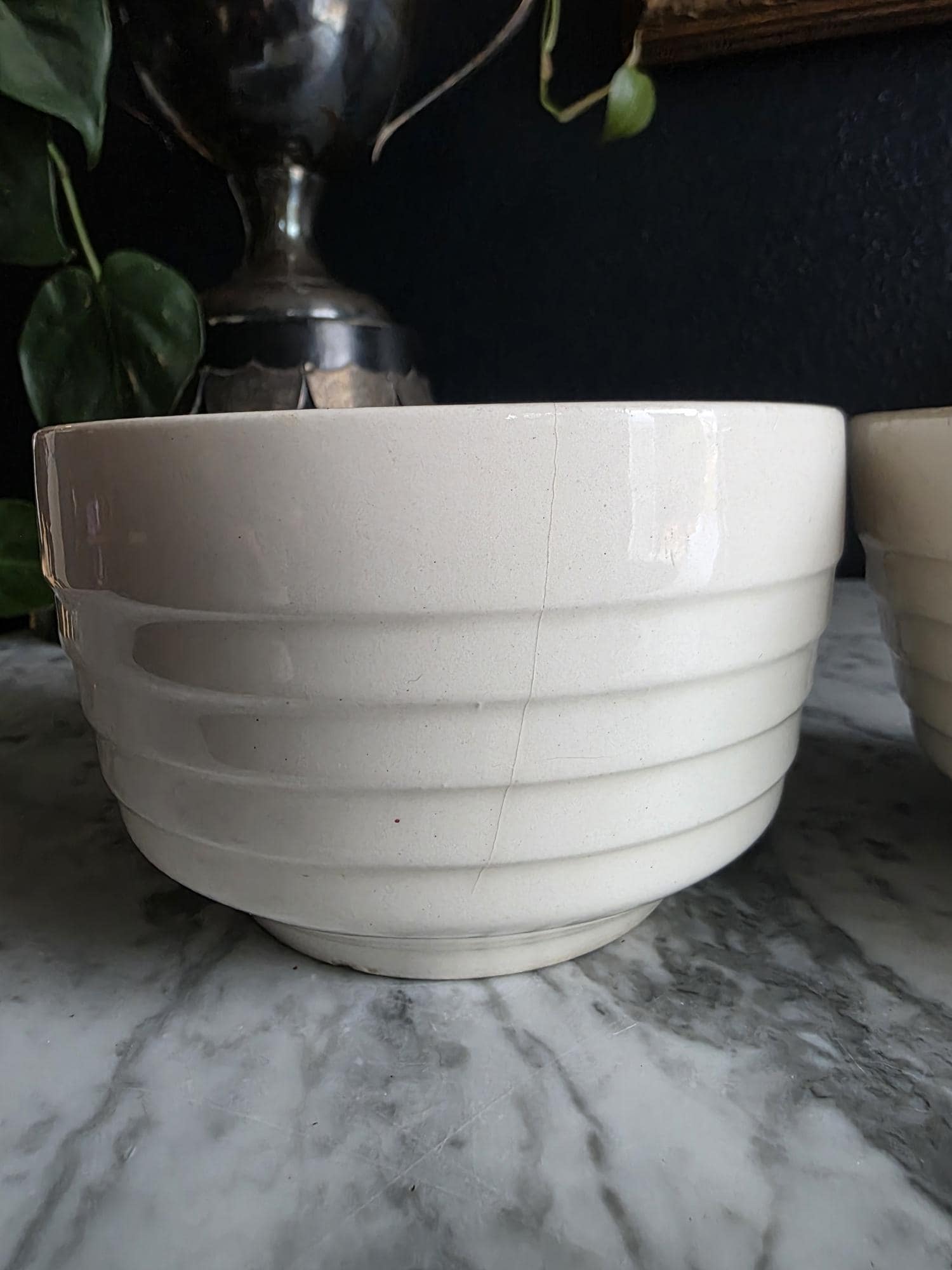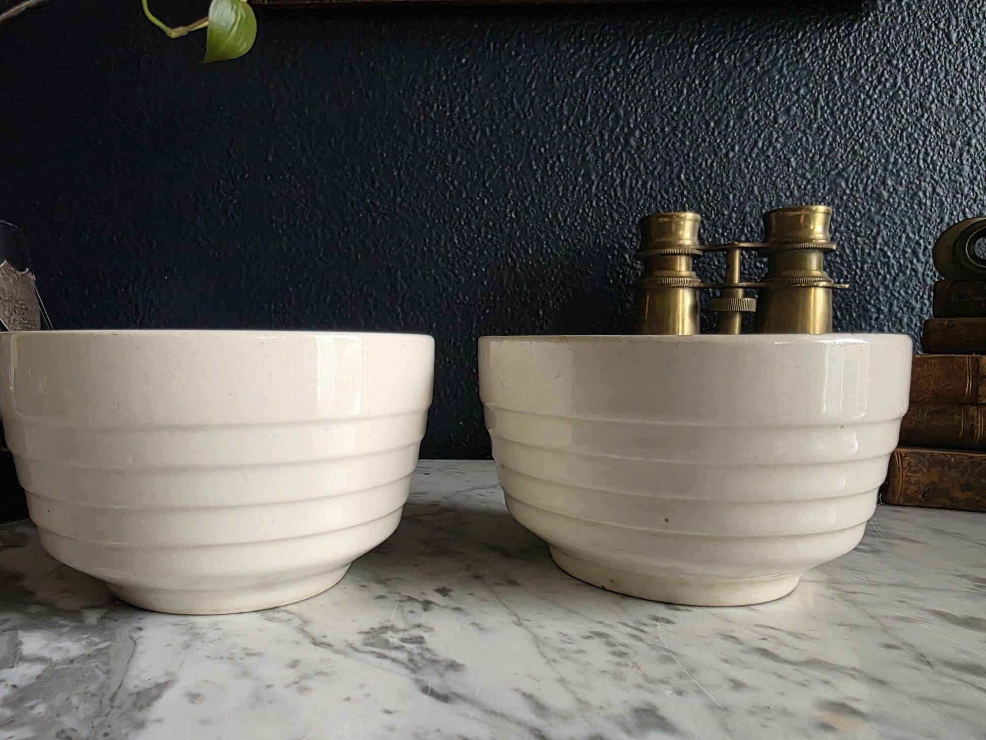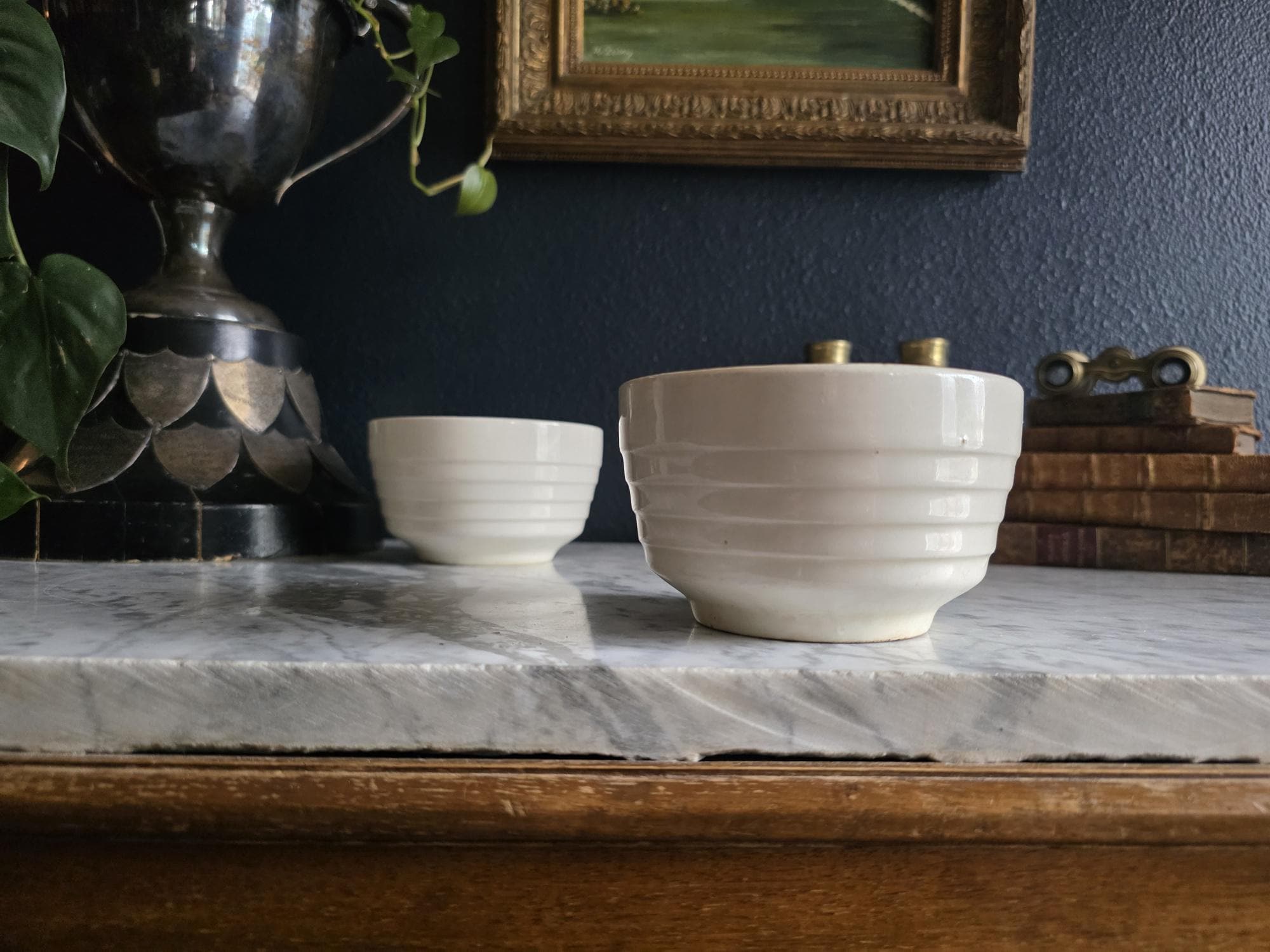 This set of two small vintage ironstone bowls showcases a clean, utilitarian design. Each bowl features a classic cream-colored glaze and a distinctive banded or "beehive" ribbed texture encircling the exterior, adding a subtle architectural element to their simple, rounded silhouettes. Their heavy, durable construction is characteristic of traditional ironstone, making them as practical for modern kitchen use as they are for decorative display on an open shelf or in a primitive hutch.