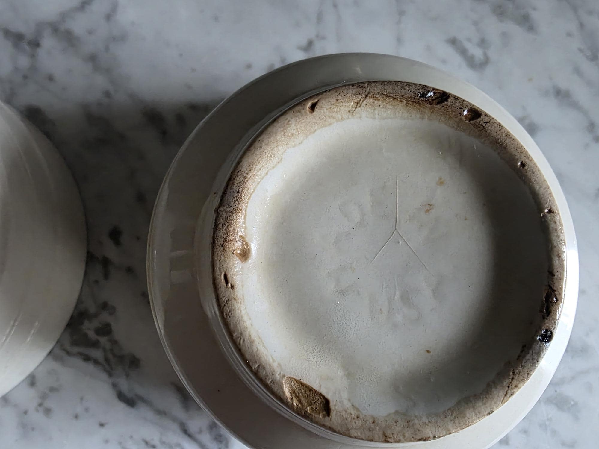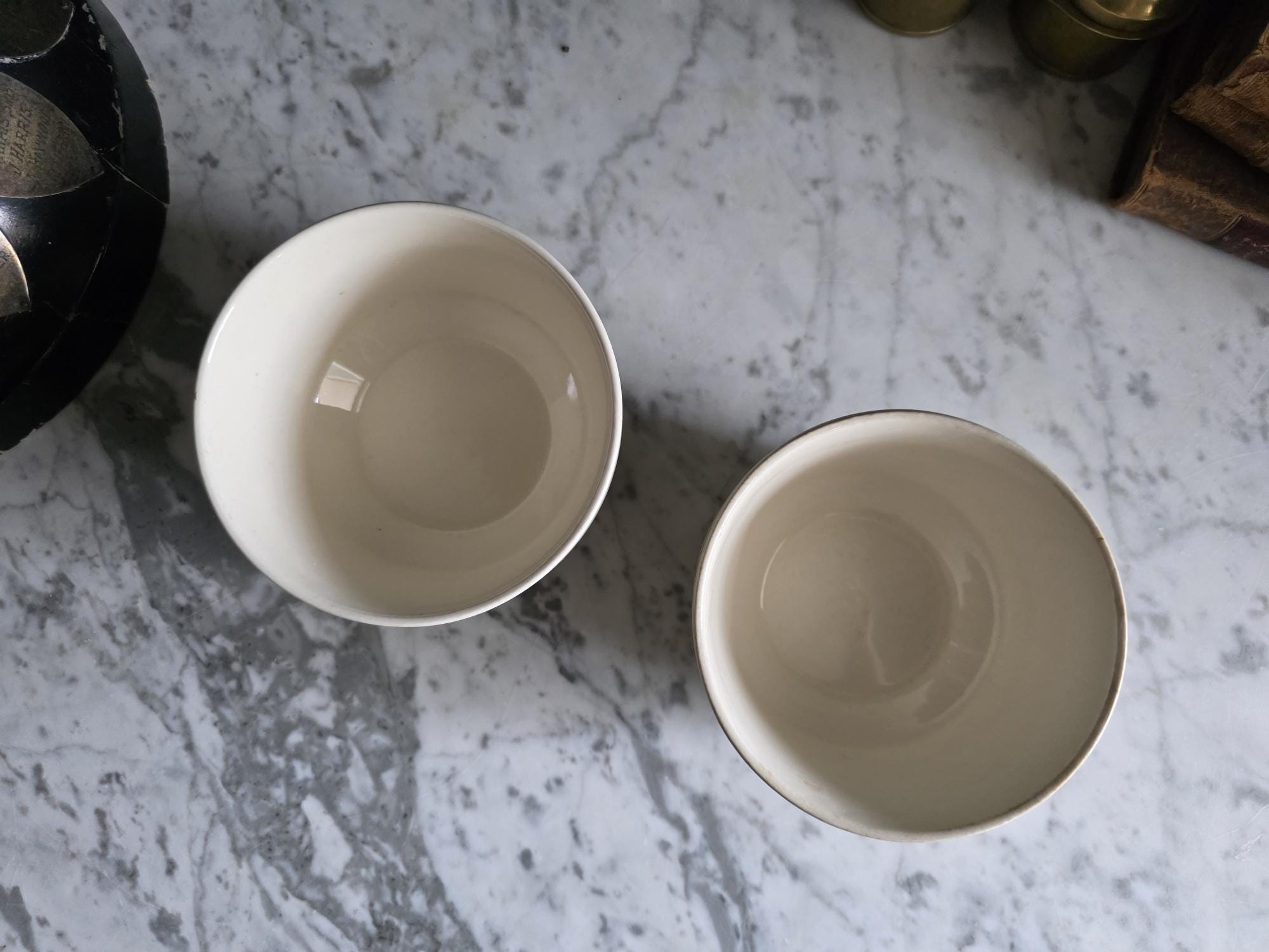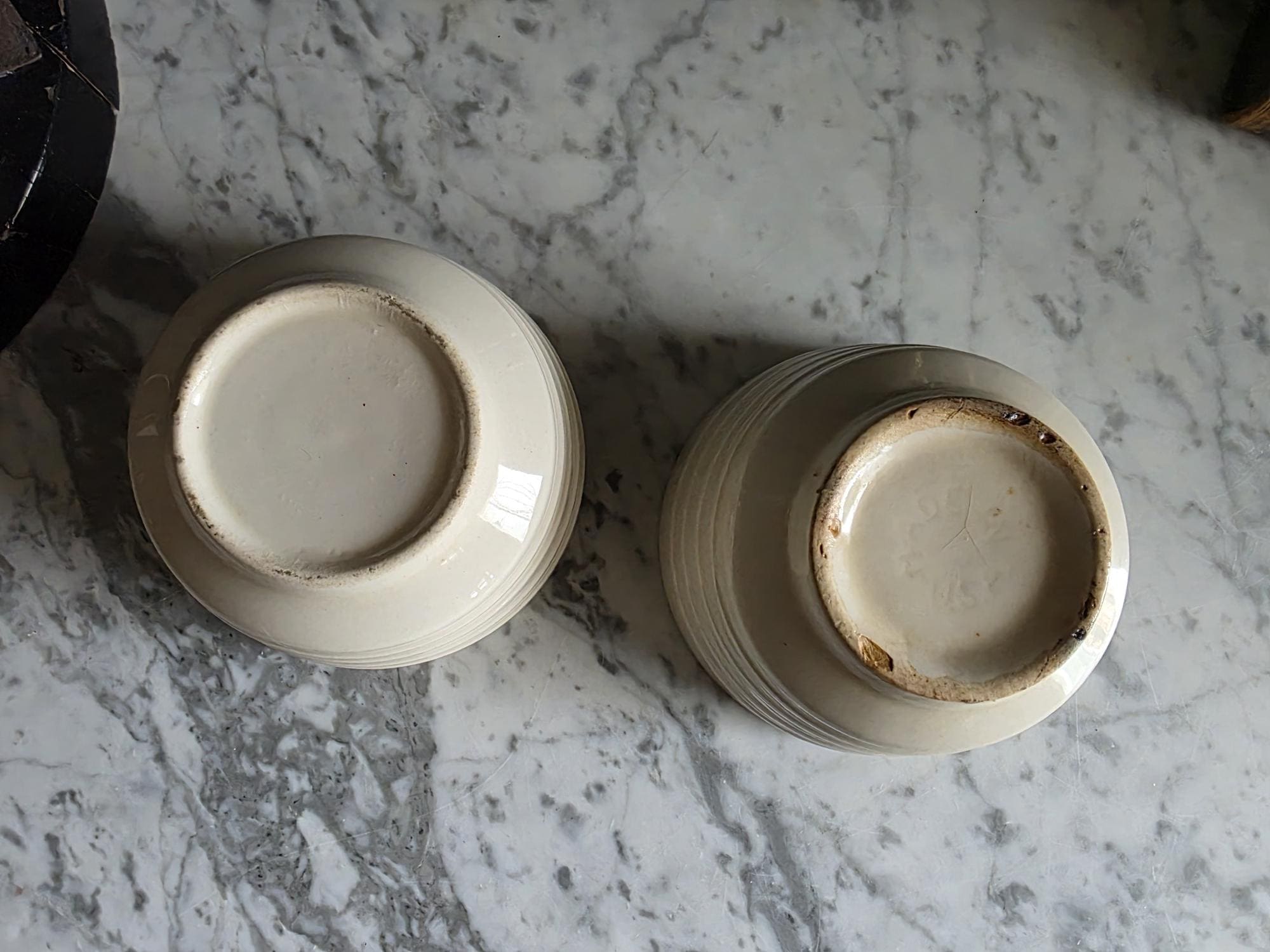 The bowls exhibit a genuine vintage patina that tells a story of years of service. While both maintain a high-gloss finish, one bowl shows more pronounced signs of age, including a visible vertical hairline crack and a rustic, darkened ring along the unglazed base. These honest imperfections do not detract from their charm but rather enhance their authentic character, making them a wonderful choice for collectors who appreciate the "wabi-sabi" beauty of well-loved antiques. Their compact size makes them incredibly versatile—ideal for serving individual portions of fruit and yogurt, holding salt or spices while cooking, or simply being stacked to create a textured focal point in a curated vignette.