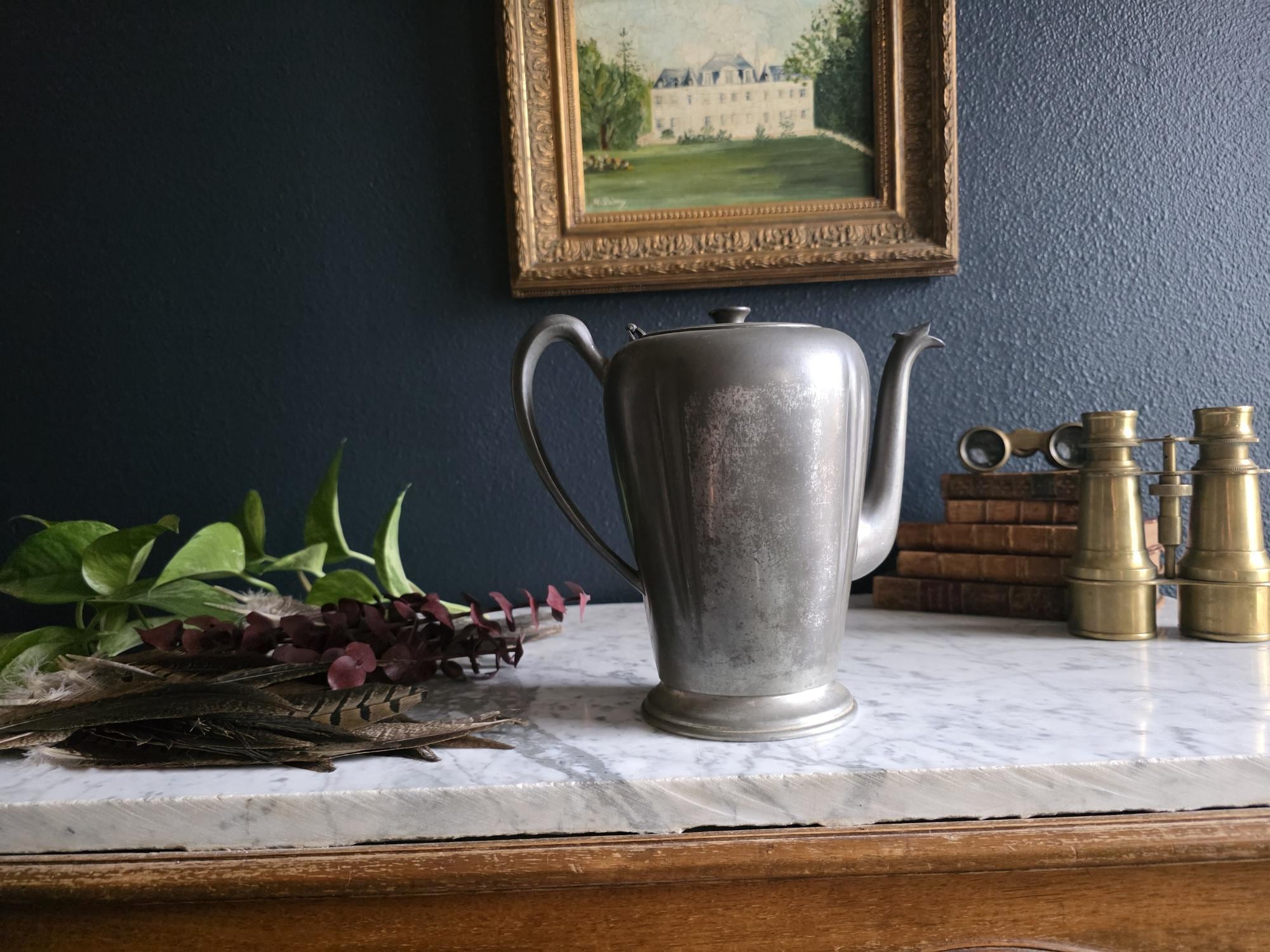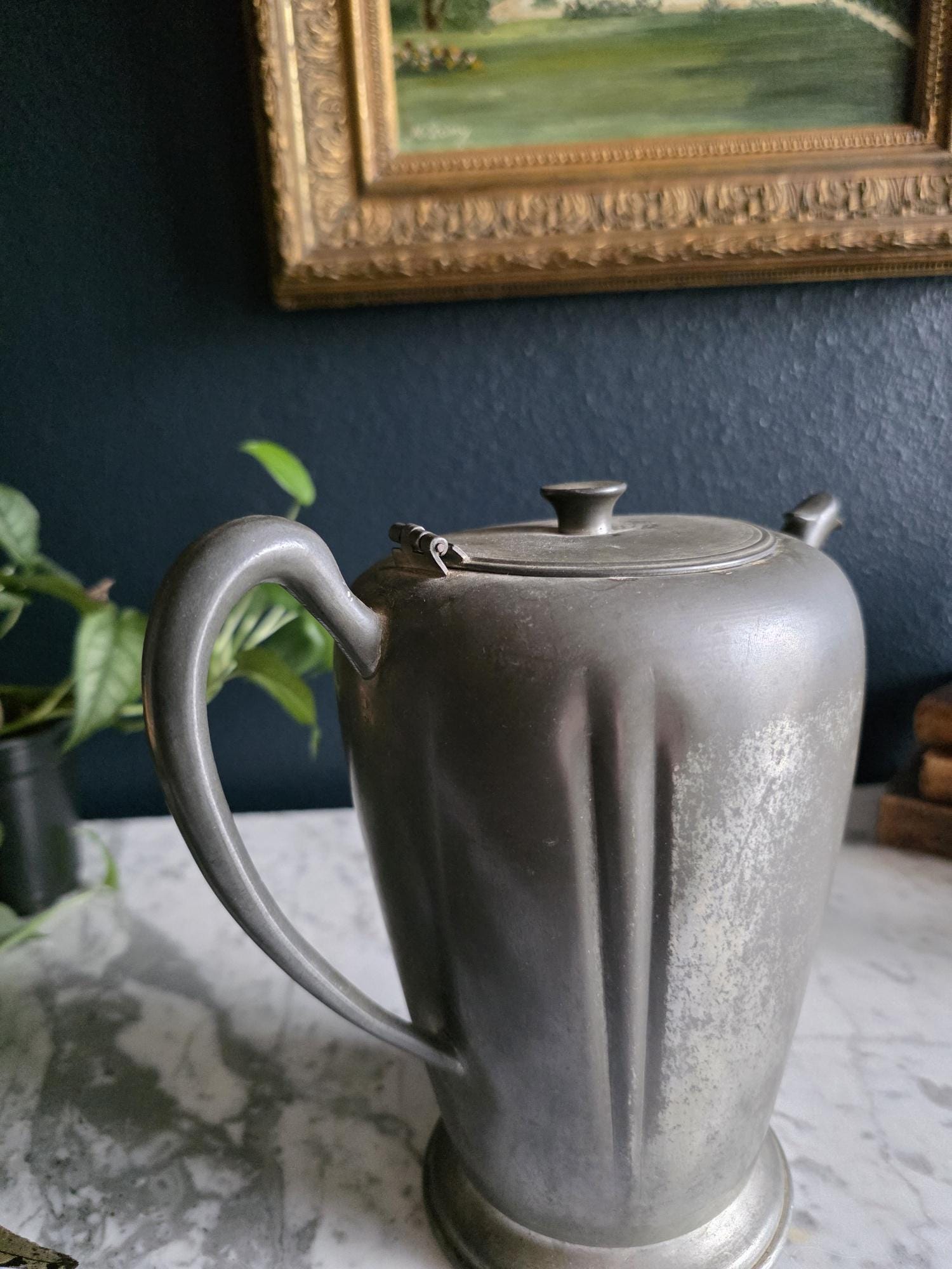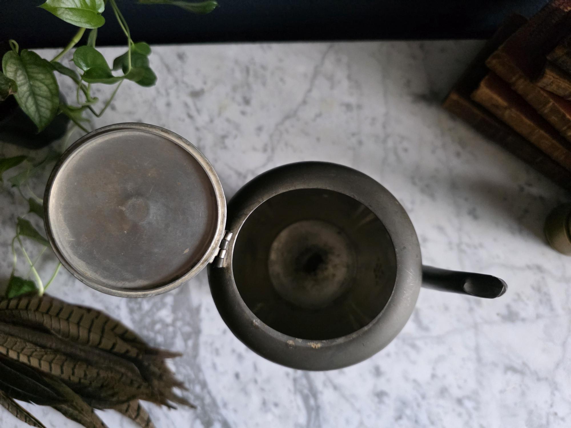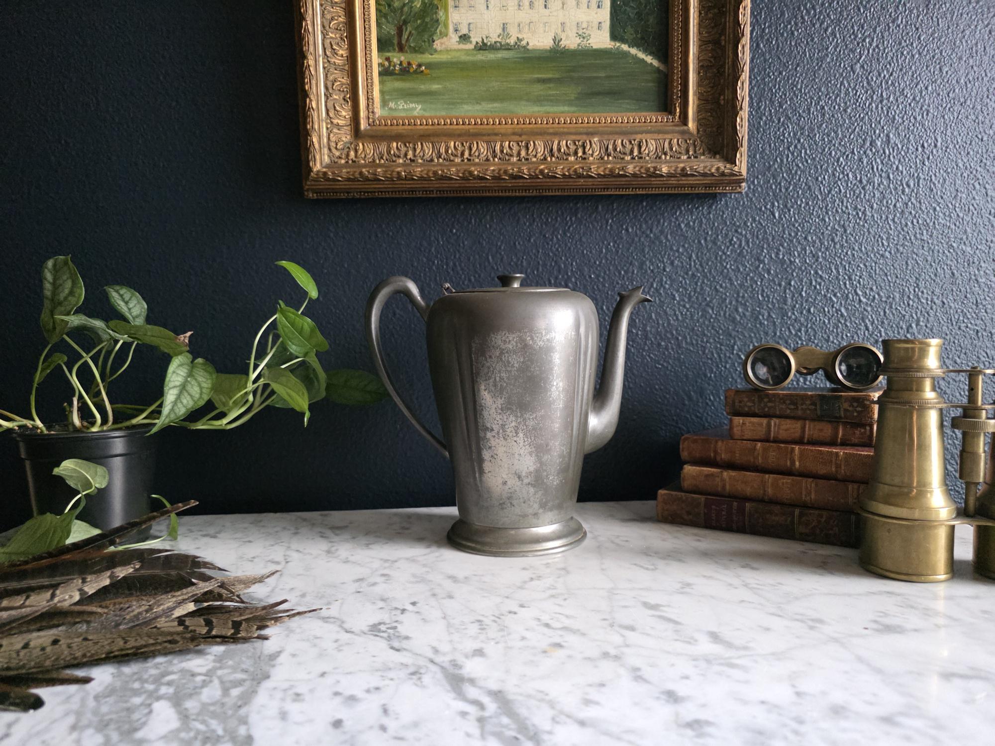 This vintage pewter coffee kettle (marked genuine pewter on the bottom of the kettle) is a striking example of classical fluted design, featuring a tall, tapered body with deep vertical panels that create a beautiful play of light and shadow. Its elegant silhouette is complemented by a curved spout and a sturdy, gracefully arched handle, while the hinged lid is topped with a simple, rounded finial for a finished look. The metal displays a rich, weathered patina with a soft, matte grey tone and authentic surface oxidation, lending it a storied, "found" quality that fits perfectly into primitive, farmhouse, or "moody" vintage aesthetics. Whether used as a sophisticated server for a morning gathering or repurposed as a unique vase for tall feathers and dried botanicals, this piece brings a sense of industrial history and timeless utility to any tabletop or mantel.