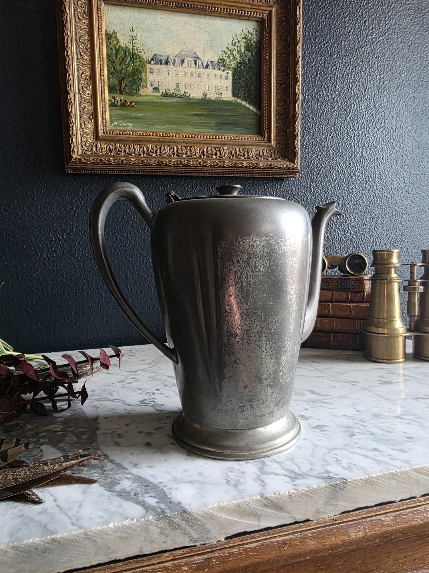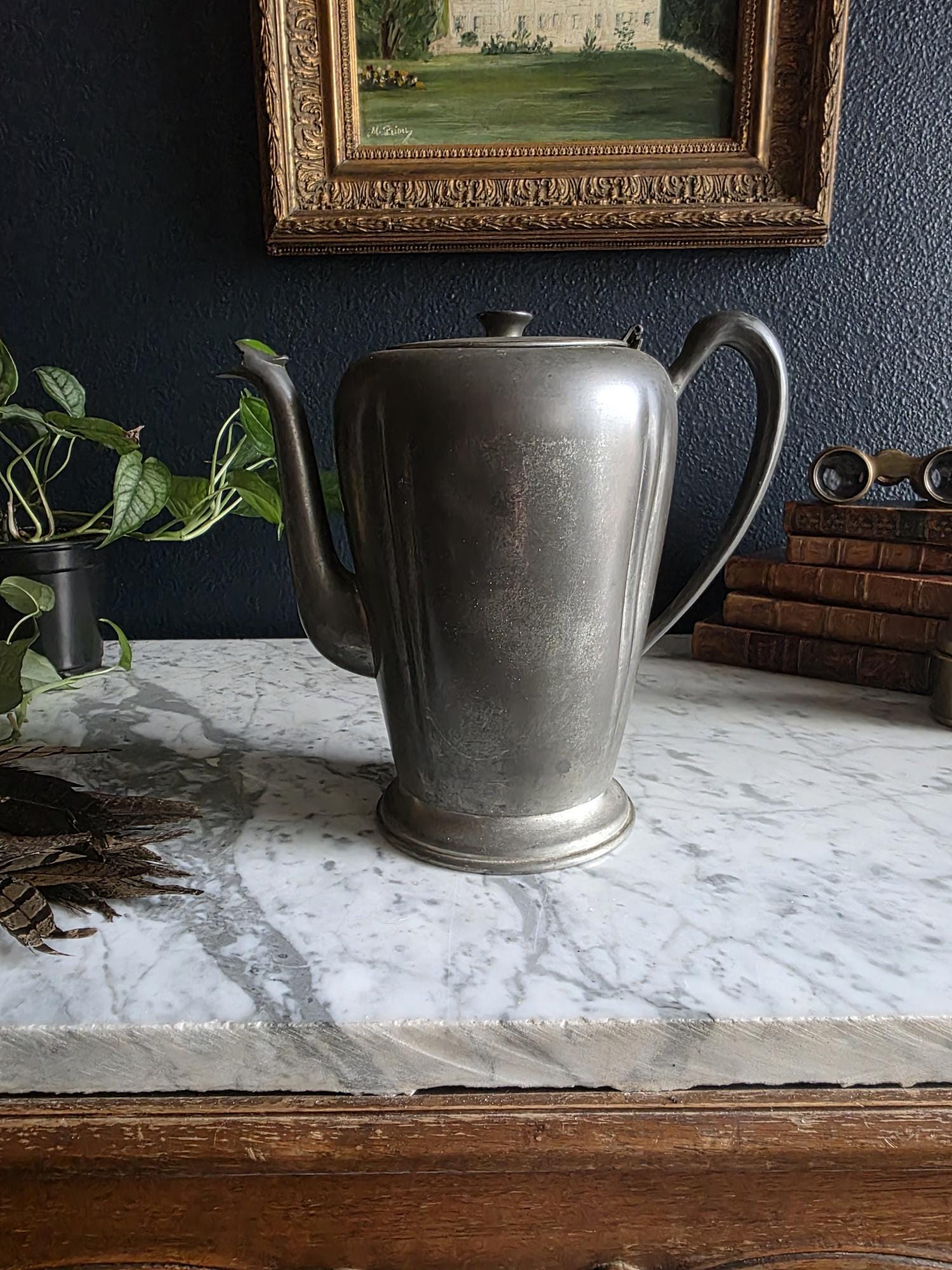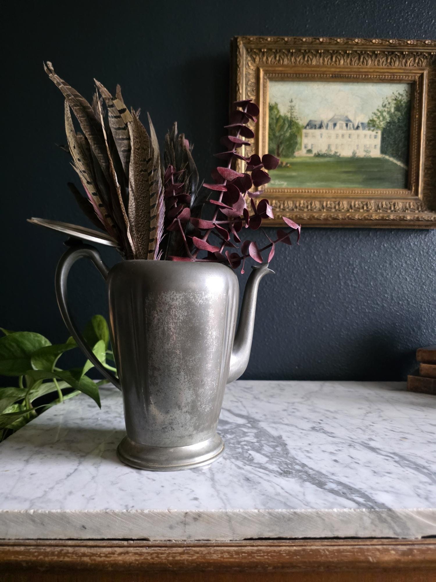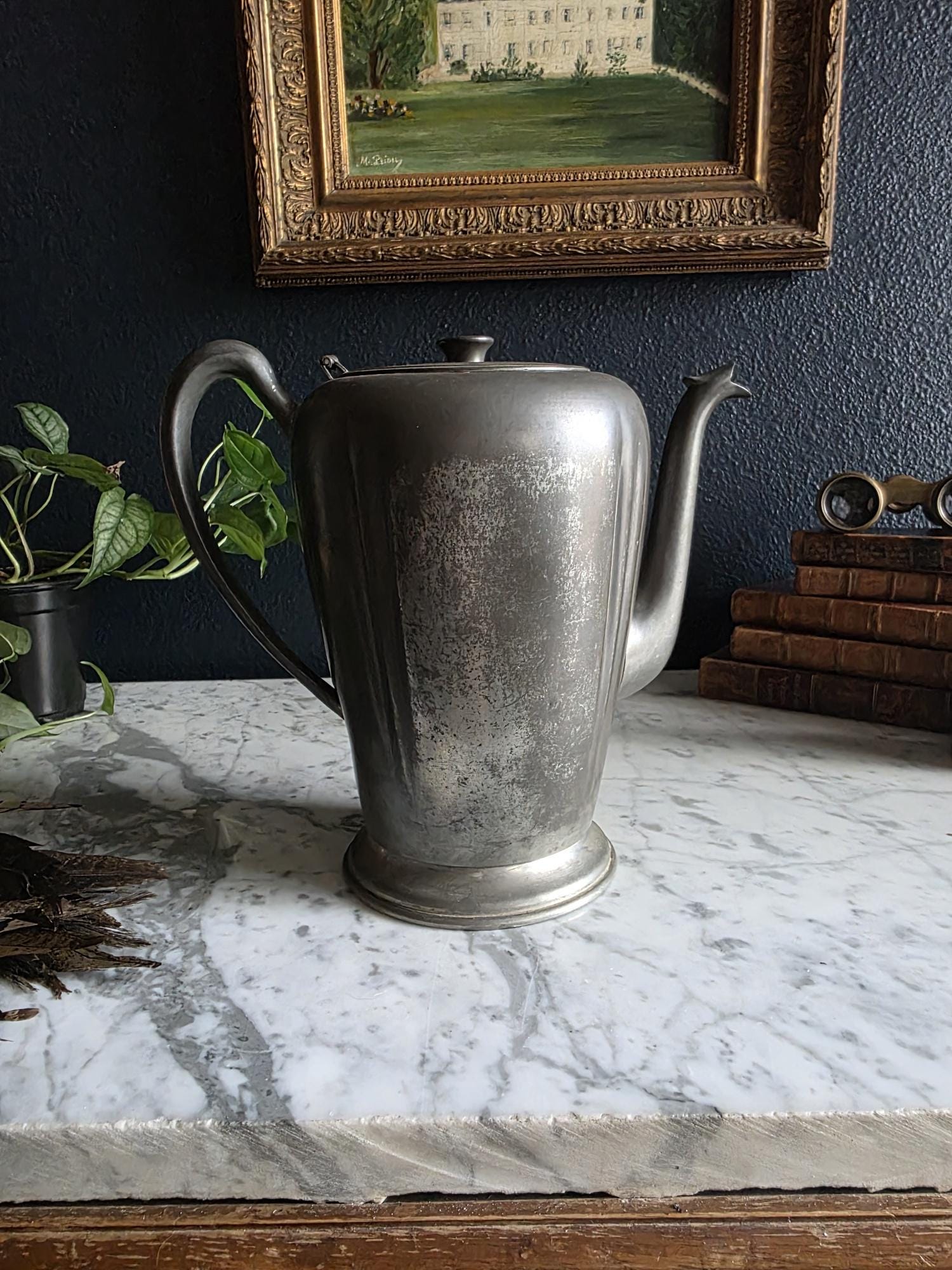 This vintage pewter coffee kettle (marked genuine pewter on the bottom of the kettle) is a striking example of classical fluted design, featuring a tall, tapered body with deep vertical panels that create a beautiful play of light and shadow. Its elegant silhouette is complemented by a curved spout and a sturdy, gracefully arched handle, while the hinged lid is topped with a simple, rounded finial for a finished look. The metal displays a rich, weathered patina with a soft, matte grey tone and authentic surface oxidation, lending it a storied, "found" quality that fits perfectly into primitive, farmhouse, or "moody" vintage aesthetics. Whether used as a sophisticated server for a morning gathering or repurposed as a unique vase for tall feathers and dried botanicals, this piece brings a sense of industrial history and timeless utility to any tabletop or mantel.
