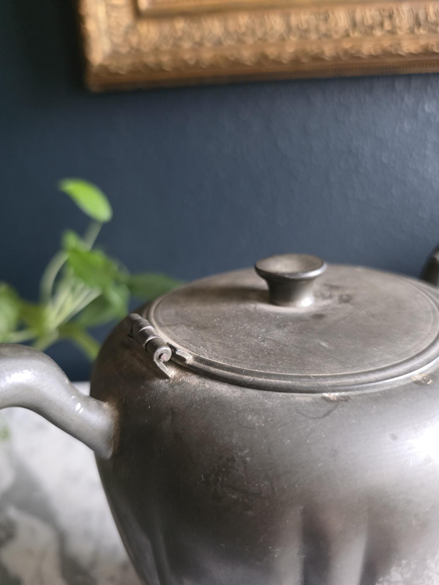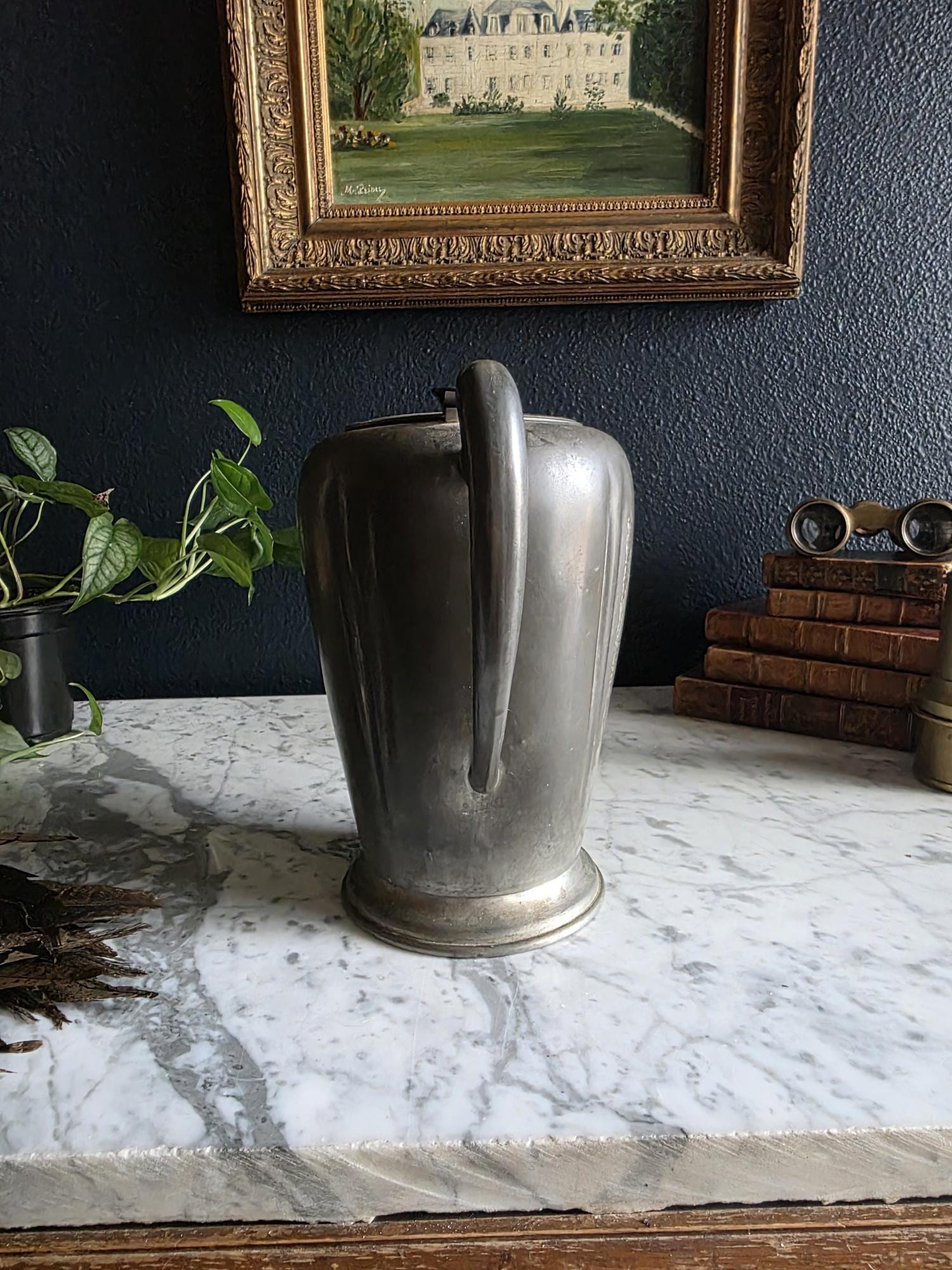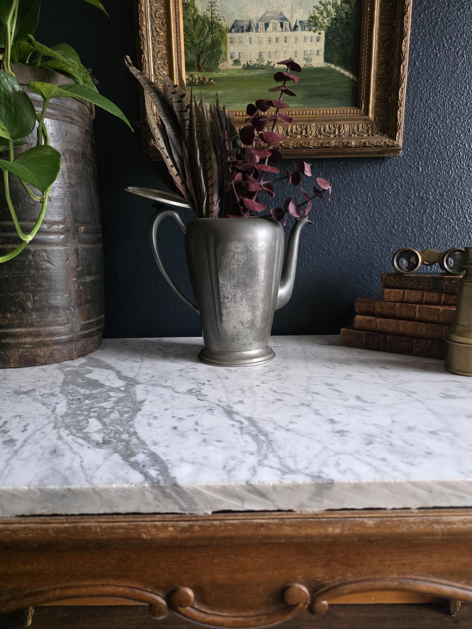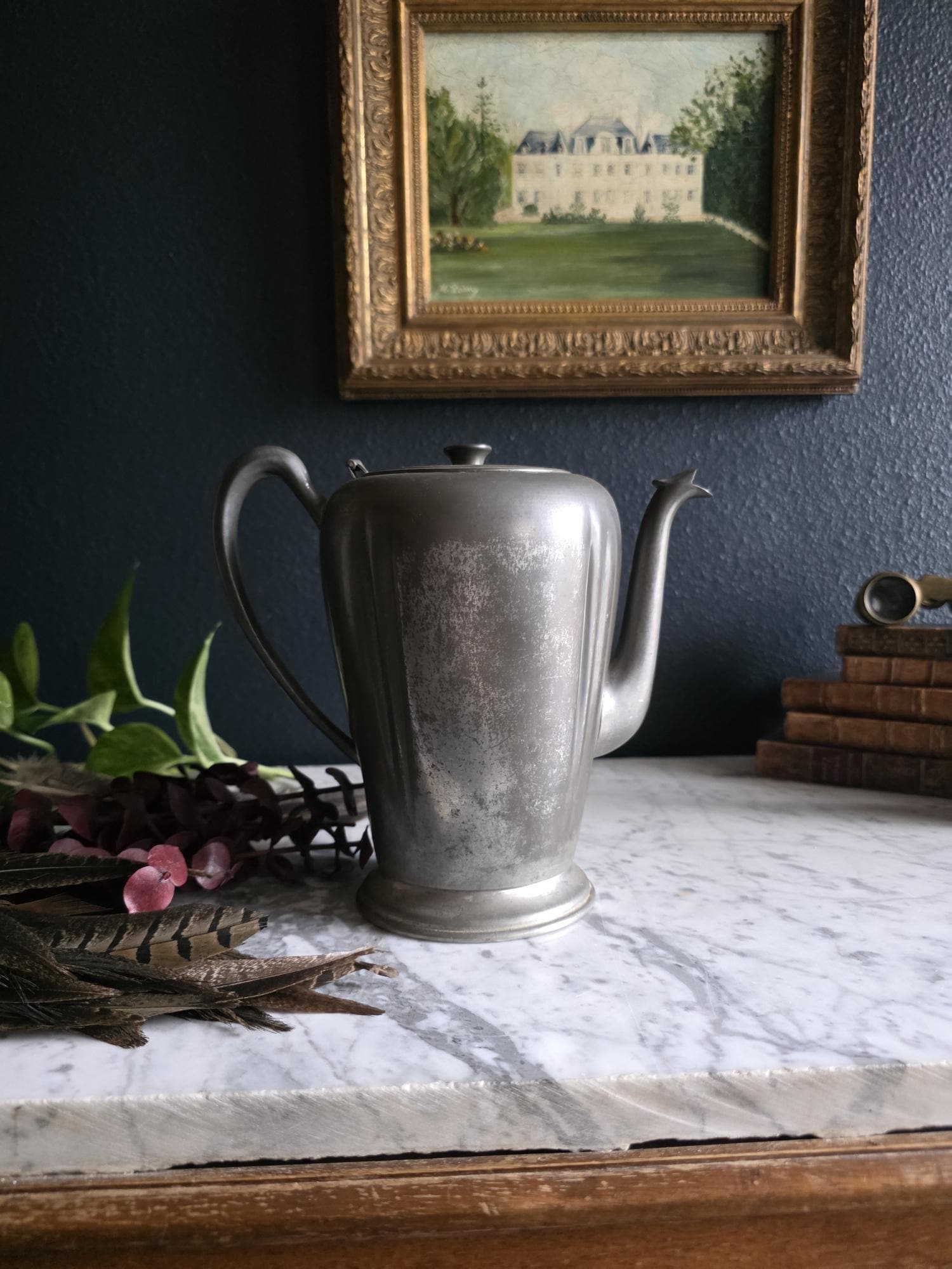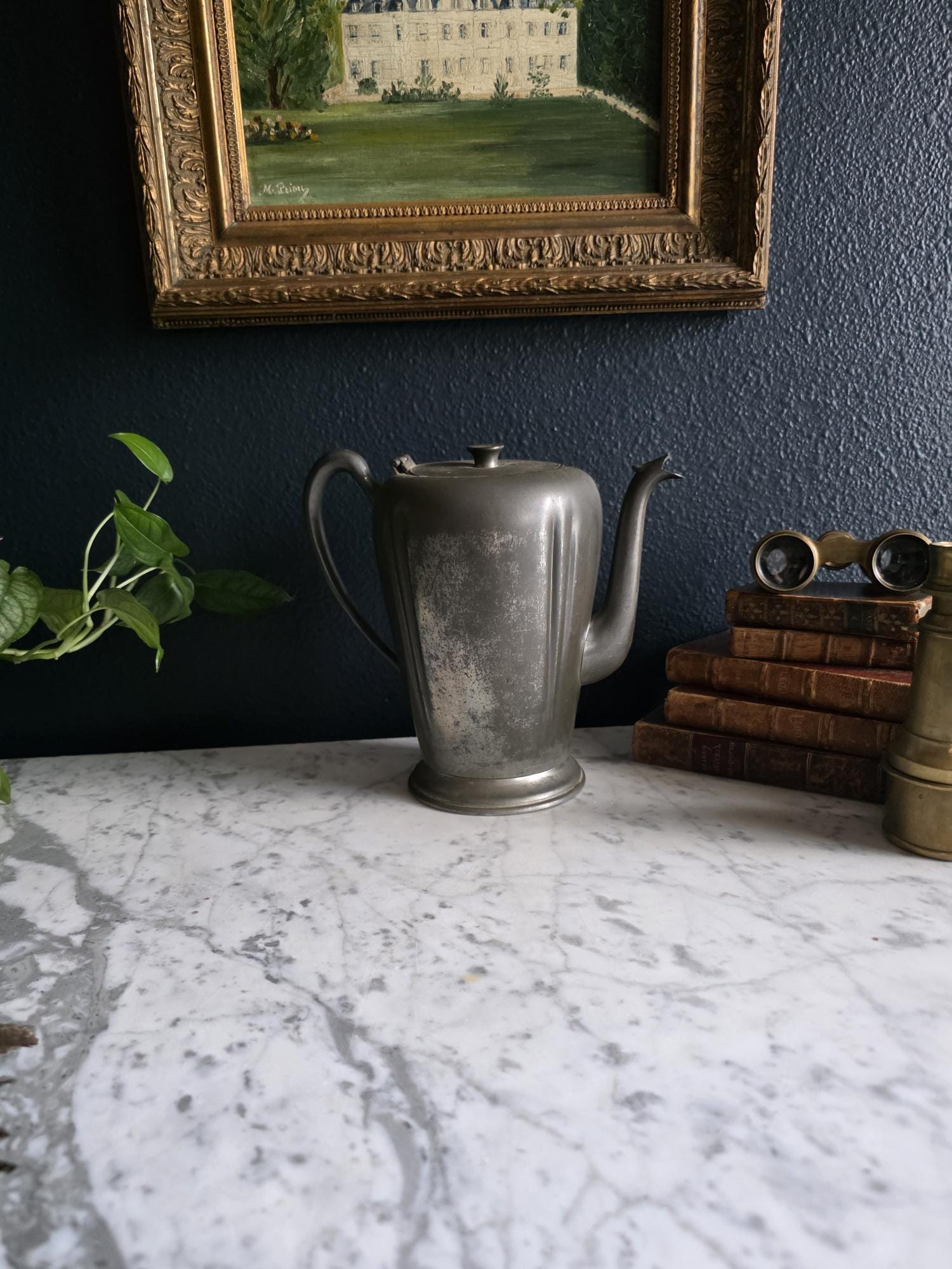 This vintage pewter coffee kettle (marked genuine pewter on the bottom of the kettle) is a striking example of classical fluted design, featuring a tall, tapered body with deep vertical panels that create a beautiful play of light and shadow. Its elegant silhouette is complemented by a curved spout and a sturdy, gracefully arched handle, while the hinged lid is topped with a simple, rounded finial for a finished look. The metal displays a rich, weathered patina with a soft, matte grey tone and authentic surface oxidation, lending it a storied, "found" quality that fits perfectly into primitive, farmhouse, or "moody" vintage aesthetics. Whether used as a sophisticated server for a morning gathering or repurposed as a unique vase for tall feathers and dried botanicals, this piece brings a sense of industrial history and timeless utility to any tabletop or mantel.