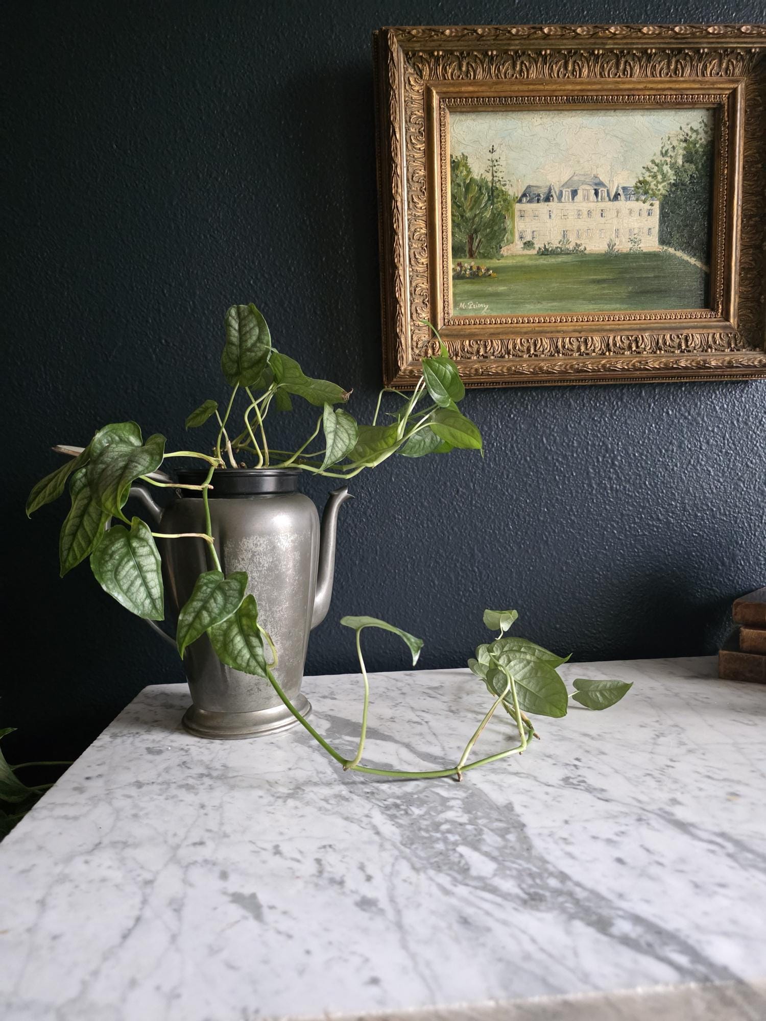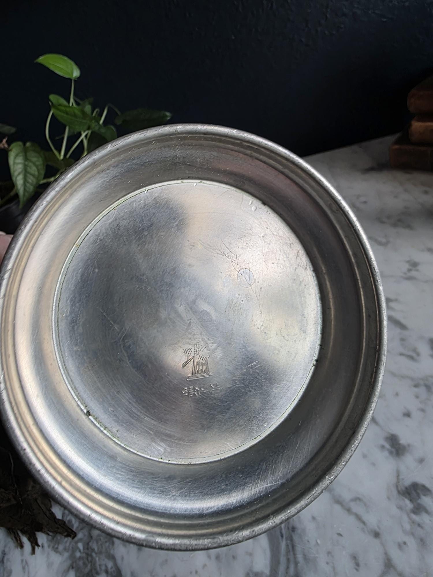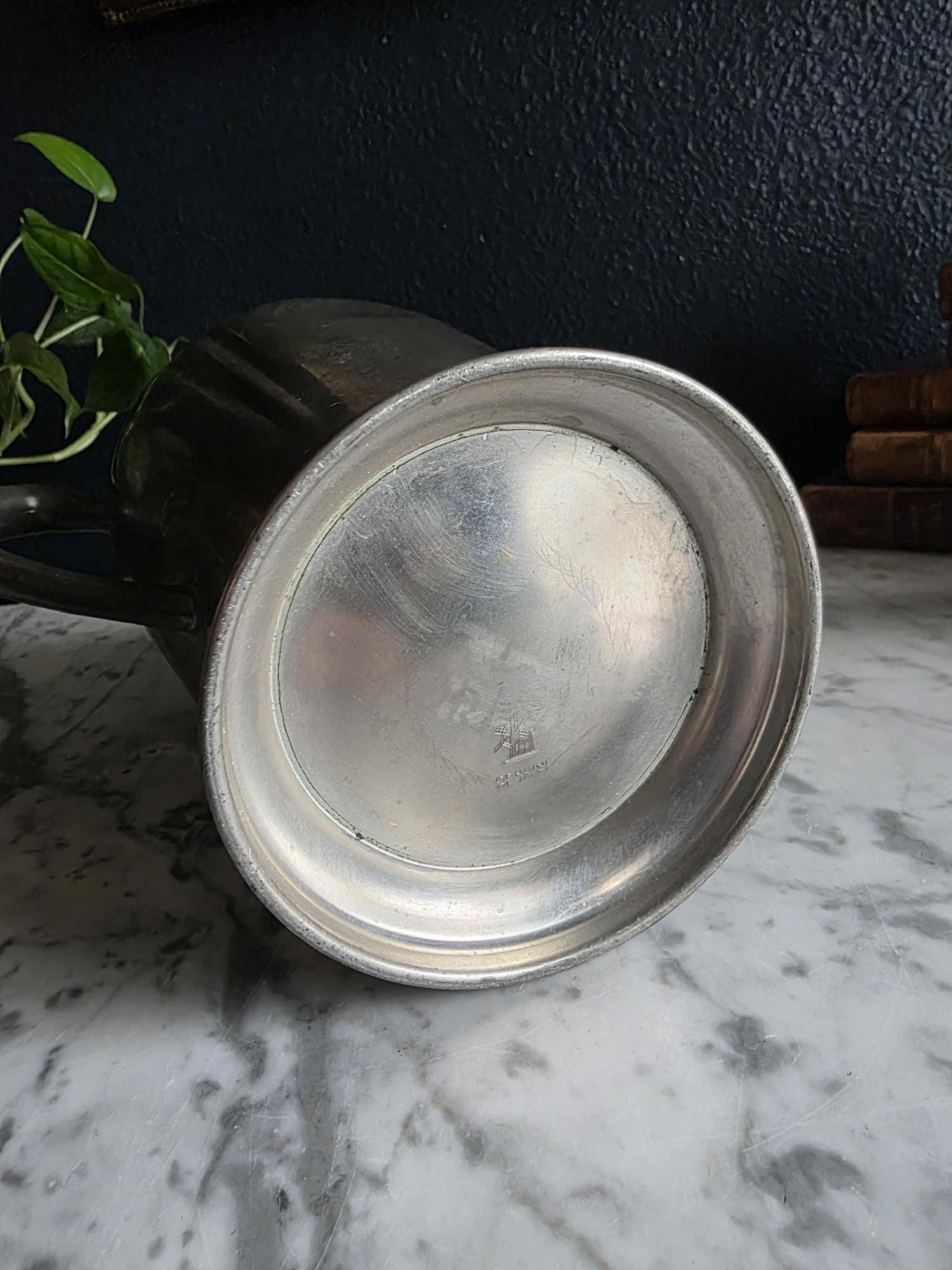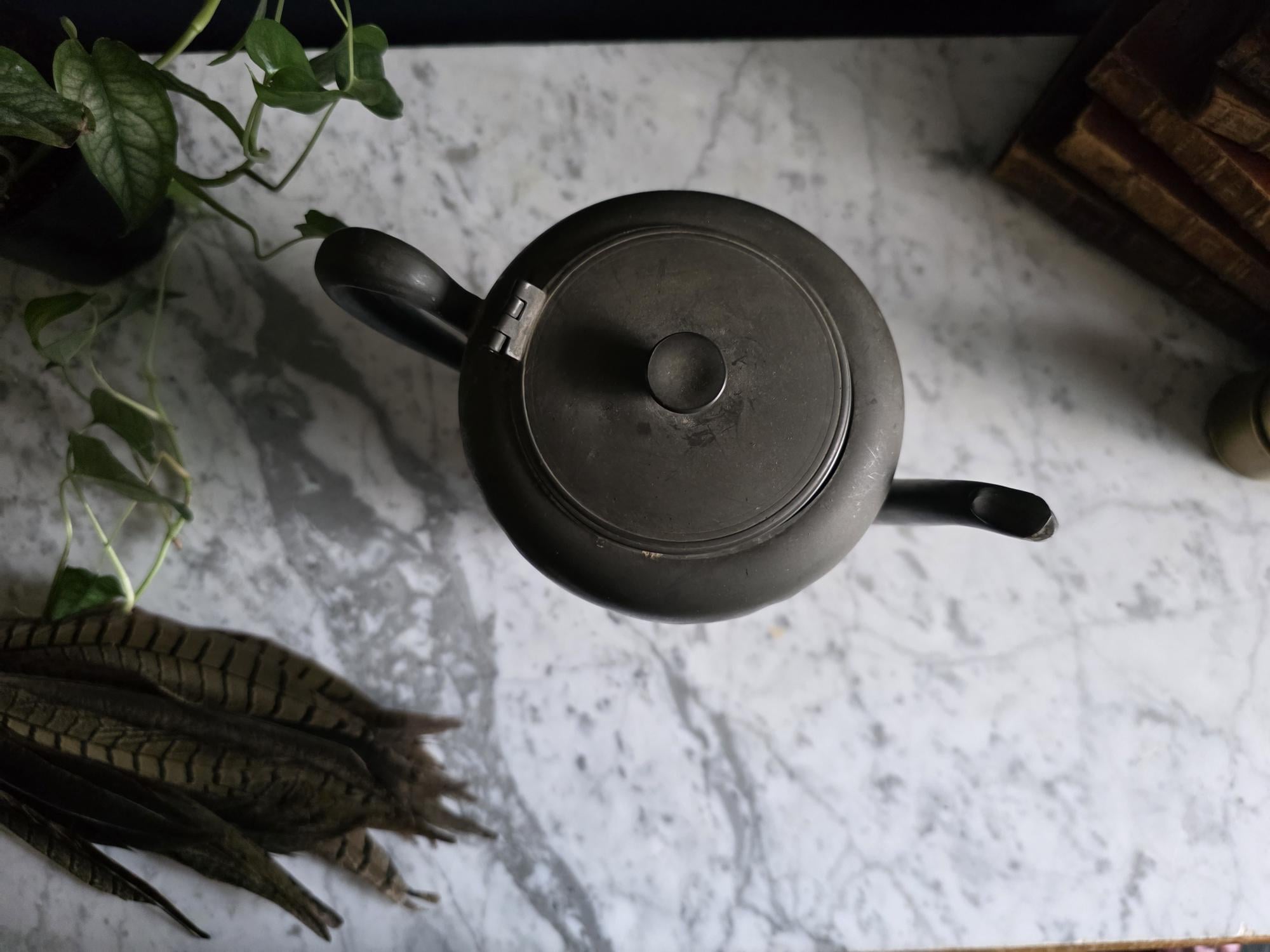 This vintage pewter coffee kettle (marked genuine pewter on the bottom of the kettle) is a striking example of classical fluted design, featuring a tall, tapered body with deep vertical panels that create a beautiful play of light and shadow. Its elegant silhouette is complemented by a curved spout and a sturdy, gracefully arched handle, while the hinged lid is topped with a simple, rounded finial for a finished look. The metal displays a rich, weathered patina with a soft, matte grey tone and authentic surface oxidation, lending it a storied, "found" quality that fits perfectly into primitive, farmhouse, or "moody" vintage aesthetics. Whether used as a sophisticated server for a morning gathering or repurposed as a unique vase for tall feathers and dried botanicals, this piece brings a sense of industrial history and timeless utility to any tabletop or mantel.