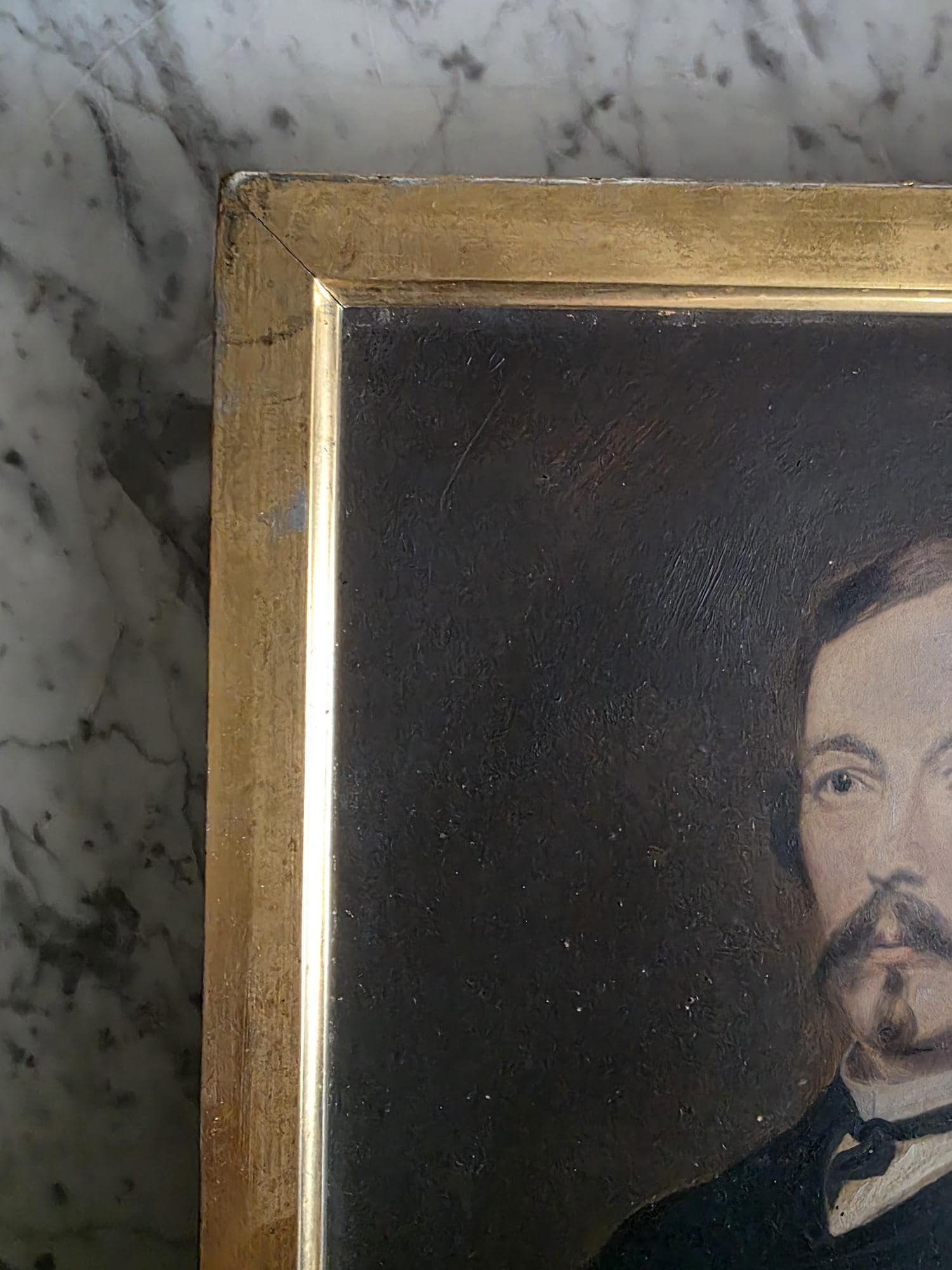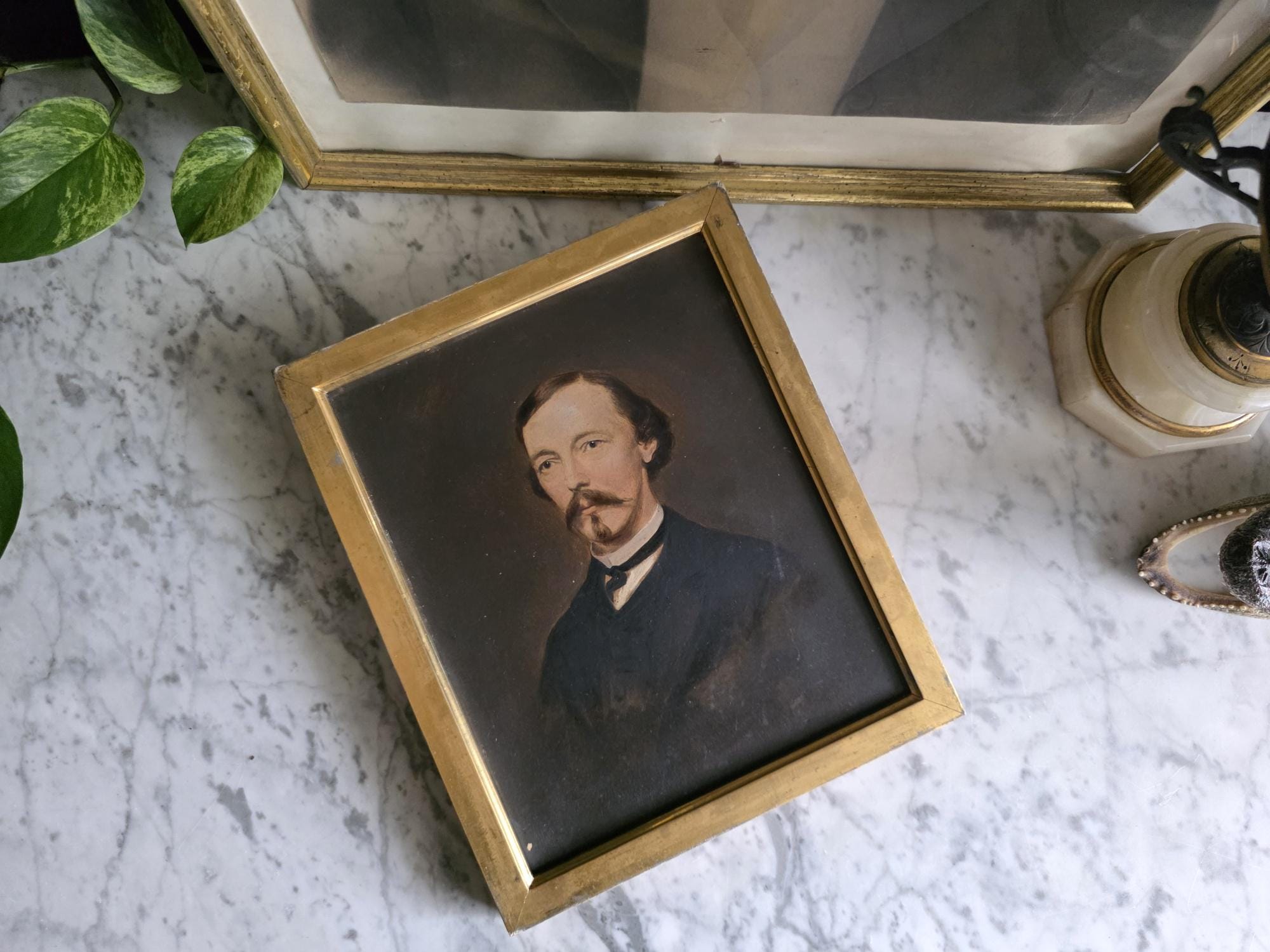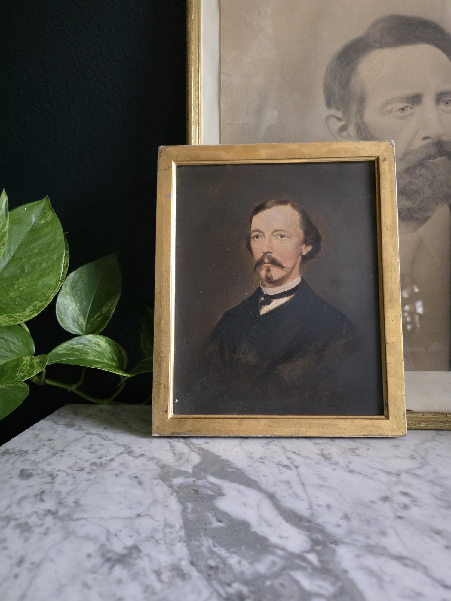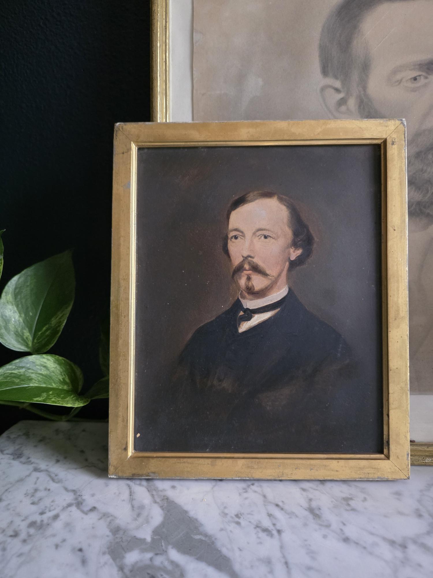 This charming antique oil painting portrait, likely dating to the mid-to-late 19th century, depicts a distinguished gentleman in a bust-length view. Painted in oil over a photographic base, a common technique of the era, the portrait captures the subject with a dark suit, high white collar, and black cravat. His face, adorned with a prominent mustache and goatee, is rendered with visible brushstrokes against a dark, atmospheric background. The artwork is housed in a simple, narrow, gold-gilt wooden frame that shows signs of age and wear, including some chips and rubbing. The painting itself has a lovely aged patina, with some minor paint loss, surface dirt, and a slightly yellowed varnish, which only adds to its historical character.