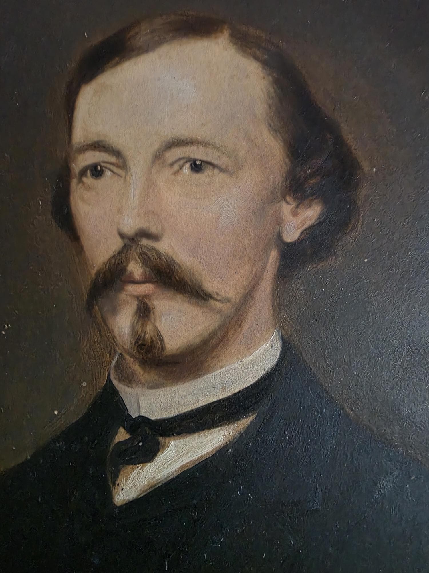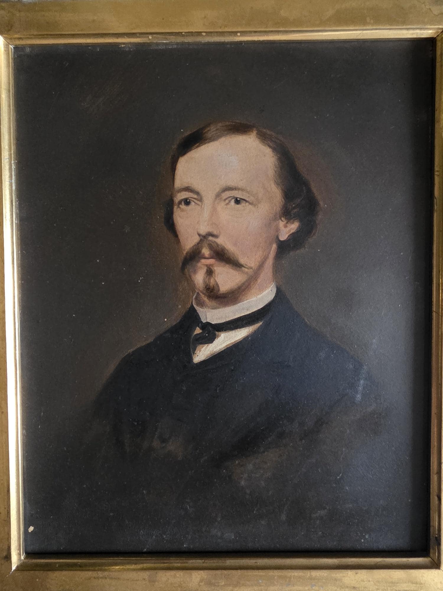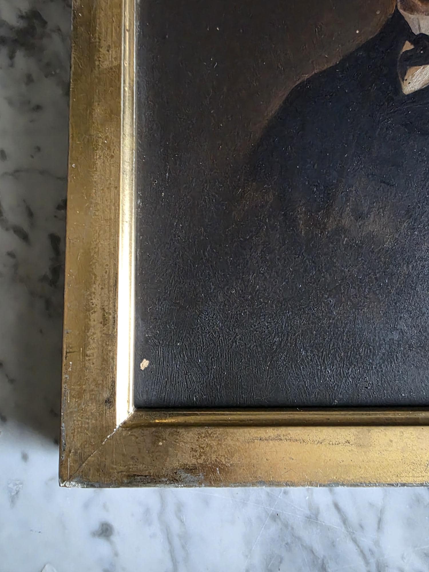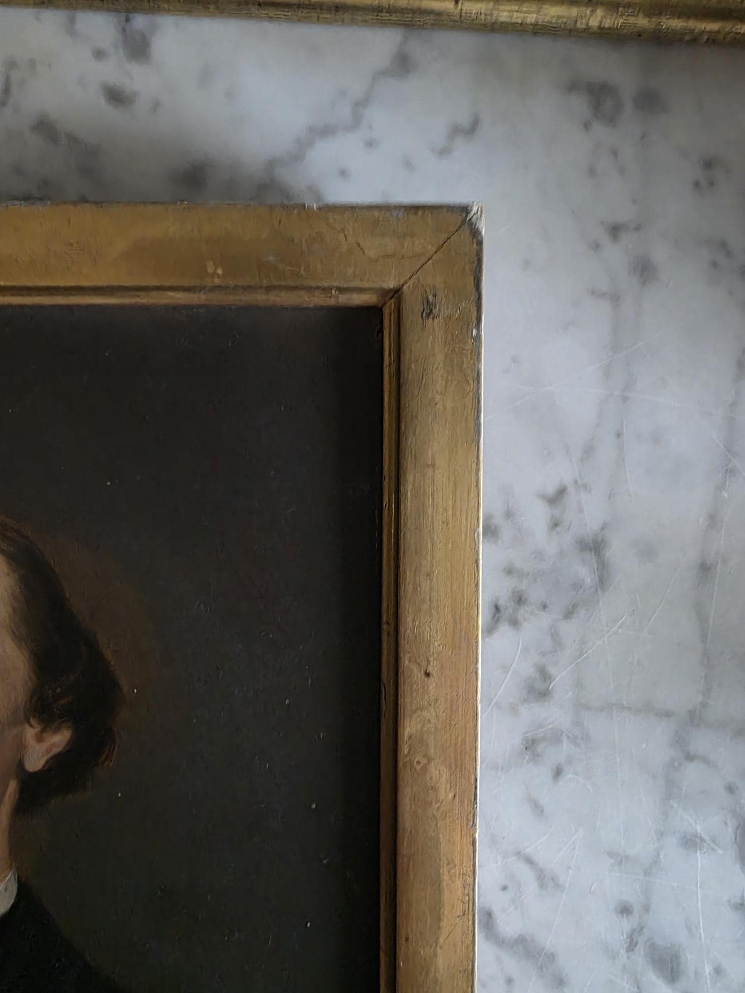 This charming antique oil painting portrait, likely dating to the mid-to-late 19th century, depicts a distinguished gentleman in a bust-length view. Painted in oil over a photographic base, a common technique of the era, the portrait captures the subject with a dark suit, high white collar, and black cravat. His face, adorned with a prominent mustache and goatee, is rendered with visible brushstrokes against a dark, atmospheric background. The artwork is housed in a simple, narrow, gold-gilt wooden frame that shows signs of age and wear, including some chips and rubbing. The painting itself has a lovely aged patina, with some minor paint loss, surface dirt, and a slightly yellowed varnish, which only adds to its historical character.