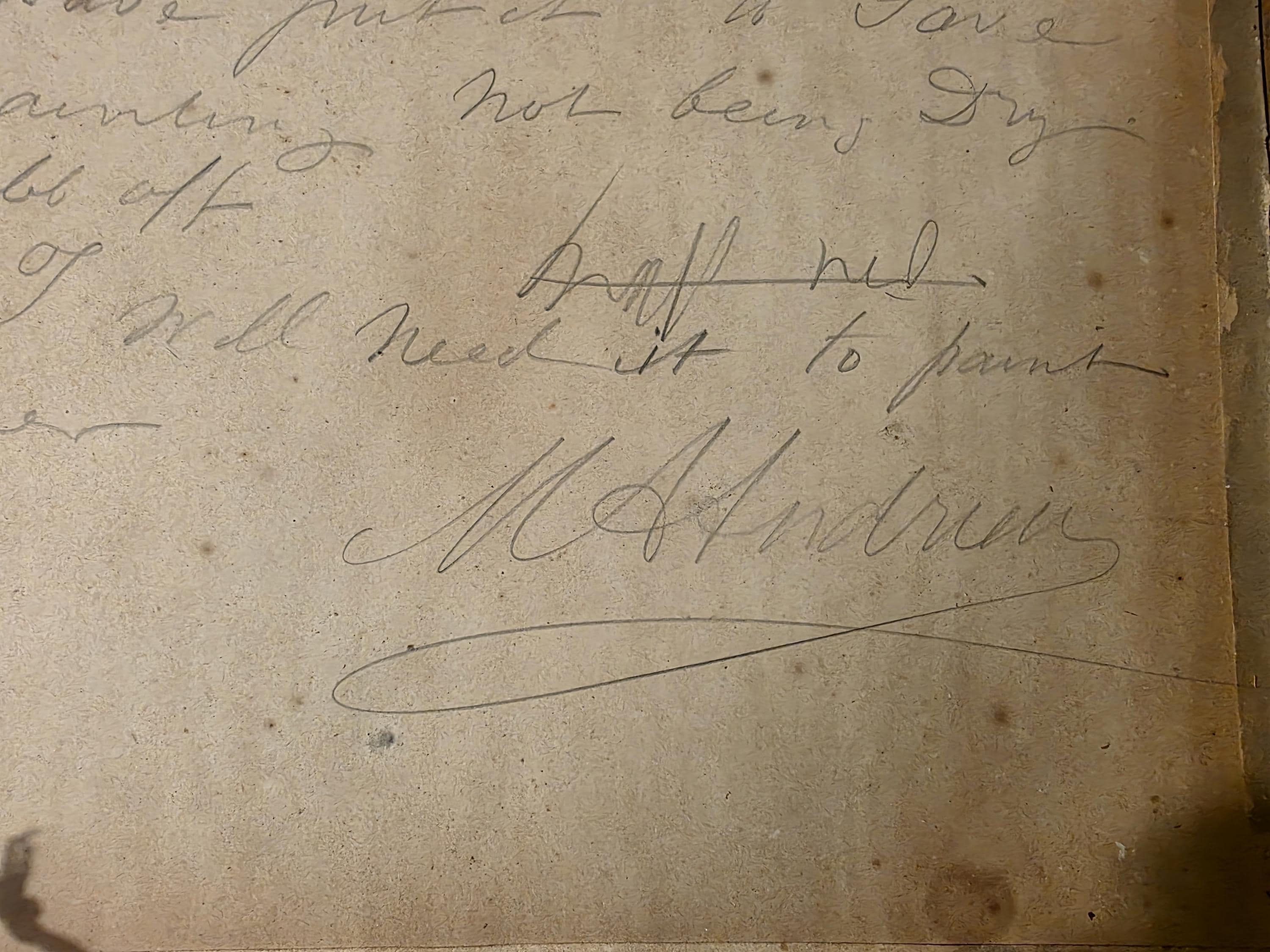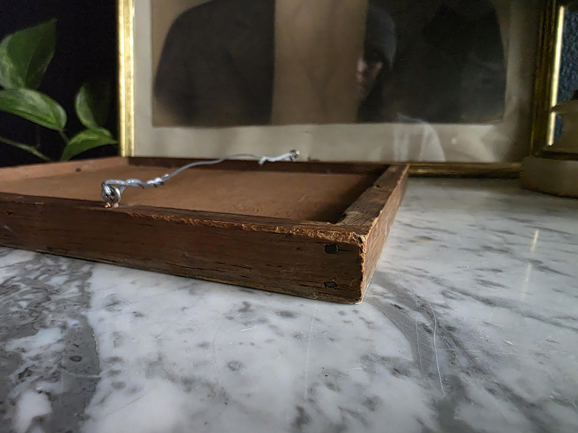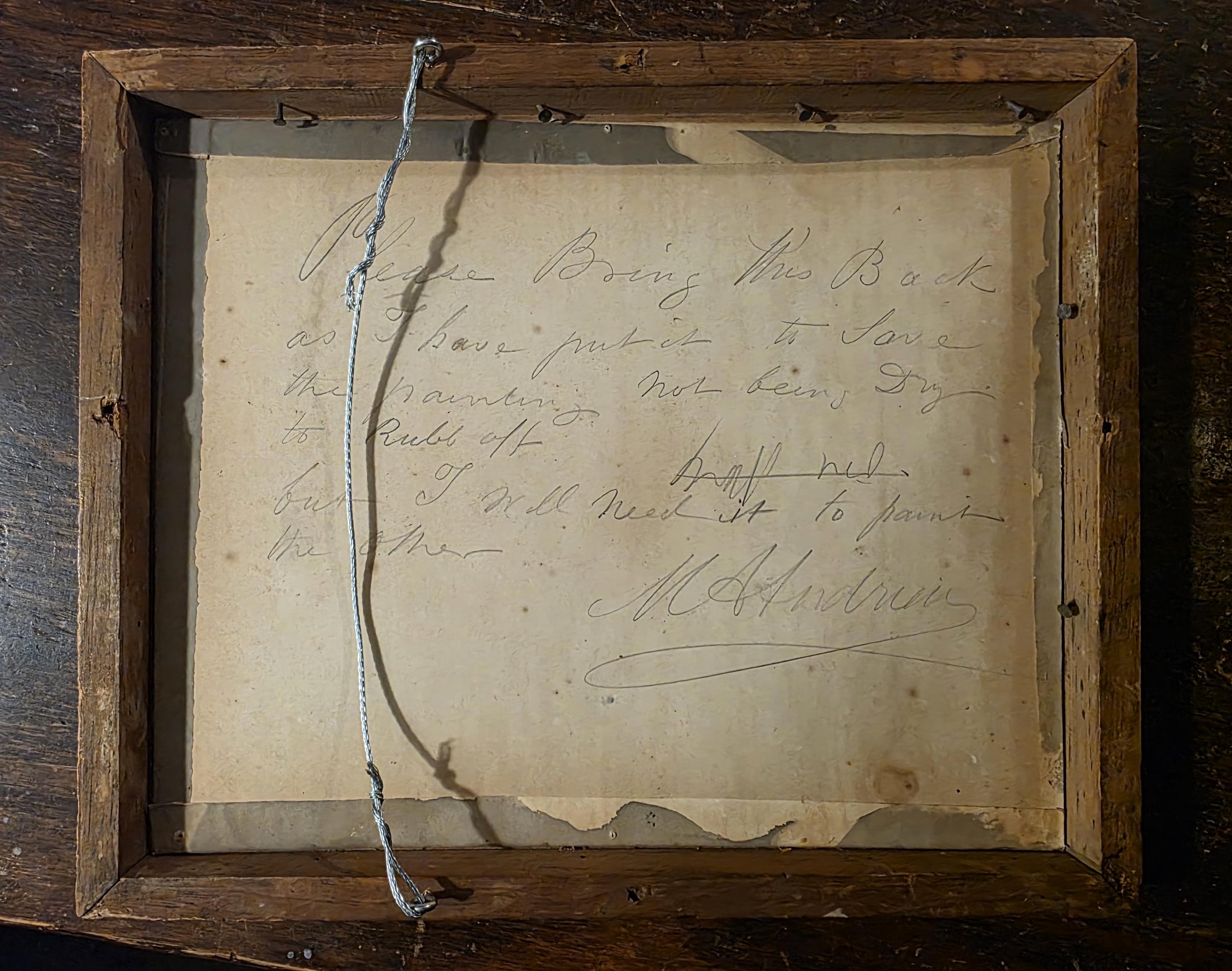 What makes this particular piece truly fascinating is the handwritten inscription found on the reverse. The back of the panel features a poignant note in cursive script that reads: "Please Bring This Back as I have put it ... to save the painting not being dry to rubb off but I will need it to paint the other," followed by the signature "M. A. Andrews". This inscription offers a rare, intimate glimpse into the artist's process, suggesting that the work was handled while the oil paint was still tacky and that it served as a reference for a companion piece. The reverse side also reveals the original wood panel backing secured by small nails and a simple wire hanger. This portrait, with its direct connection to the artist M. A. Andrews, would make a handsome and historically significant addition to a gallery wall, study, or any collection of 19th-century Americana.