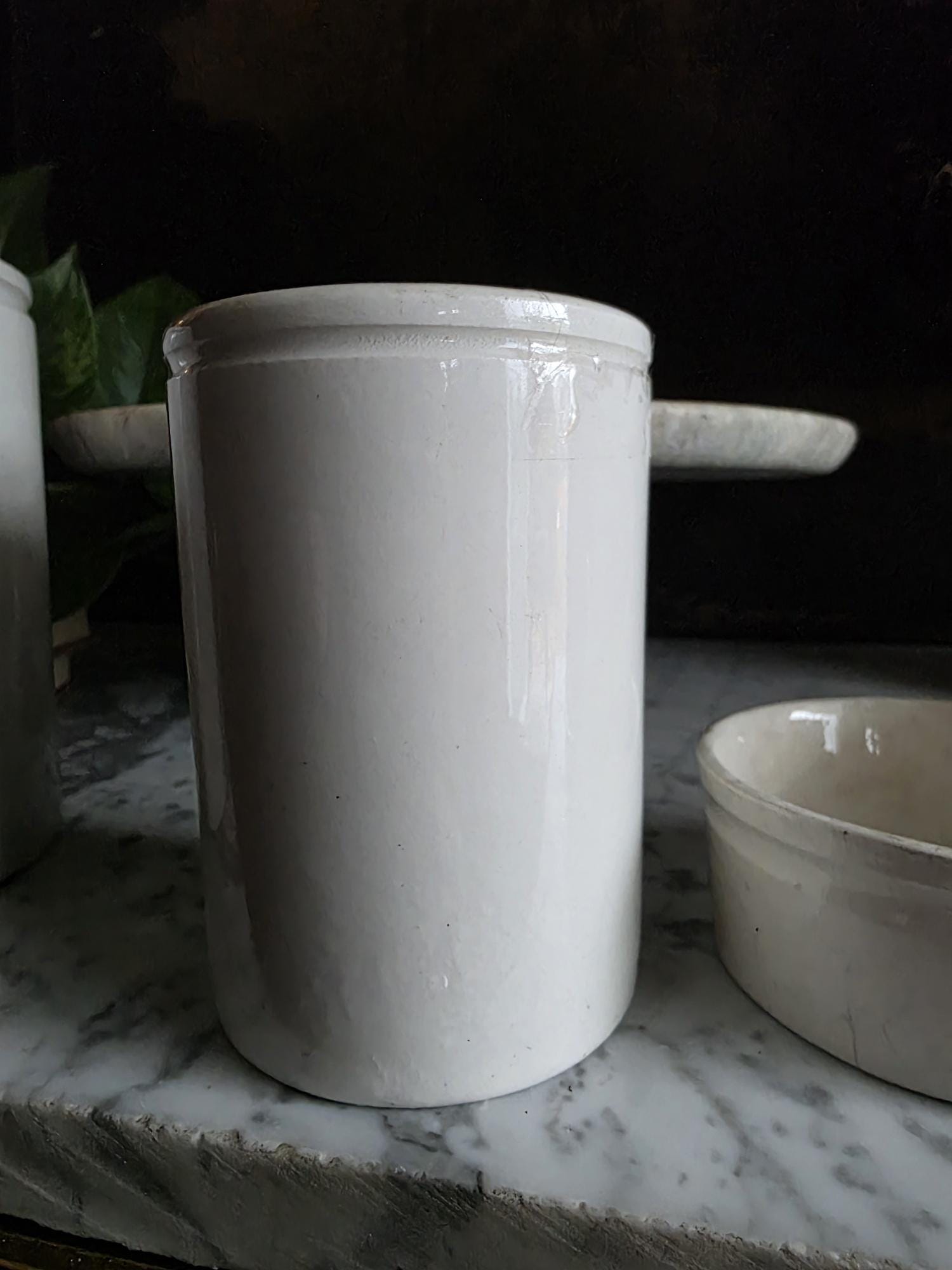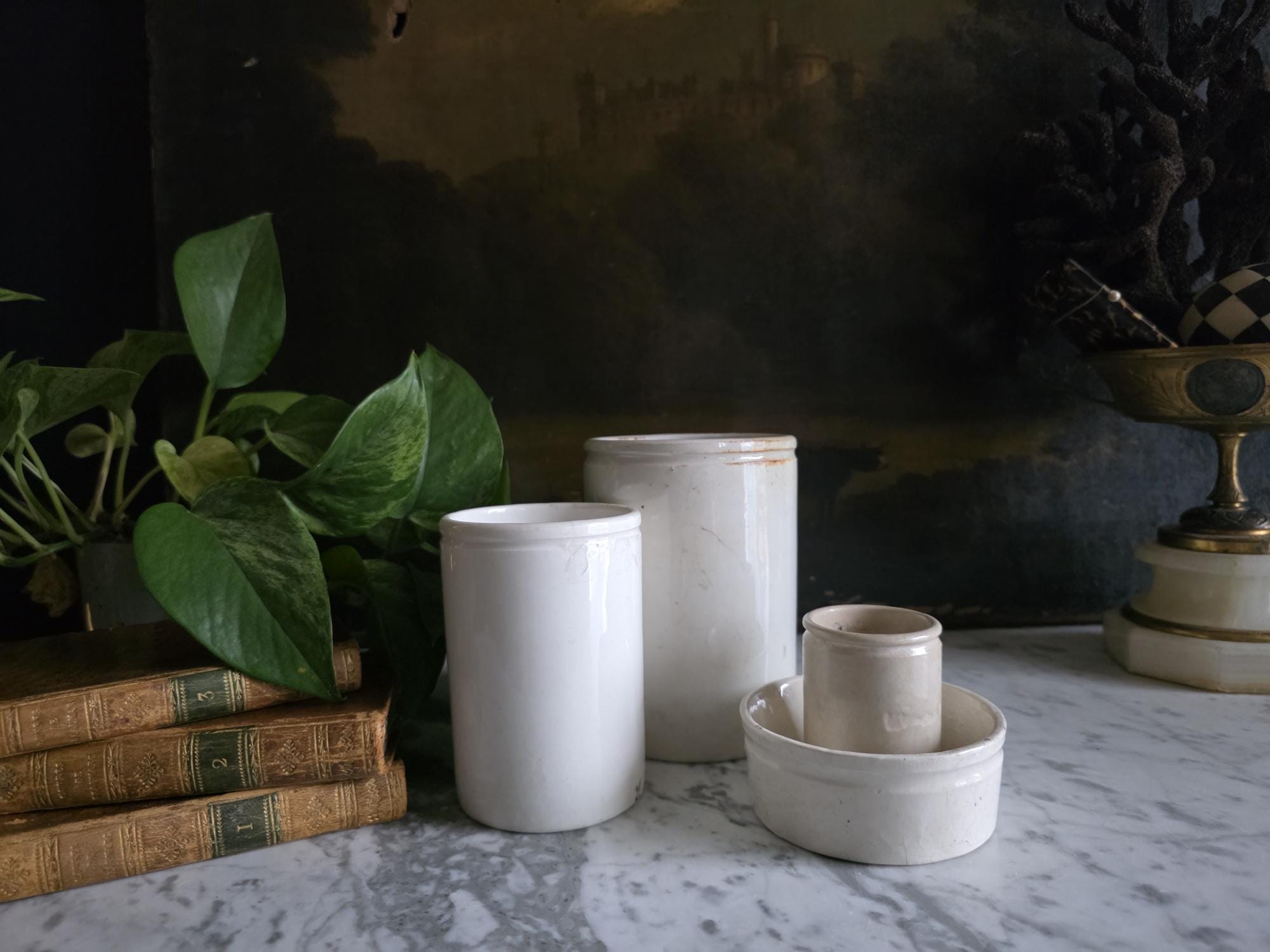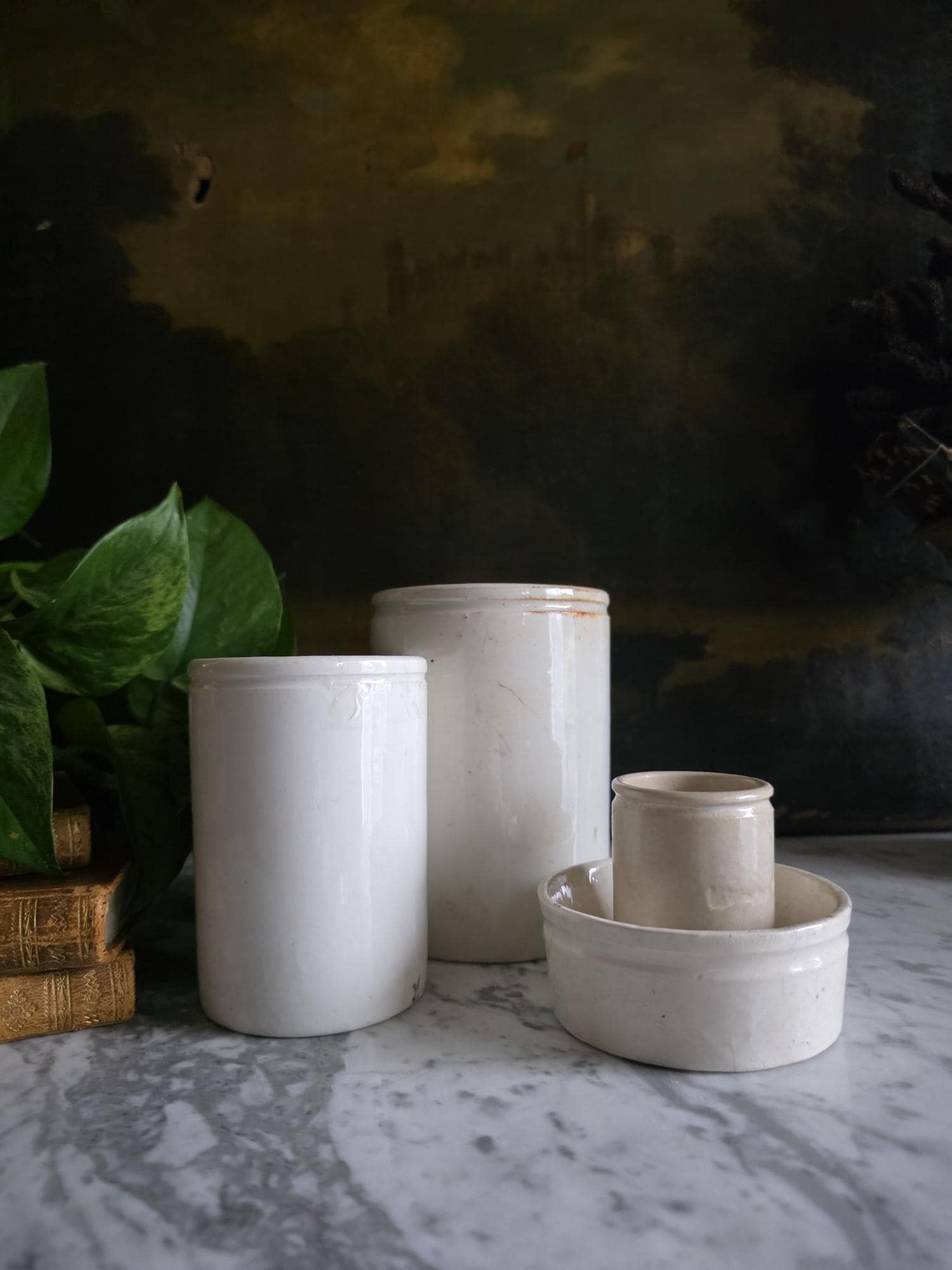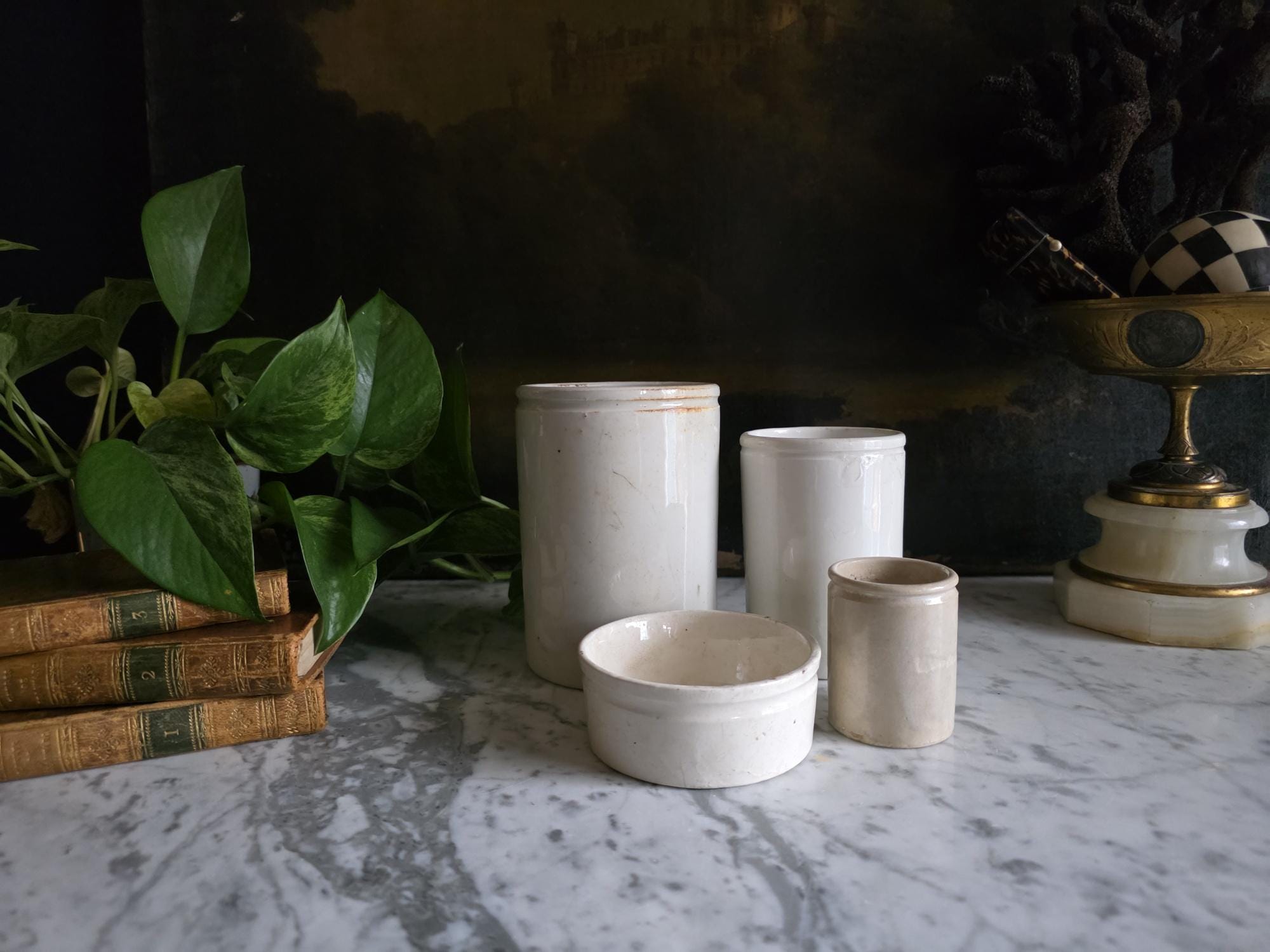 This set of four antique ceramic stoneware crocks offers a timeless, utilitarian charm that anchors any rustic or traditional interior. Each piece in this collection features a classic cylindrical form with a simple, rolled rim and a lustrous off-white glaze that highlights the subtle variations and "perfect imperfections" inherent in period stoneware. The group includes three upright jars of graduating heights and one shallow, bowl-style crock, providing a versatile range of silhouettes for display or functional storage.