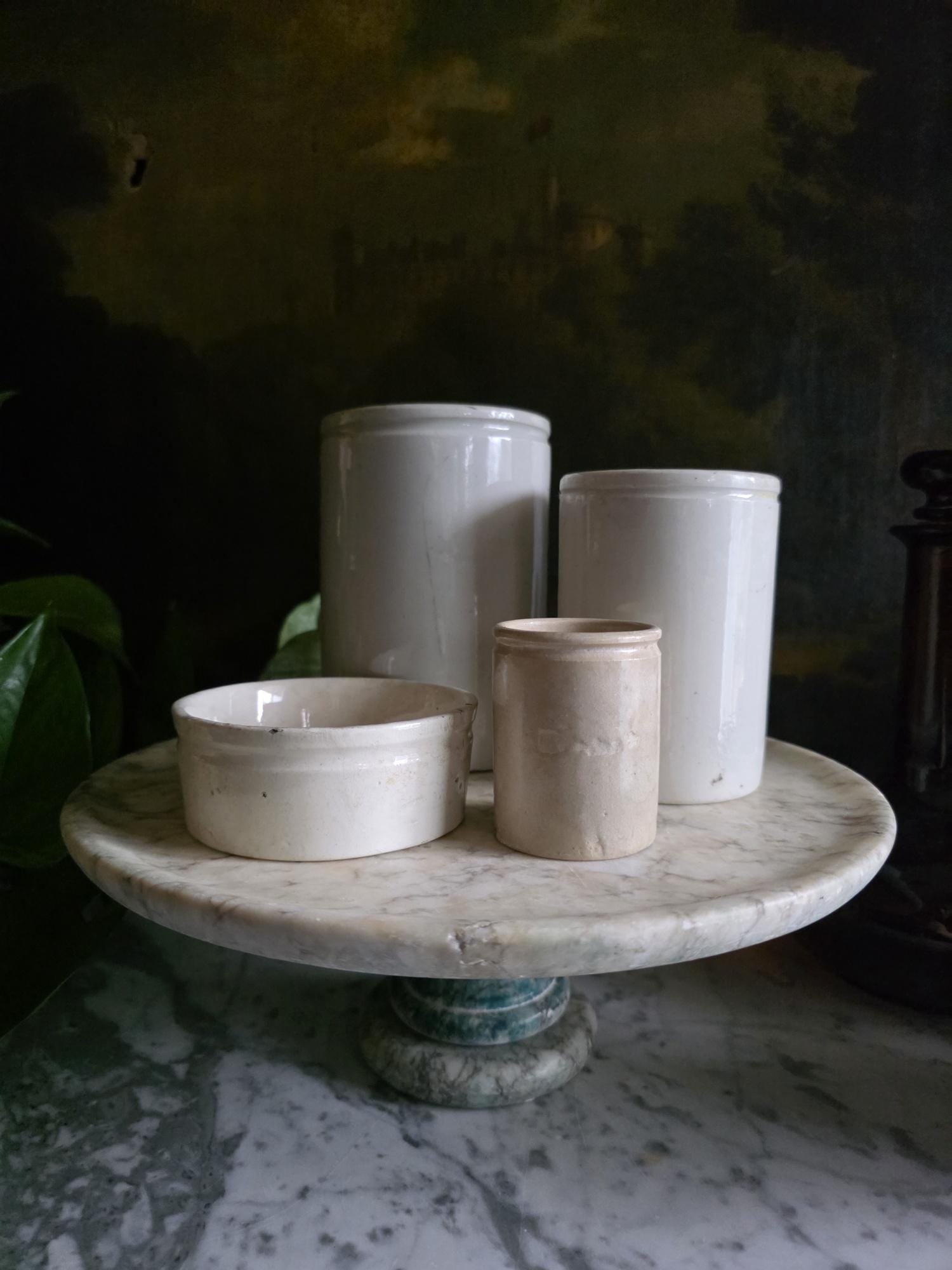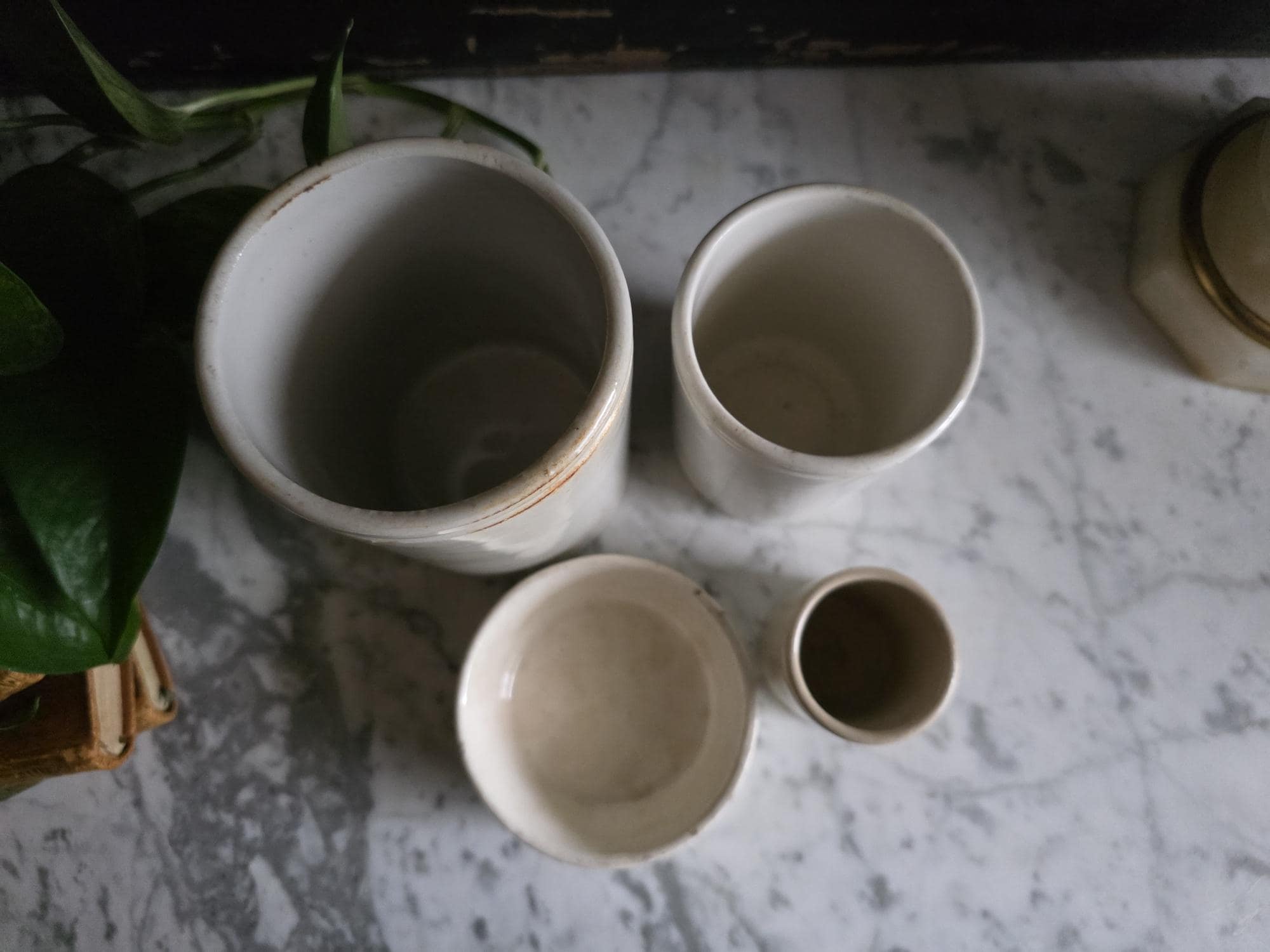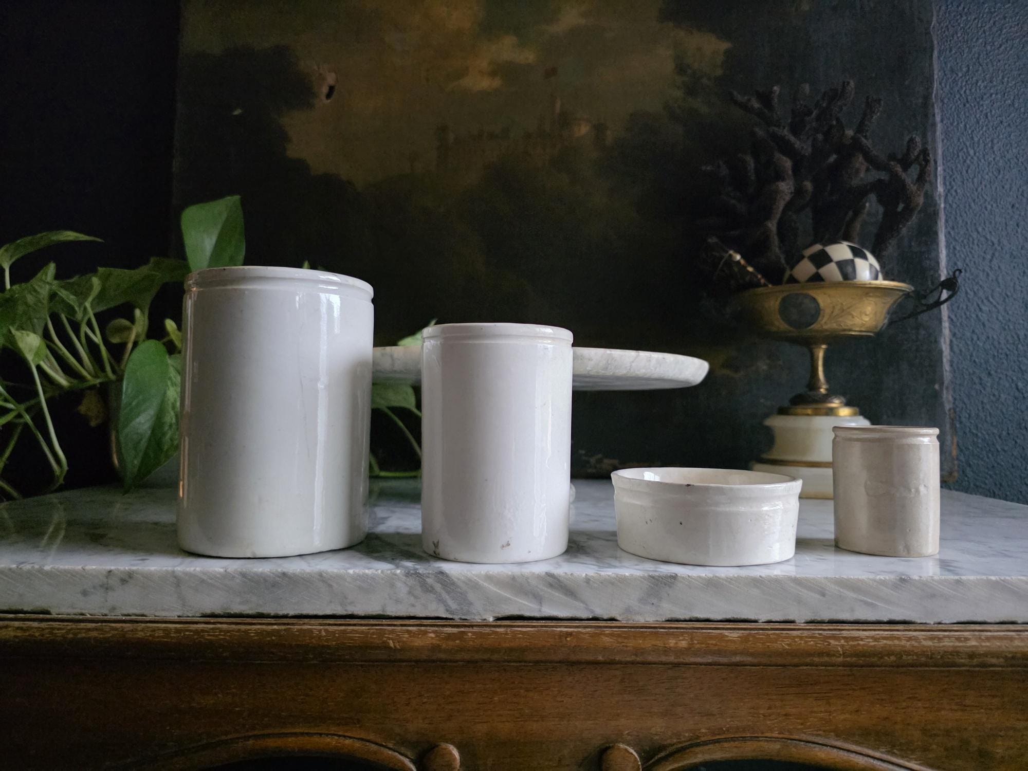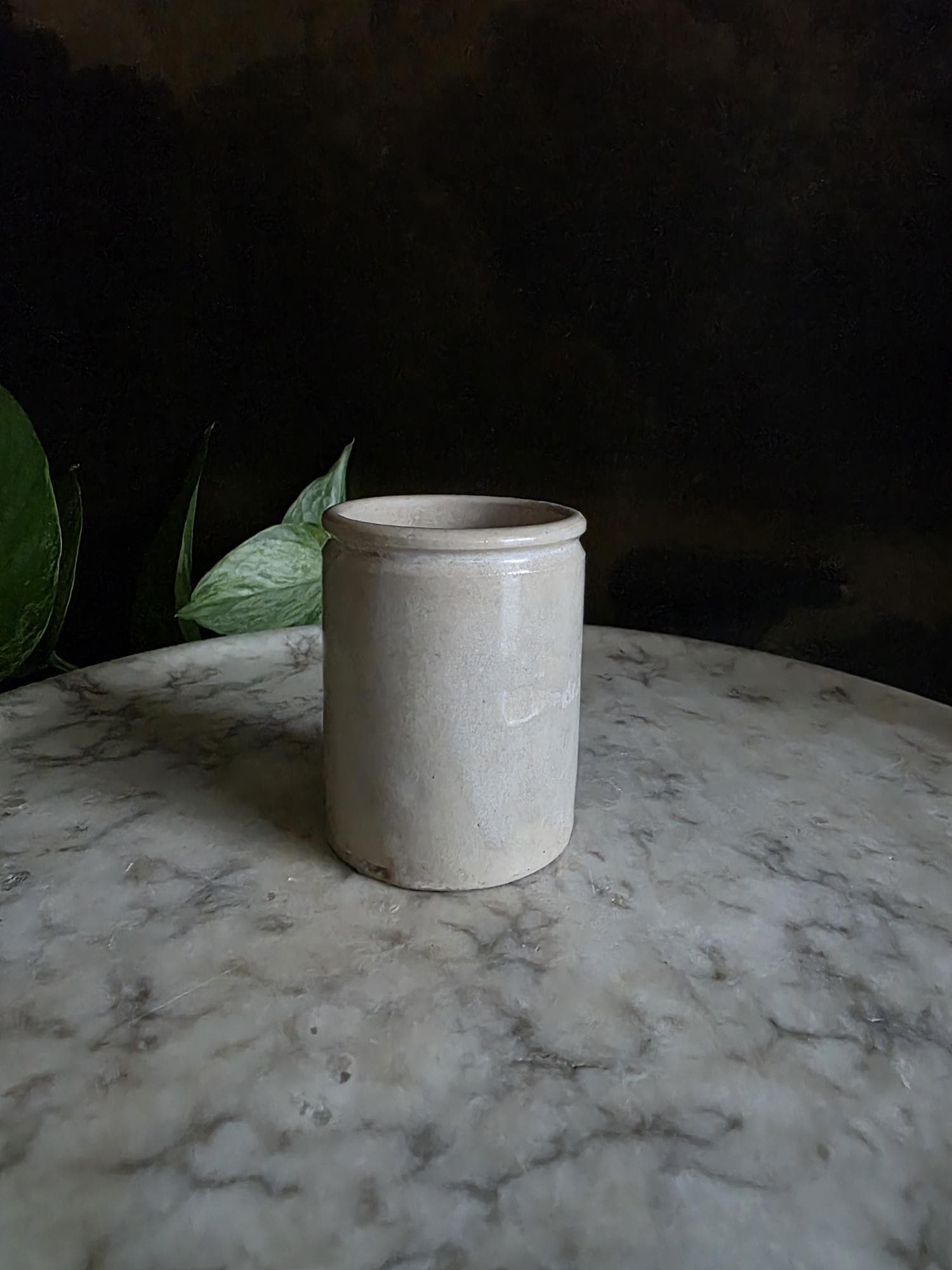 This set of four antique ceramic stoneware crocks offers a timeless, utilitarian charm that anchors any rustic or traditional interior. Each piece in this collection features a classic cylindrical form with a simple, rolled rim and a lustrous off-white glaze that highlights the subtle variations and "perfect imperfections" inherent in period stoneware. The group includes three upright jars of graduating heights and one shallow, bowl-style crock, providing a versatile range of silhouettes for display or functional storage.