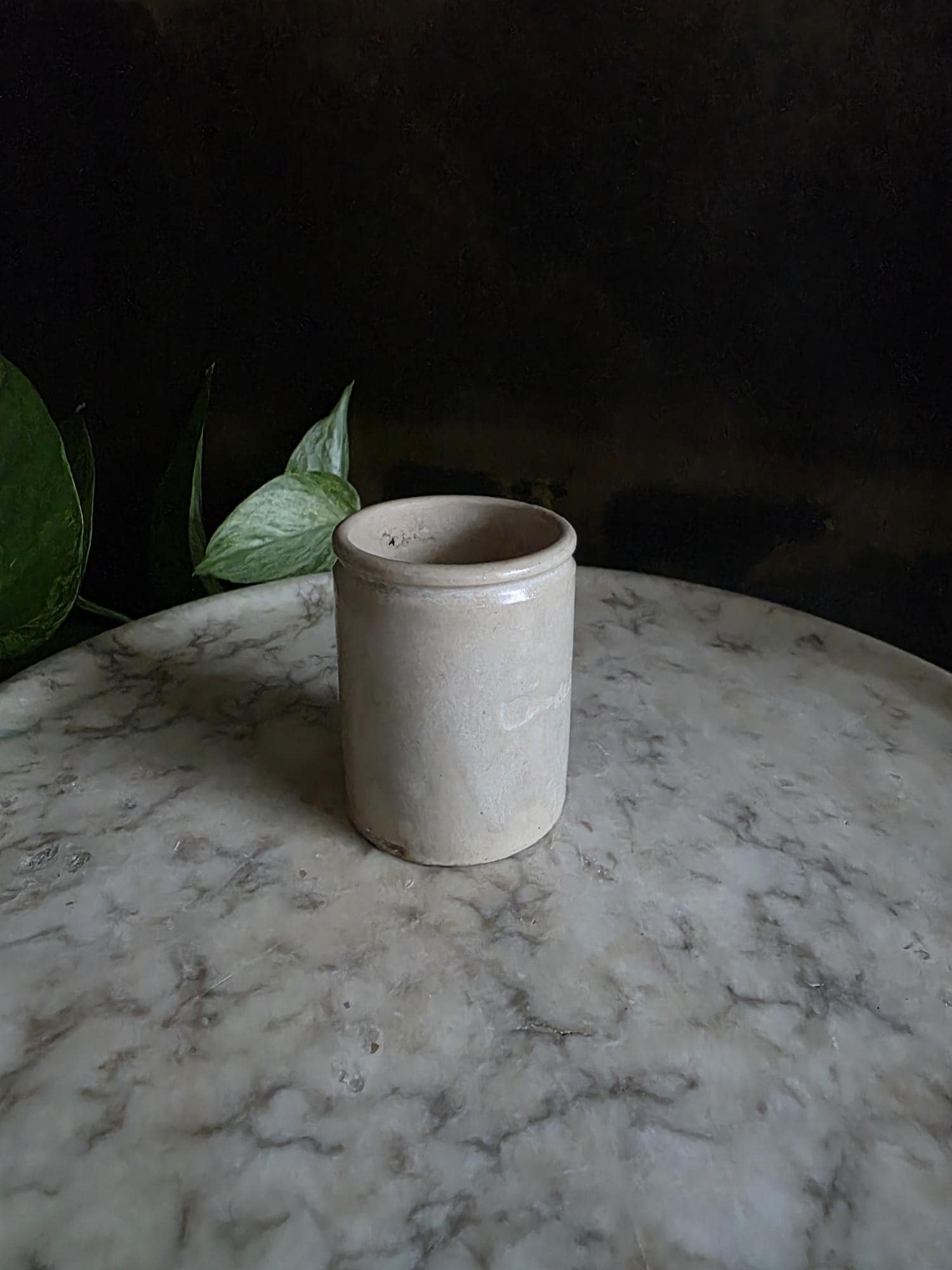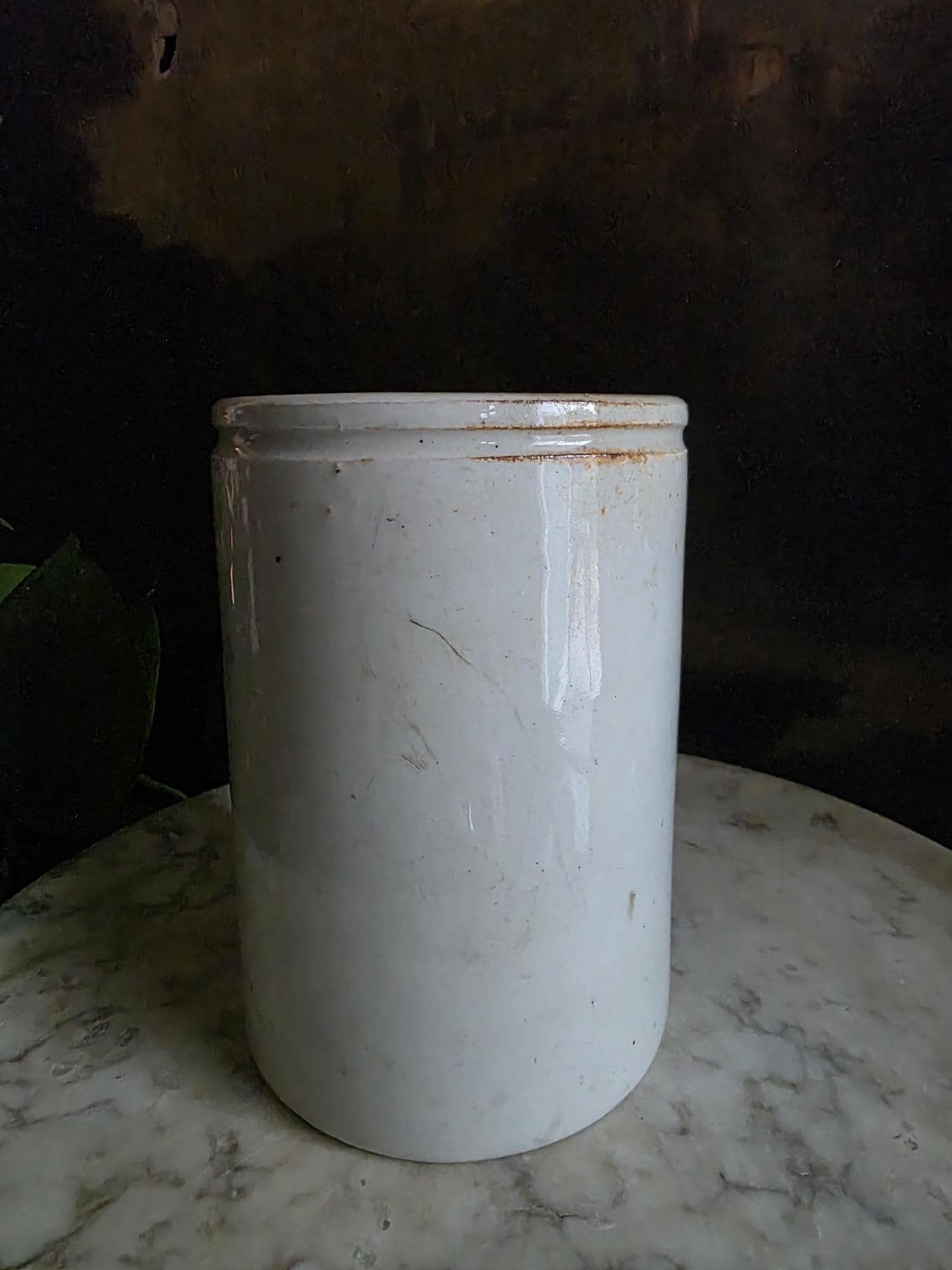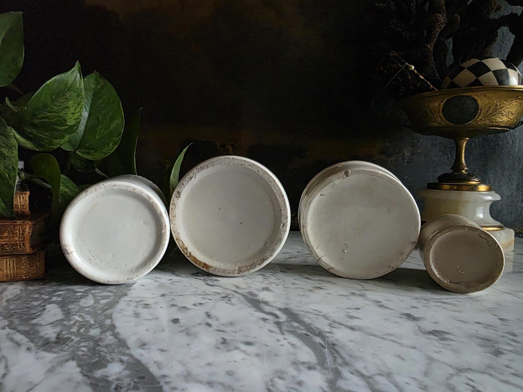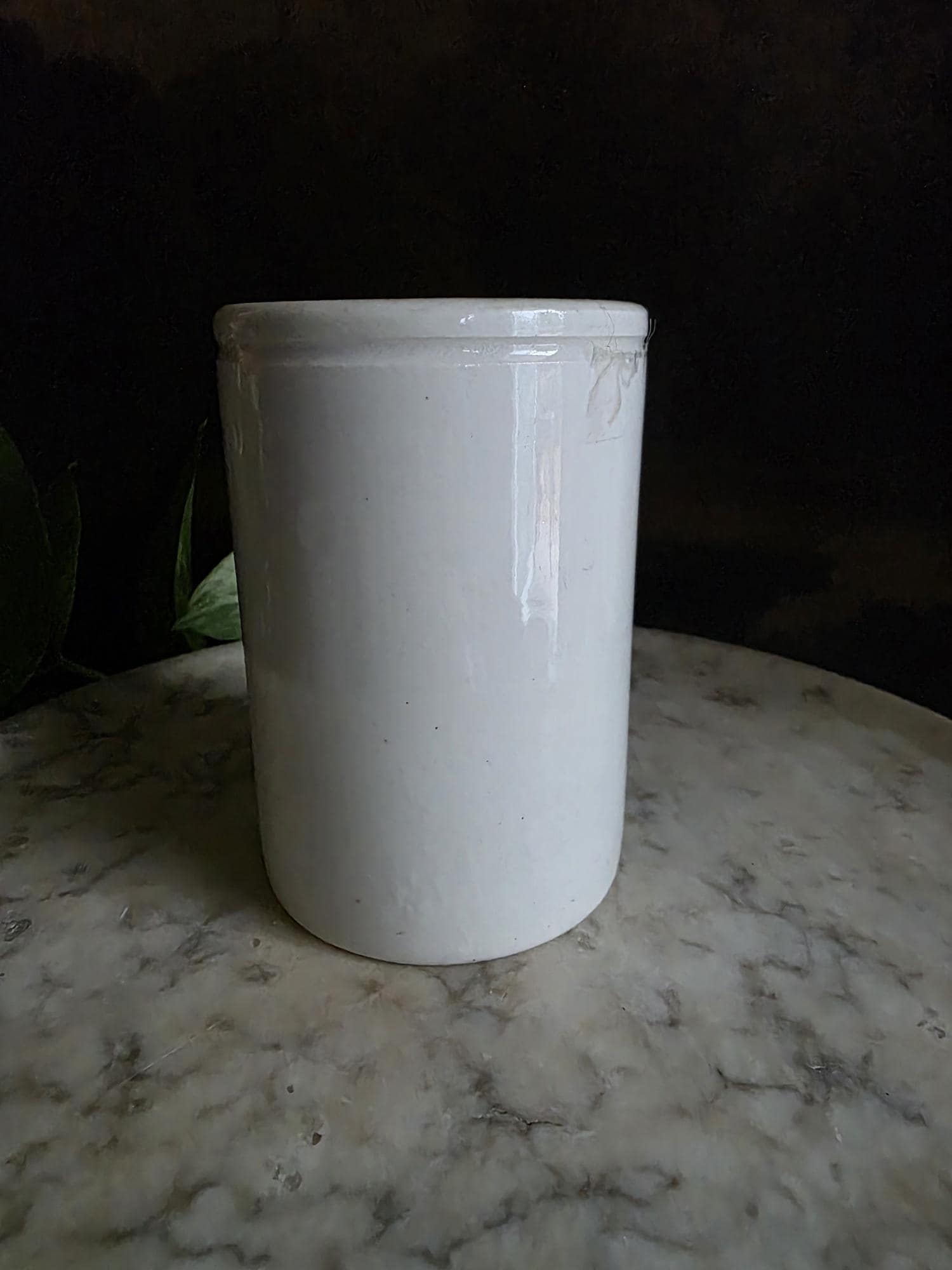 This set of four antique ceramic stoneware crocks offers a timeless, utilitarian charm that anchors any rustic or traditional interior. Each piece in this collection features a classic cylindrical form with a simple, rolled rim and a lustrous off-white glaze that highlights the subtle variations and "perfect imperfections" inherent in period stoneware. The group includes three upright jars of graduating heights and one shallow, bowl-style crock, providing a versatile range of silhouettes for display or functional storage.