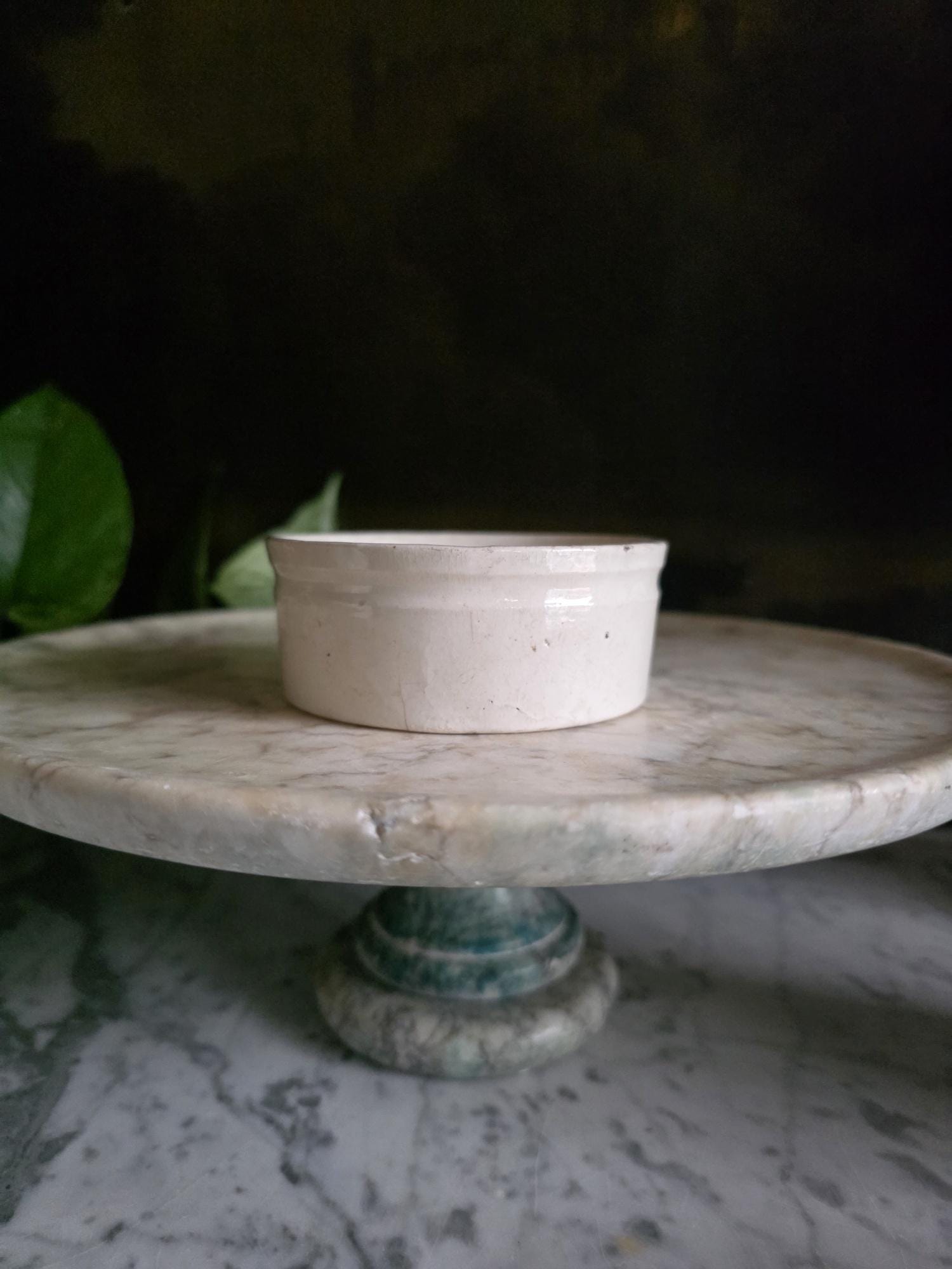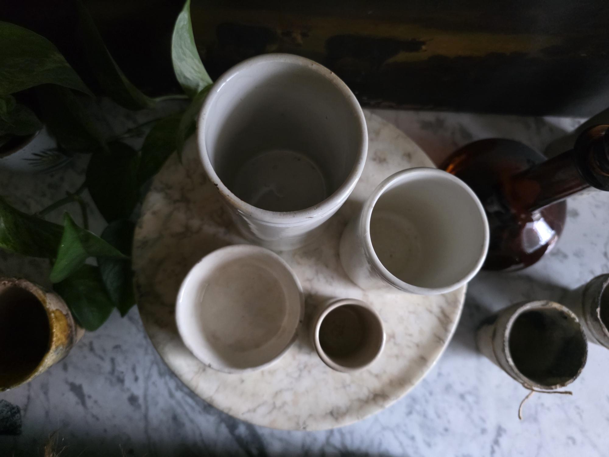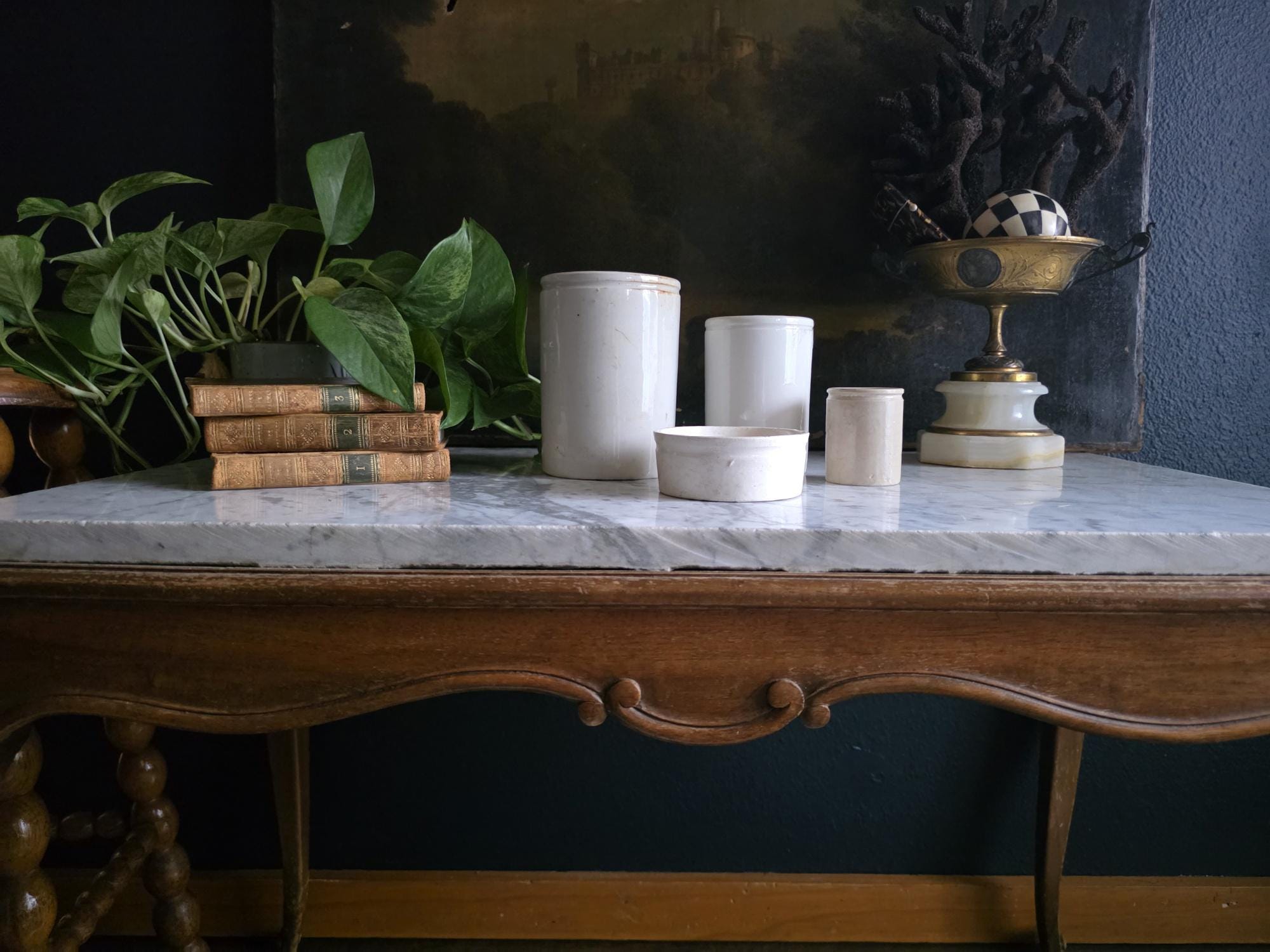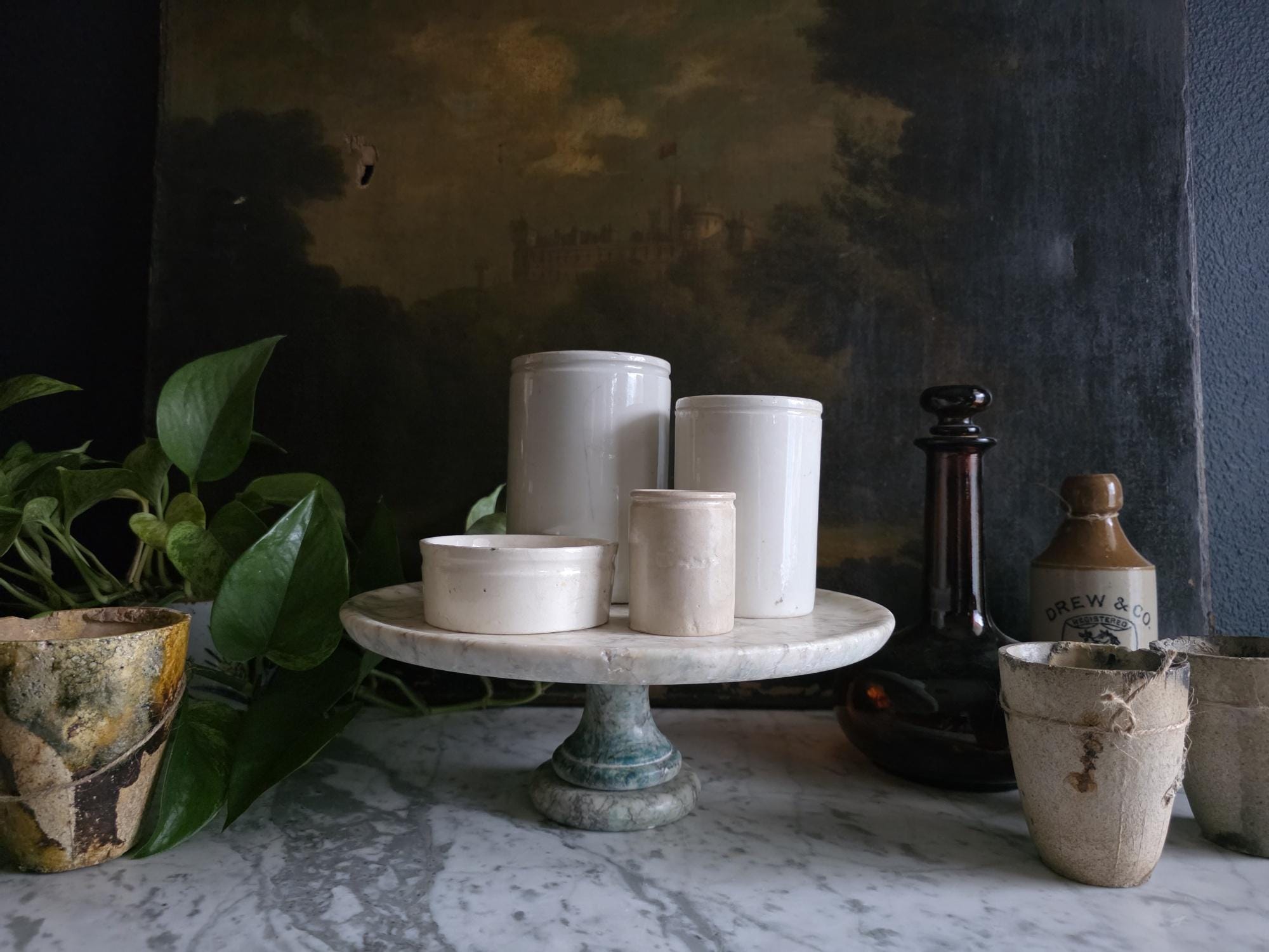 This set of four antique ceramic stoneware crocks offers a timeless, utilitarian charm that anchors any rustic or traditional interior. Each piece in this collection features a classic cylindrical form with a simple, rolled rim and a lustrous off-white glaze that highlights the subtle variations and "perfect imperfections" inherent in period stoneware. The group includes three upright jars of graduating heights and one shallow, bowl-style crock, providing a versatile range of silhouettes for display or functional storage.