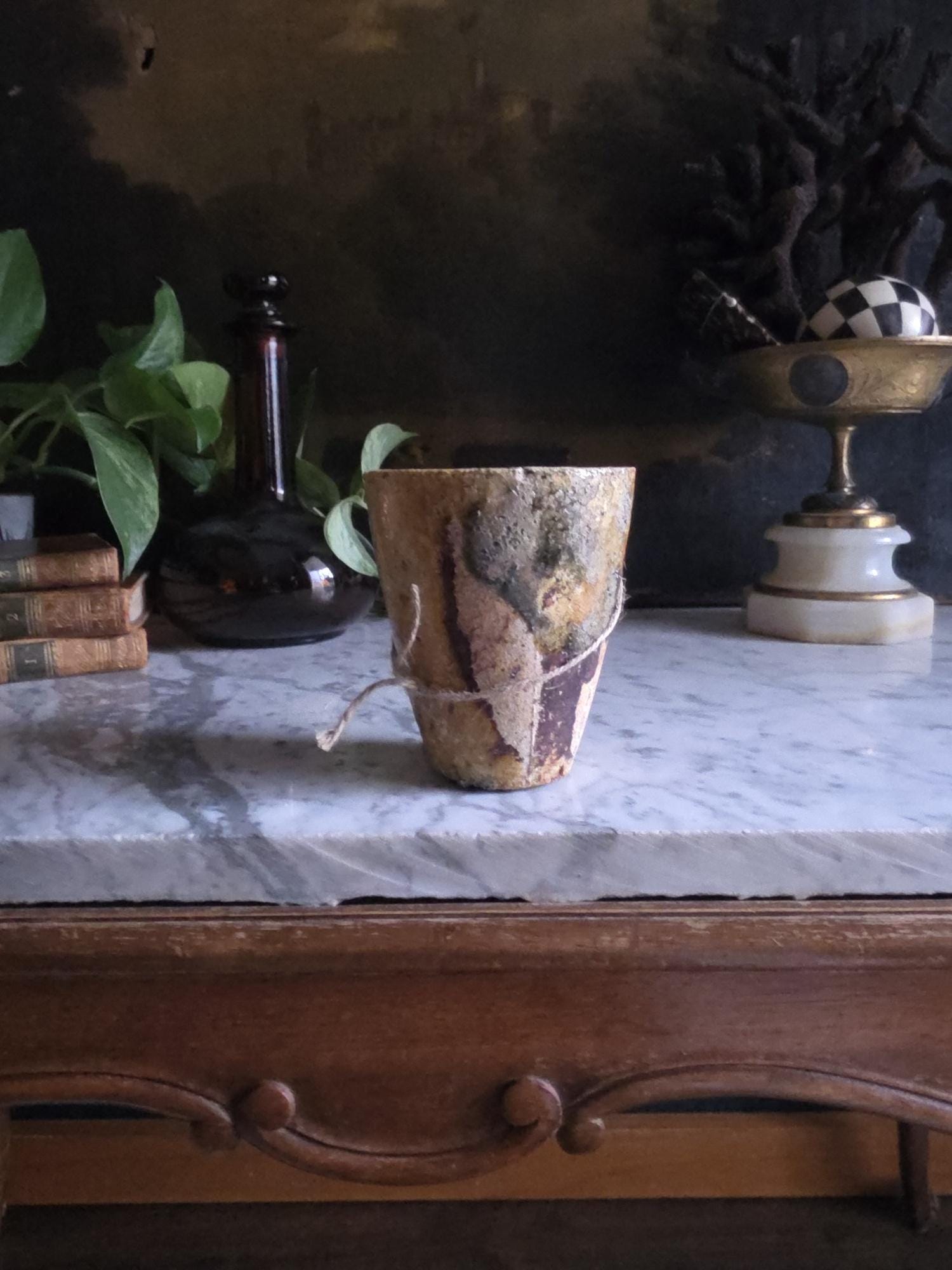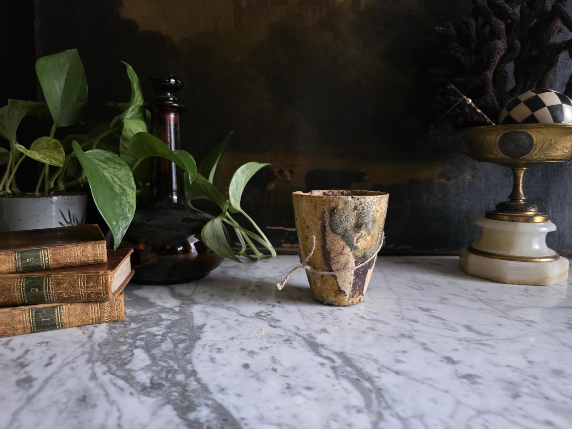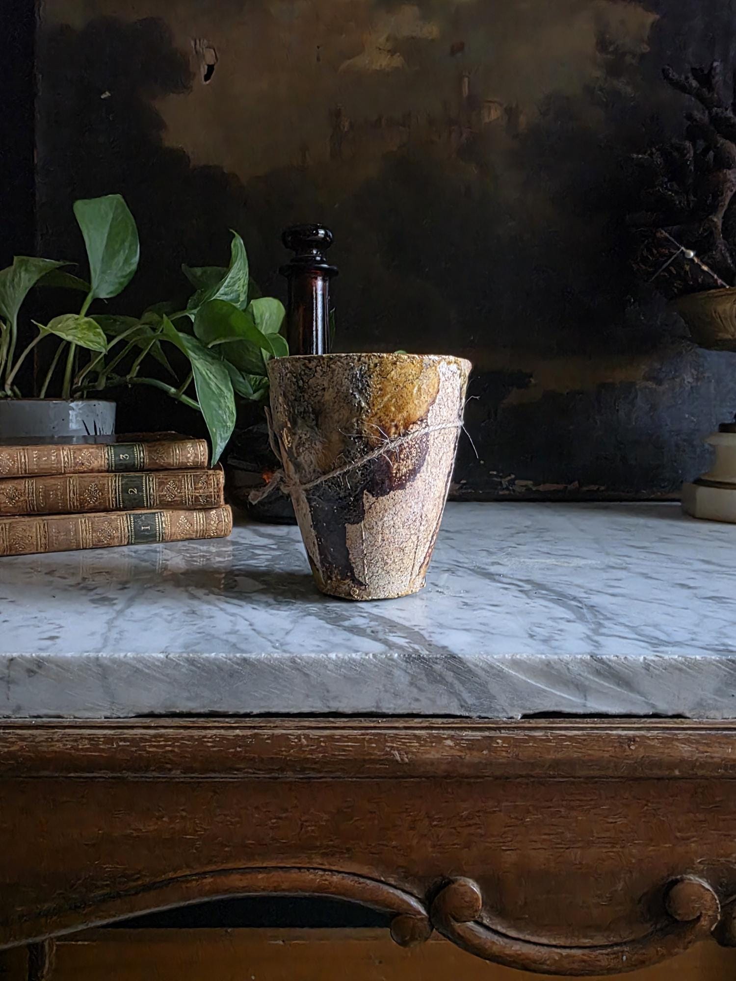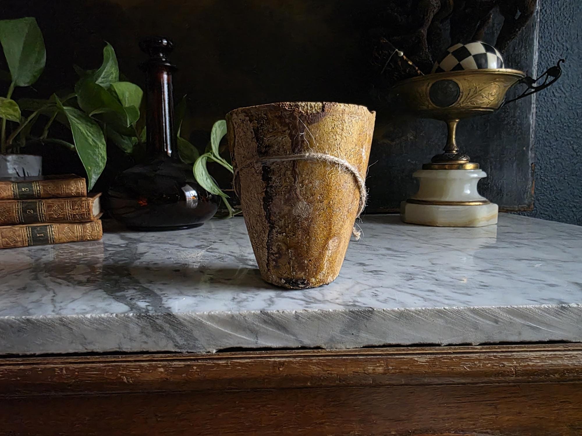 Unlike typical neutral-toned foundry relics, this crucible possesses a high-contrast aesthetic that bridges the gap between industrial artifact and fine ceramic art. The interior reveals a weathered, earthy core with visible mineral deposits and carbon staining, while the exterior's fiery patination makes it a compelling focal point for a primitive vignette or a modern minimalist space. Whether displayed as a standalone object of curiosity on a mantle or used to add a raw, organic element to a bookshelf, this sturdy relic is a testament to the unexpected beauty found in historic industrial labor.