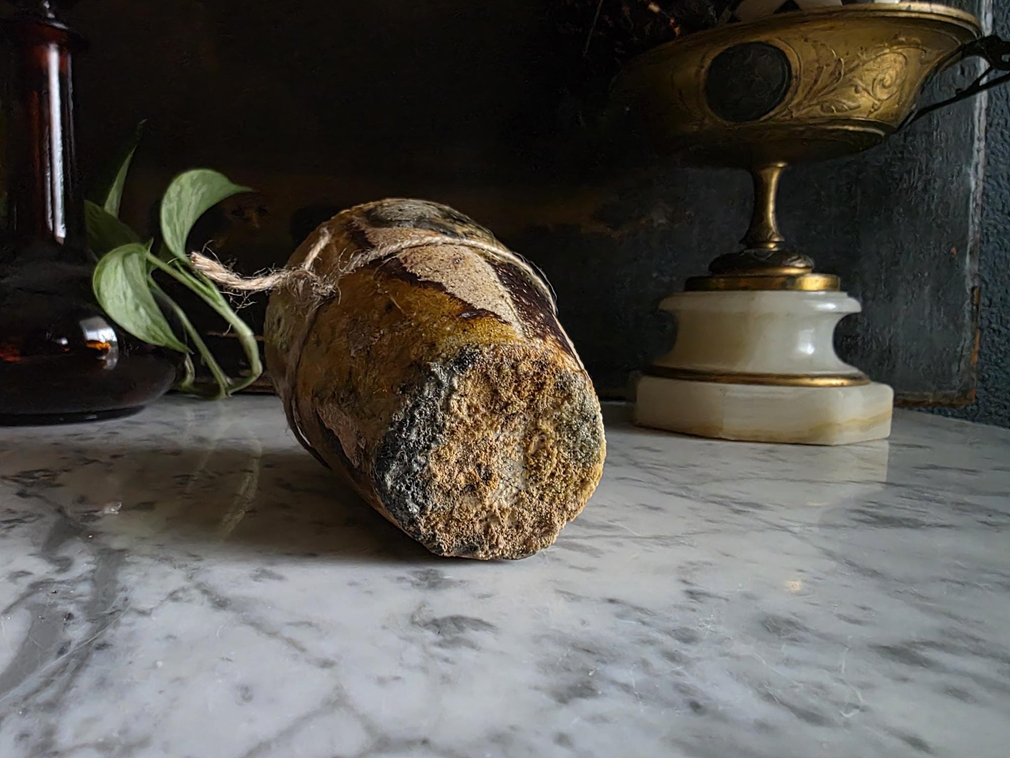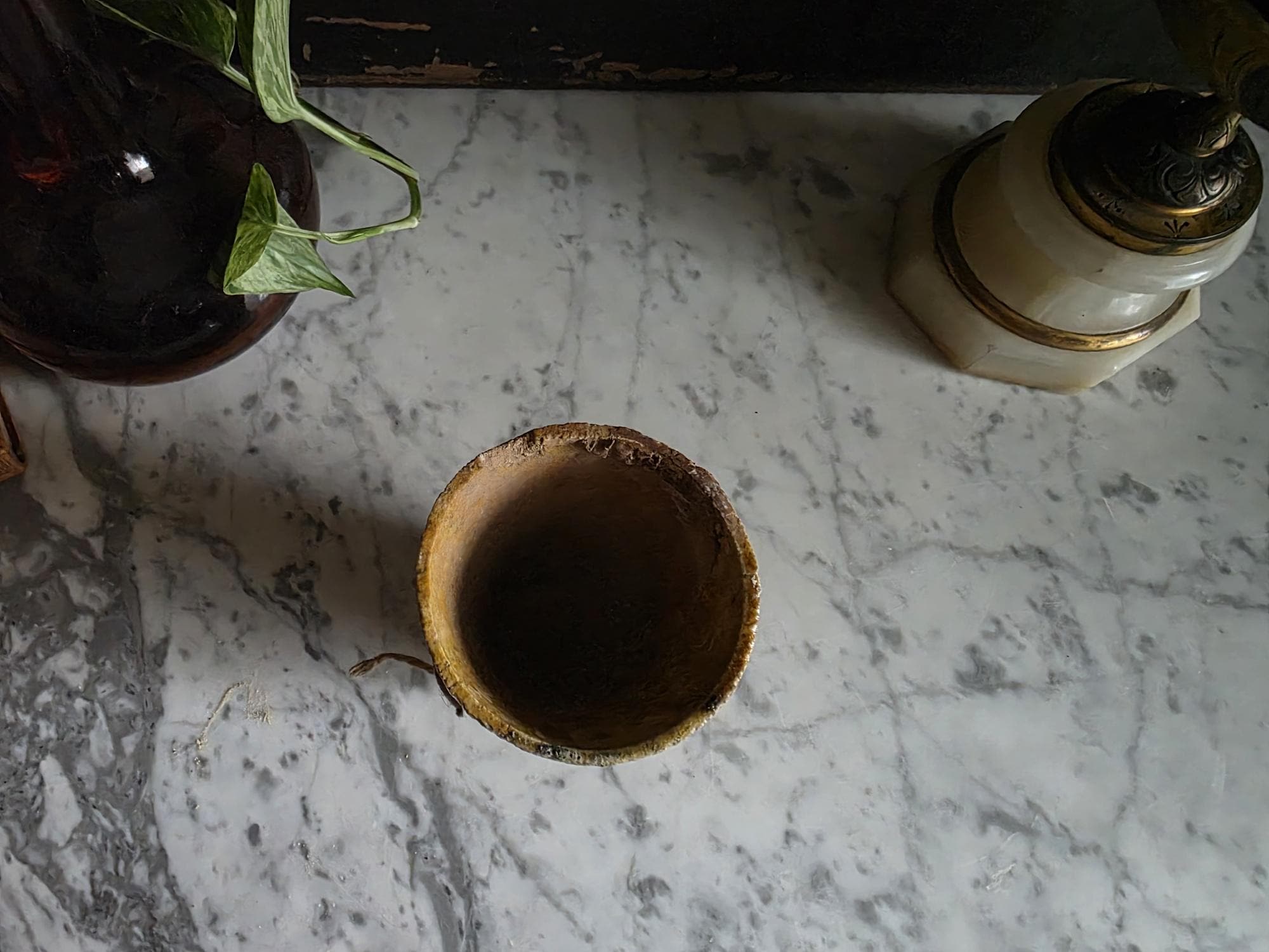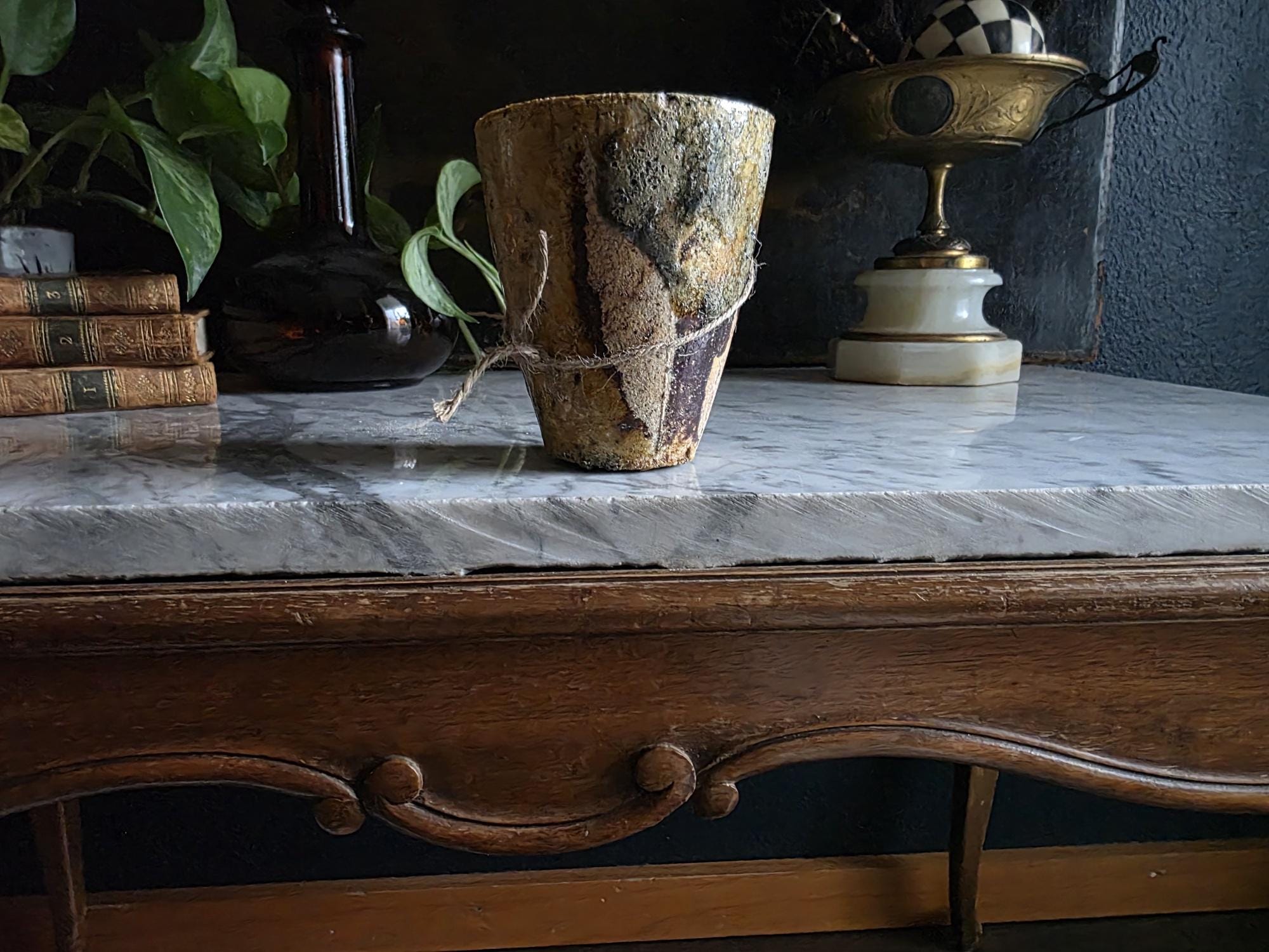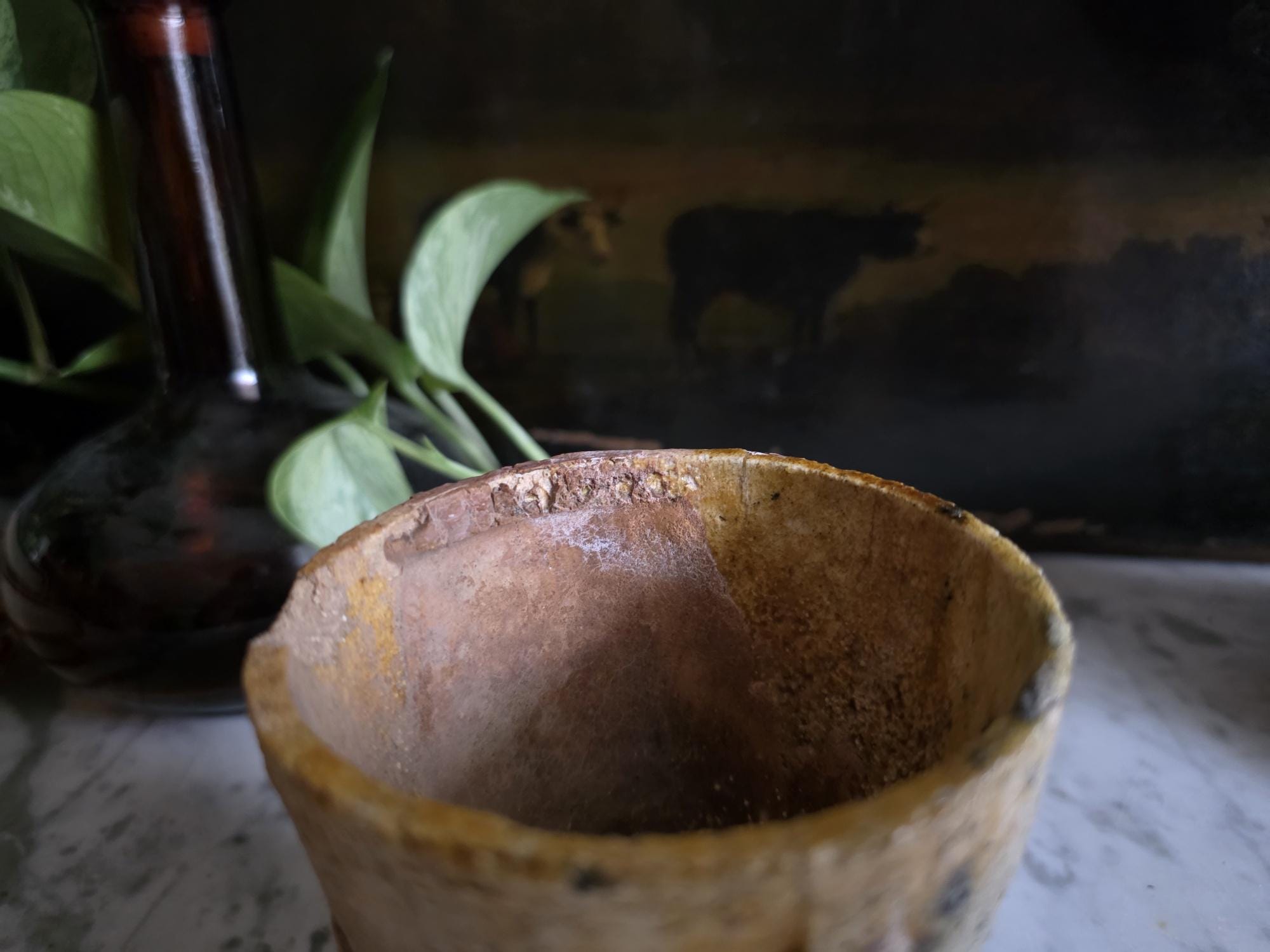 Unlike typical neutral-toned foundry relics, this crucible possesses a high-contrast aesthetic that bridges the gap between industrial artifact and fine ceramic art. The interior reveals a weathered, earthy core with visible mineral deposits and carbon staining, while the exterior's fiery patination makes it a compelling focal point for a primitive vignette or a modern minimalist space. Whether displayed as a standalone object of curiosity on a mantle or used to add a raw, organic element to a bookshelf, this sturdy relic is a testament to the unexpected beauty found in historic industrial labor.