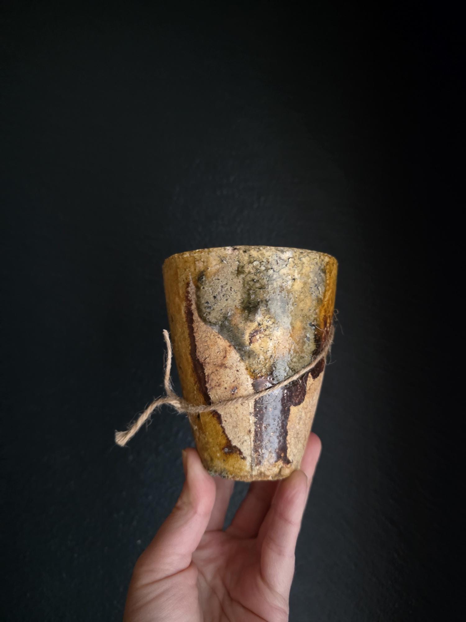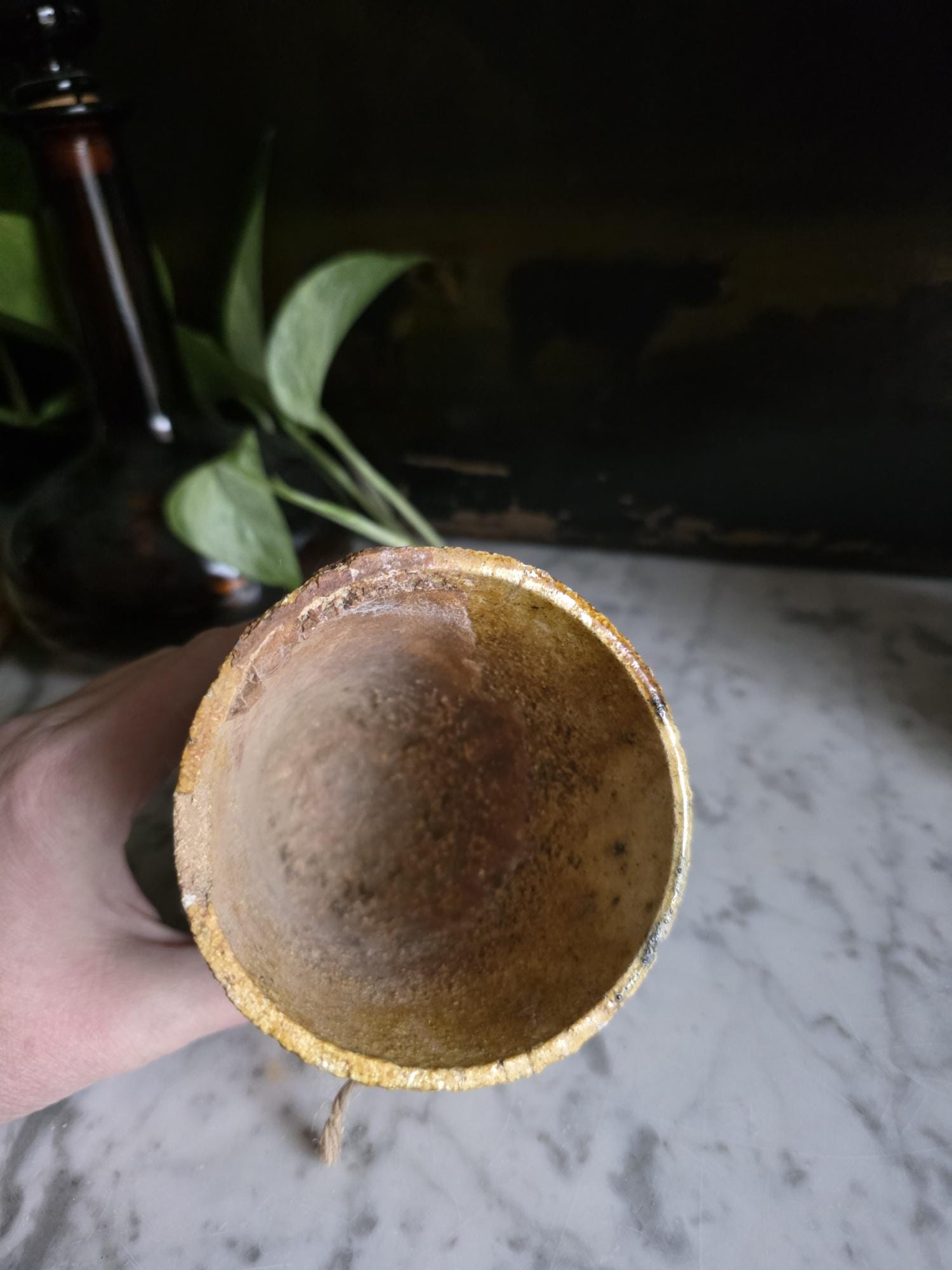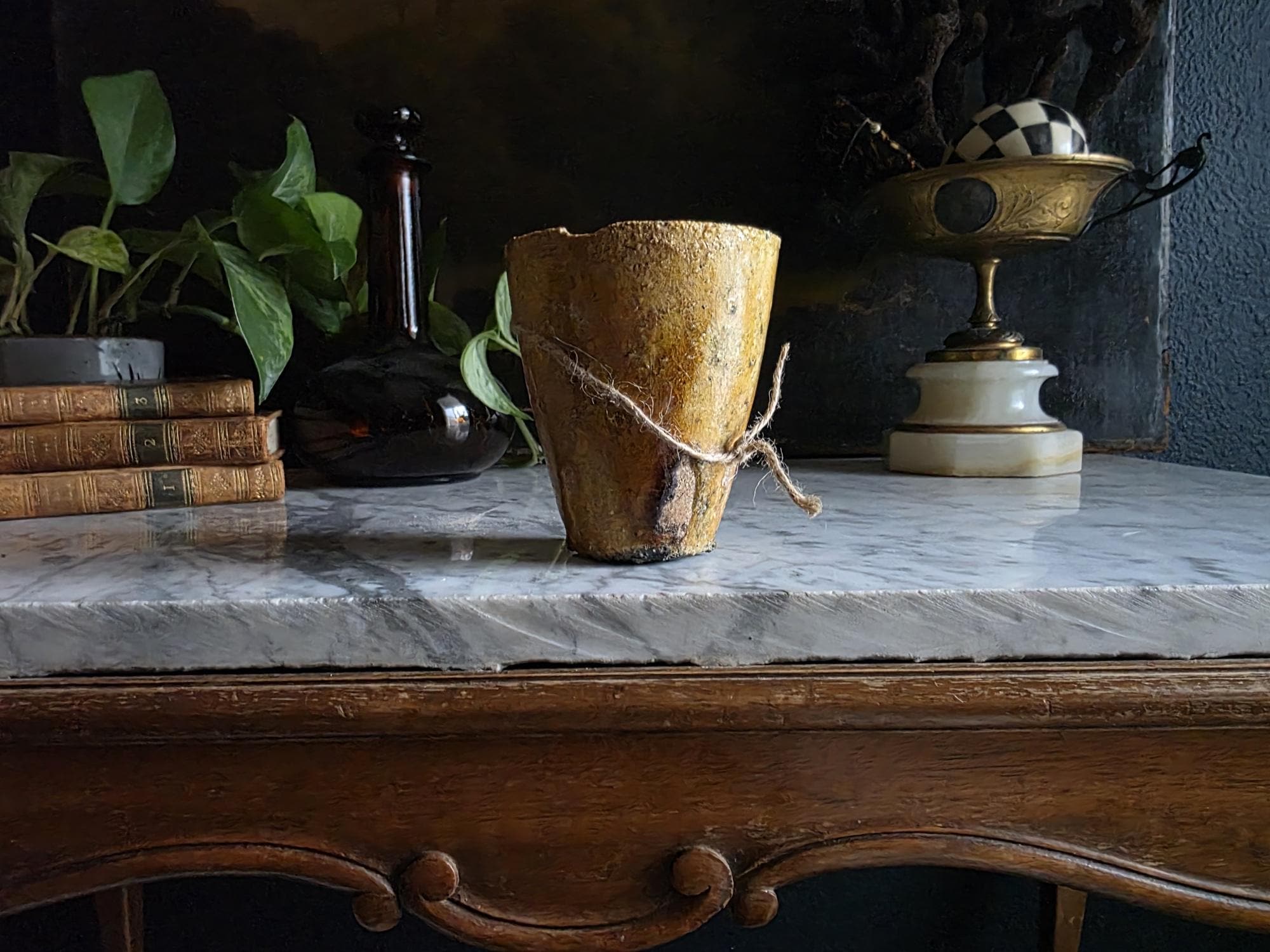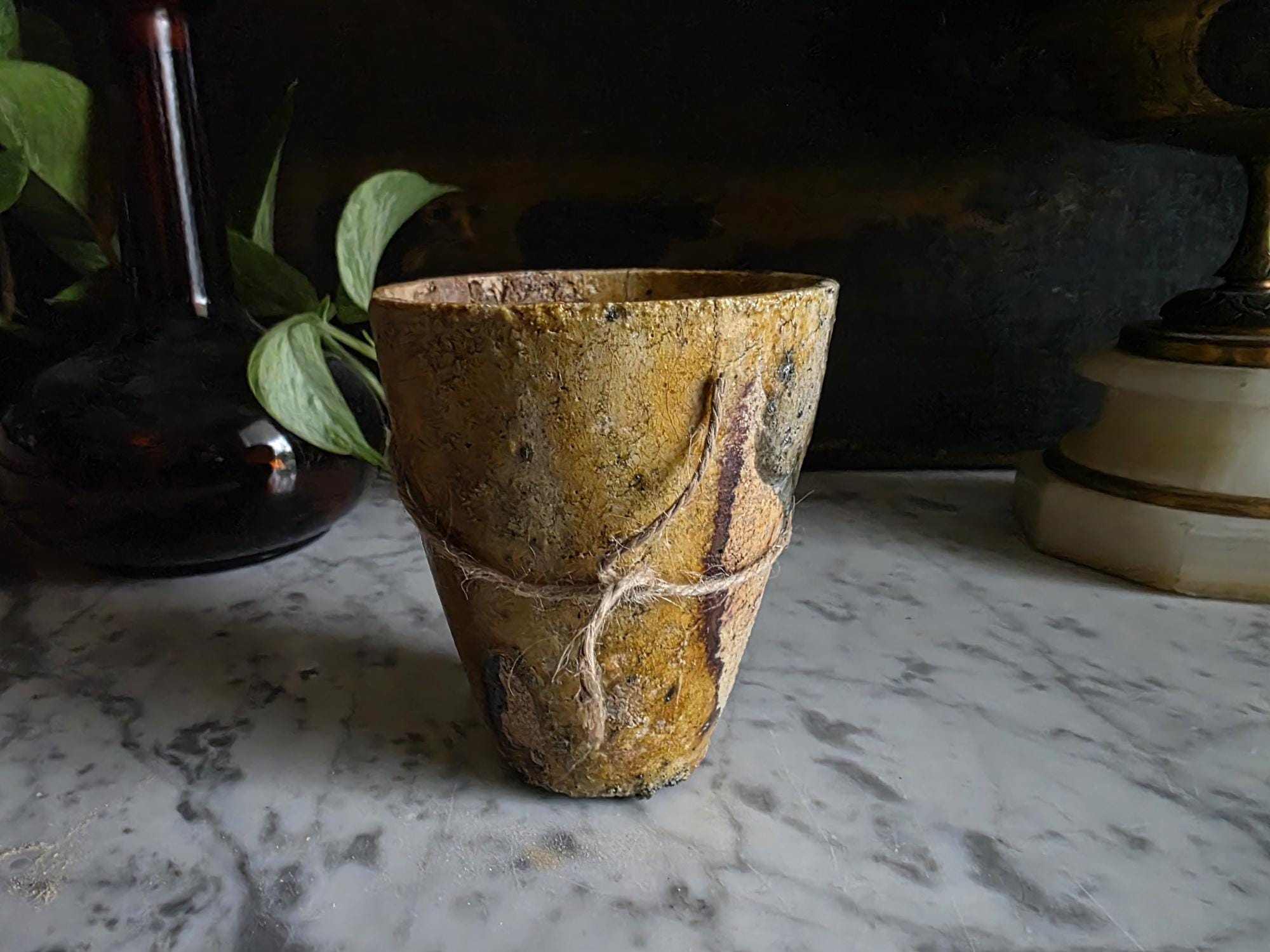 This exceptional antique industrial crucible is a true standout piece of metallurgical history, distinguished by its stunning and rare natural coloration. Over years of intense high-heat firing, the vessel has developed a vibrant palette of deep mustard yellows and rich, dark brownish-maroon mineral runs that wrap around its tapered body in a dramatic, painterly fashion. The surface is a feast of tactile complexity, featuring a thick, stony texture punctuated by authentic kiln slag, heavy vitrification, and "burst" glaze bubbles that lend it a rugged, sculptural presence.