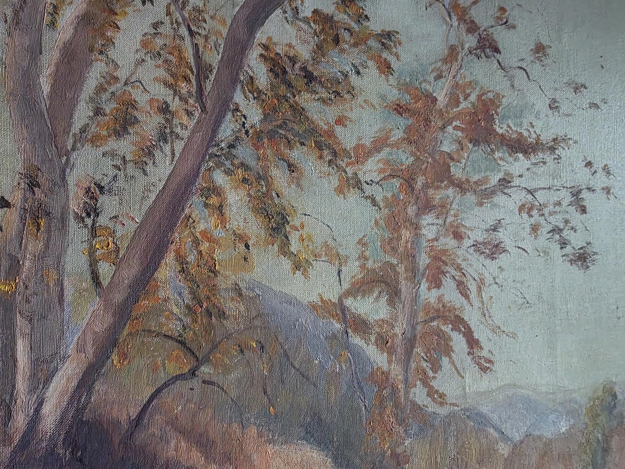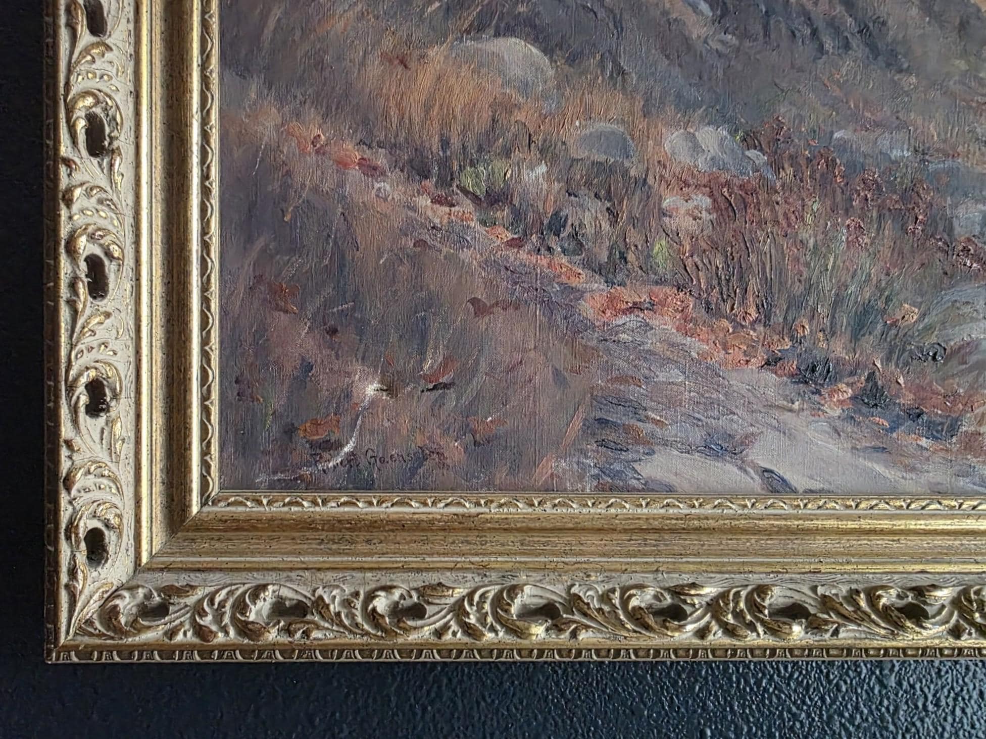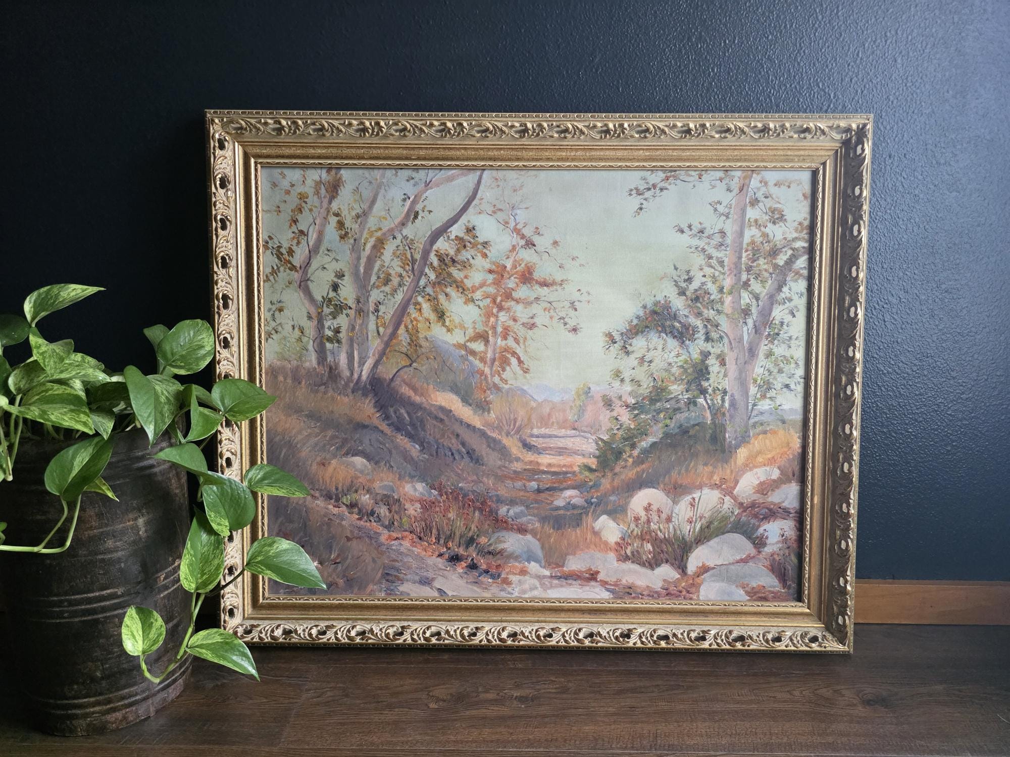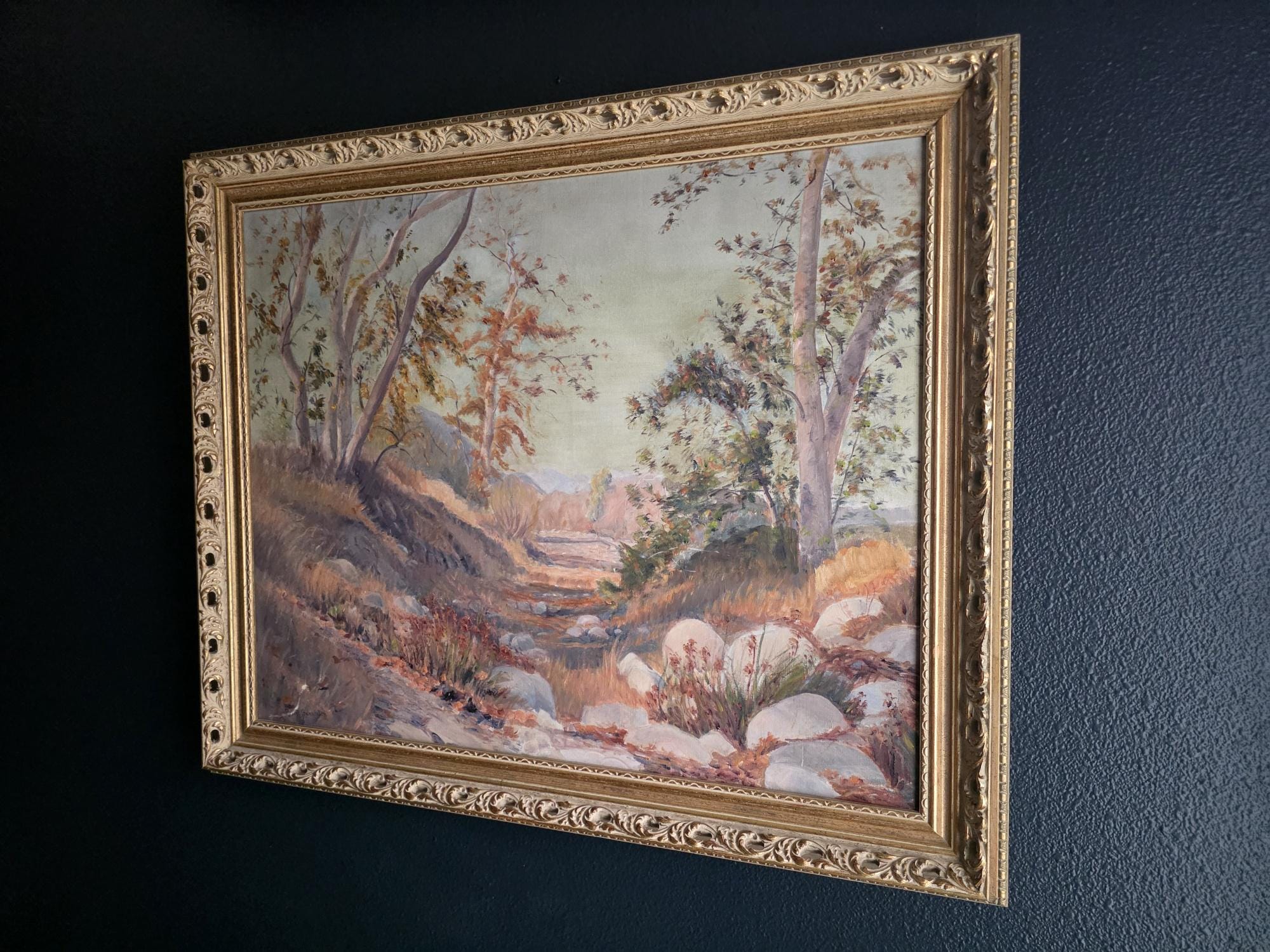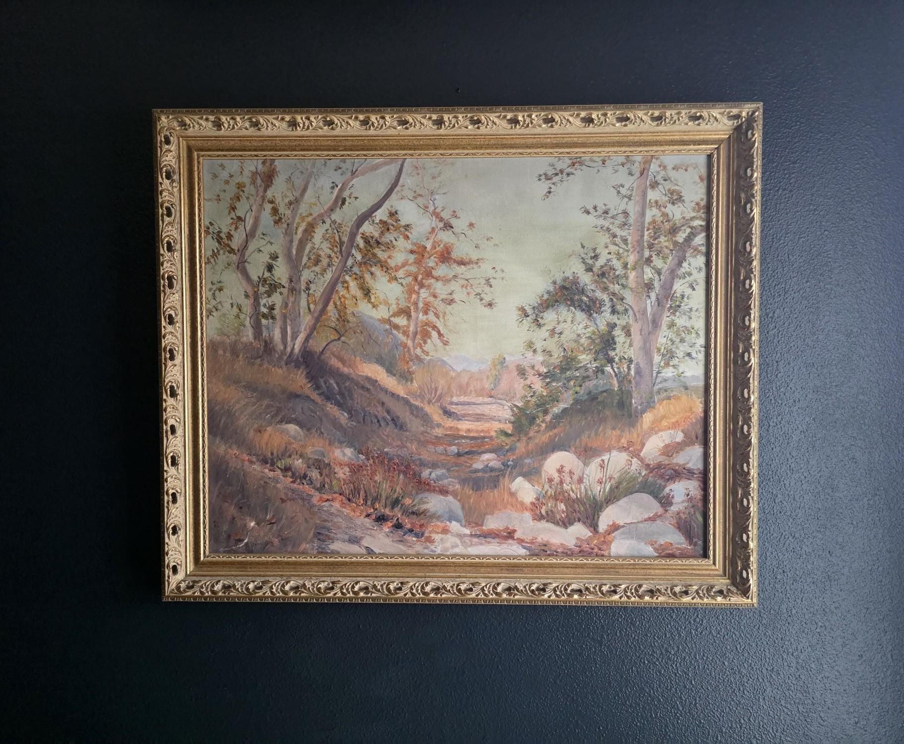 This stunning, large-scale vintage oil on canvas is a verified work by listed American artist Robert Karl Gaensslen (1867–1949). Known for his atmospheric landscapes, Gaensslen was an Ohio-born painter who settled in Los Angeles in 1910, where he became active in the local art scene, exhibiting at venues such as the Wilshire Gallery and Marzon Studio in the 1920s.