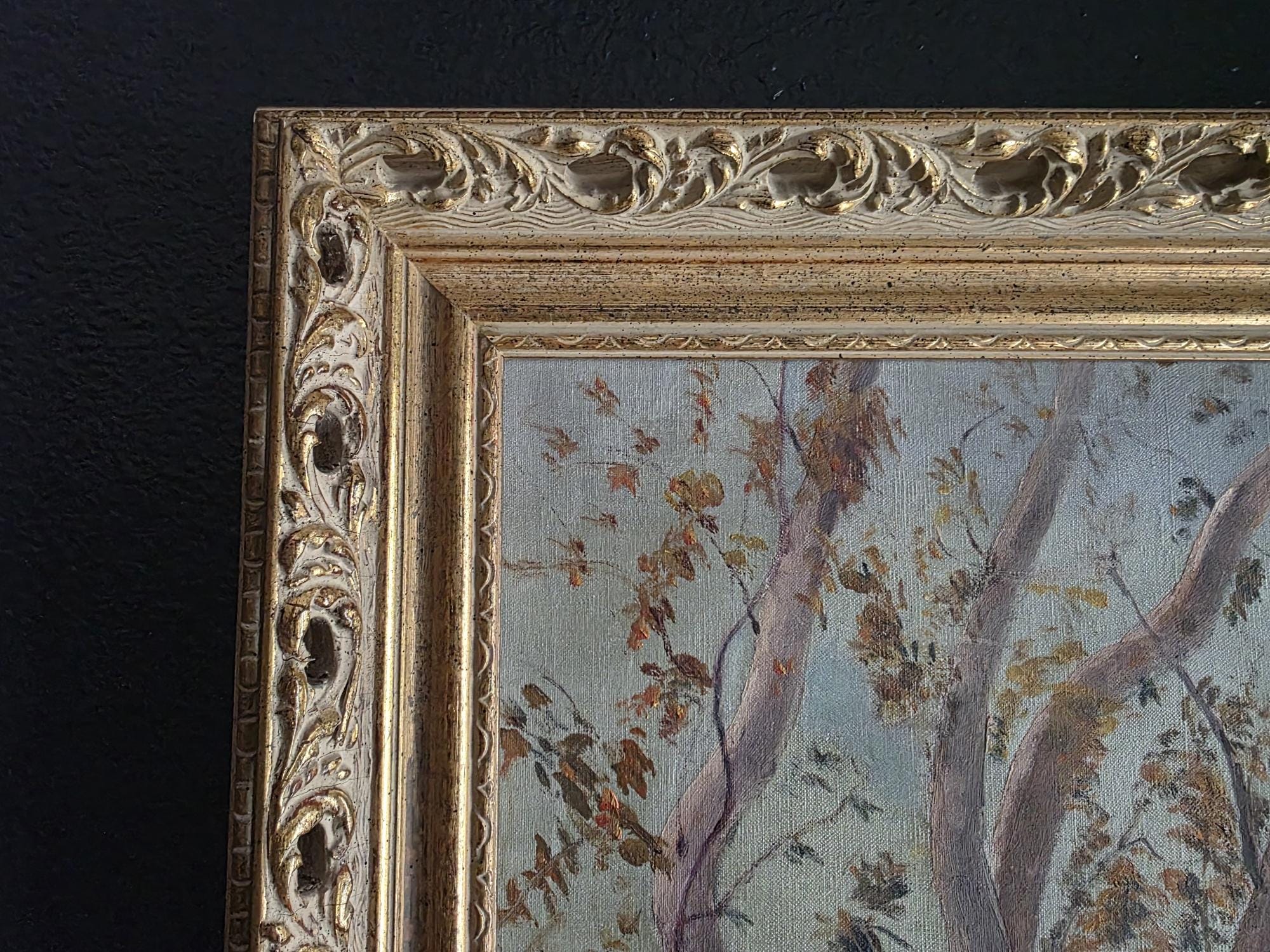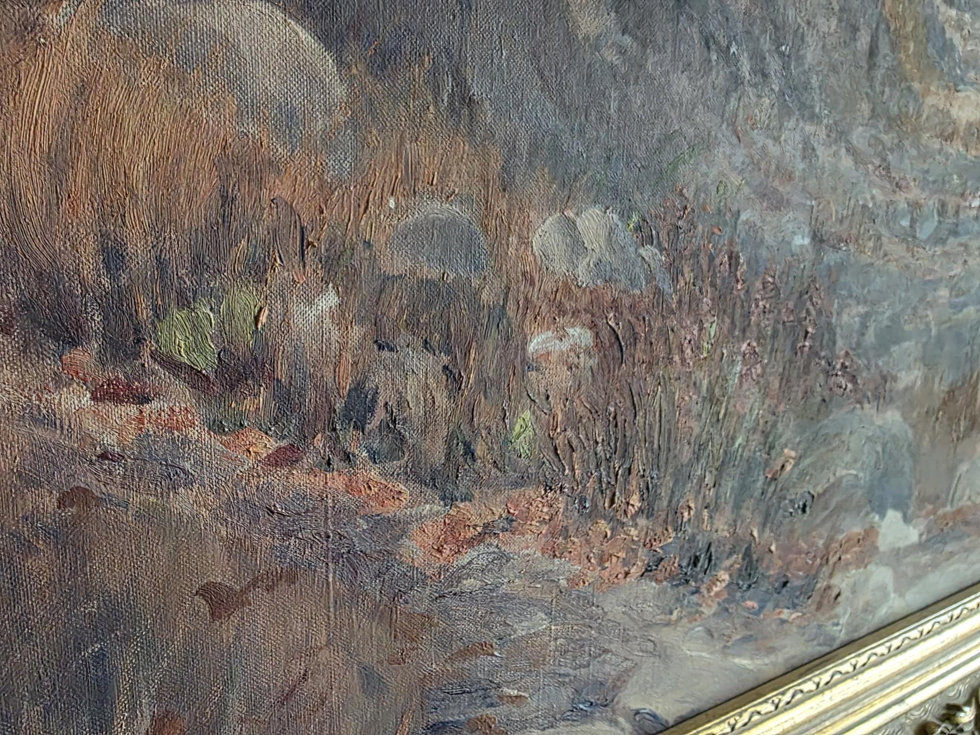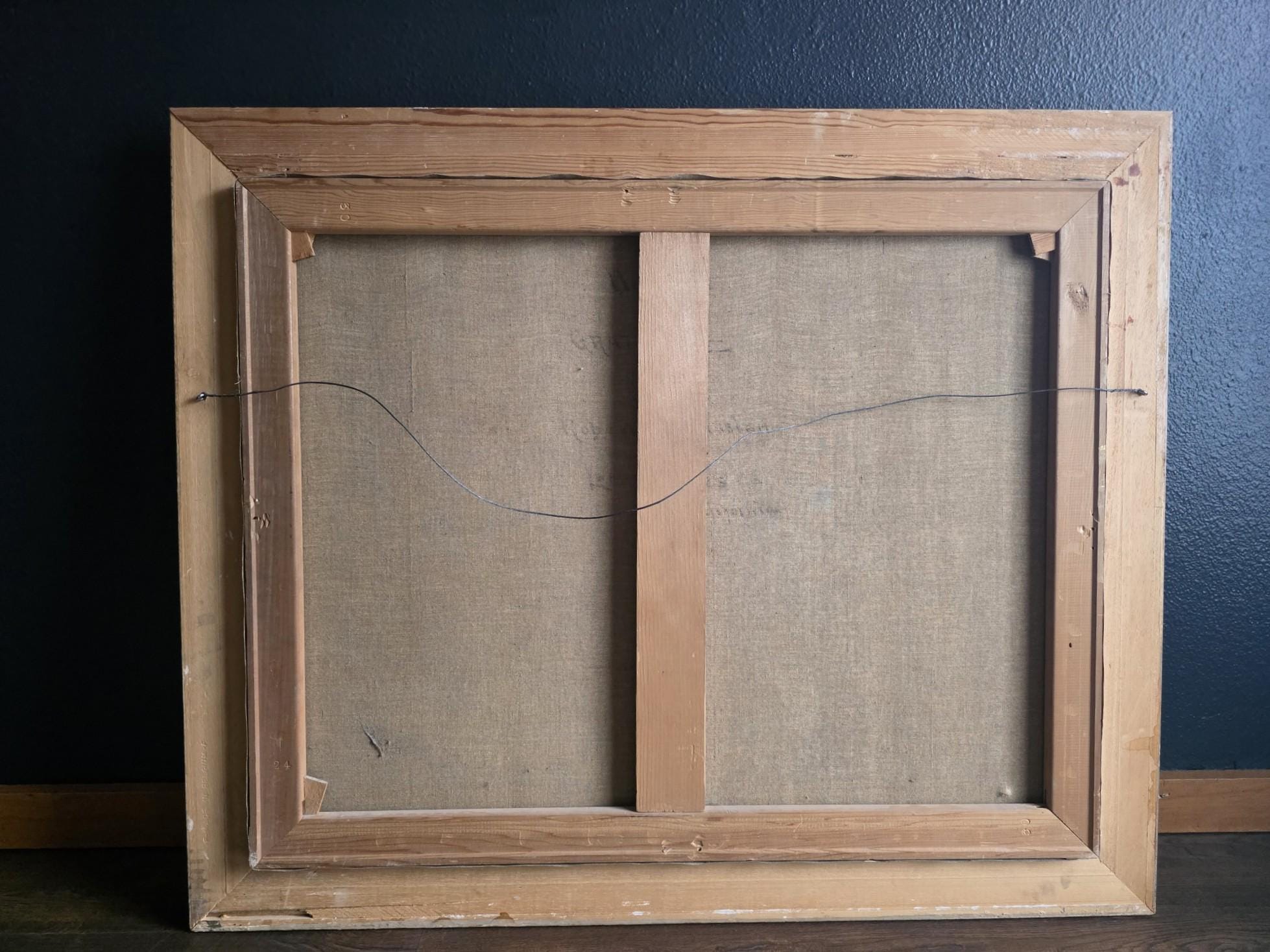 The painting is housed in its original ornate gilded frame, featuring intricate scrolling floral motifs and a deep profile that adds gallery-level presence. On the reverse, the canvas is secured to its wooden stretcher with period-correct oxidized tacks. Please note that there is a small, singular puncture/indentation in the canvas (visible upon close inspection in the lower-left quadrant), which is consistent with a piece of this age and does not detract from the overall visual impact.