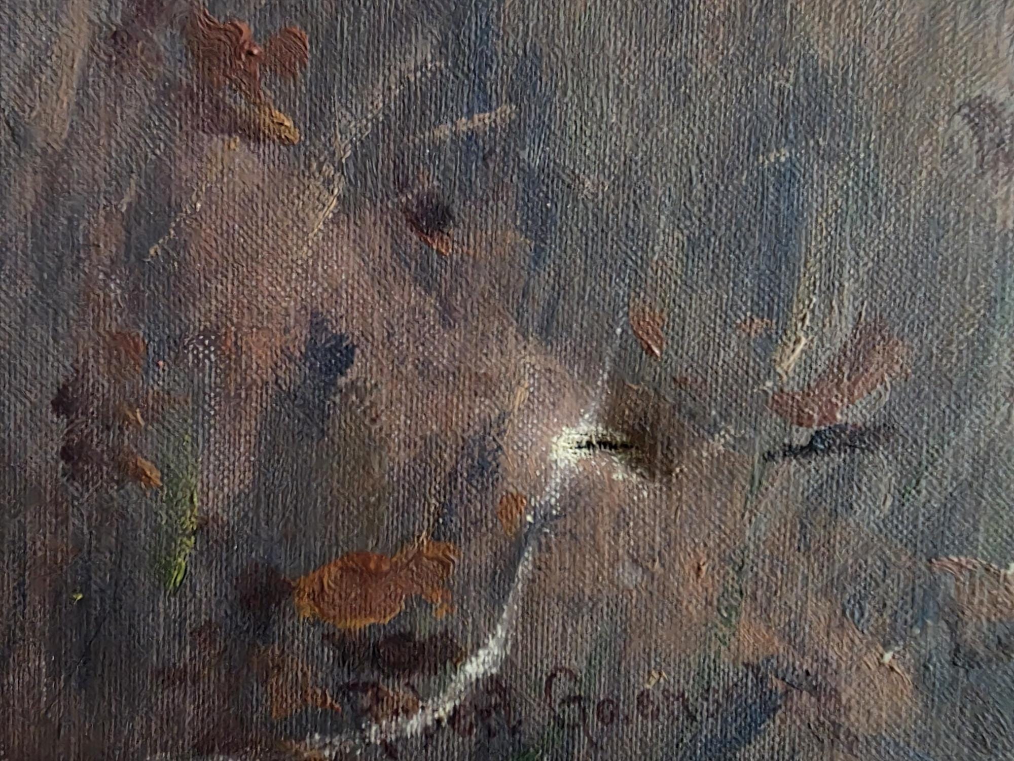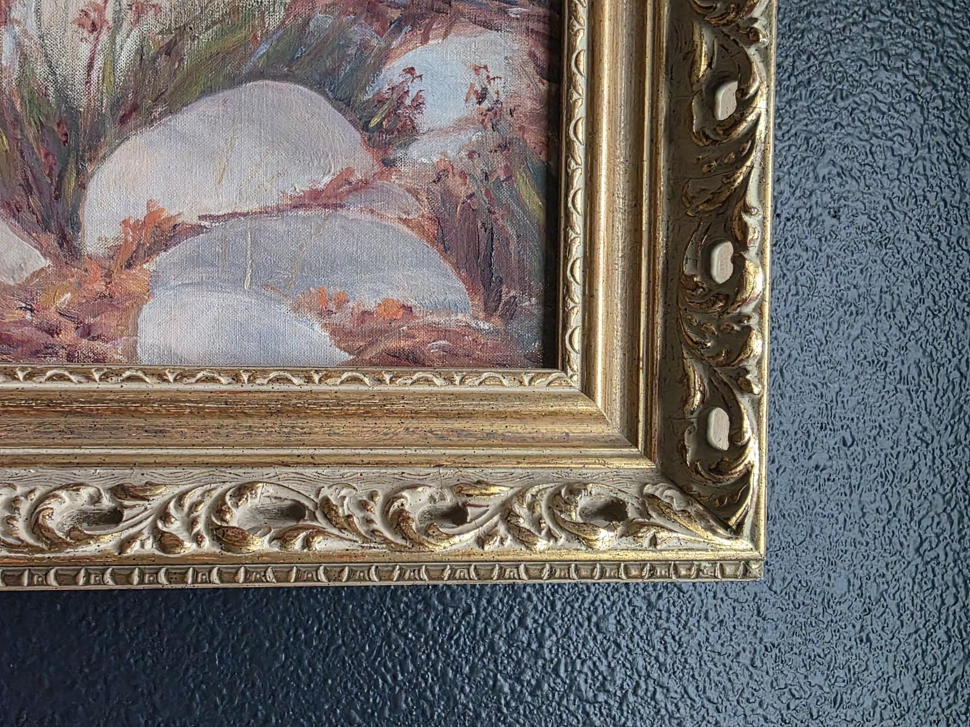 Condition: One small puncture above the artists signature in the lower left corner (see listing photos). Priced accordingly to account for flaws. Minor surface scratching to painting. Overall excellent condition.