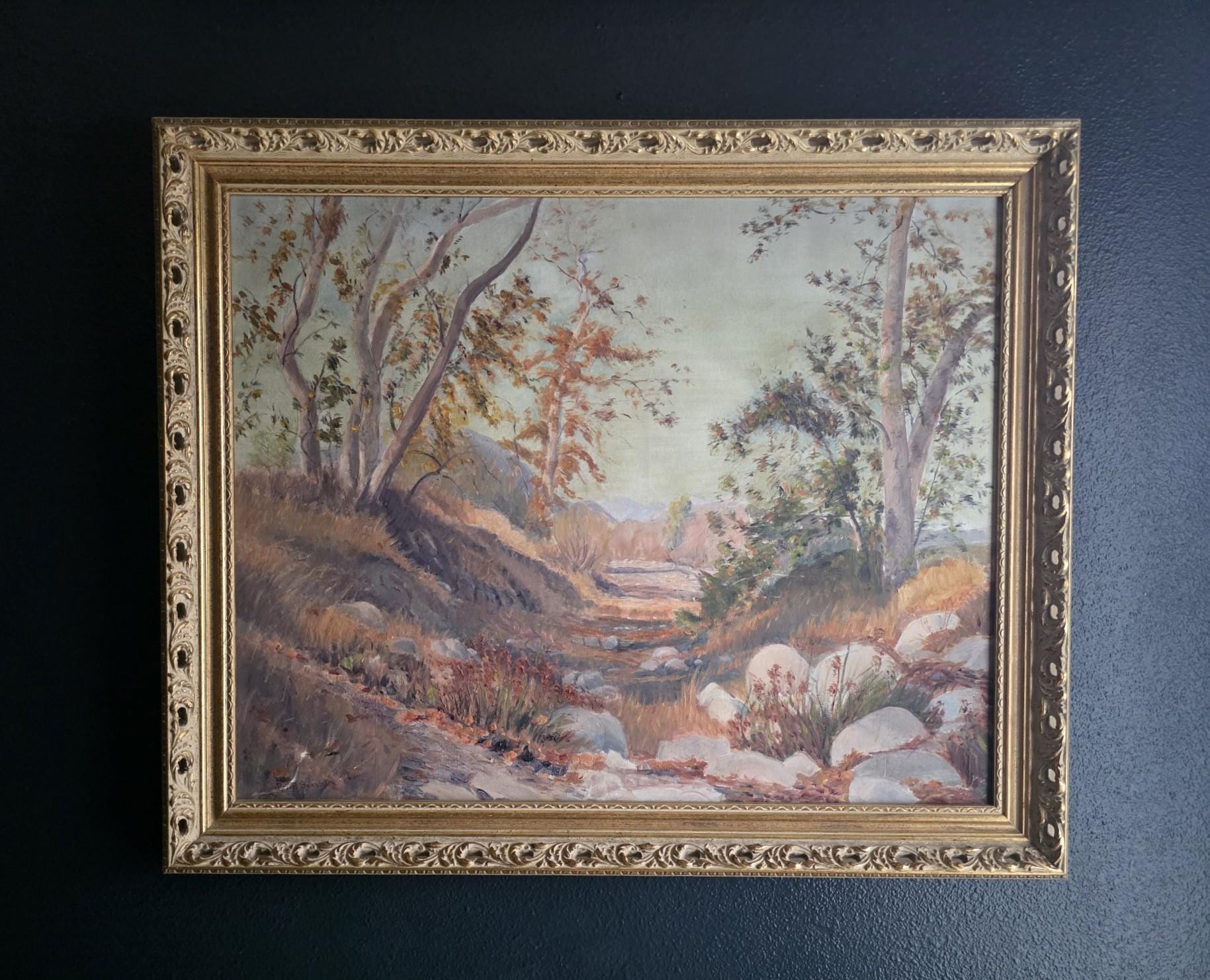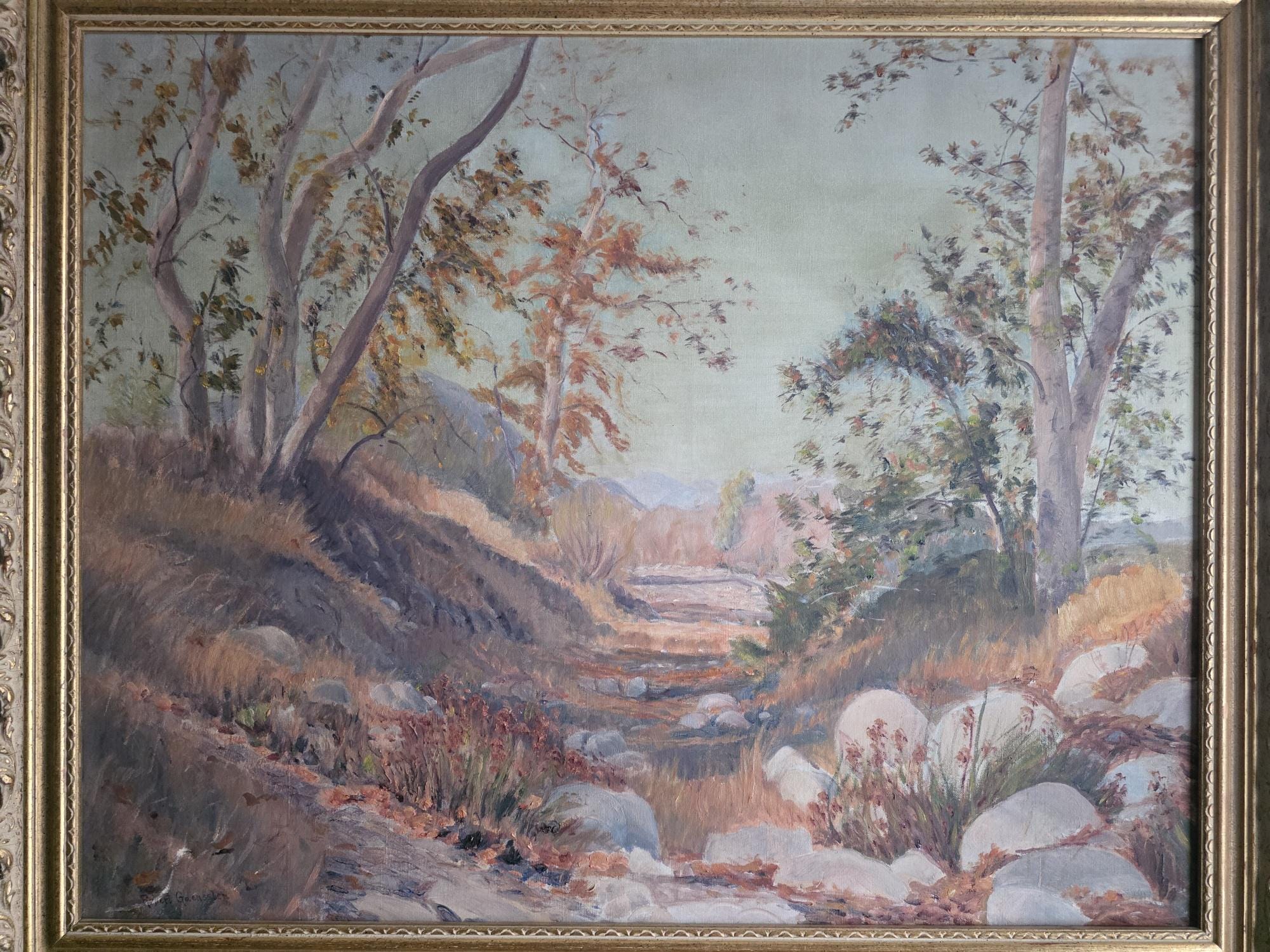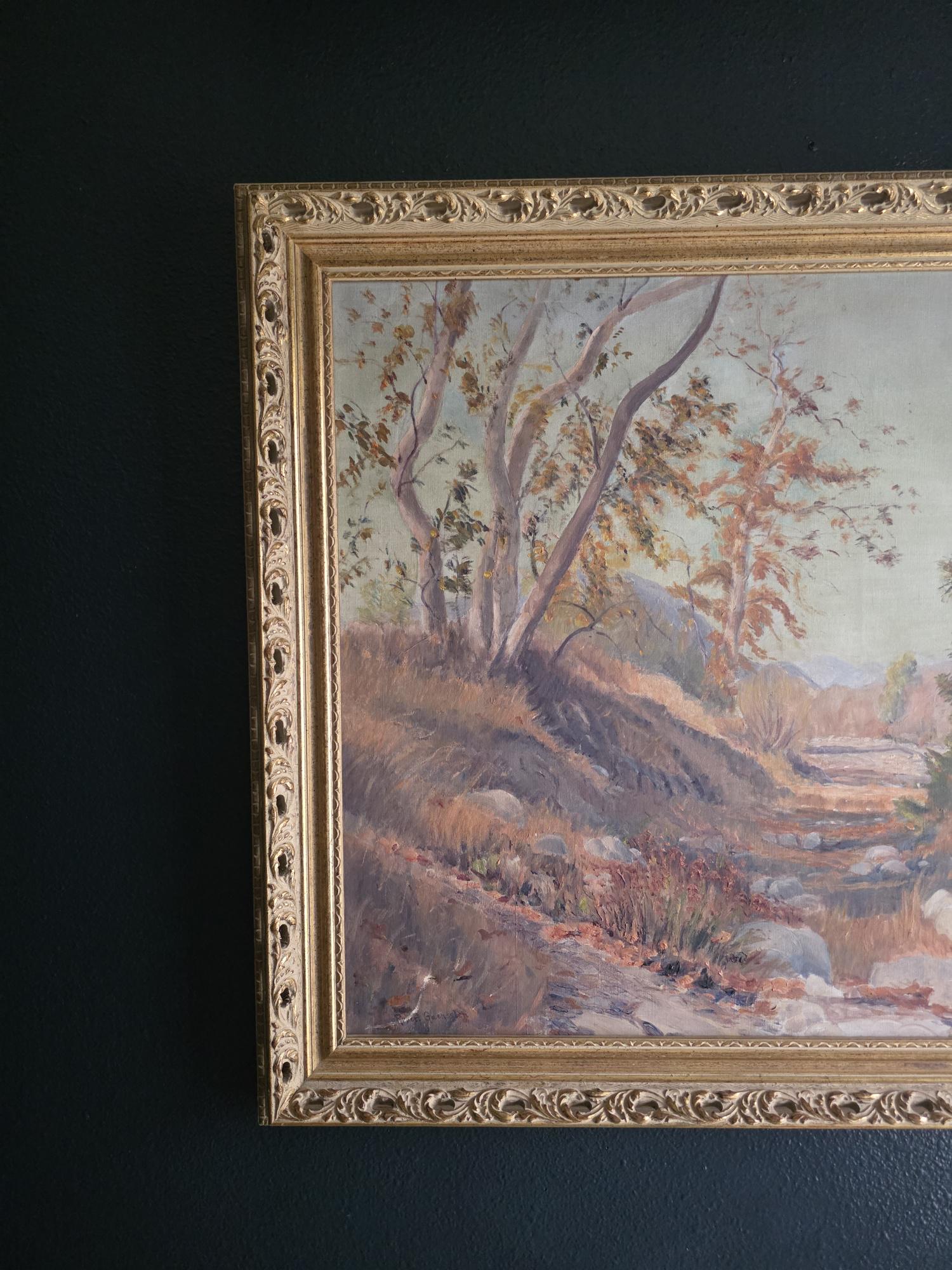 The painting captures a serene, sun-drenched landscape—likely a Southern California scene characteristic of his output between 1920 and 1949. The composition draws the eye along a dry, rocky creek bed winding through a grove of slender trees, all rendered in a soft, impressionistic style. The color palette is wonderfully grounded in earthy autumnal tones—muted ochres, warm siennas, and hazy greens—contrasted against a pale, ethereal sky. Gaensslen’s brushwork is particularly expressive in the foreground, where thick, textured applications of paint give life to the scattered river rocks and low-lying brush.