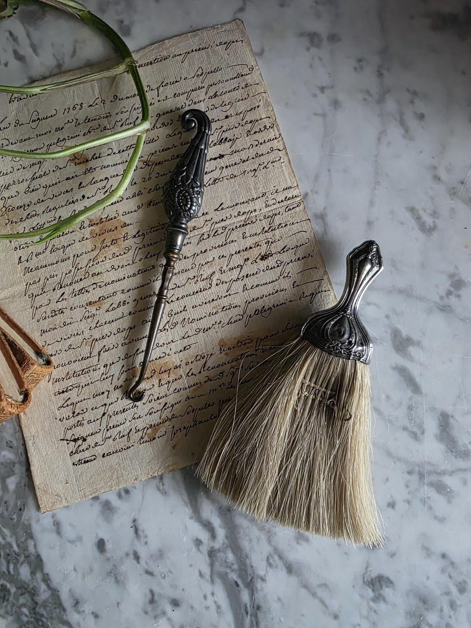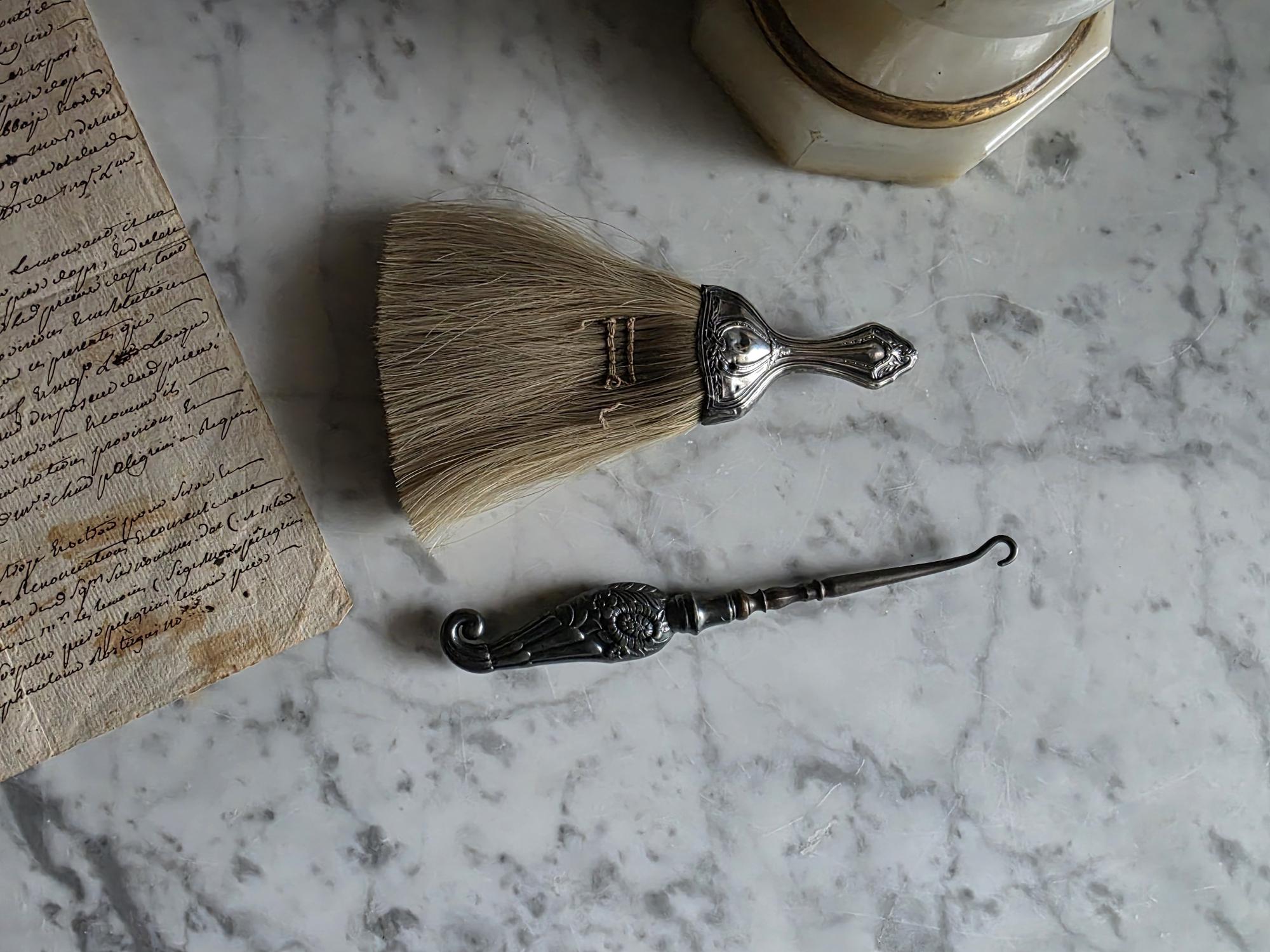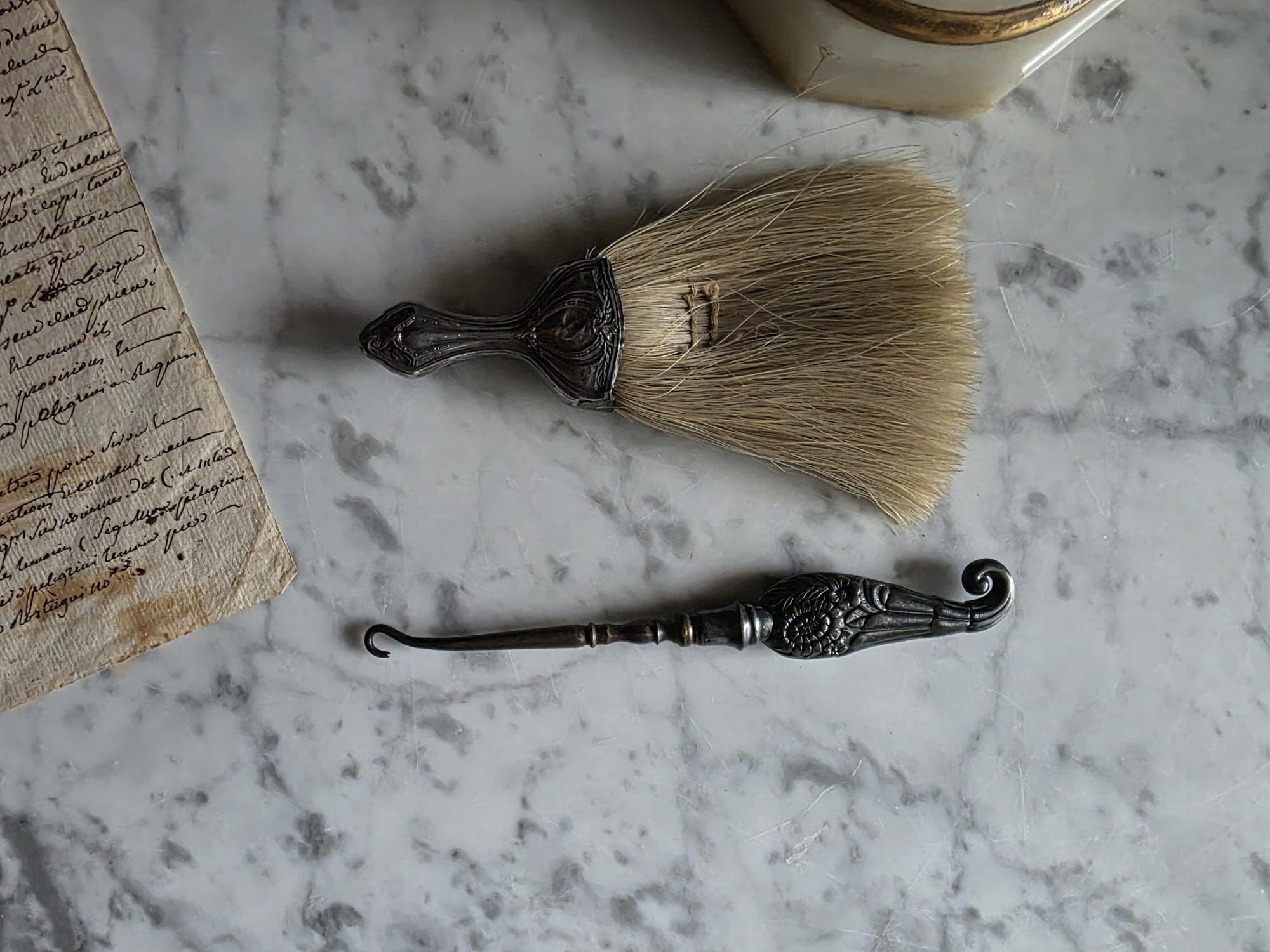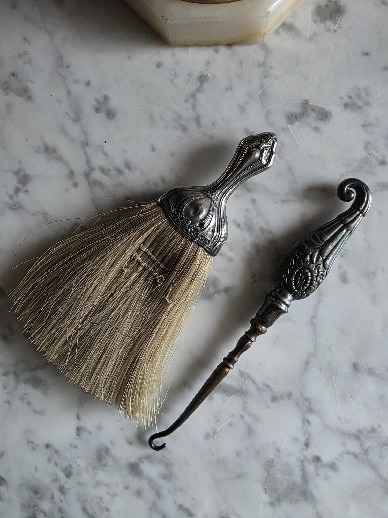Condition: Antique condition with wear consistent with age. The clothing brush is made of thin unmarked sterling silver that is worn and with minor separation on the side. The button book is of solid construction with considerable patina and no major flaws to note.