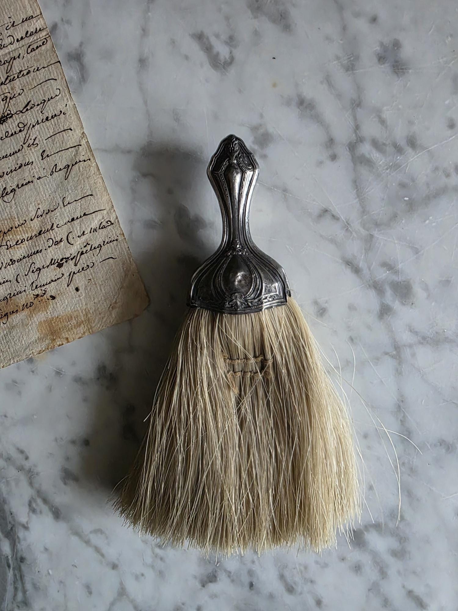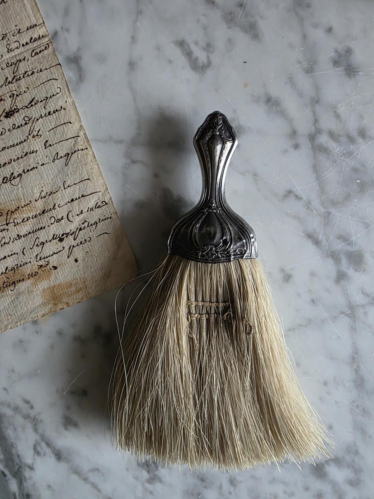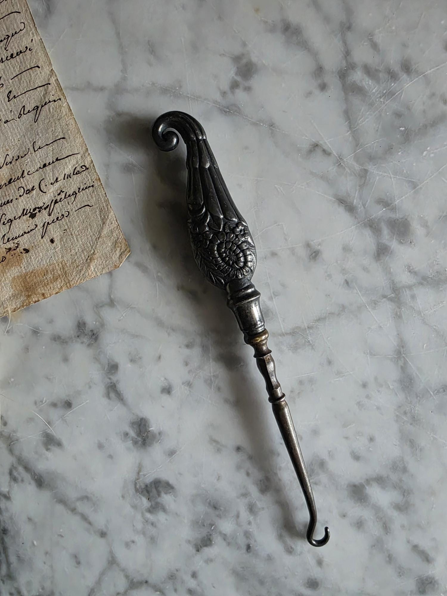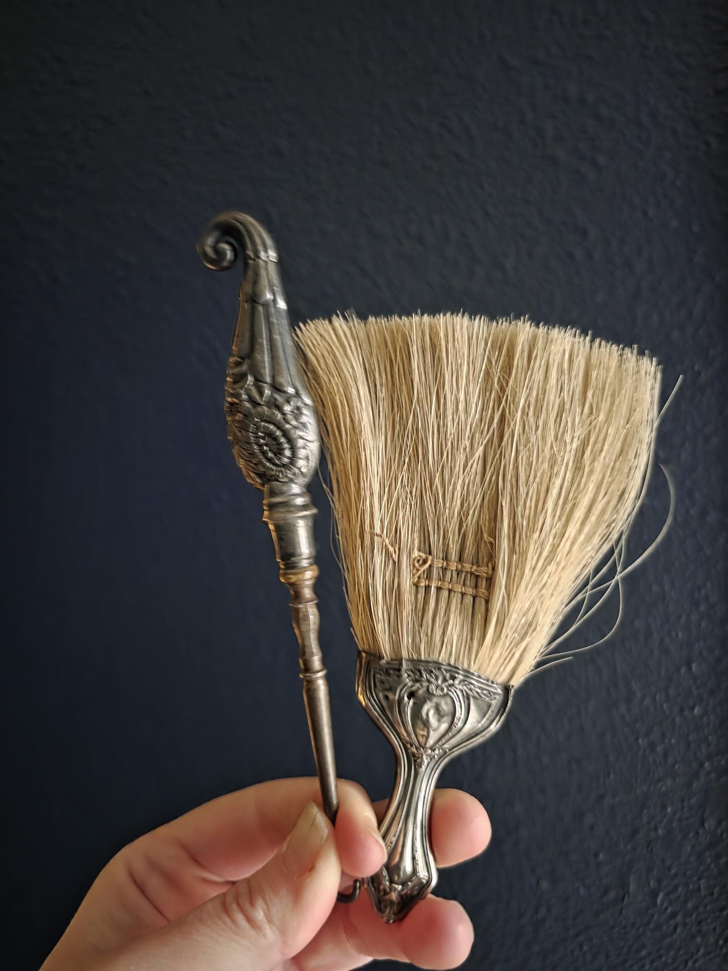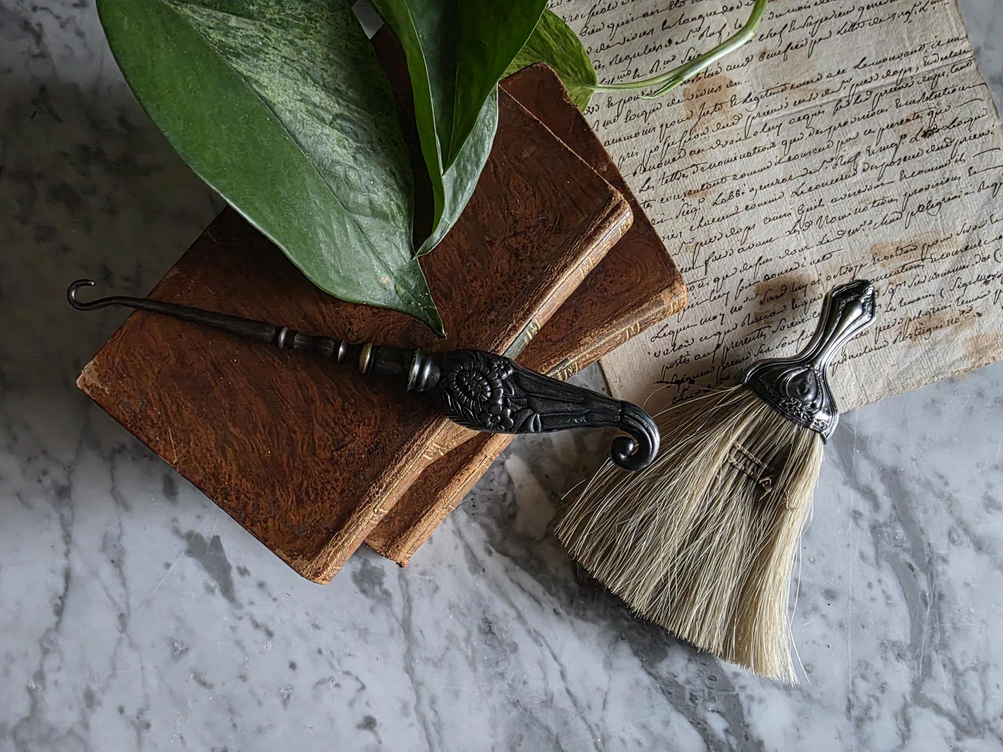 Condition: Antique condition with wear consistent with age. The clothing brush is made of thin unmarked sterling silver that is worn and with minor separation on the side. The button book is of solid construction with considerable patina and no major flaws to note.