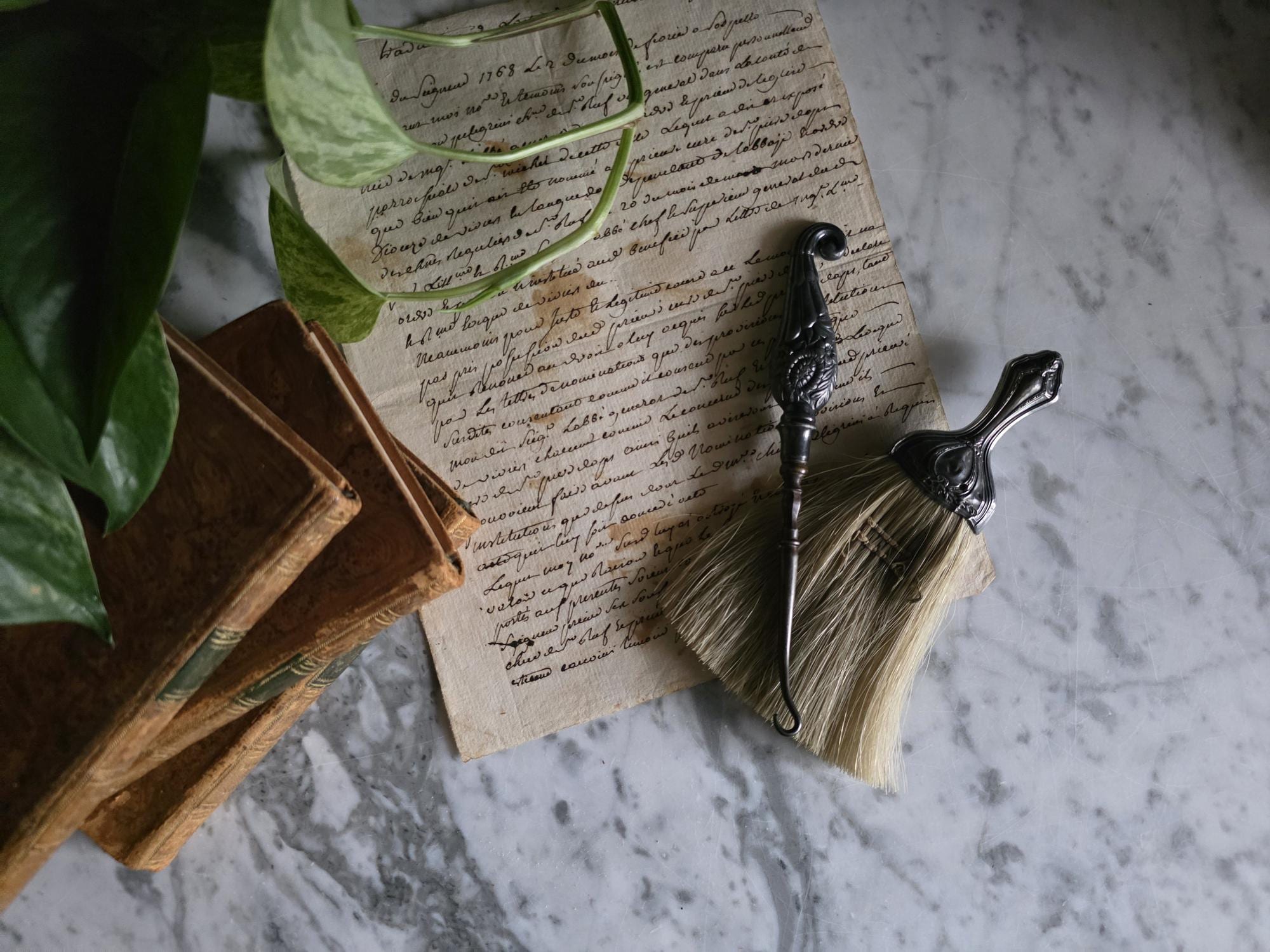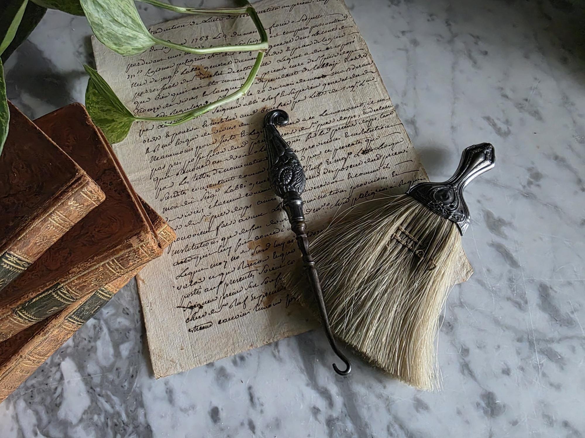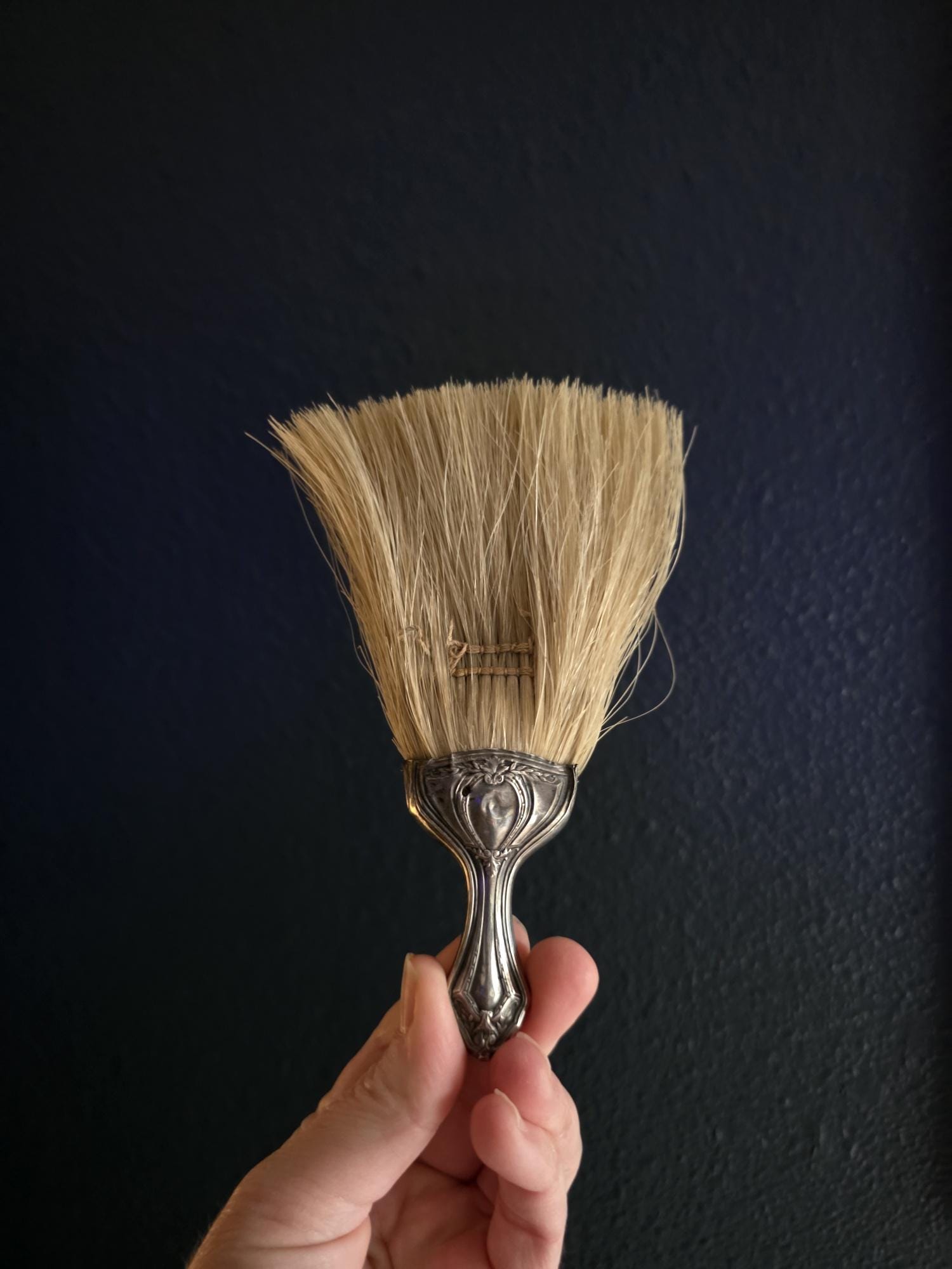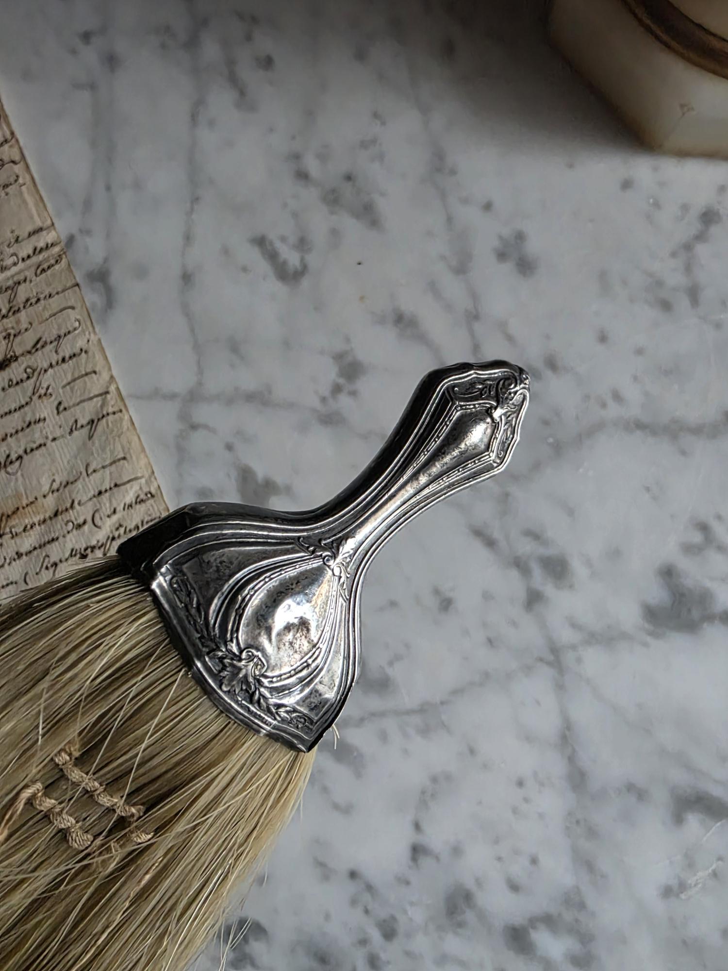 Condition: Antique condition with wear consistent with age. The clothing brush is made of thin unmarked sterling silver that is worn and with minor separation on the side. The button book is of solid construction with considerable patina and no major flaws to note.