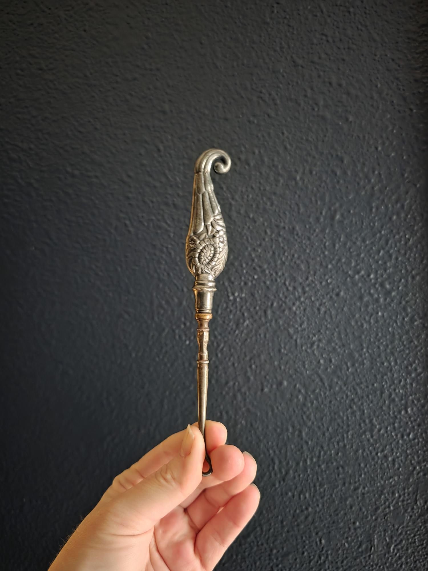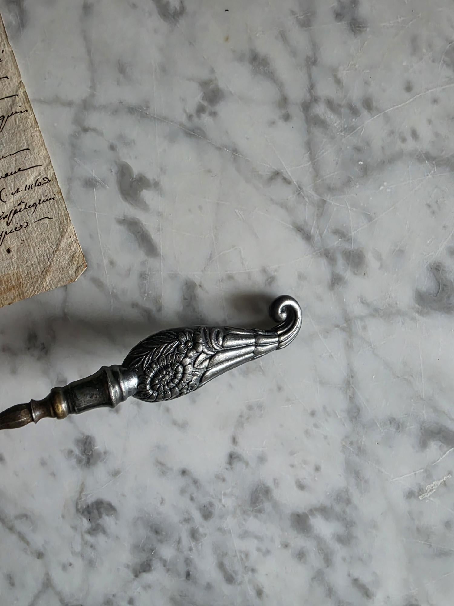 This curated vintage vanity set combines functional history with ornate design, featuring a clothes brush and a button hook. The clothes brush is crafted with an unmarked sterling silver handle, designed with a graceful, fluid silhouette and raised scrollwork that caps a dense cluster of soft, natural blonde bristles. Paired with it is a silver-plated button hook characterized by its dramatic scroll-end handle and a prominent floral motif—appearing to be a sunflower or daisy—embossed in the center. Together, these pieces exhibit the warm patina and character of well-loved antiques, making them a sophisticated addition to any dresser or collection of grooming heirlooms.