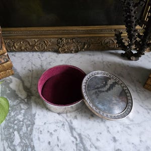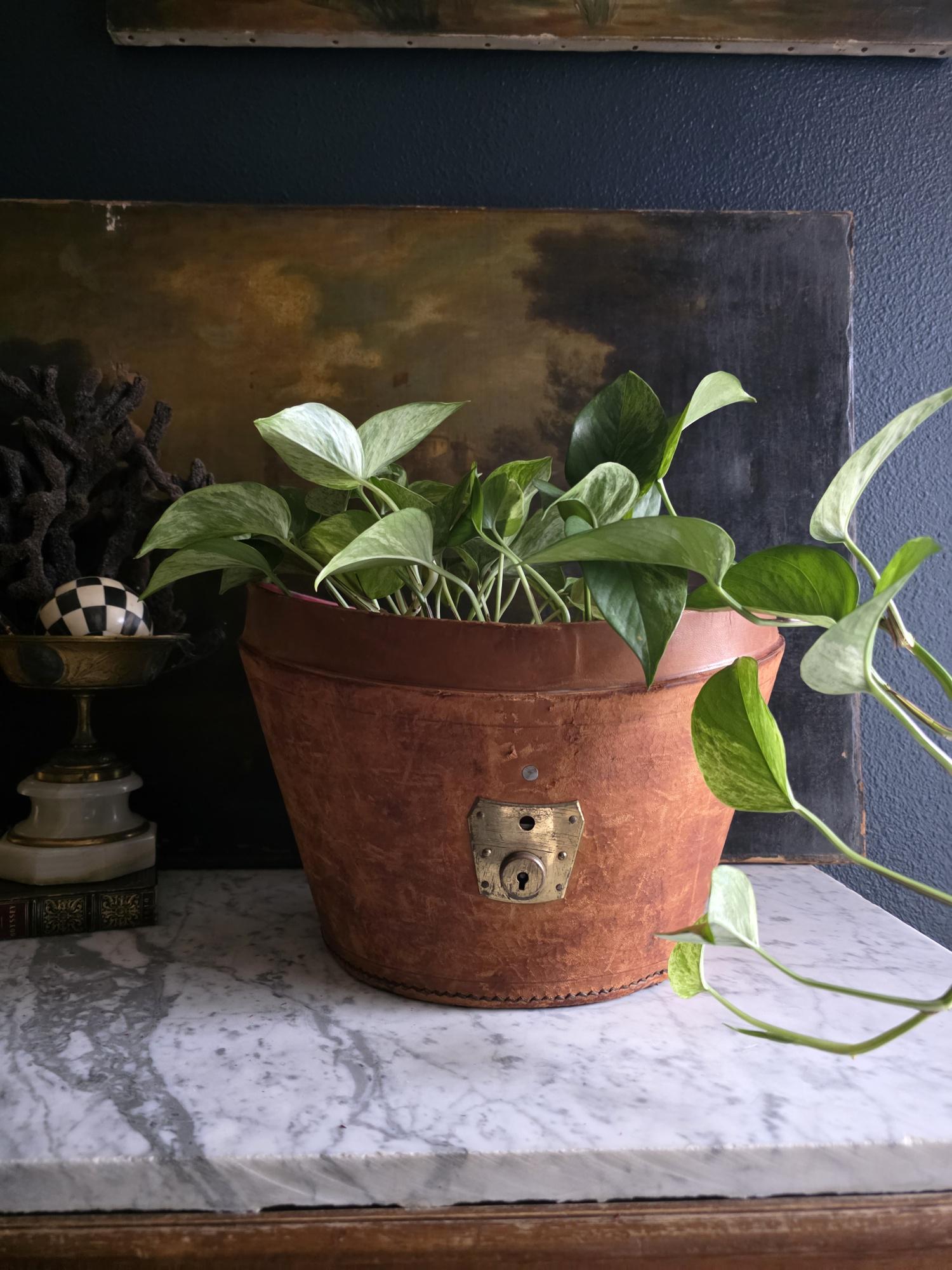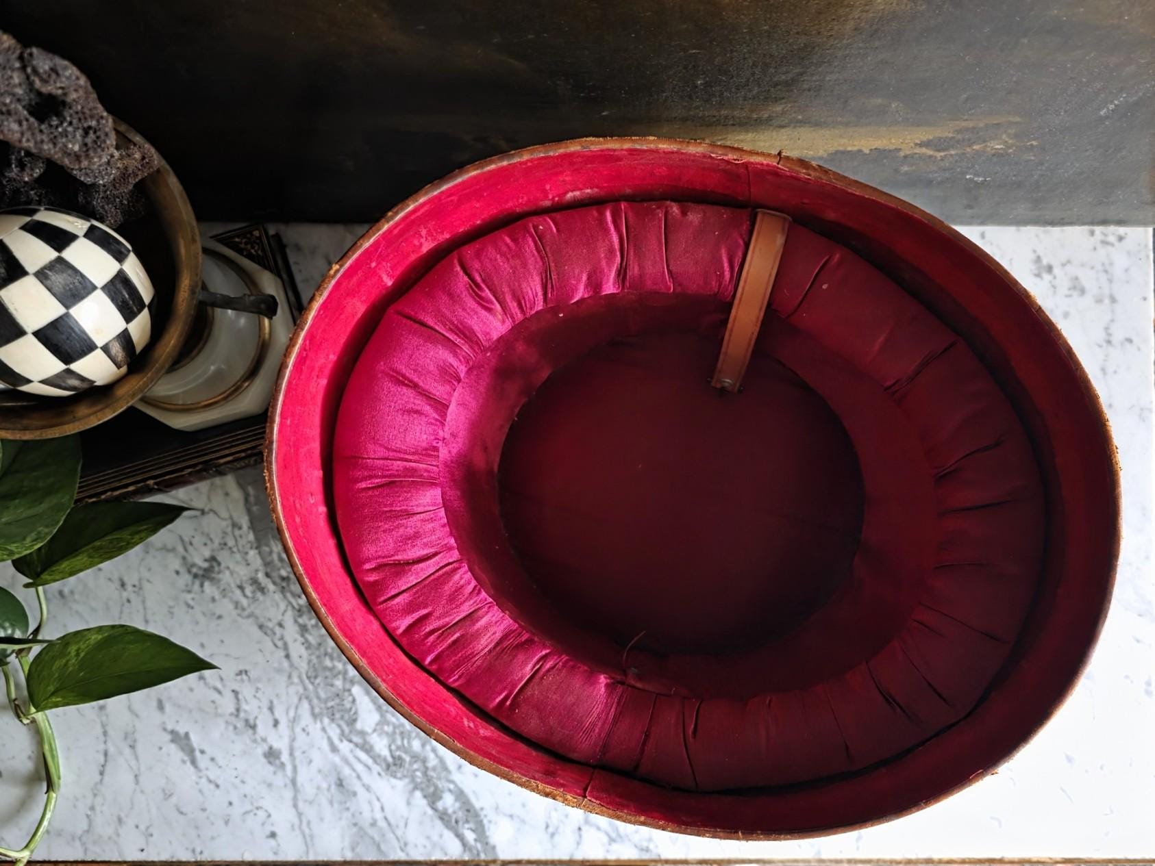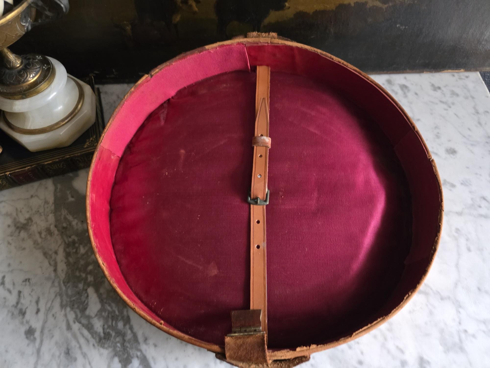Steeped in history and undeniable character, this antique leather top hat box is a striking example of gentlemen’s travel accessories from a bygone era. The exterior features a rich, warm cognac patina and a substantial brass locking mechanism that adds to its old-world charm, while the interior reveals a stunning contrast of vibrant, deep magenta silk lining with original securing strap (a secondary strap appears to be missing).