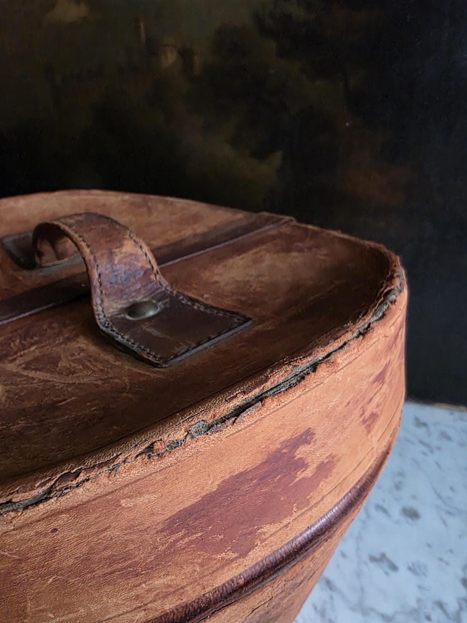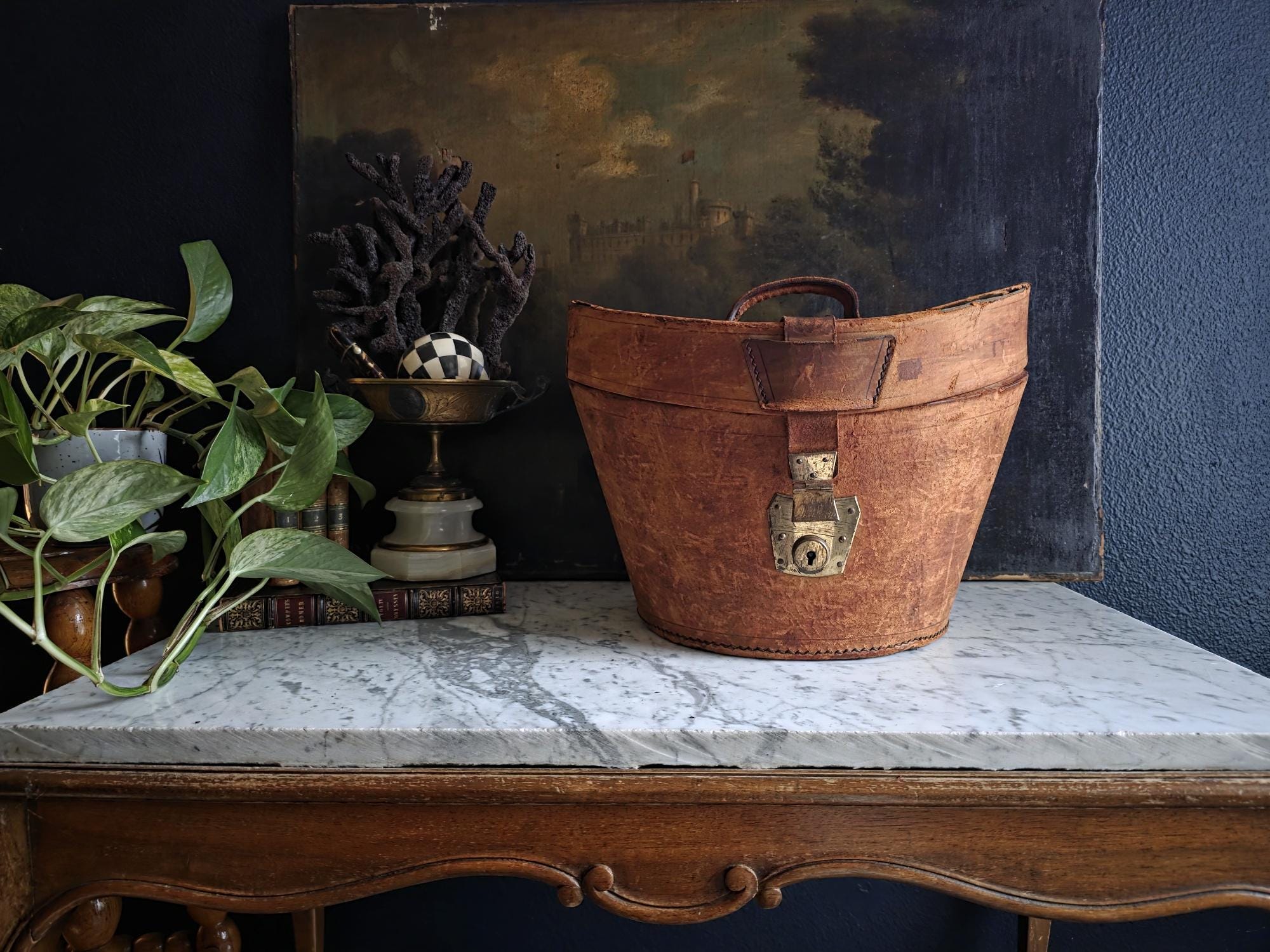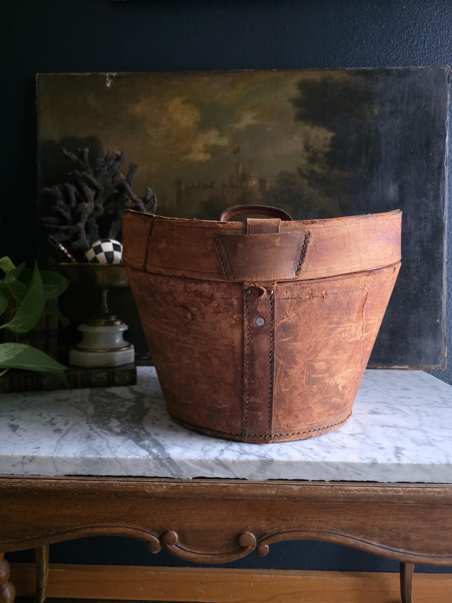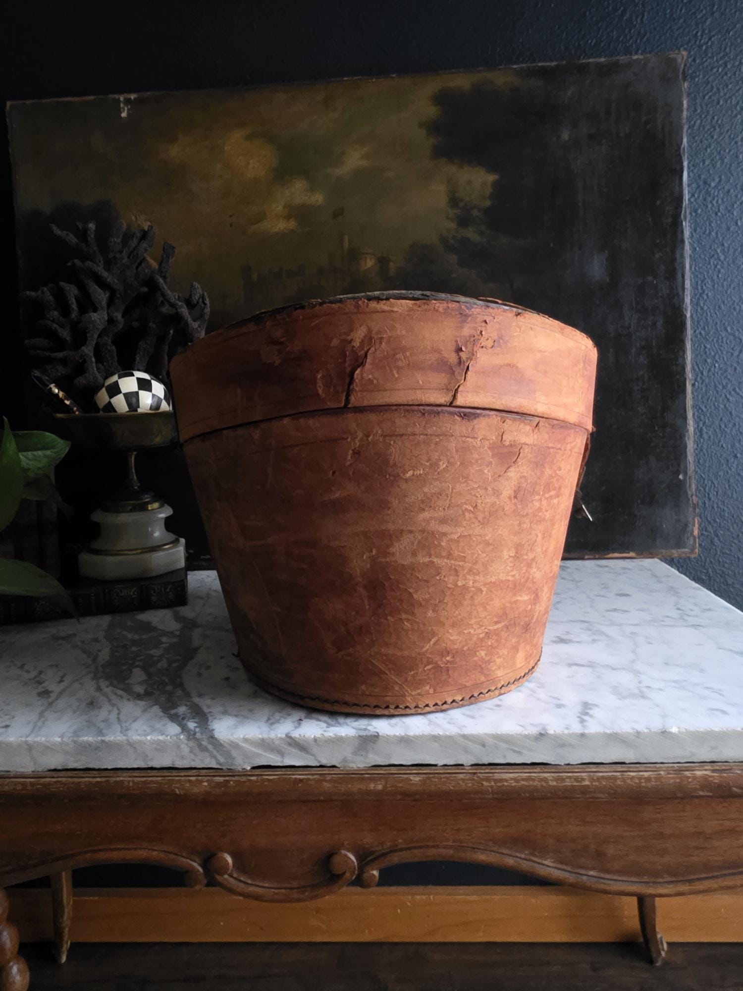 Condition: Please note that this piece is being sold as a fragile decorative object due to significant condition issues. The leather is heavily worn and suffering from age-related stress; it is splitting along the edges, and the rear strap that once functioned as a hinge has severed, meaning the lid detaches completely. Additionally, the leather surface has a history of shedding and flaking characteristic of Red Rot. This is chemical deterioration found almost exclusively in leather tanned from 1850 to 1900. During the Industrial Revolution, tanneries began using acidic compounds to speed up production; over a century later, those acids break down the fibers into powder. While it is an age-related issue, it is also a strong validator of its genuine antique age. This box has been wiped down but, it may still transfer if rubbed against clothing. Despite its fragility and need for careful handling, it remains structurally sound and a visually captivating antique, perfect for shelf styling, moody vignettes, or a static display where its history and rich tones can be admired.