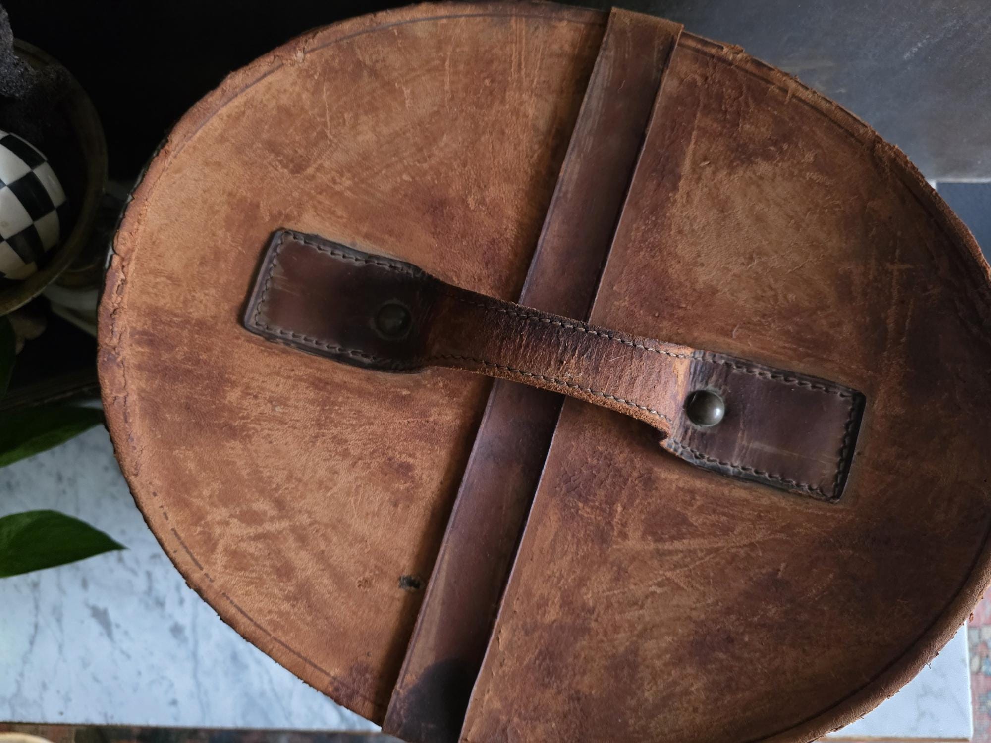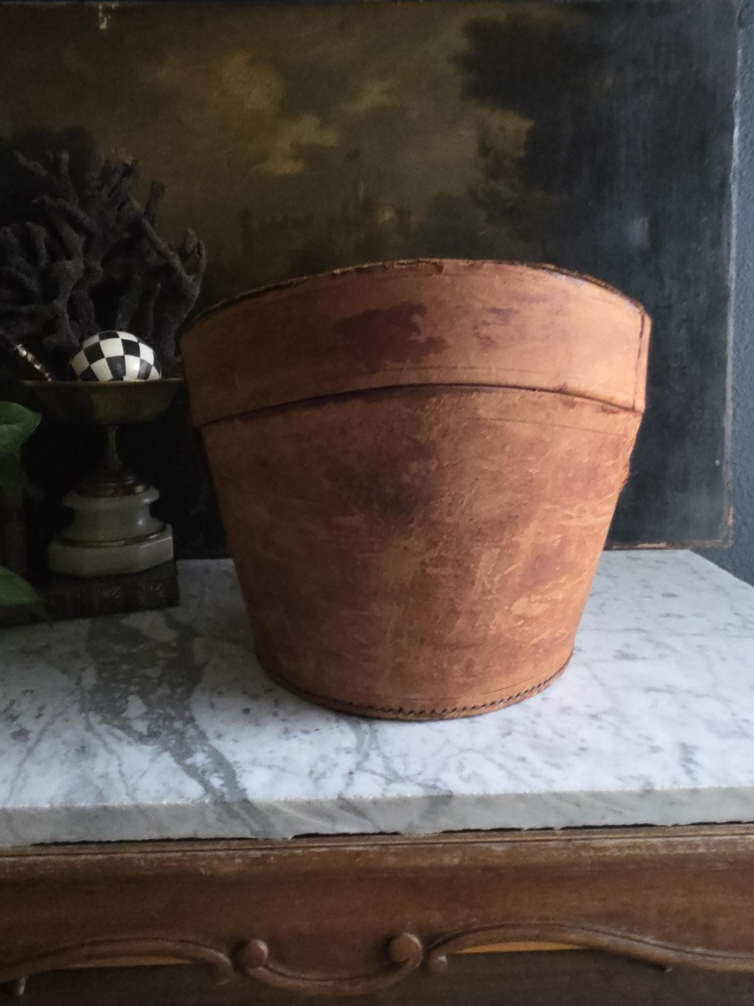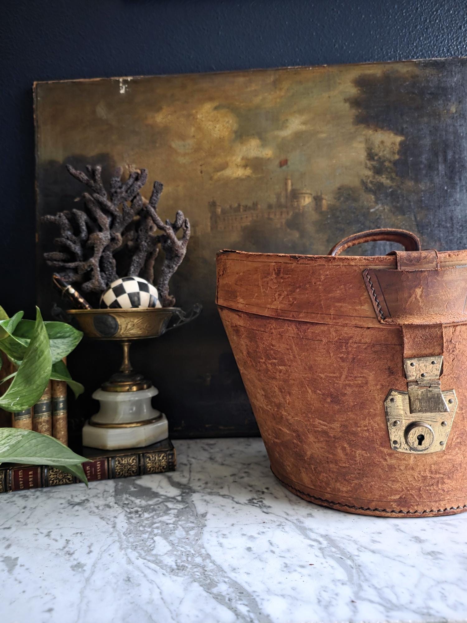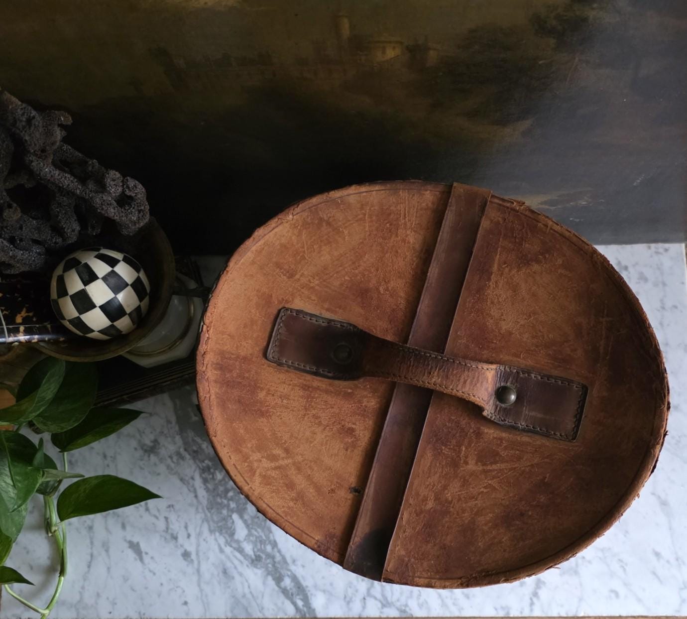 Condition: Please note that this piece is being sold as a fragile decorative object due to significant condition issues. The leather is heavily worn and suffering from age-related stress; it is splitting along the edges, and the rear strap that once functioned as a hinge has severed, meaning the lid detaches completely. Additionally, the leather surface has a history of shedding and flaking characteristic of Red Rot. This is chemical deterioration found almost exclusively in leather tanned from 1850 to 1900. During the Industrial Revolution, tanneries began using acidic compounds to speed up production; over a century later, those acids break down the fibers into powder. While it is an age-related issue, it is also a strong validator of its genuine antique age. This box has been wiped down but, it may still transfer if rubbed against clothing. Despite its fragility and need for careful handling, it remains structurally sound and a visually captivating antique, perfect for shelf styling, moody vignettes, or a static display where its history and rich tones can be admired.