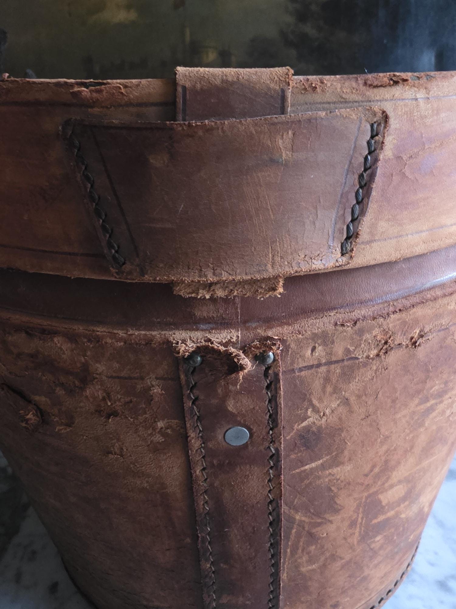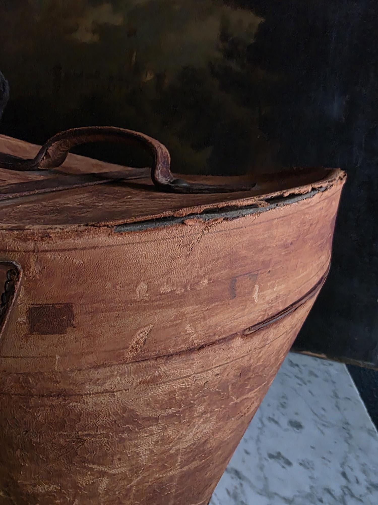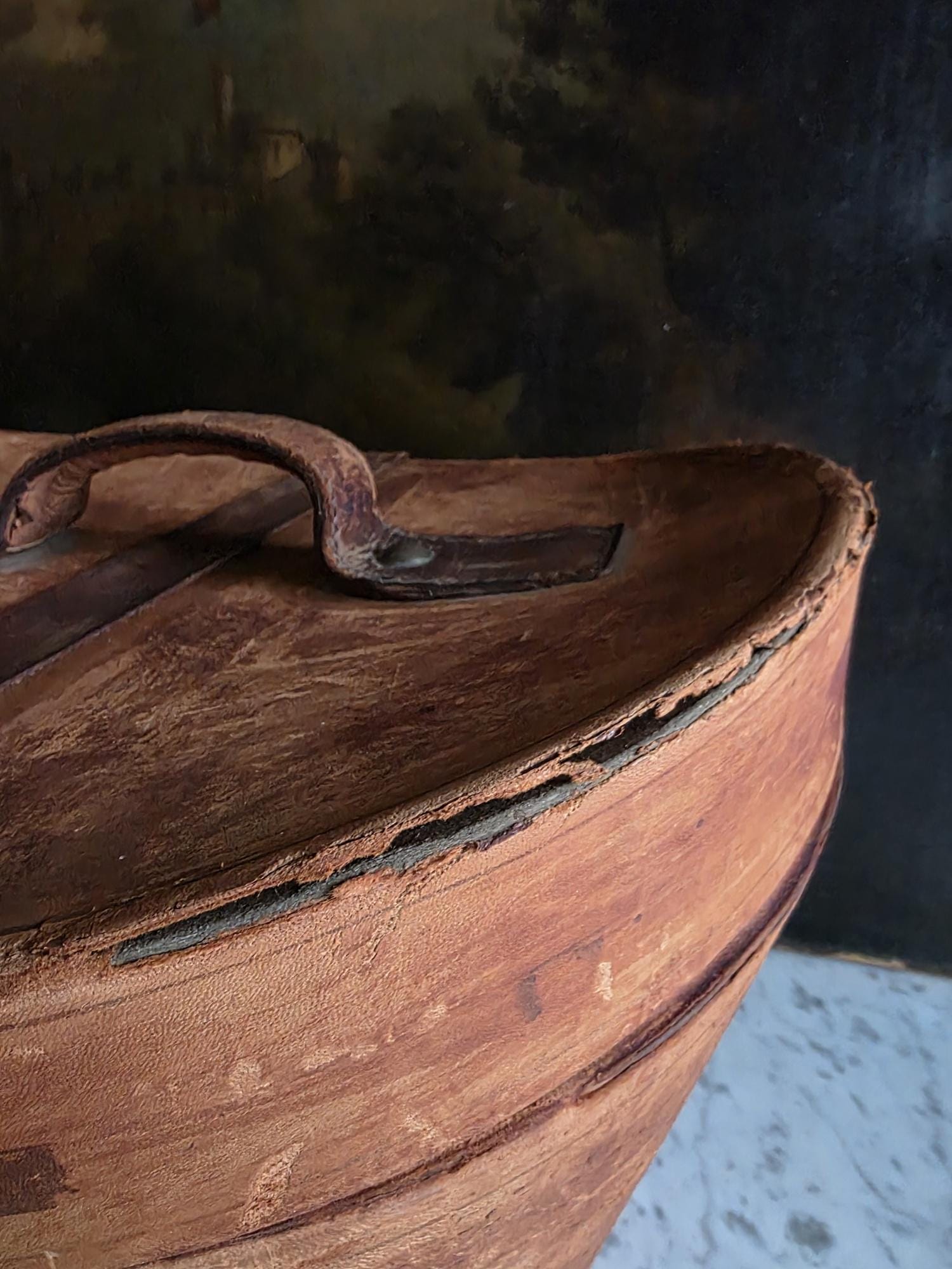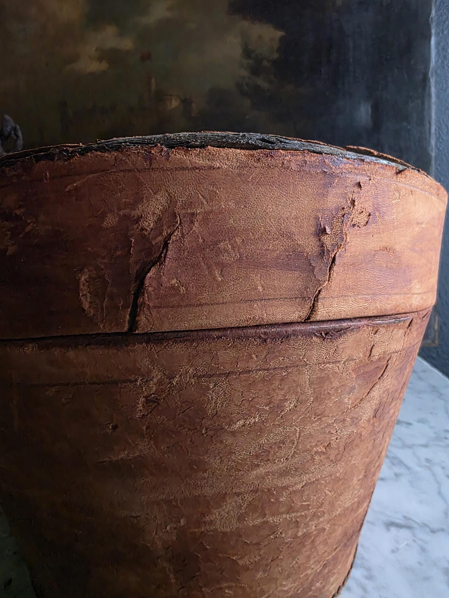 Condition: Please note that this piece is being sold as a fragile decorative object due to significant condition issues. The leather is heavily worn and suffering from age-related stress; it is splitting along the edges, and the rear strap that once functioned as a hinge has severed, meaning the lid detaches completely. Additionally, the leather surface has a history of shedding and flaking characteristic of Red Rot. This is chemical deterioration found almost exclusively in leather tanned from 1850 to 1900. During the Industrial Revolution, tanneries began using acidic compounds to speed up production; over a century later, those acids break down the fibers into powder. While it is an age-related issue, it is also a strong validator of its genuine antique age. This box has been wiped down but, it may still transfer if rubbed against clothing. Despite its fragility and need for careful handling, it remains structurally sound and a visually captivating antique, perfect for shelf styling, moody vignettes, or a static display where its history and rich tones can be admired.