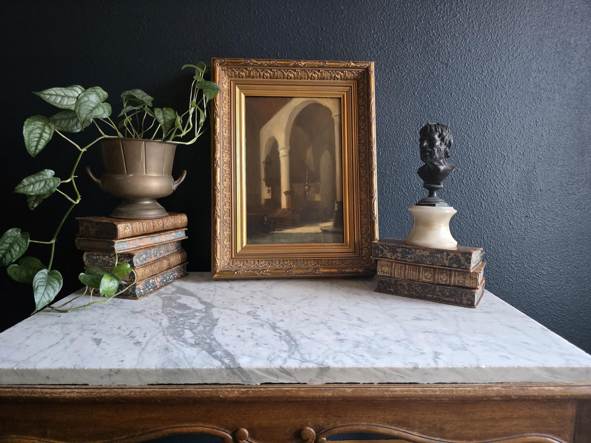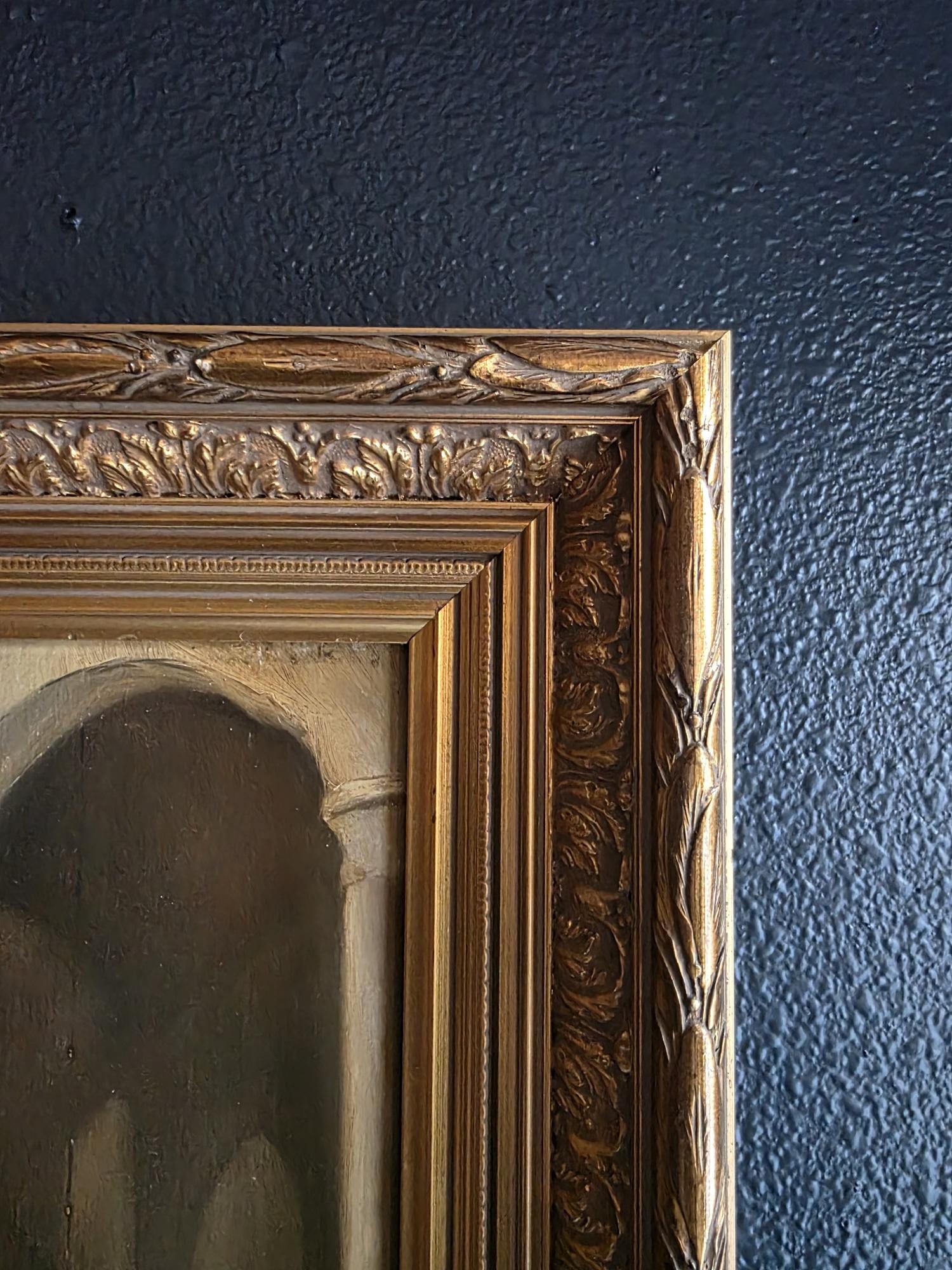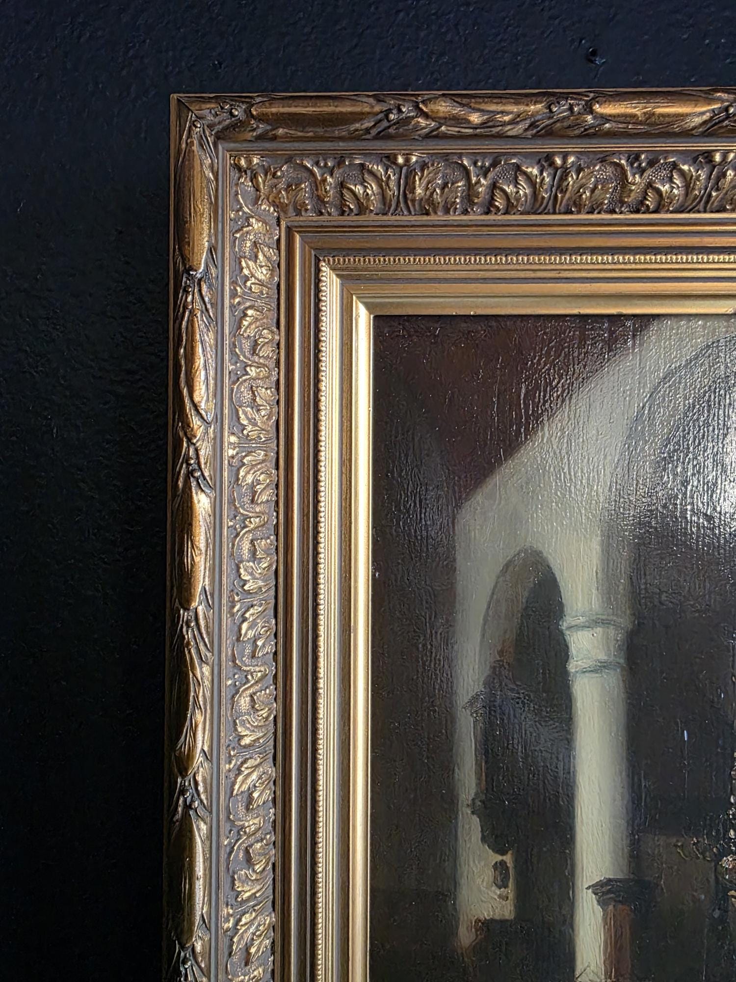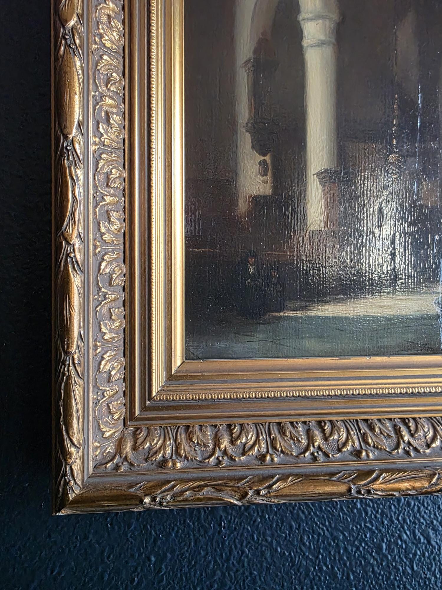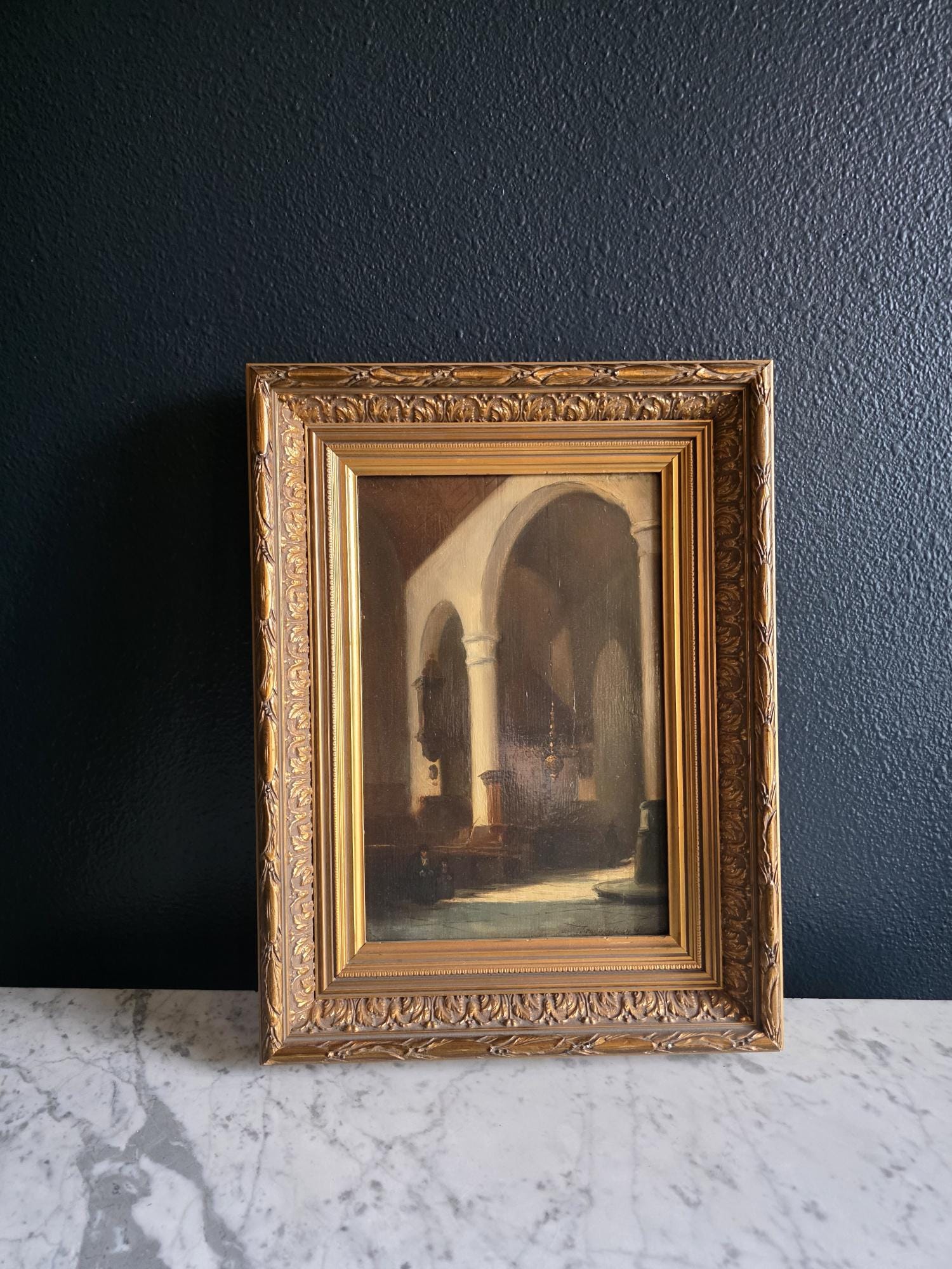 Housed in an ornate, period-style gilt frame that complements the warm tones of the composition, this painting is a pristine example of Dutch architectural painting. It represents a fantastic opportunity to acquire a signed work by a museum-represented artist whose works are held in collections such as the Rijksprentenkabinet in Amsterdam and the Kröller-Müller Museum.