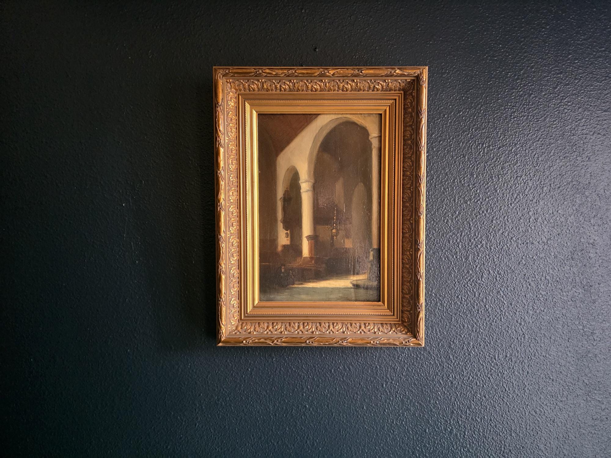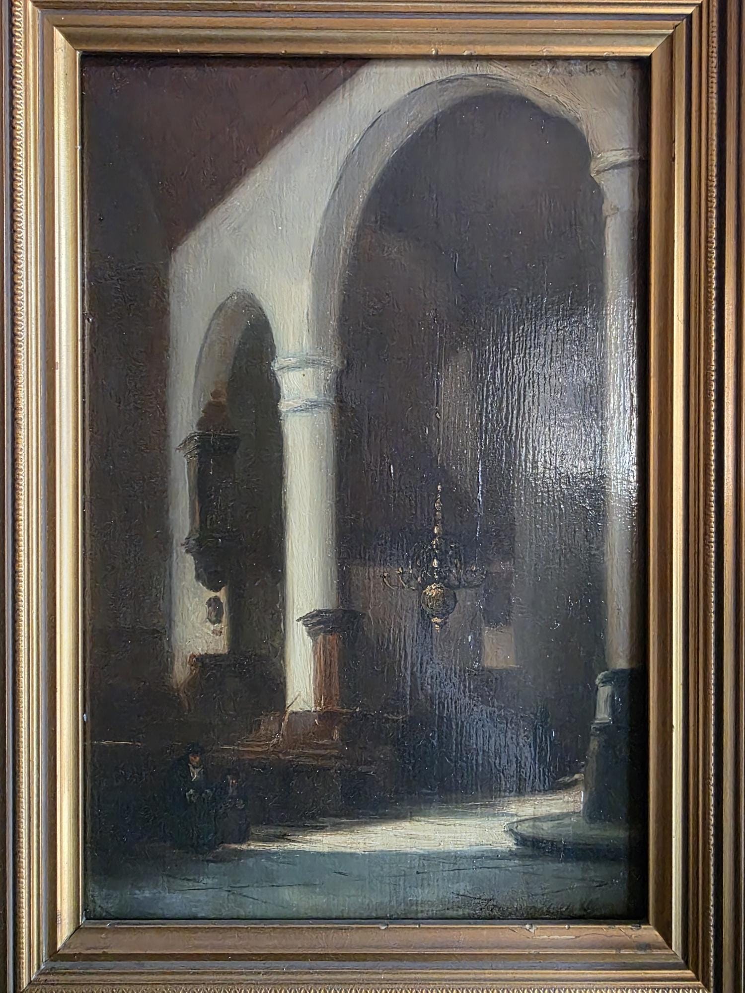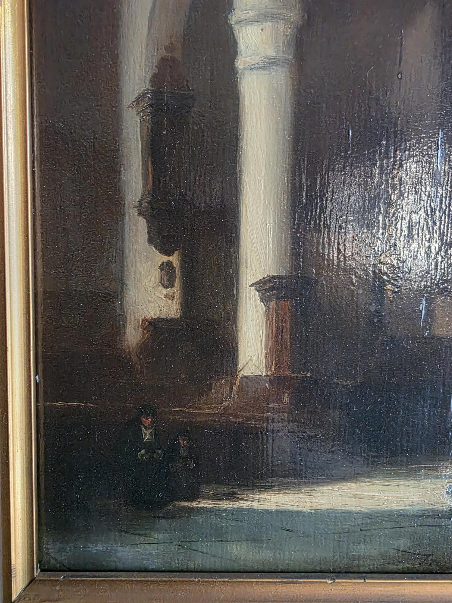Presenting an exquisite 19th-century oil on board by the noted Dutch Romantic painter Jan (Johannes) Baptist Tetar van Elven (1805–1889). A listed artist celebrated for his atmospheric architectural scenes, Tetar van Elven masterfully captures the quiet sanctity of a church interior in this evocative piece. The work is signed in the lower right-hand corner and further retains its original identification label on the verso, which cites the artist’s full biographical details and references his entry in the definitive Dutch art lexicon, Scheen (Vol. II, page 435), providing exceptional provenance and research potential for the collector.