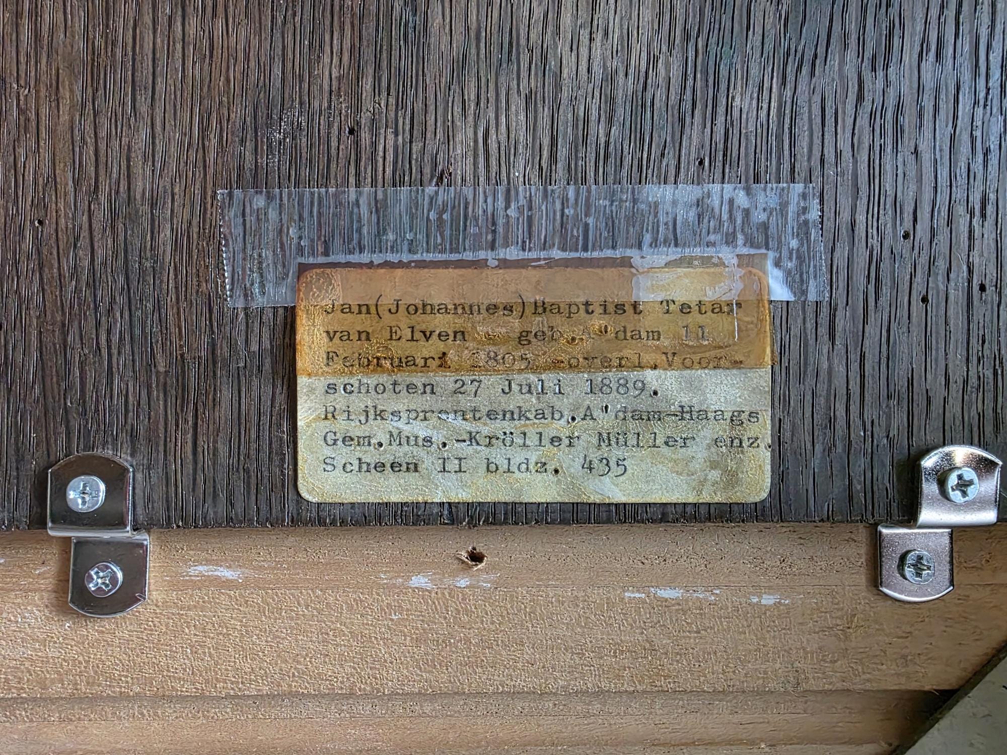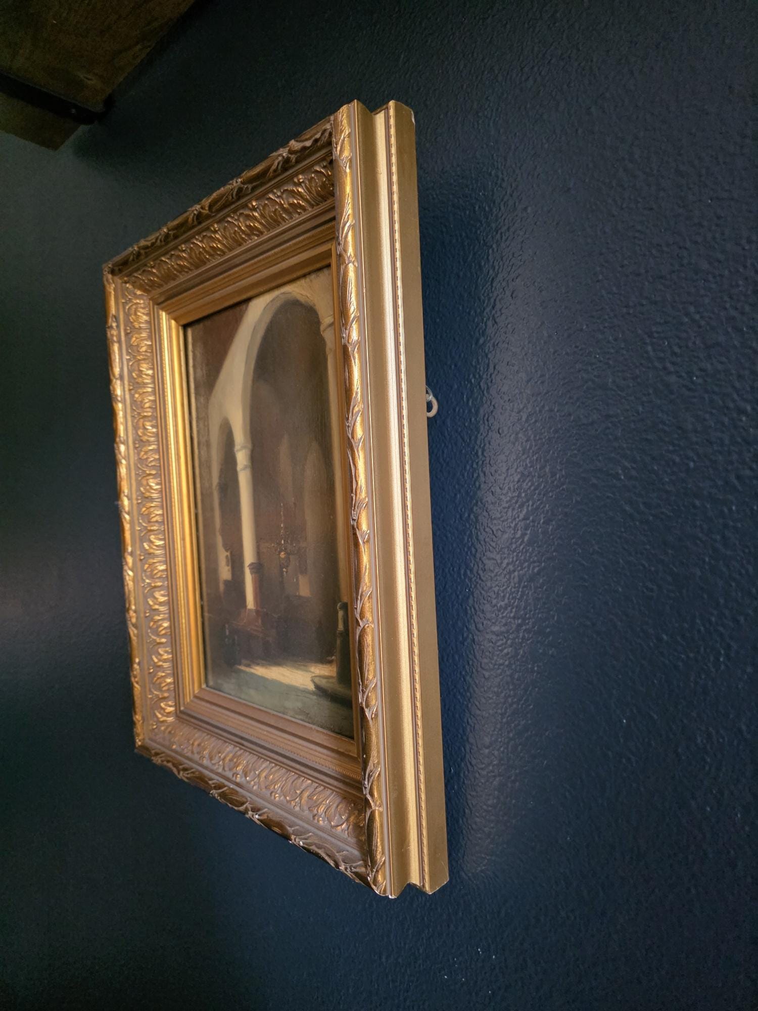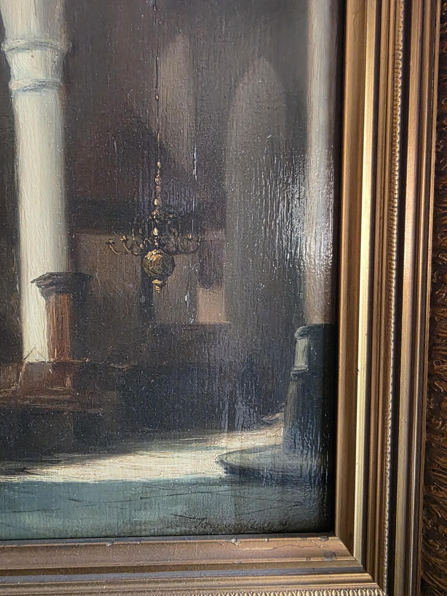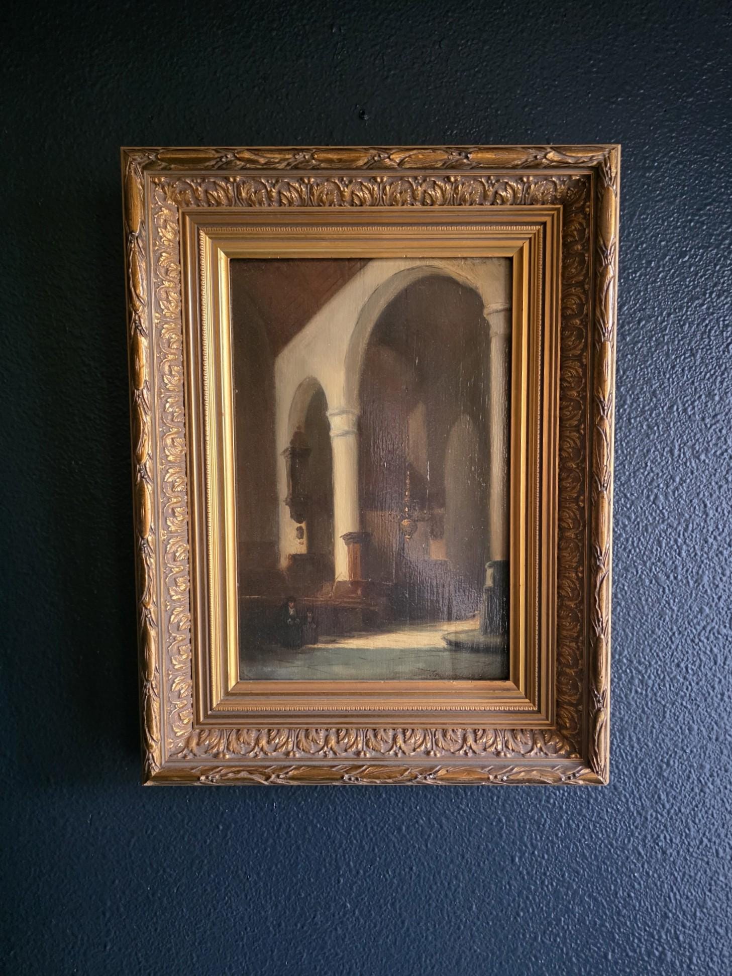 Presenting an exquisite 19th-century oil on board by the noted Dutch Romantic painter Jan (Johannes) Baptist Tetar van Elven (1805–1889). A listed artist celebrated for his atmospheric architectural scenes, Tetar van Elven masterfully captures the quiet sanctity of a church interior in this evocative piece. The work is signed in the lower right-hand corner and further retains its original identification label on the verso, which cites the artist’s full biographical details and references his entry in the definitive Dutch art lexicon, Scheen (Vol. II, page 435), providing exceptional provenance and research potential for the collector.