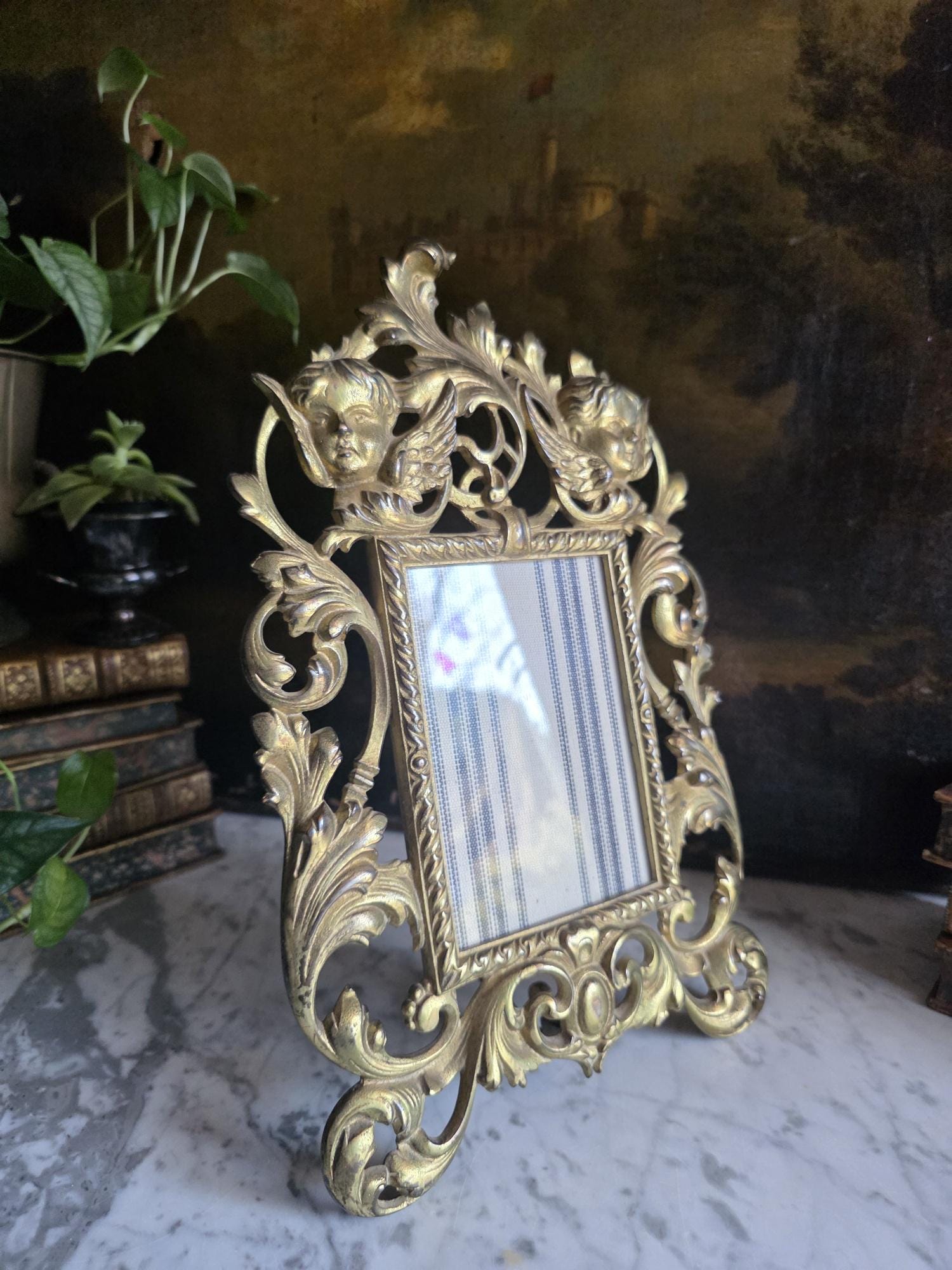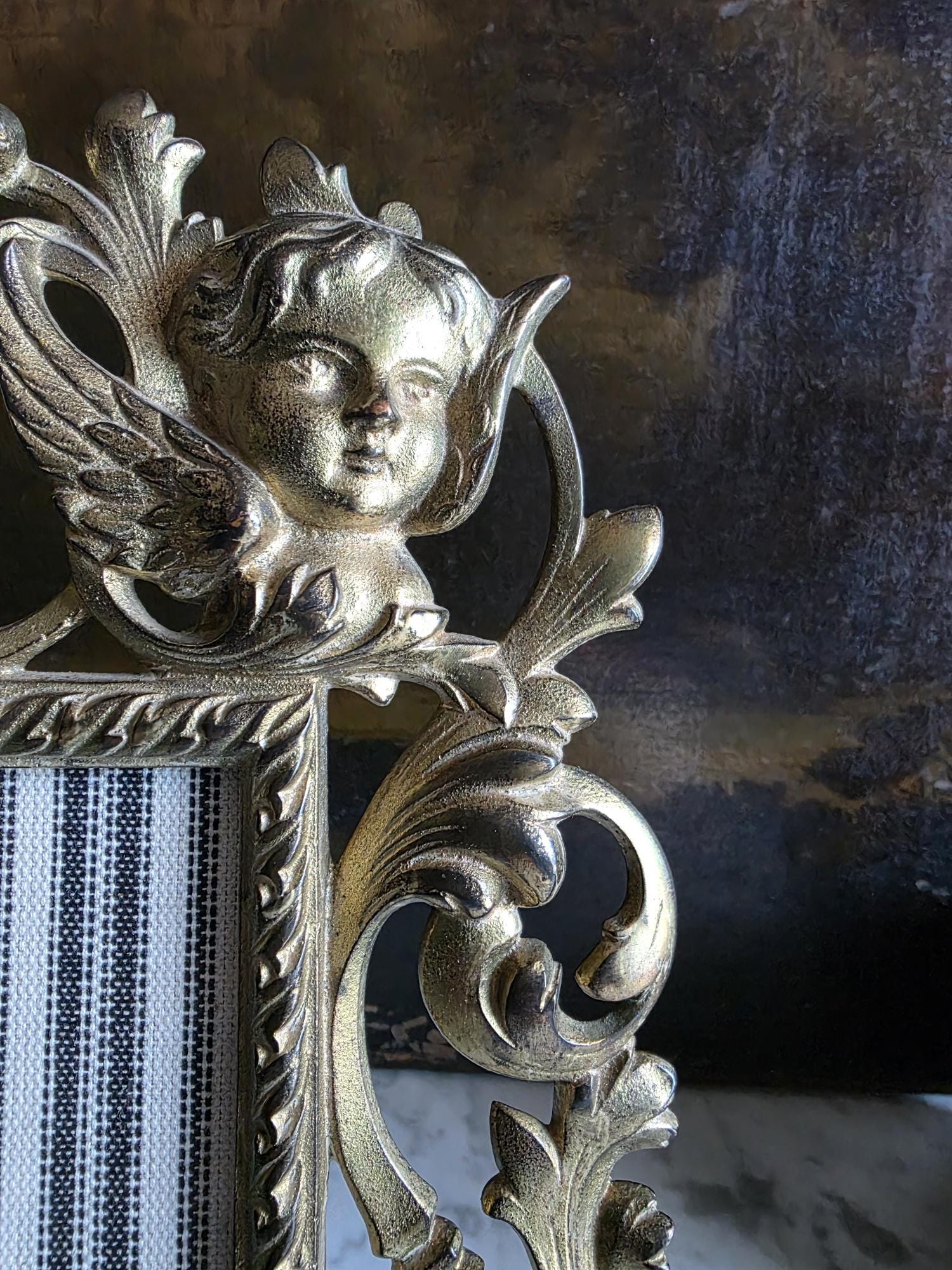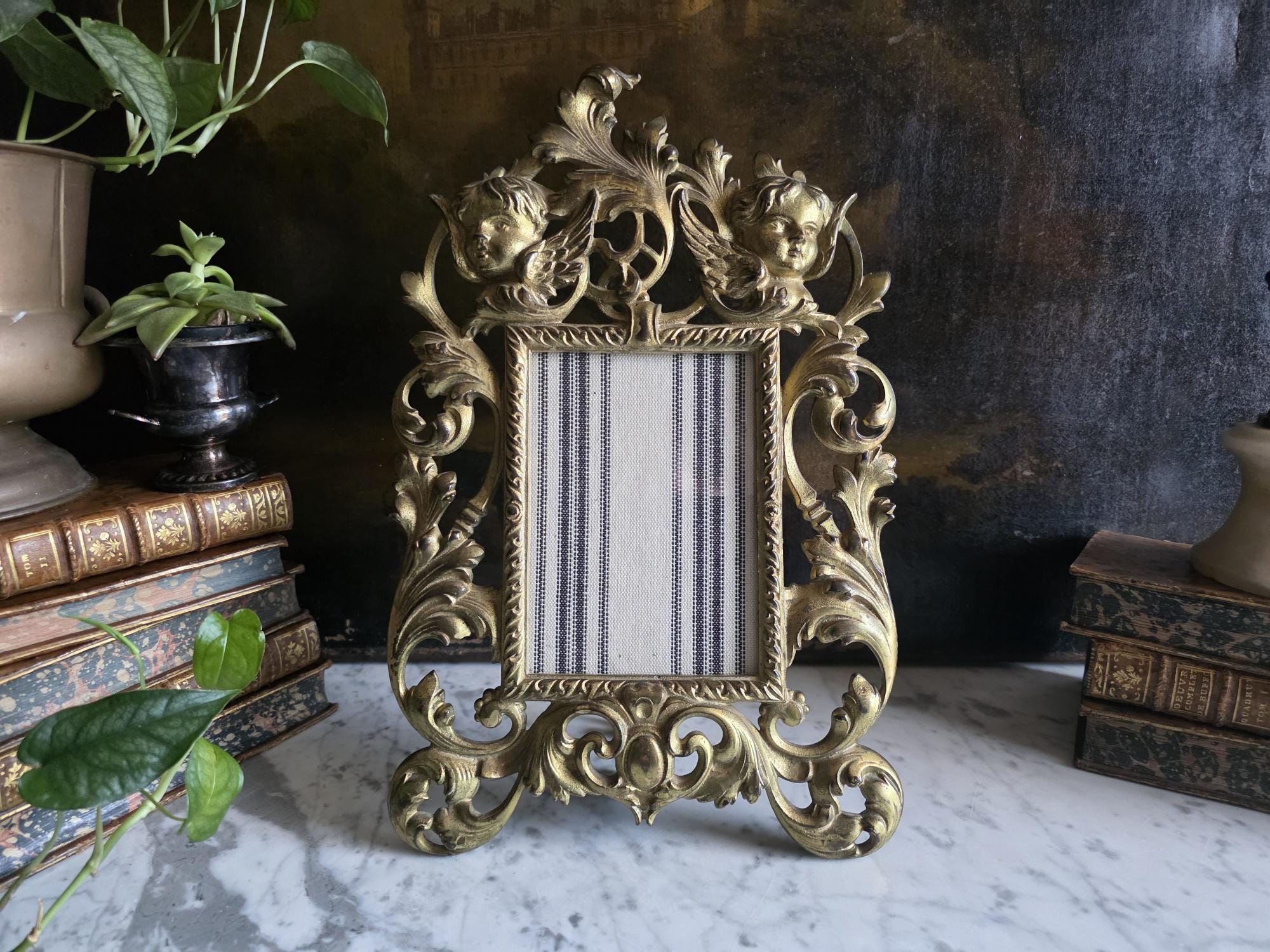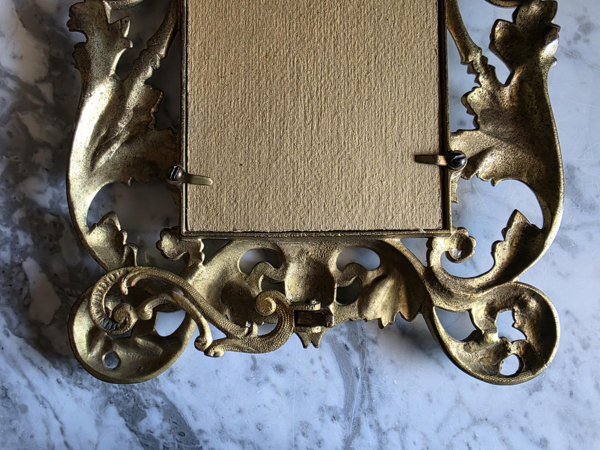 This exquisite antique cast iron easel frame features a stunningly detailed Art Nouveau design, highlighted by two enchanting cherubs (putti) nestled among swirling acanthus leaves and floral scrolls. The frame is finished in a rich, antique gold gilt that beautifully accentuates the depth of the casting, giving it a warm, regal presence. Its openwork border and ornate crest create an airy yet substantial feel, perfect for adding a touch of romance to a vanity, mantel, or bedside table. The frame retains its original hinged easel stand, which is both decorative and functional, allowing for stable display. The back is stamped with the mold number, a mark of its turn-of-the-century craftsmanship. Currently fitted with a striped fabric insert, it is ready to showcase your favorite photograph or small mirror. Circa 1895 – 1915 (Art Nouveau / Late Victorian Era).