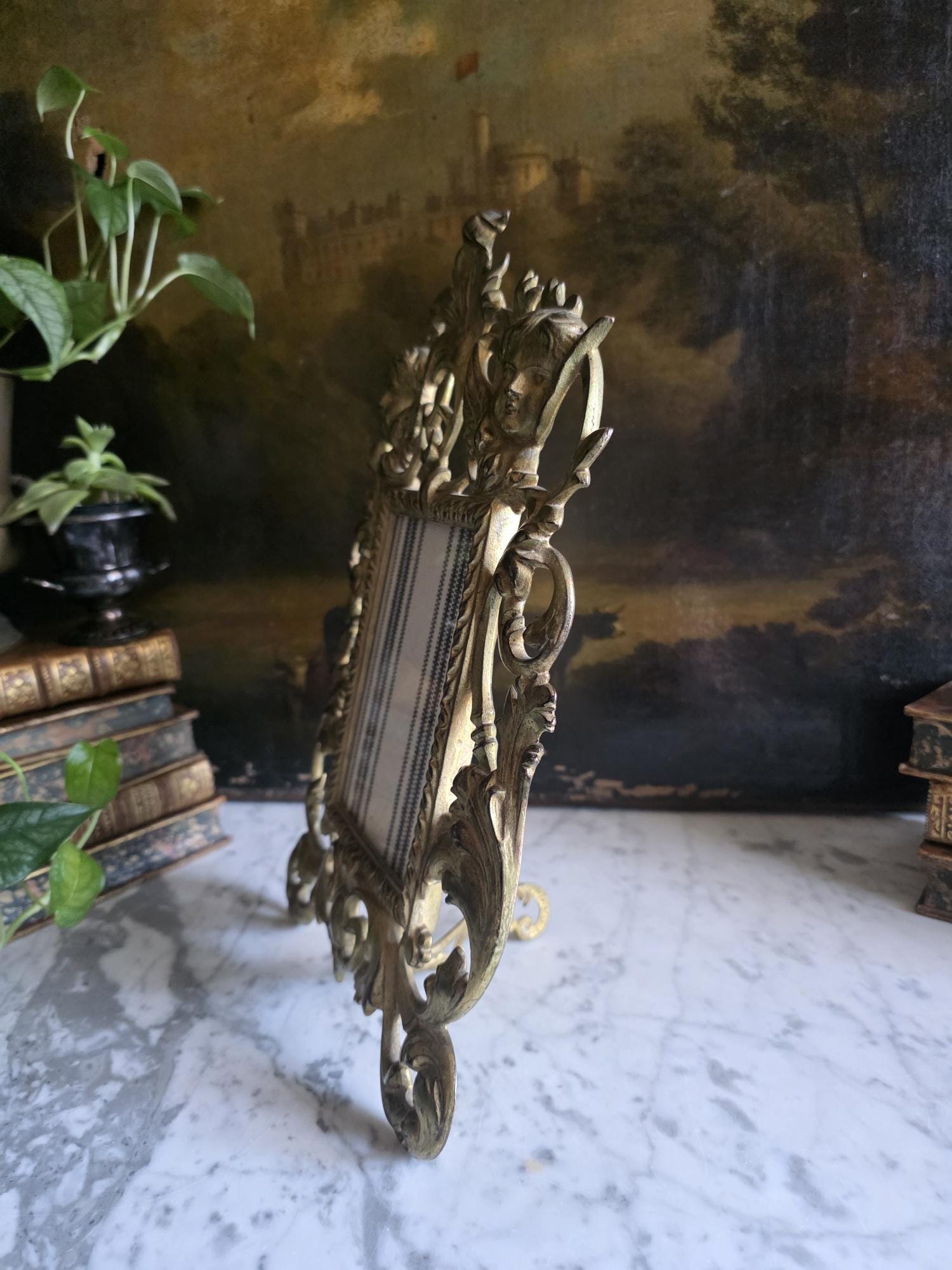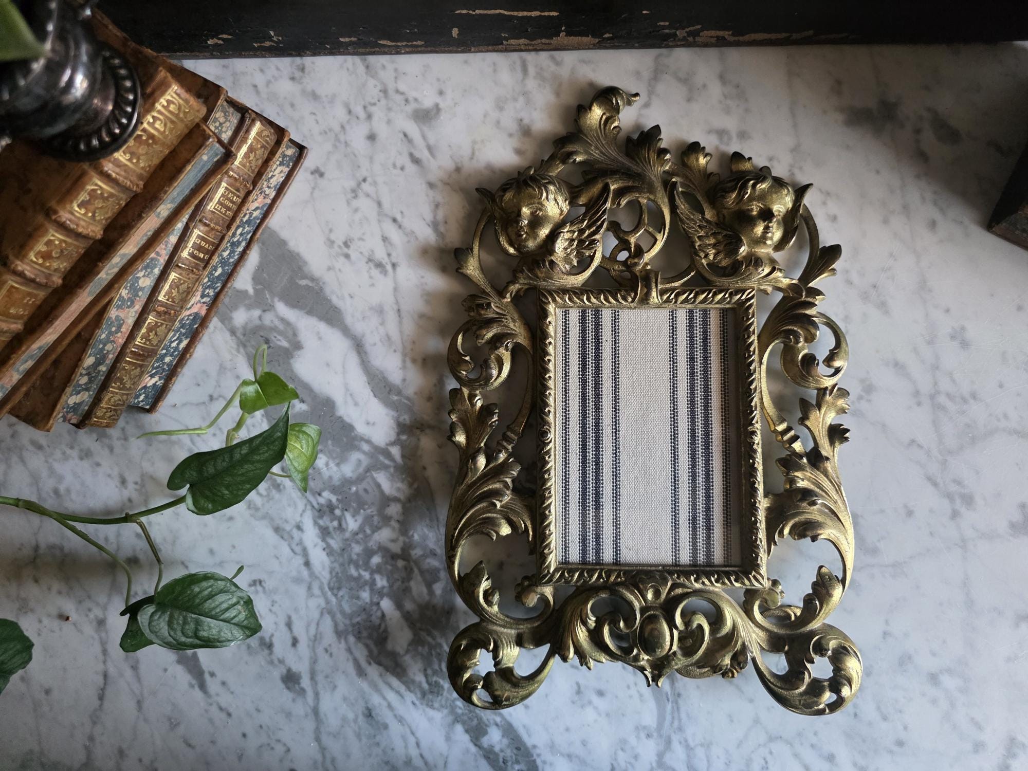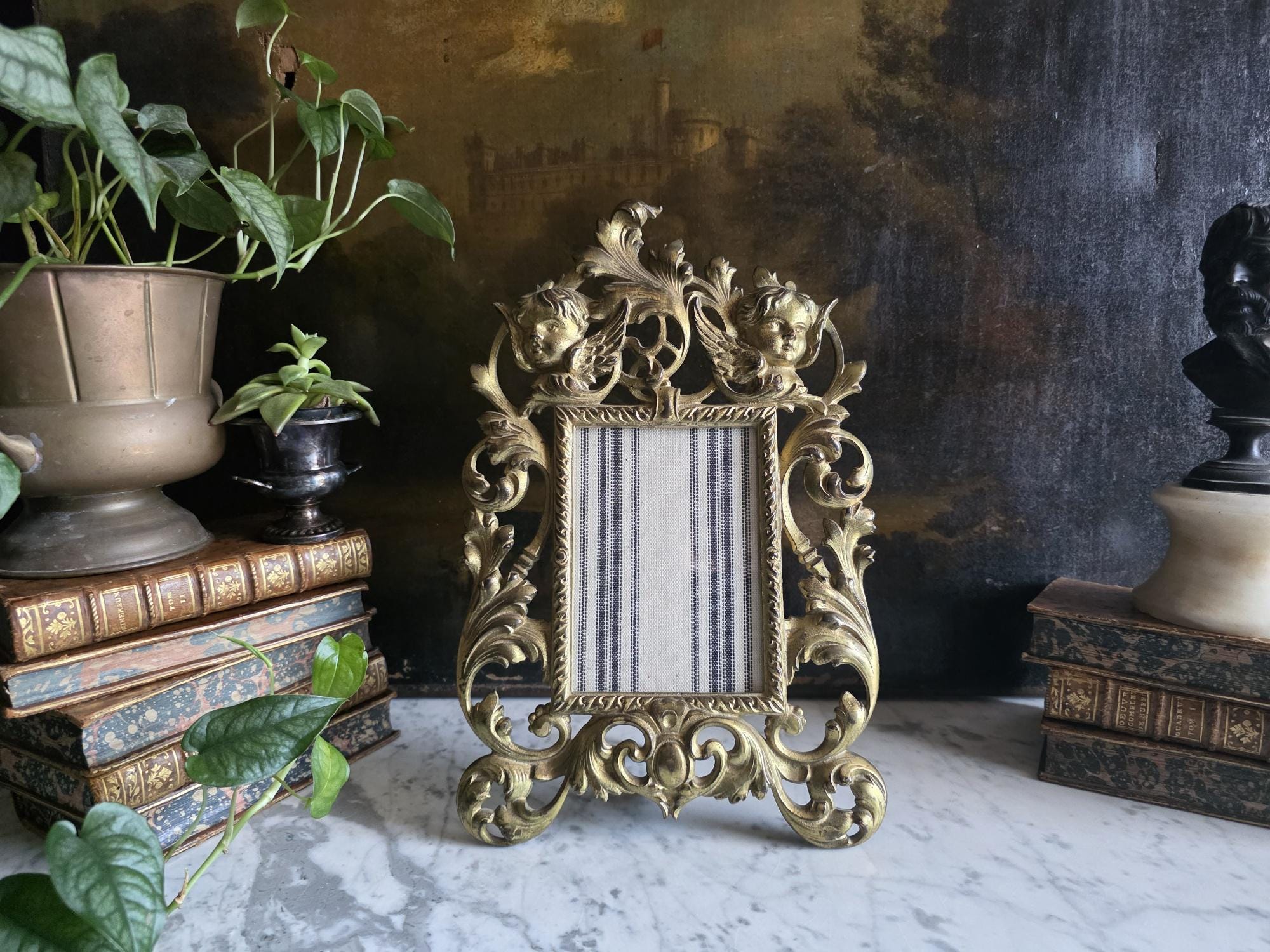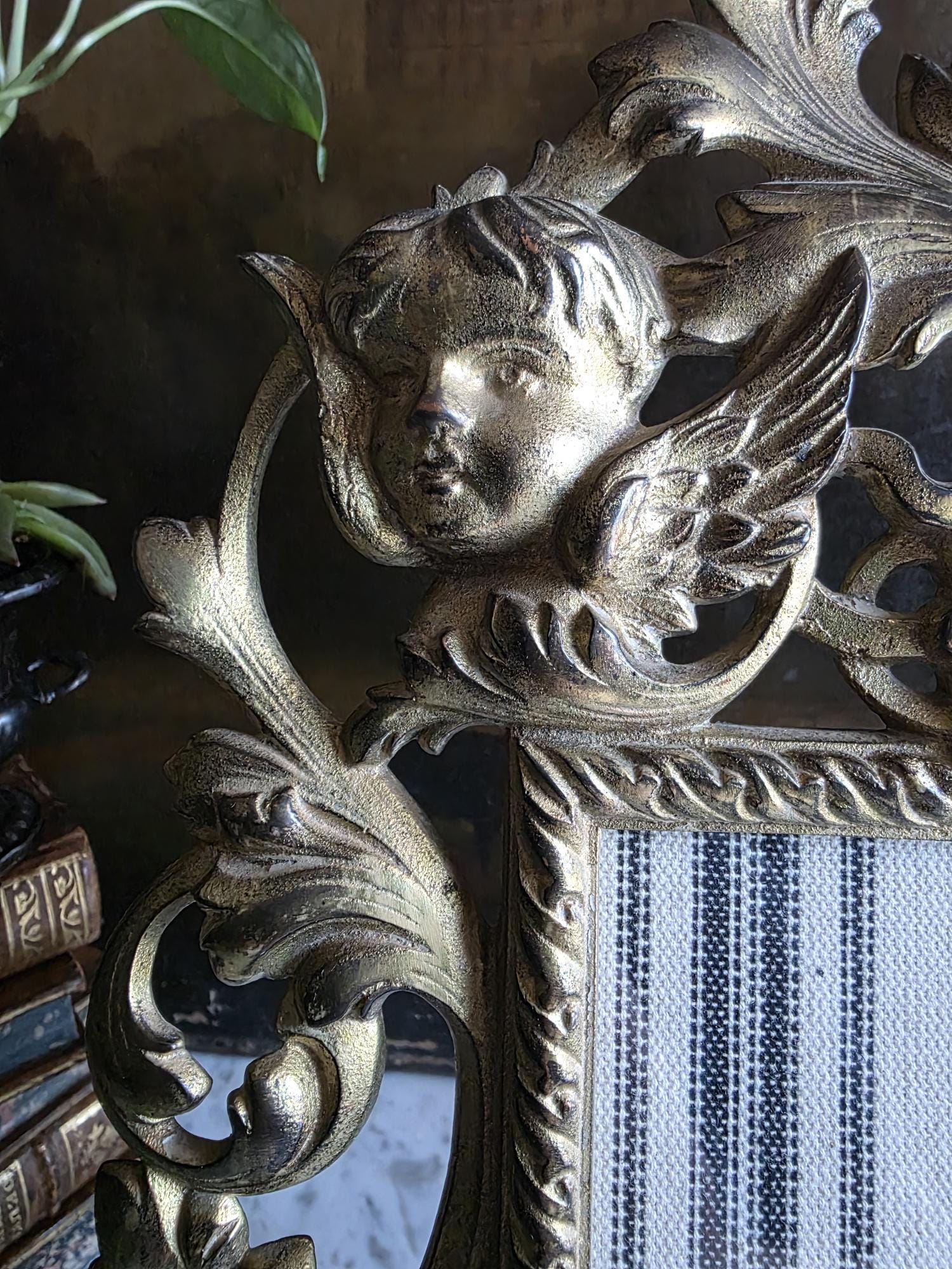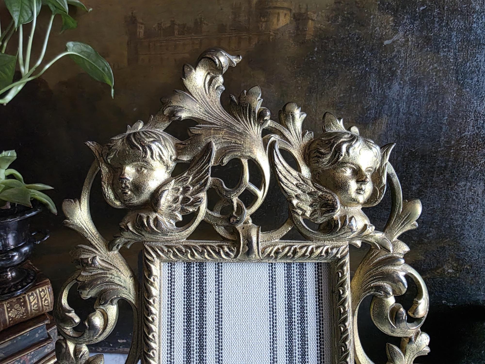 This exquisite antique cast iron easel frame features a stunningly detailed Art Nouveau design, highlighted by two enchanting cherubs (putti) nestled among swirling acanthus leaves and floral scrolls. The frame is finished in a rich, antique gold gilt that beautifully accentuates the depth of the casting, giving it a warm, regal presence. Its openwork border and ornate crest create an airy yet substantial feel, perfect for adding a touch of romance to a vanity, mantel, or bedside table. The frame retains its original hinged easel stand, which is both decorative and functional, allowing for stable display. The back is stamped with the mold number, a mark of its turn-of-the-century craftsmanship. Currently fitted with a striped fabric insert, it is ready to showcase your favorite photograph or small mirror. Circa 1895 – 1915 (Art Nouveau / Late Victorian Era).