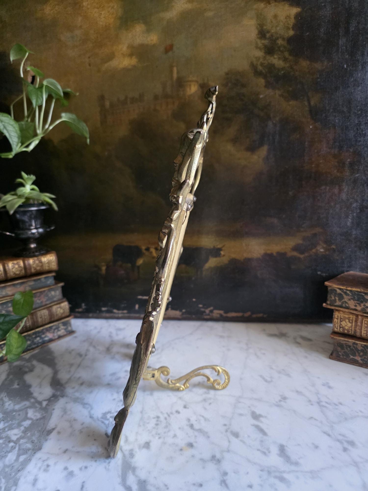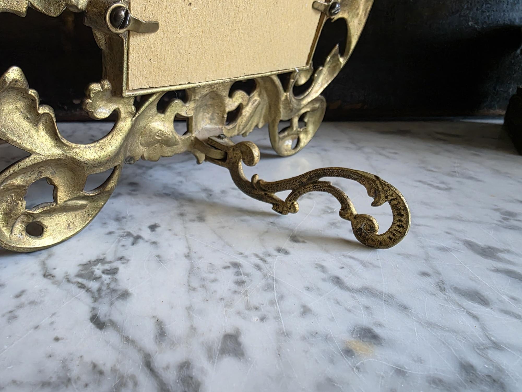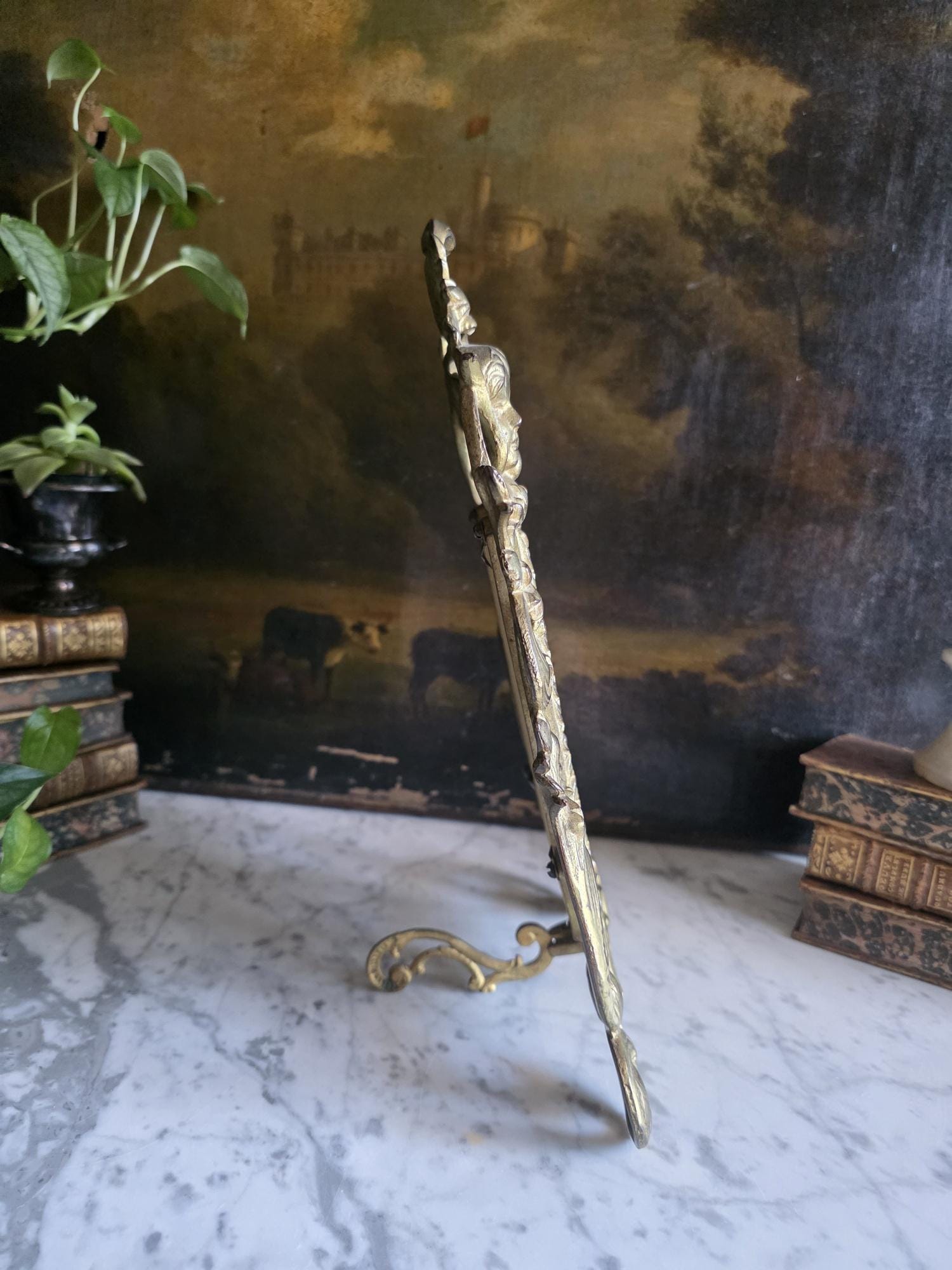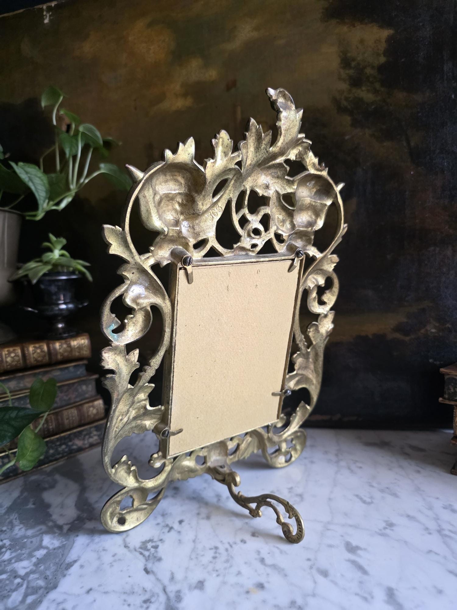 This exquisite antique cast iron easel frame features a stunningly detailed Art Nouveau design, highlighted by two enchanting cherubs (putti) nestled among swirling acanthus leaves and floral scrolls. The frame is finished in a rich, antique gold gilt that beautifully accentuates the depth of the casting, giving it a warm, regal presence. Its openwork border and ornate crest create an airy yet substantial feel, perfect for adding a touch of romance to a vanity, mantel, or bedside table. The frame retains its original hinged easel stand, which is both decorative and functional, allowing for stable display. The back is stamped with the mold number, a mark of its turn-of-the-century craftsmanship. Currently fitted with a striped fabric insert, it is ready to showcase your favorite photograph or small mirror. Circa 1895 – 1915 (Art Nouveau / Late Victorian Era).