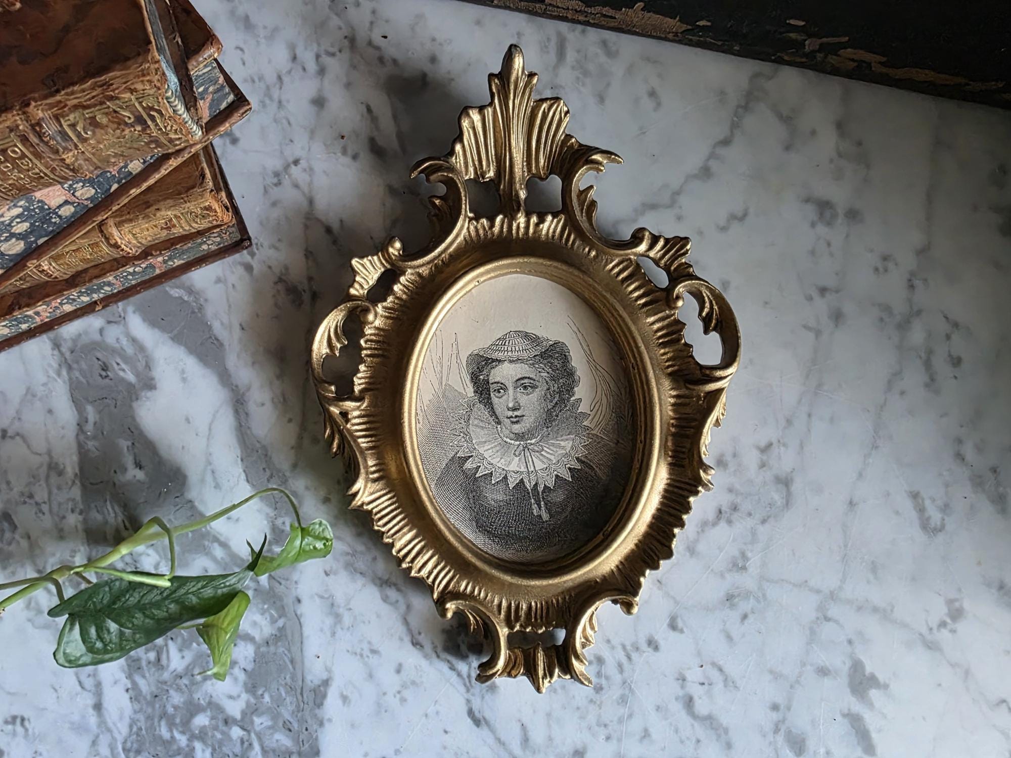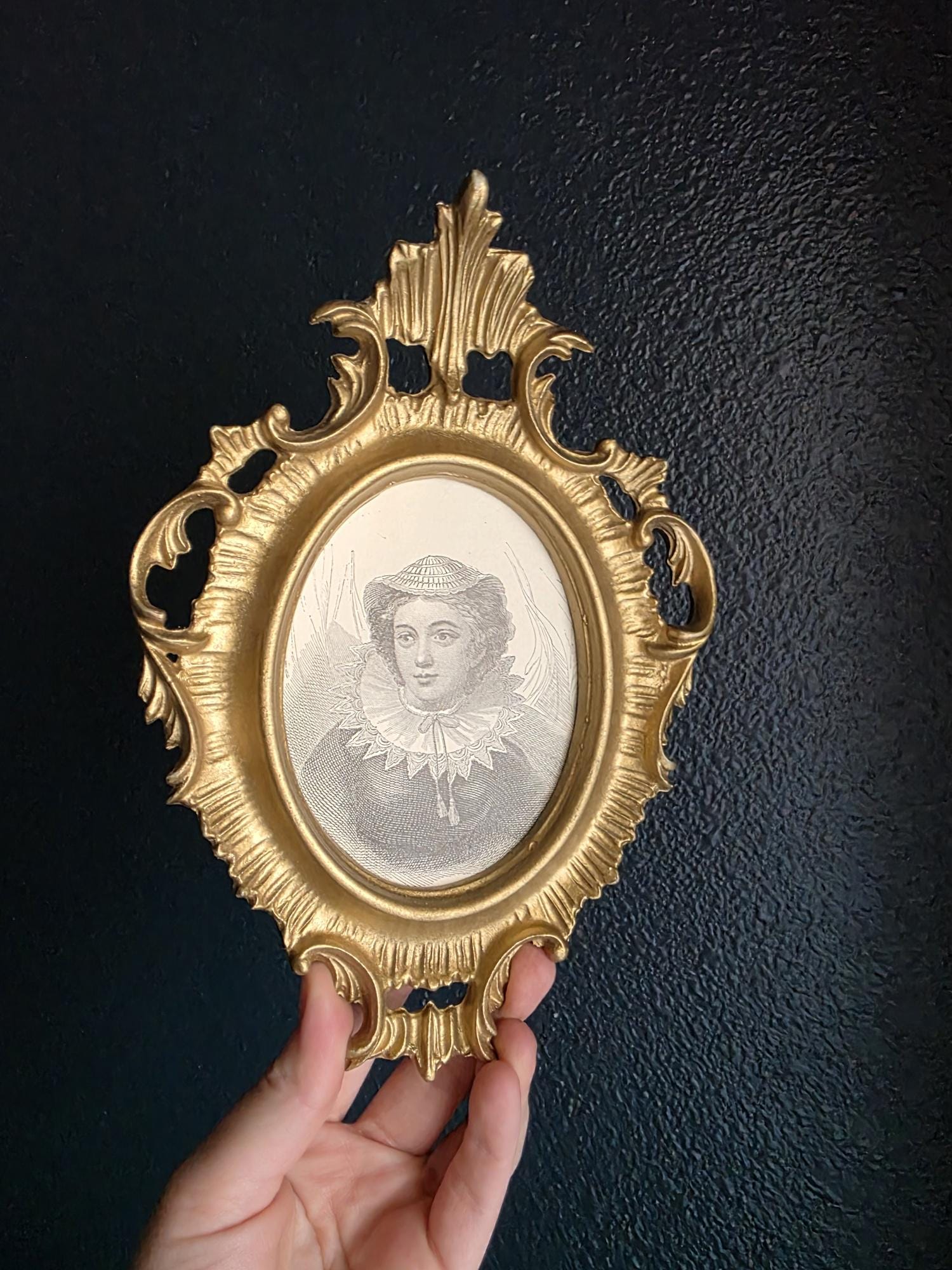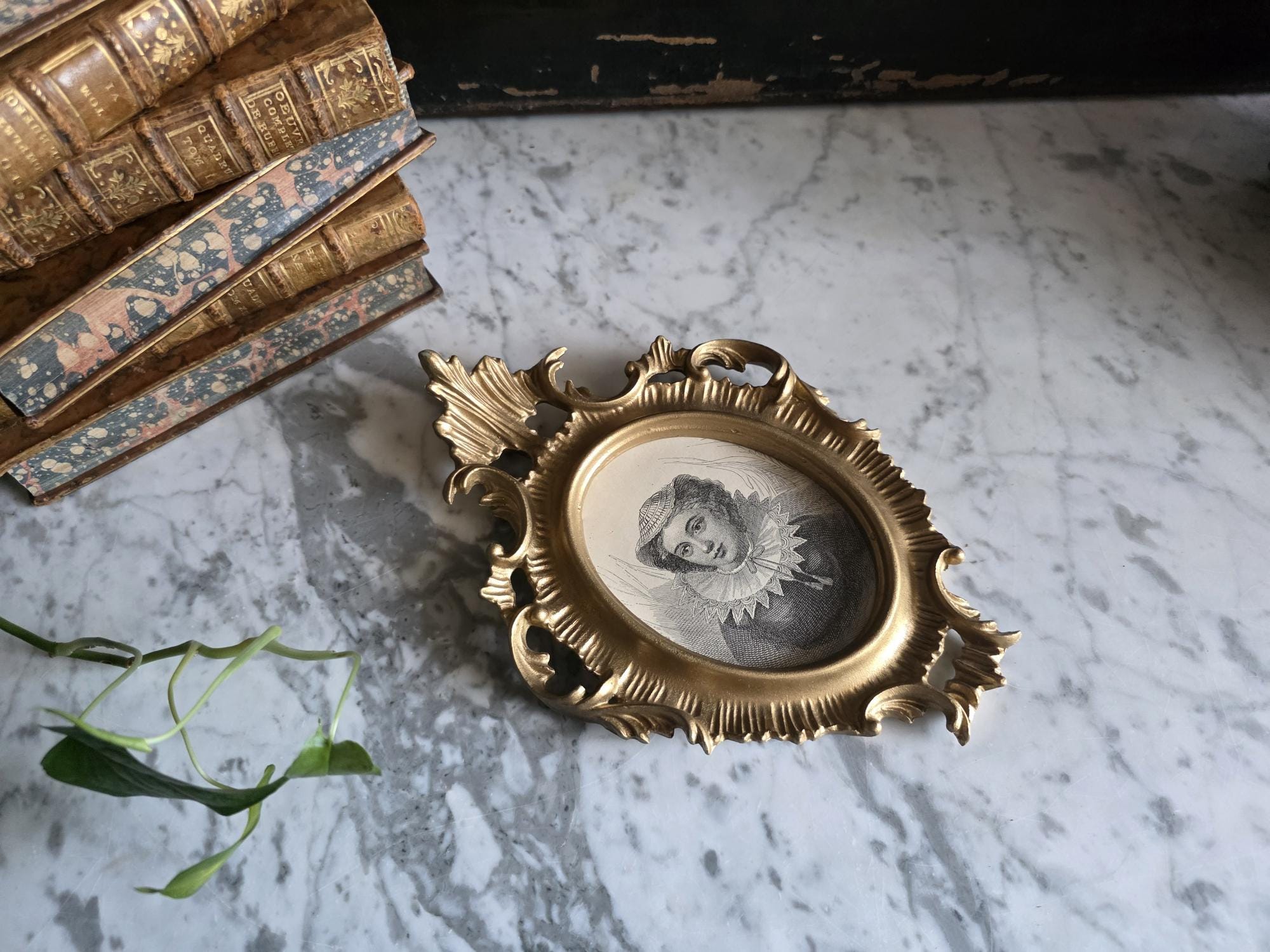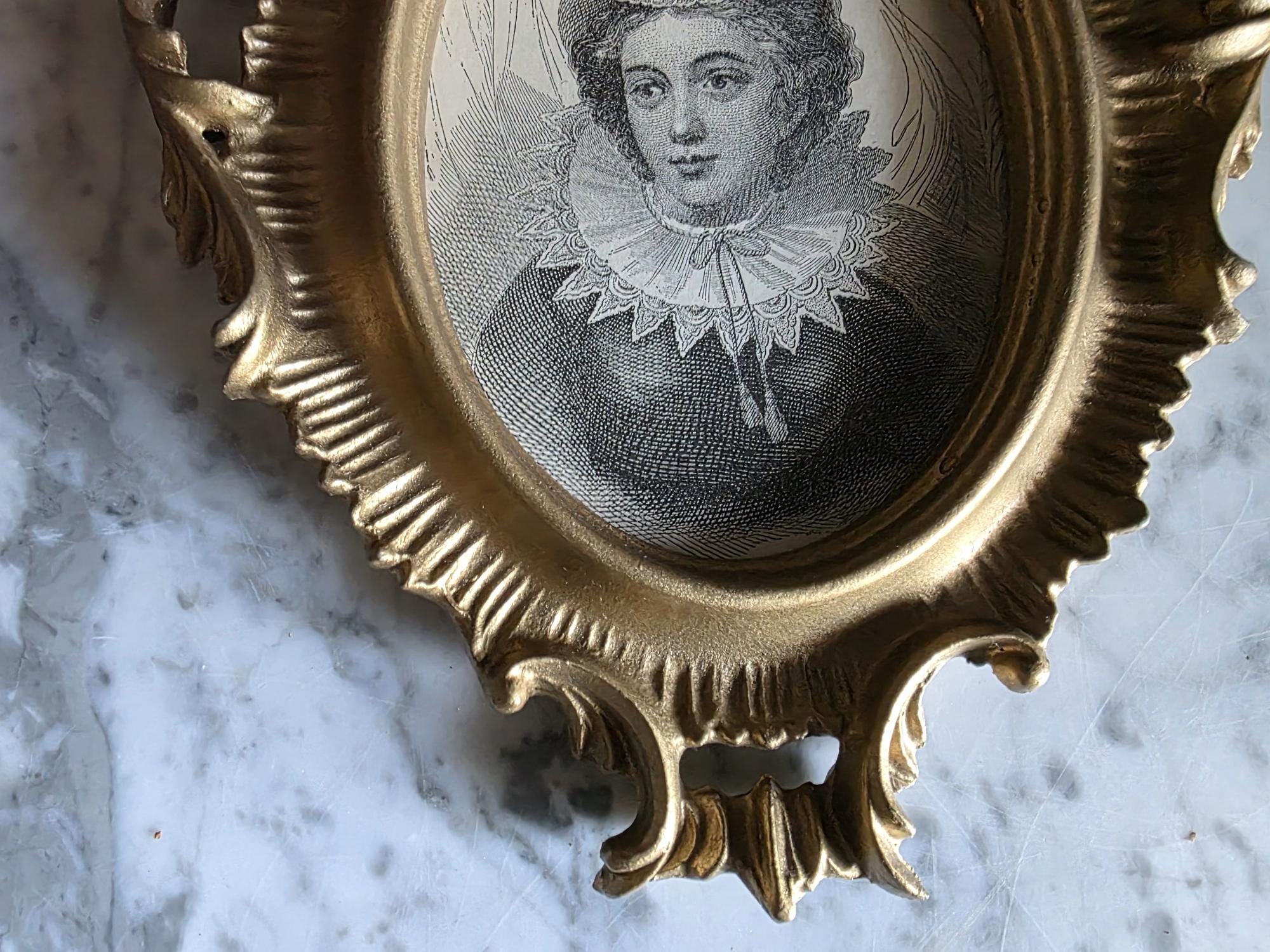 This decorative wall hanging features a classic black-and-white book illustration of Mary Queen of Scots, depicted in period attire with her signature ruff collar and cap. The portrait is displayed in a highly ornate, Rococo-style oval frame featuring elaborate scrollwork and a bright gold finish. Constructed from a lightweight resin composite, the frame is durable and ready to hang. Please note that this piece was assembled with an amateur framing technique and does not include glass; the print is exposed for an open-faced, matte presentation. While the mounting is simple, the intricate frame and historical subject make this a charming accent piece for a gallery wall, bookshelf, or dark academia-inspired vignette.