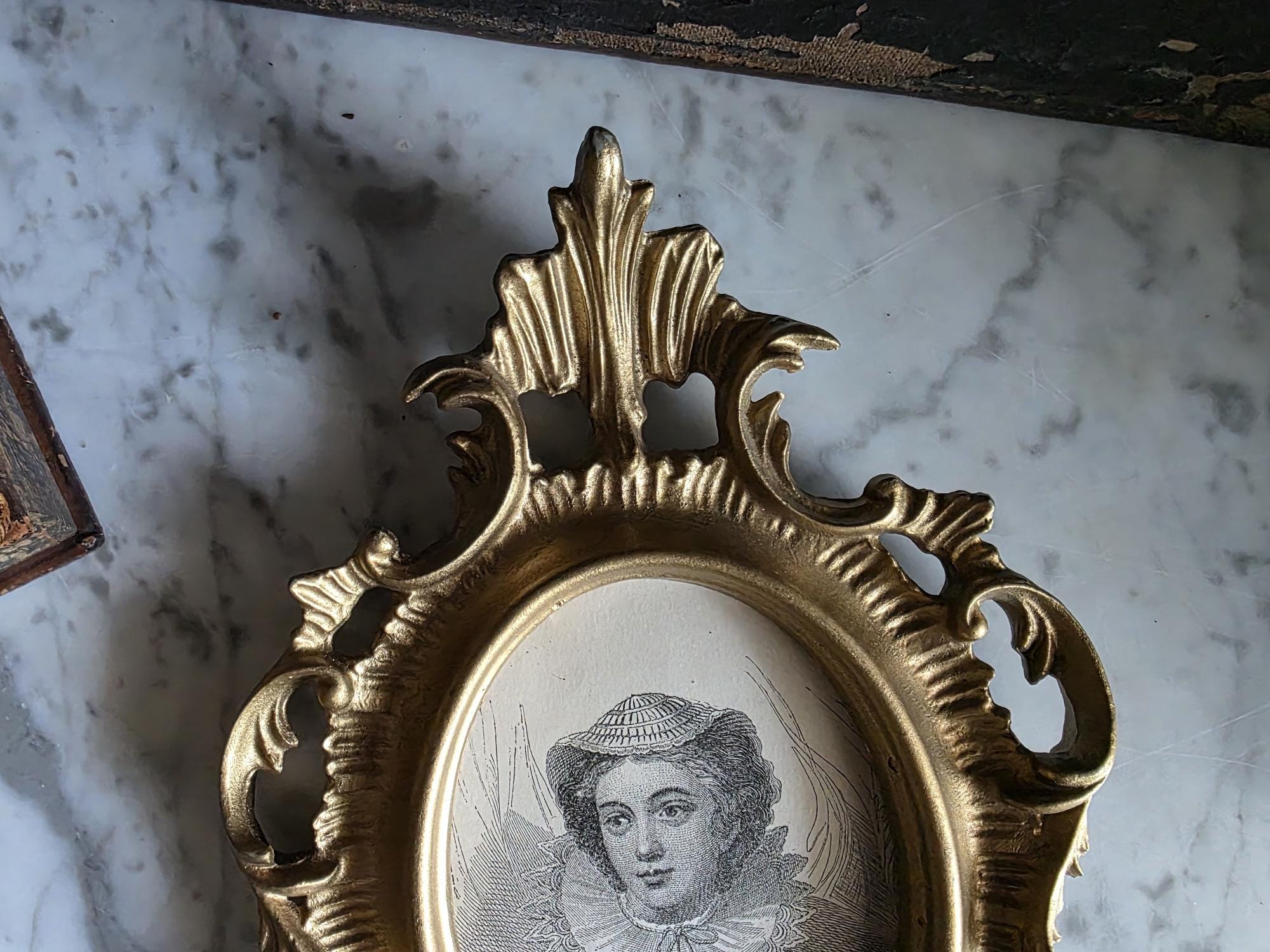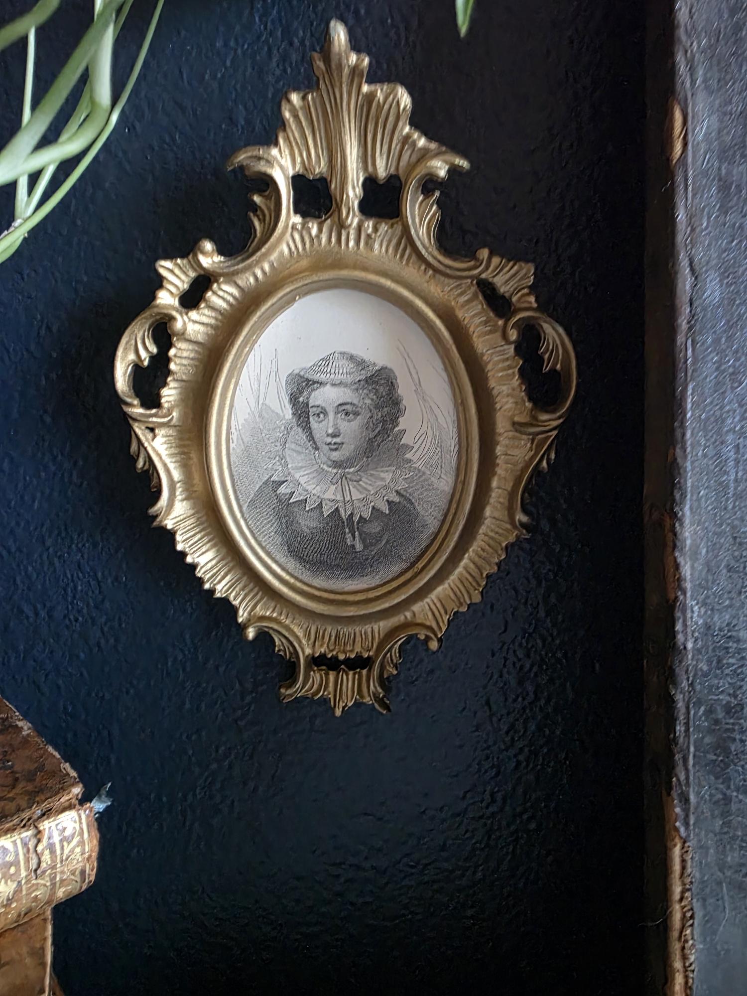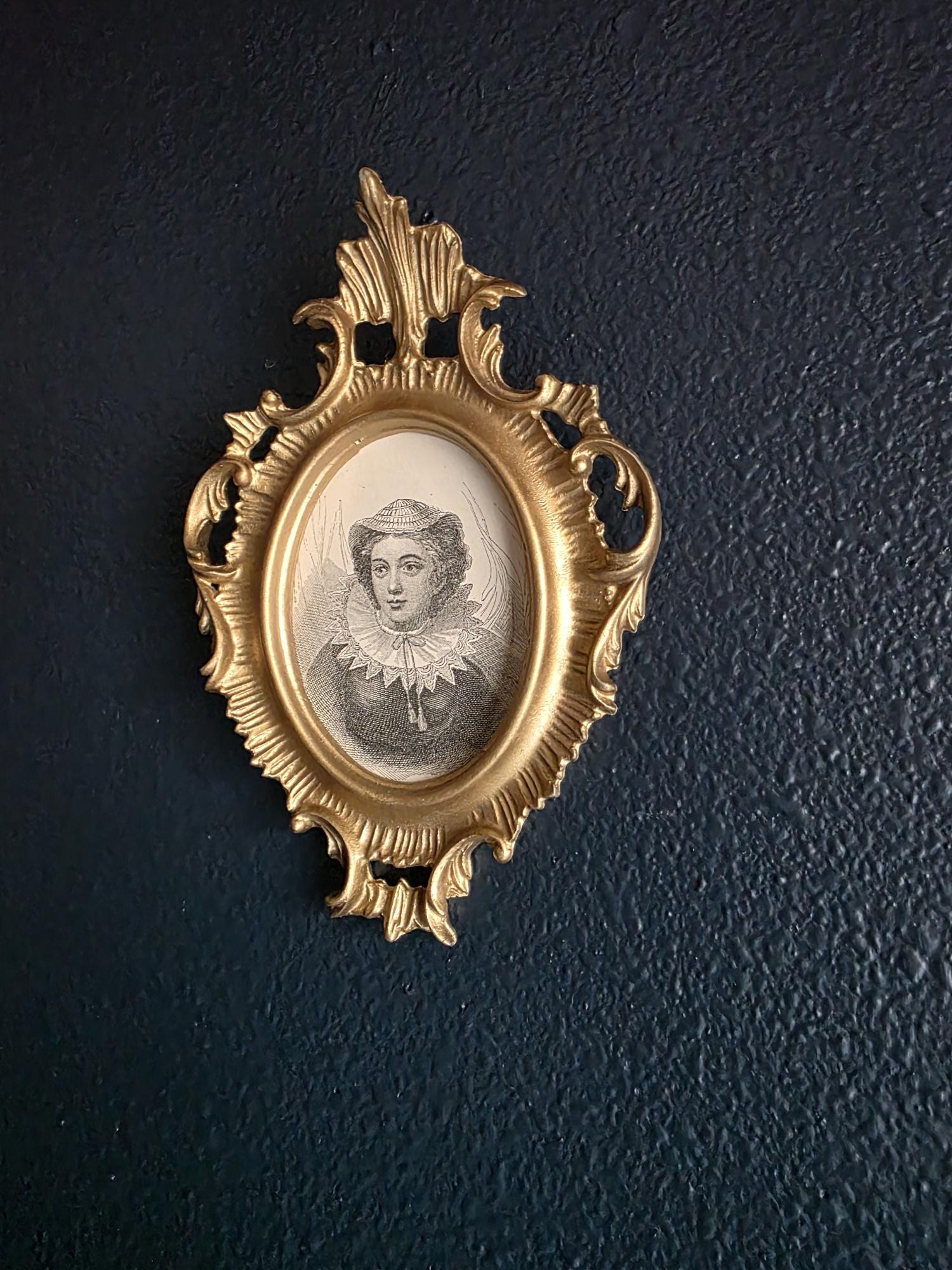 This decorative wall hanging features a classic black-and-white book illustration of Mary Queen of Scots, depicted in period attire with her signature ruff collar and cap. The portrait is displayed in a highly ornate, Rococo-style oval frame featuring elaborate scrollwork and a bright gold finish. Constructed from a lightweight resin composite, the frame is durable and ready to hang. Please note that this piece was assembled with an amateur framing technique and does not include glass; the print is exposed for an open-faced, matte presentation. While the mounting is simple, the intricate frame and historical subject make this a charming accent piece for a gallery wall, bookshelf, or dark academia-inspired vignette.
