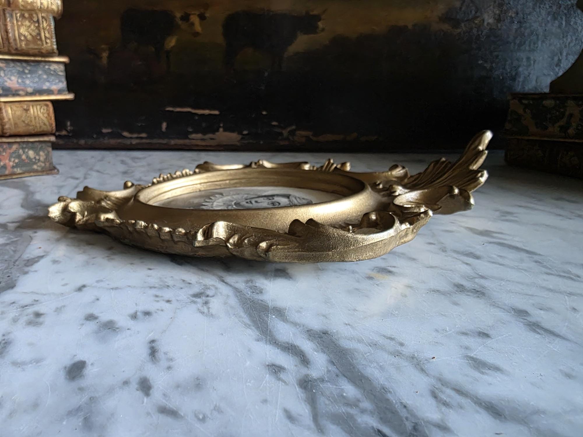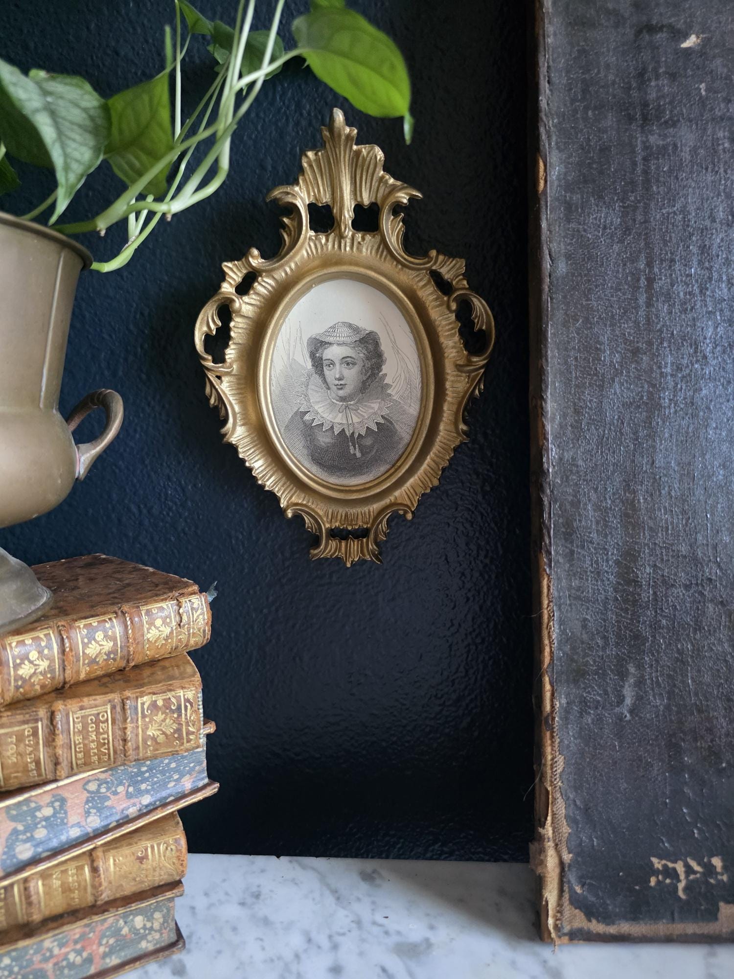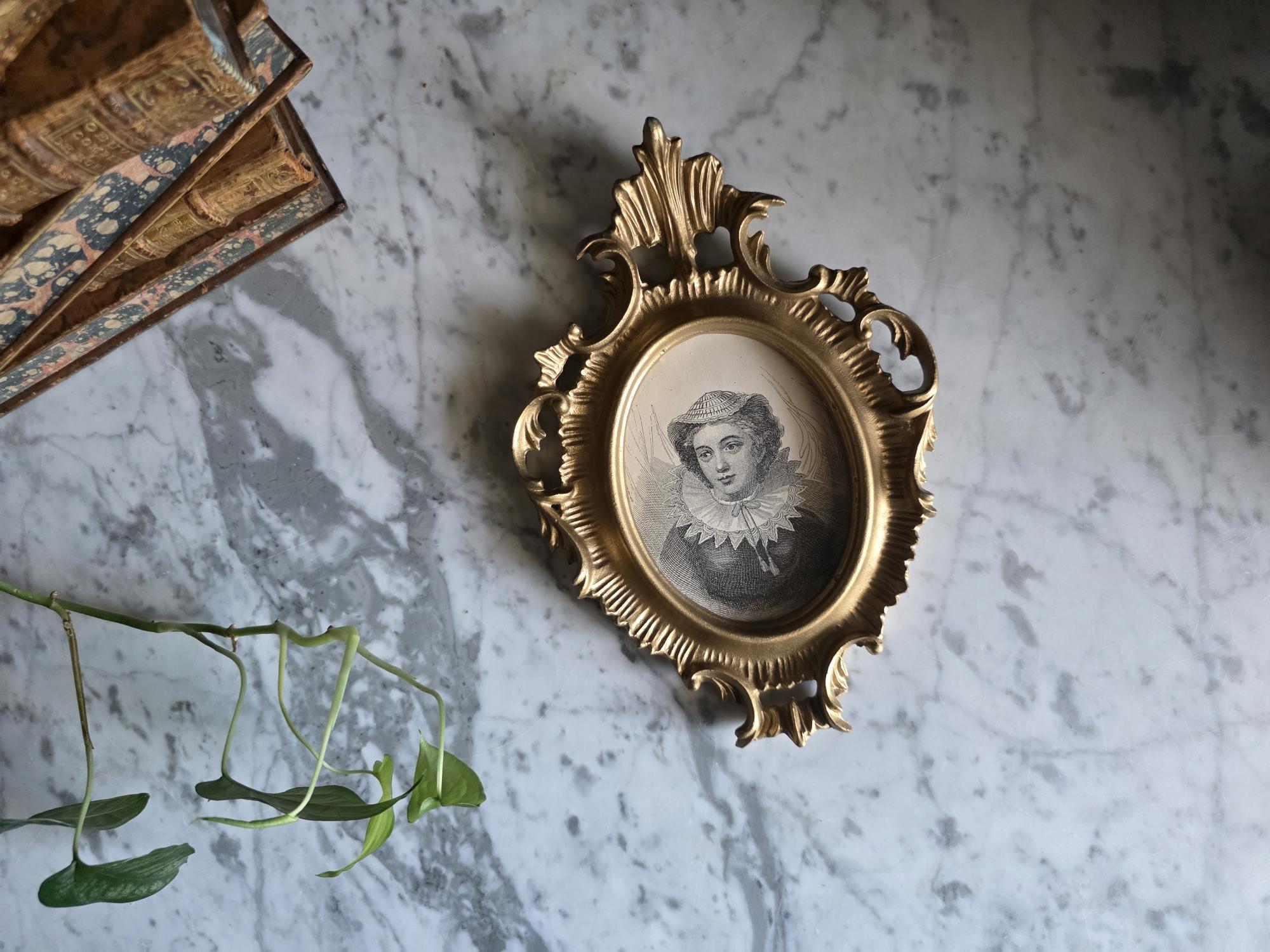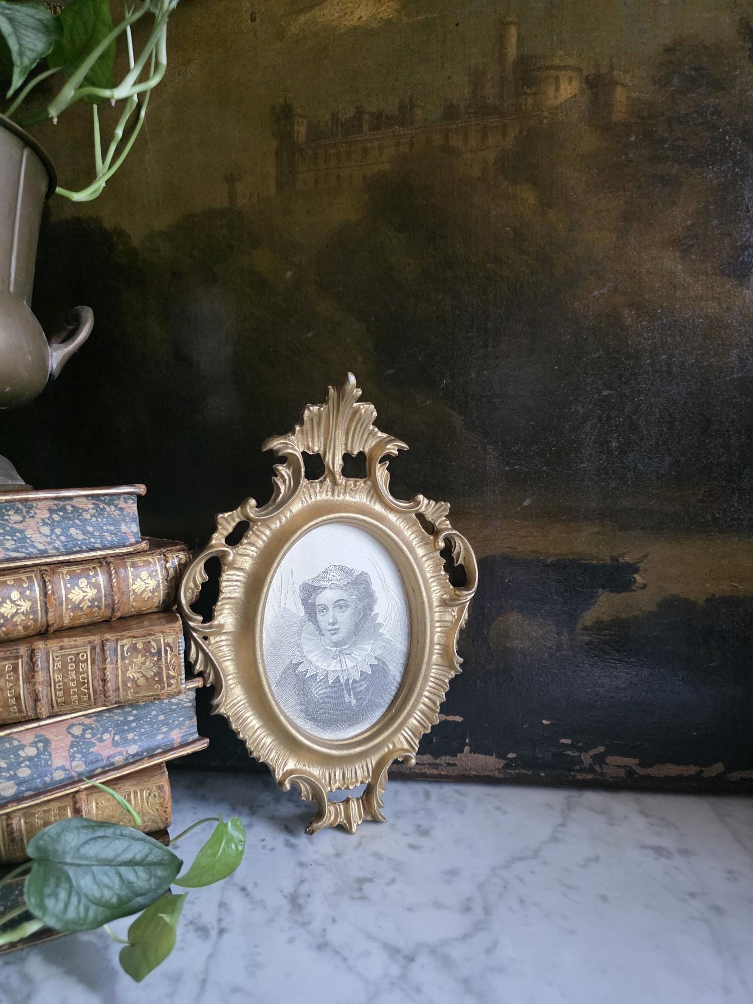 This decorative wall hanging features a classic black-and-white book illustration of Mary Queen of Scots, depicted in period attire with her signature ruff collar and cap. The portrait is displayed in a highly ornate, Rococo-style oval frame featuring elaborate scrollwork and a bright gold finish. Constructed from a lightweight resin composite, the frame is durable and ready to hang. Please note that this piece was assembled with an amateur framing technique and does not include glass; the print is exposed for an open-faced, matte presentation. While the mounting is simple, the intricate frame and historical subject make this a charming accent piece for a gallery wall, bookshelf, or dark academia-inspired vignette.