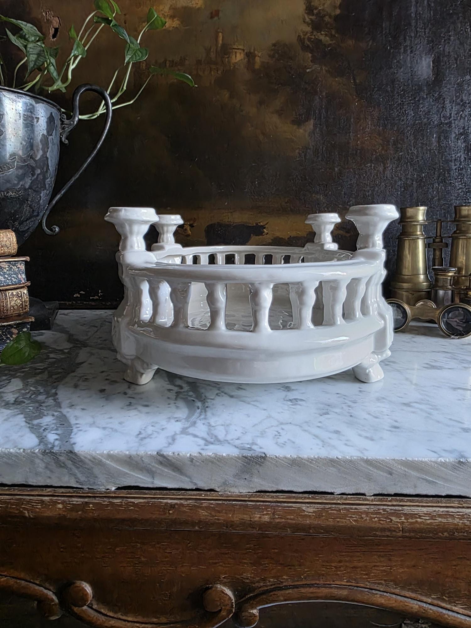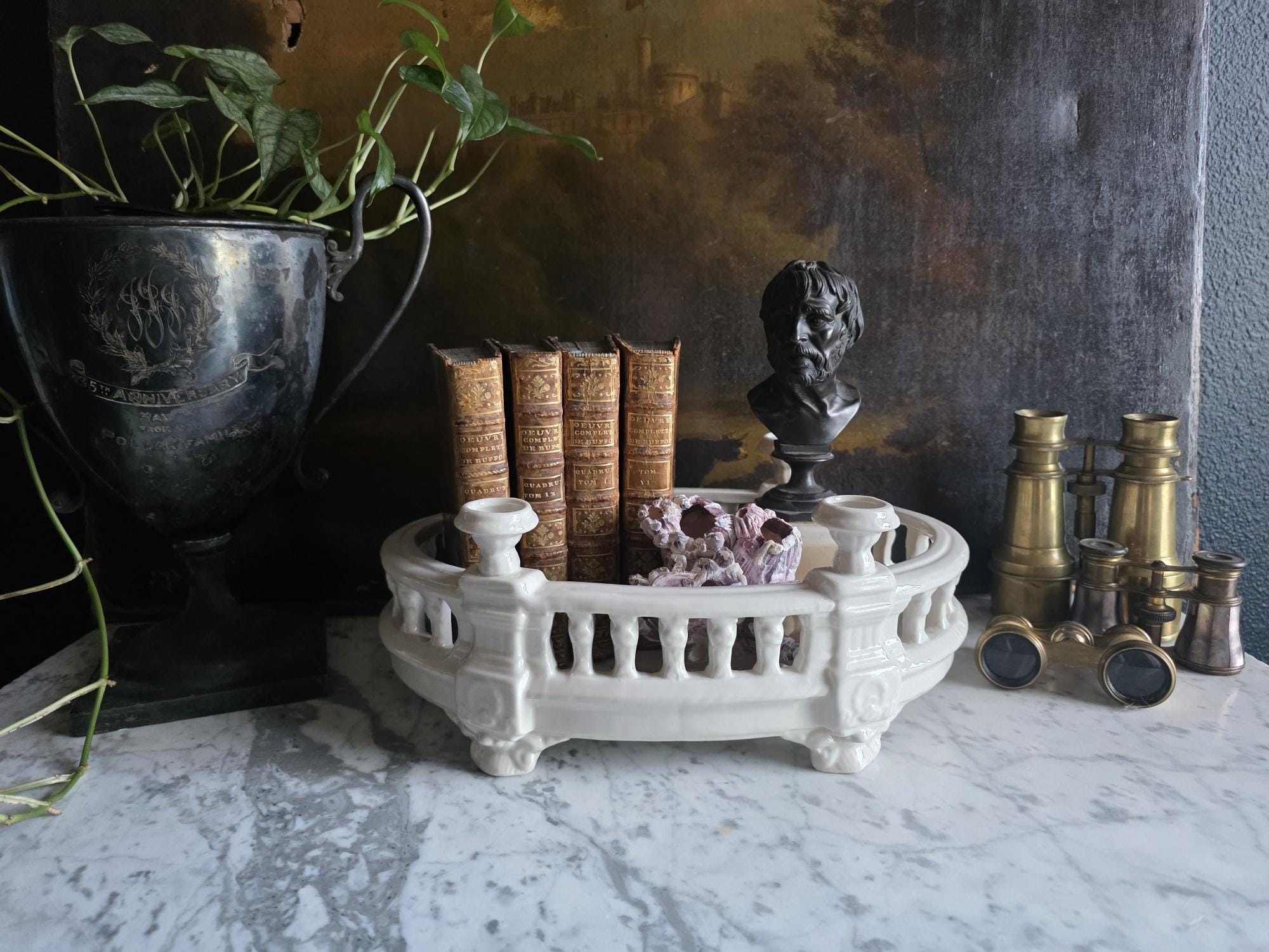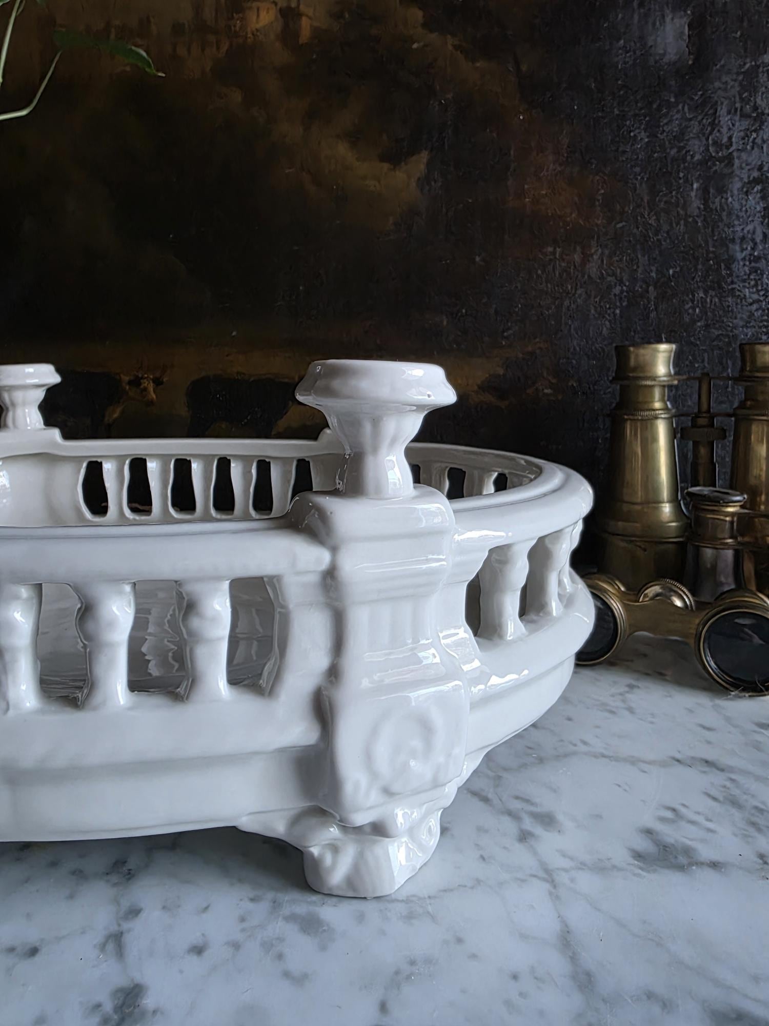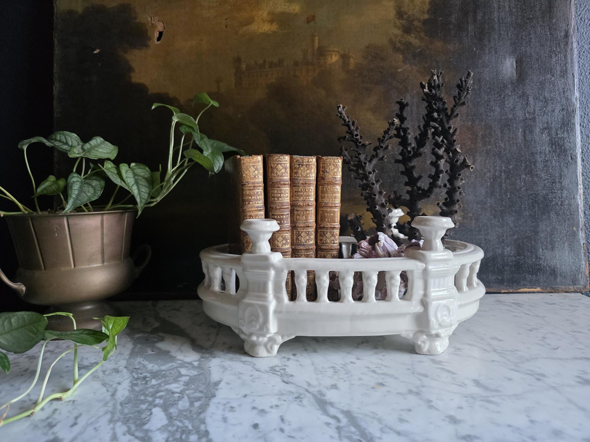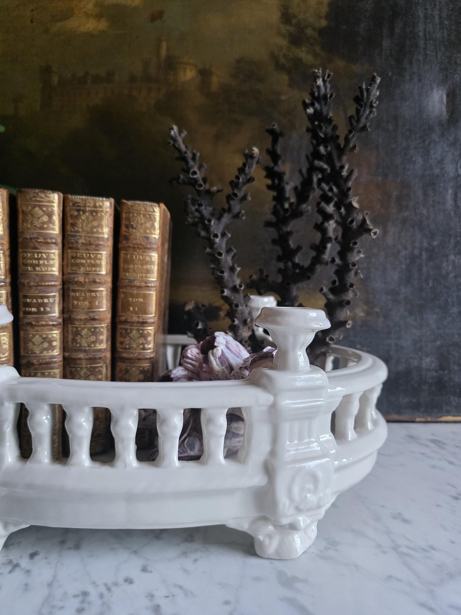 This elegant, mid-20th-century French porcelain centerpiece is designed as a miniature tabletop parterre, echoing the structured beauty of formal European gardens. The piece features a classic oval shape with a low, balustrade-style railing encircling the planting bed, punctuated by four raised corner posts topped with shallow cups—perfect for holding taper candles or small floral accents. Glazed in a glossy, creamy white, its clean lines and architectural detailing make it a versatile decorative vessel. The underside is marked with an incised circle and cross bar mark. Whether filled with moss, succulents, or seasonal blooms, this unique planter brings a touch of Neoclassical garden sophistication to any interior tablescape. Function perfectly as an entry way catchall and decorative tray and display.