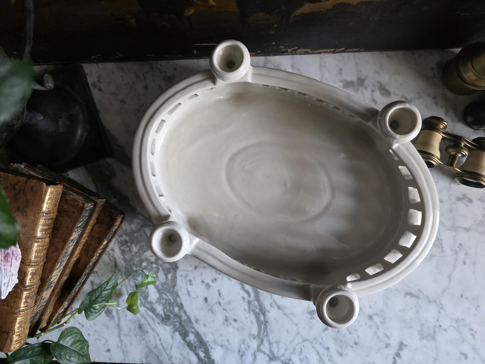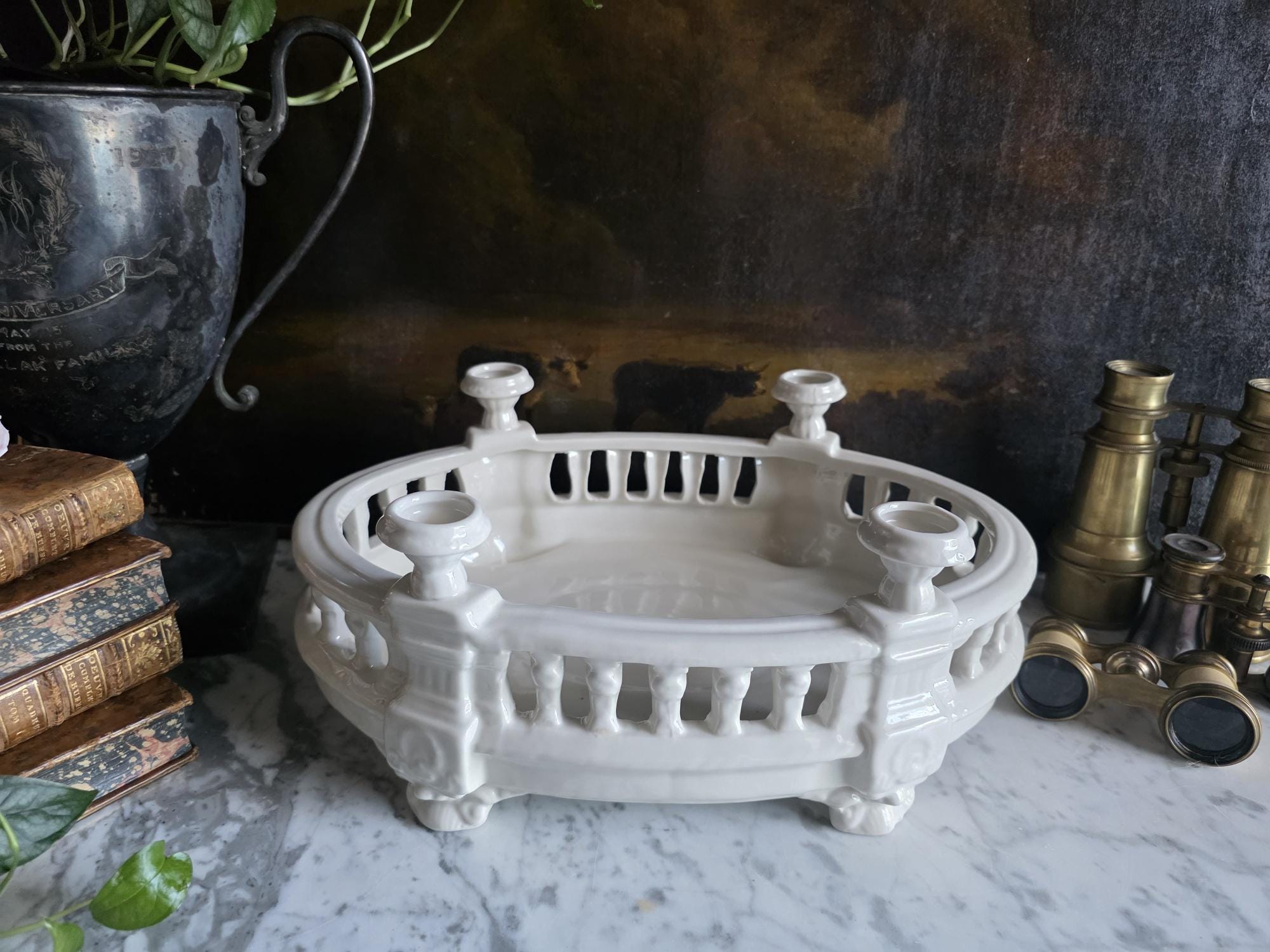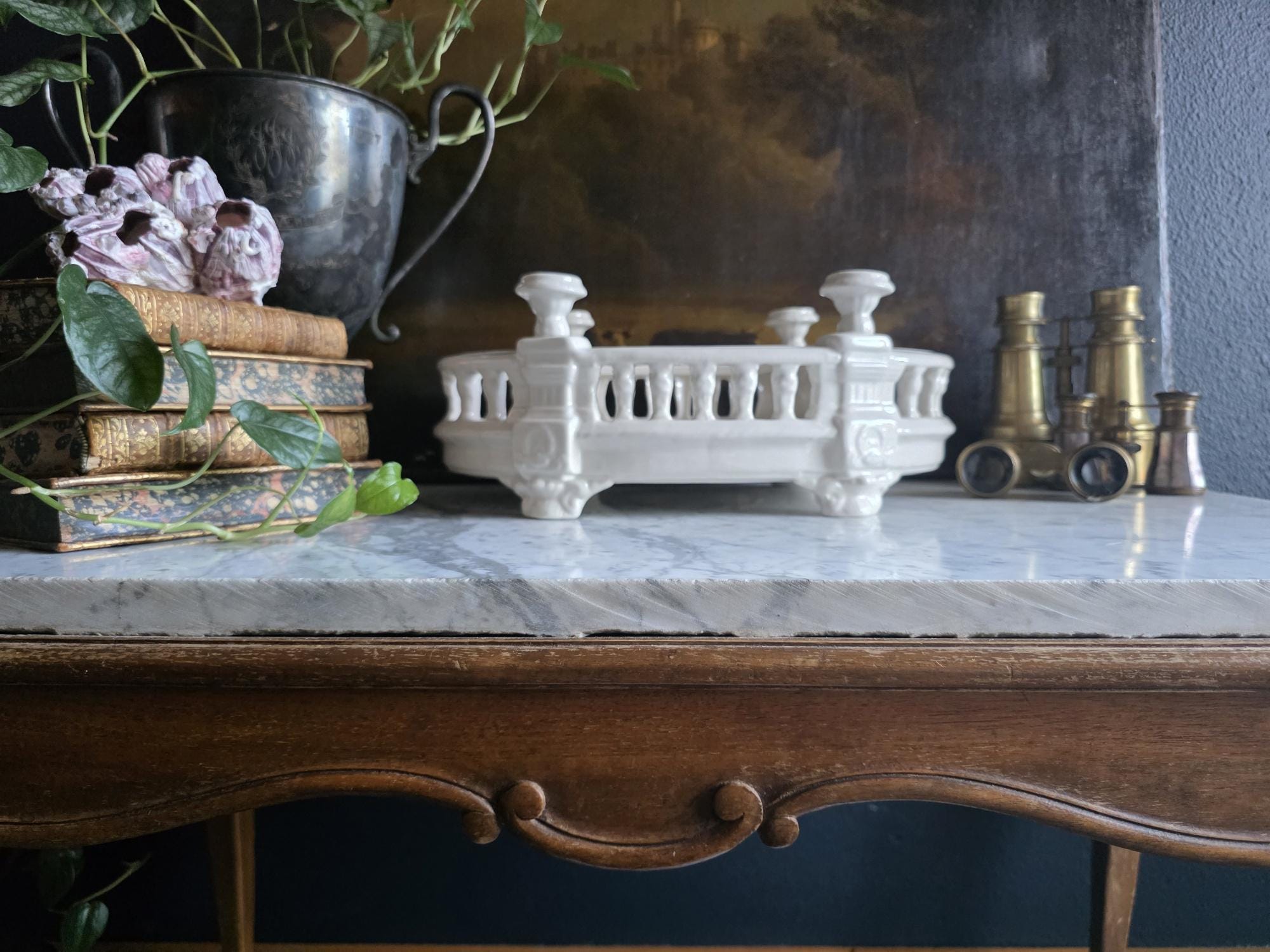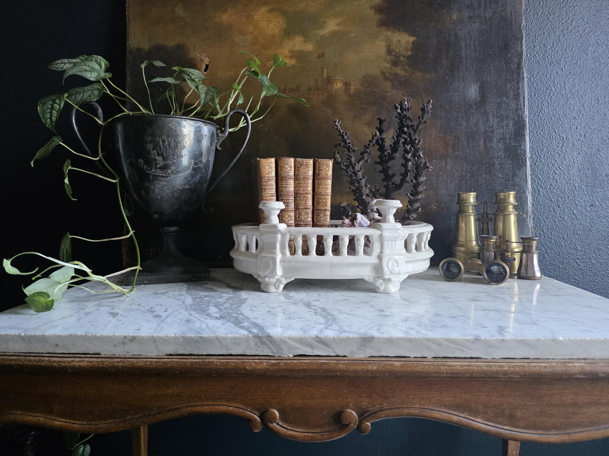 This elegant, mid-20th-century French porcelain centerpiece is designed as a miniature tabletop parterre, echoing the structured beauty of formal European gardens. The piece features a classic oval shape with a low, balustrade-style railing encircling the planting bed, punctuated by four raised corner posts topped with shallow cups—perfect for holding taper candles or small floral accents. Glazed in a glossy, creamy white, its clean lines and architectural detailing make it a versatile decorative vessel. The underside is marked with an incised circle and cross bar mark. Whether filled with moss, succulents, or seasonal blooms, this unique planter brings a touch of Neoclassical garden sophistication to any interior tablescape. Function perfectly as an entry way catchall and decorative tray and display.