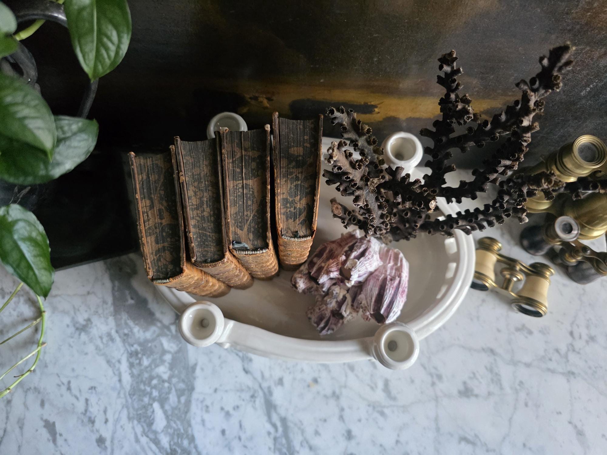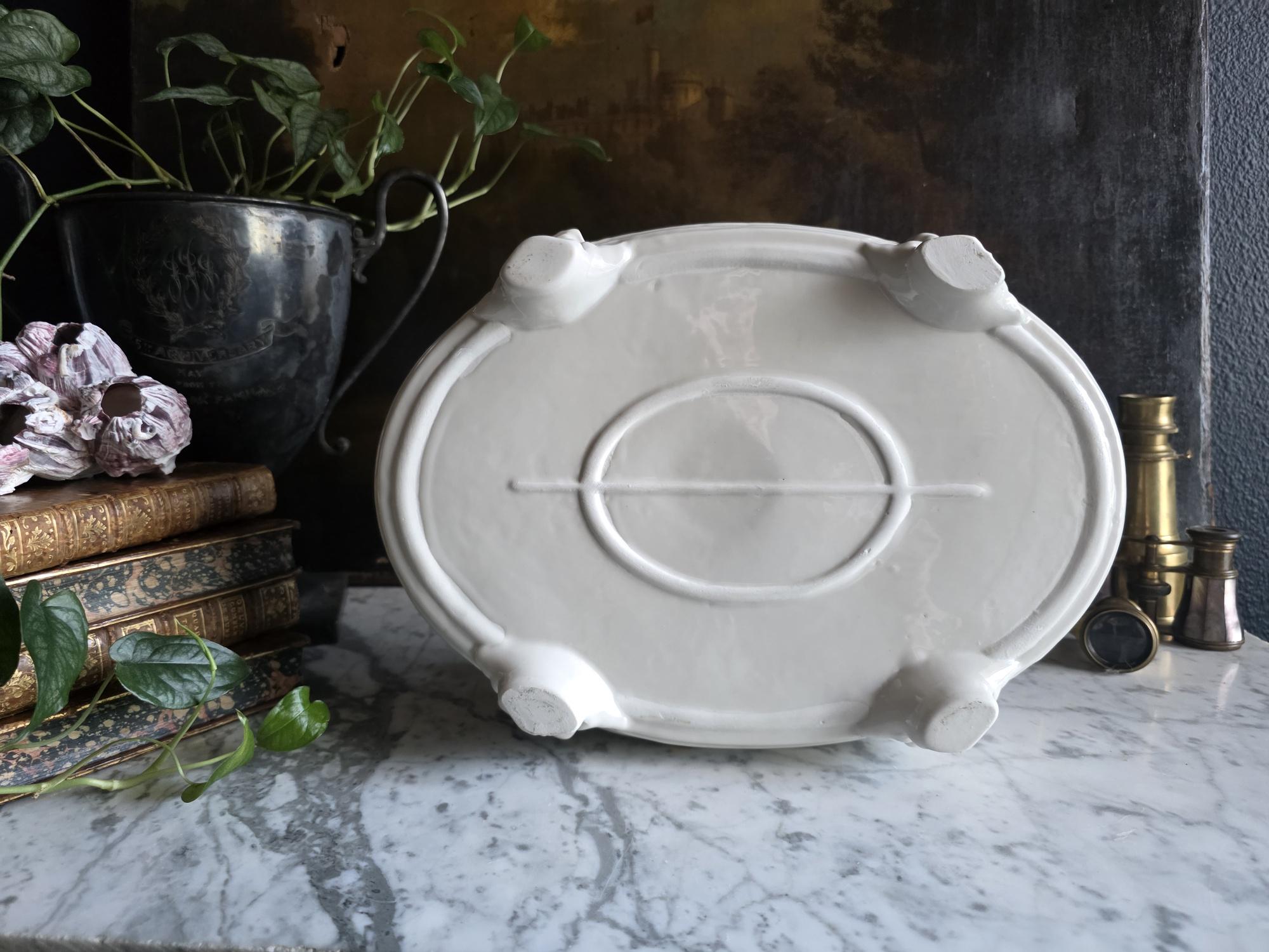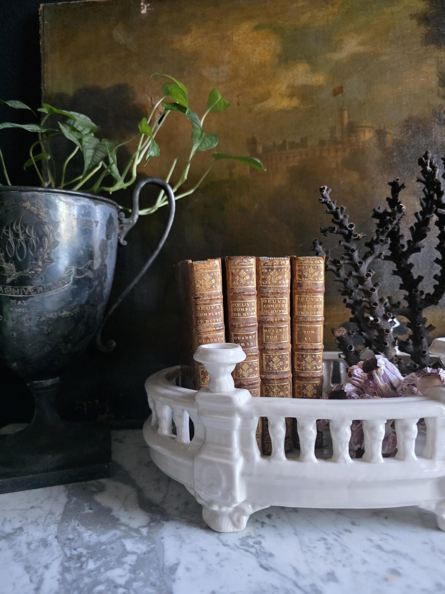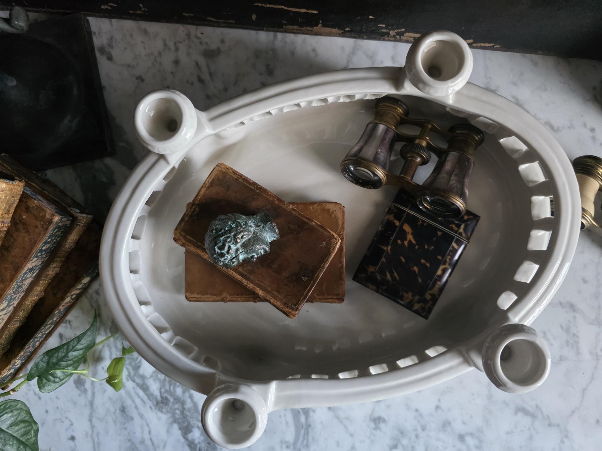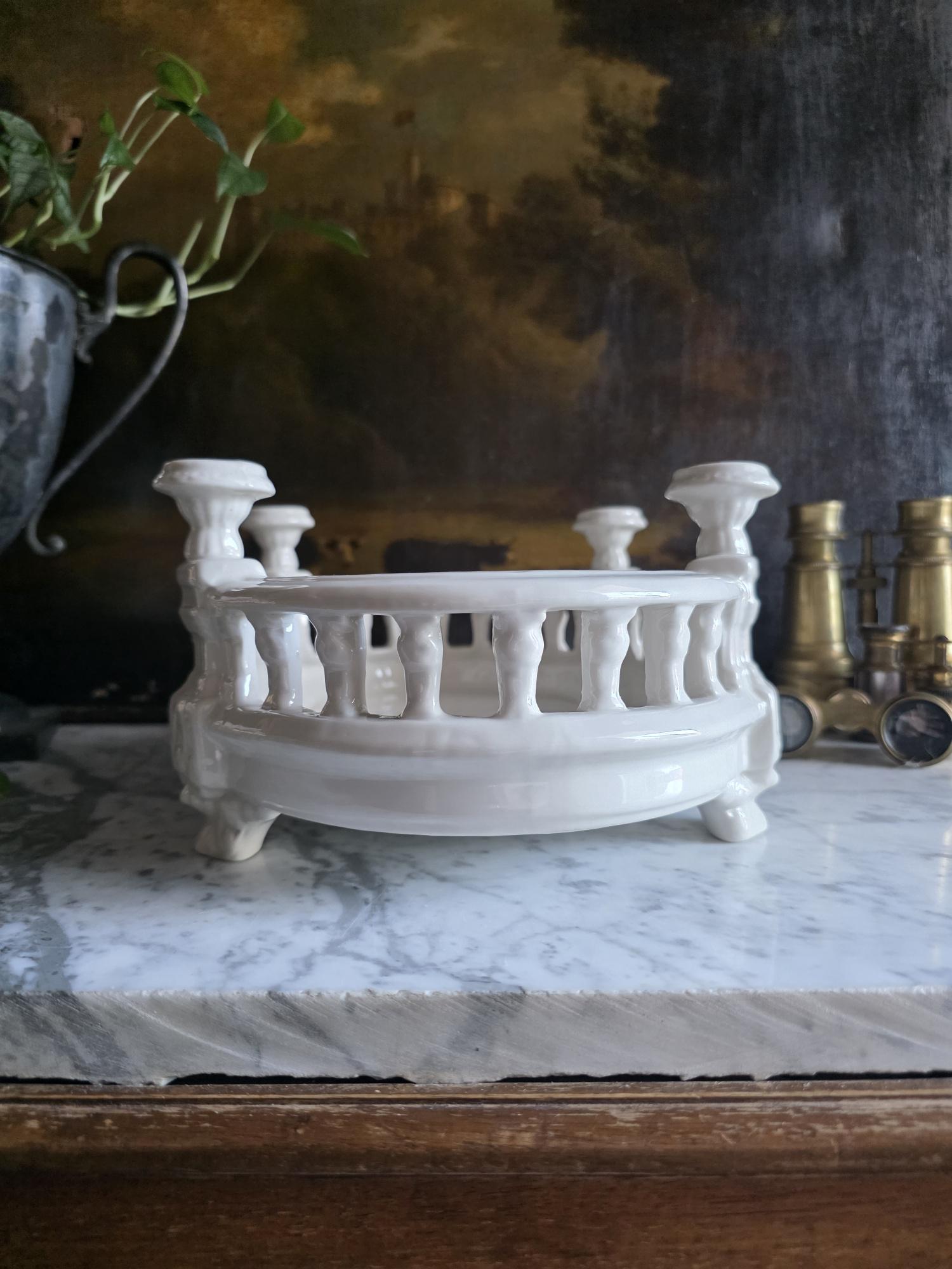 This elegant, mid-20th-century French porcelain centerpiece is designed as a miniature tabletop parterre, echoing the structured beauty of formal European gardens. The piece features a classic oval shape with a low, balustrade-style railing encircling the planting bed, punctuated by four raised corner posts topped with shallow cups—perfect for holding taper candles or small floral accents. Glazed in a glossy, creamy white, its clean lines and architectural detailing make it a versatile decorative vessel. The underside is marked with an incised circle and cross bar mark. Whether filled with moss, succulents, or seasonal blooms, this unique planter brings a touch of Neoclassical garden sophistication to any interior tablescape. Function perfectly as an entry way catchall and decorative tray and display.
