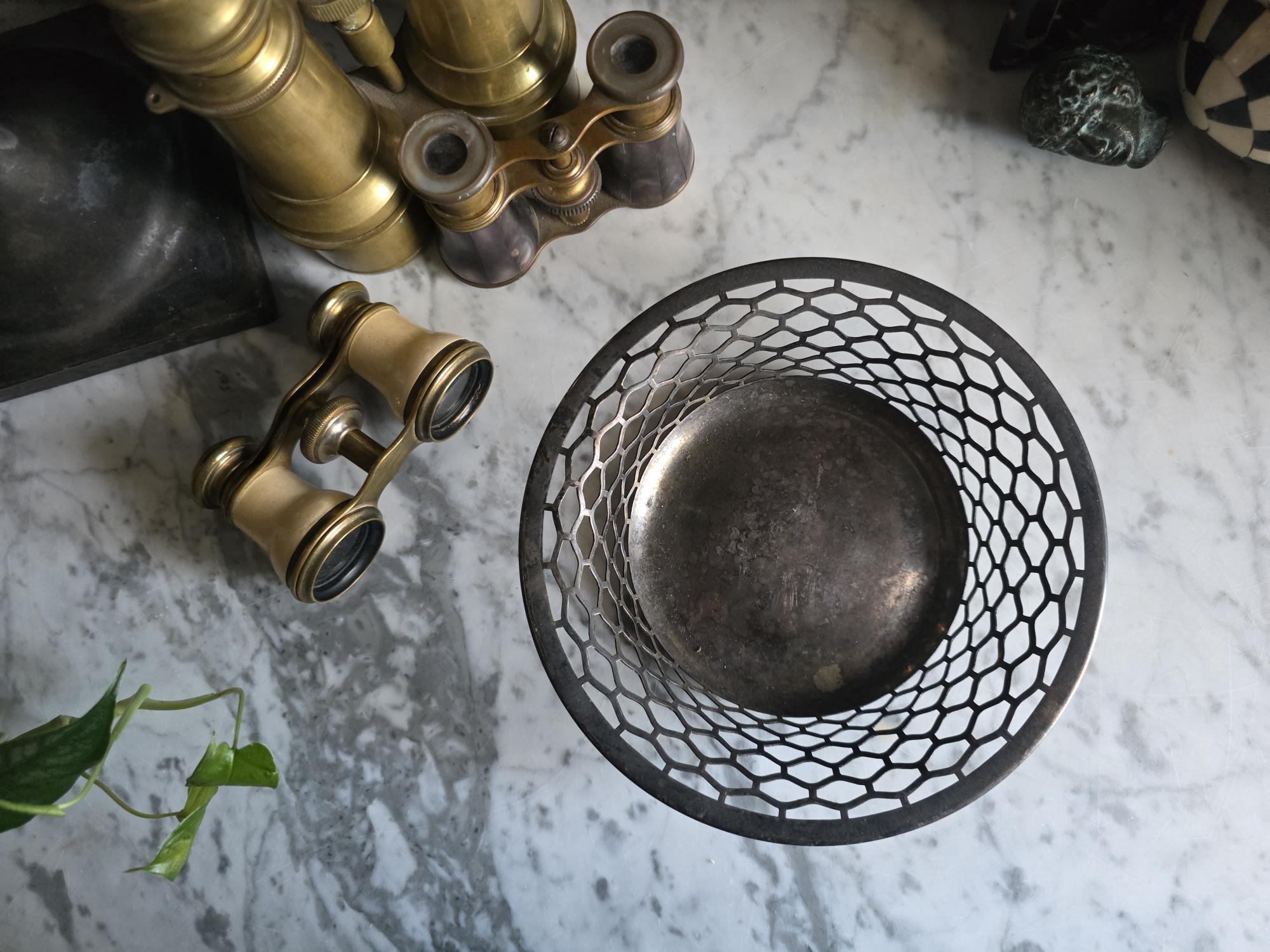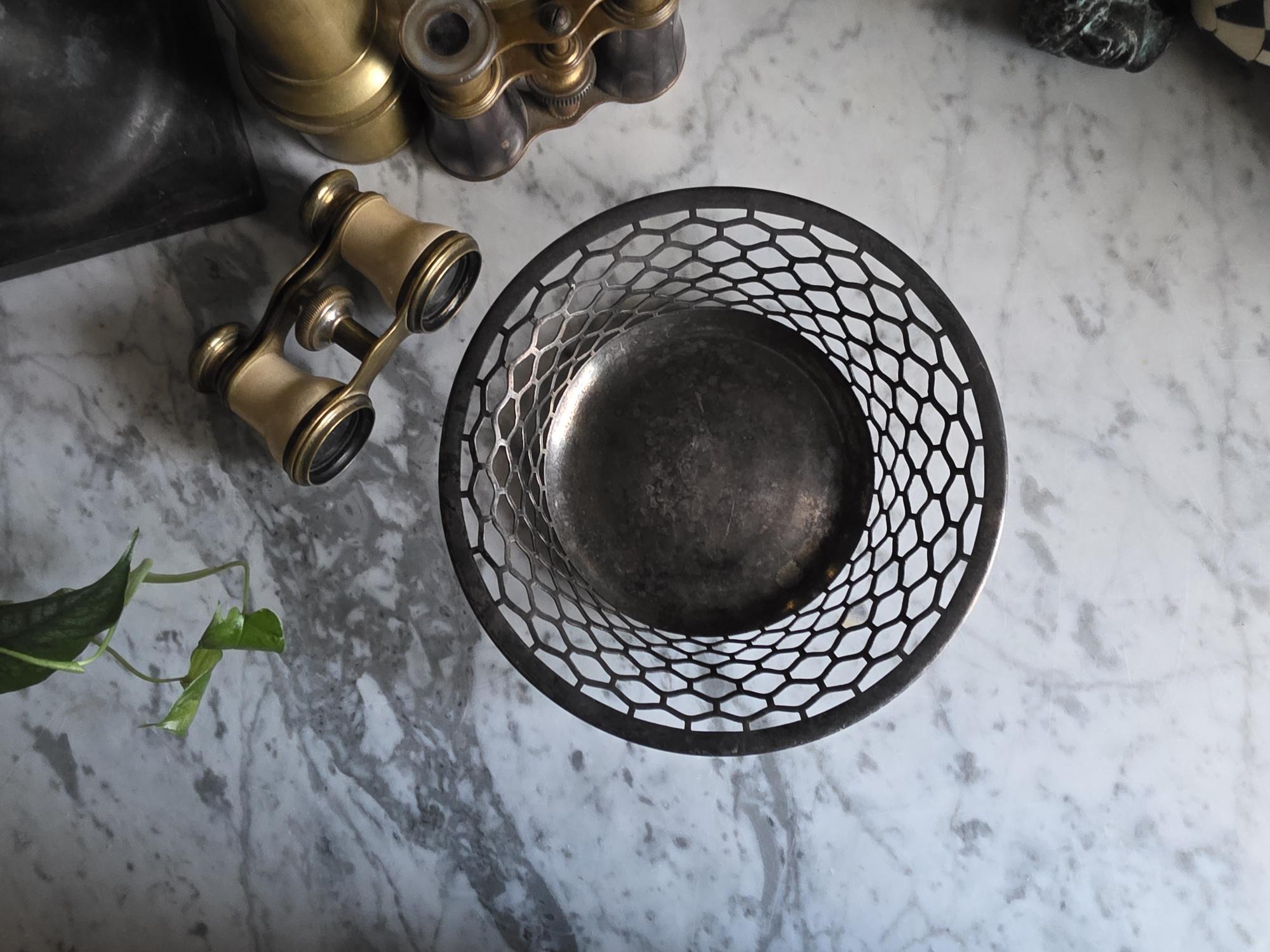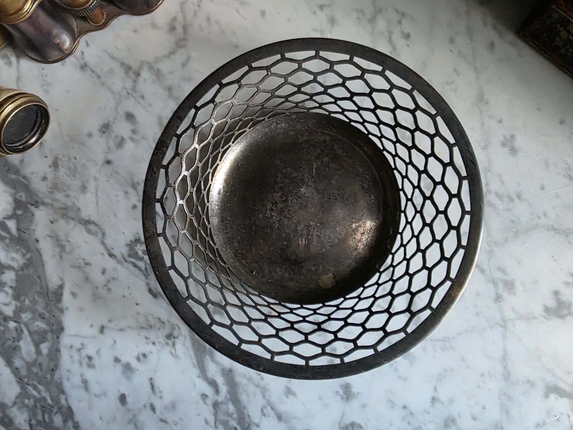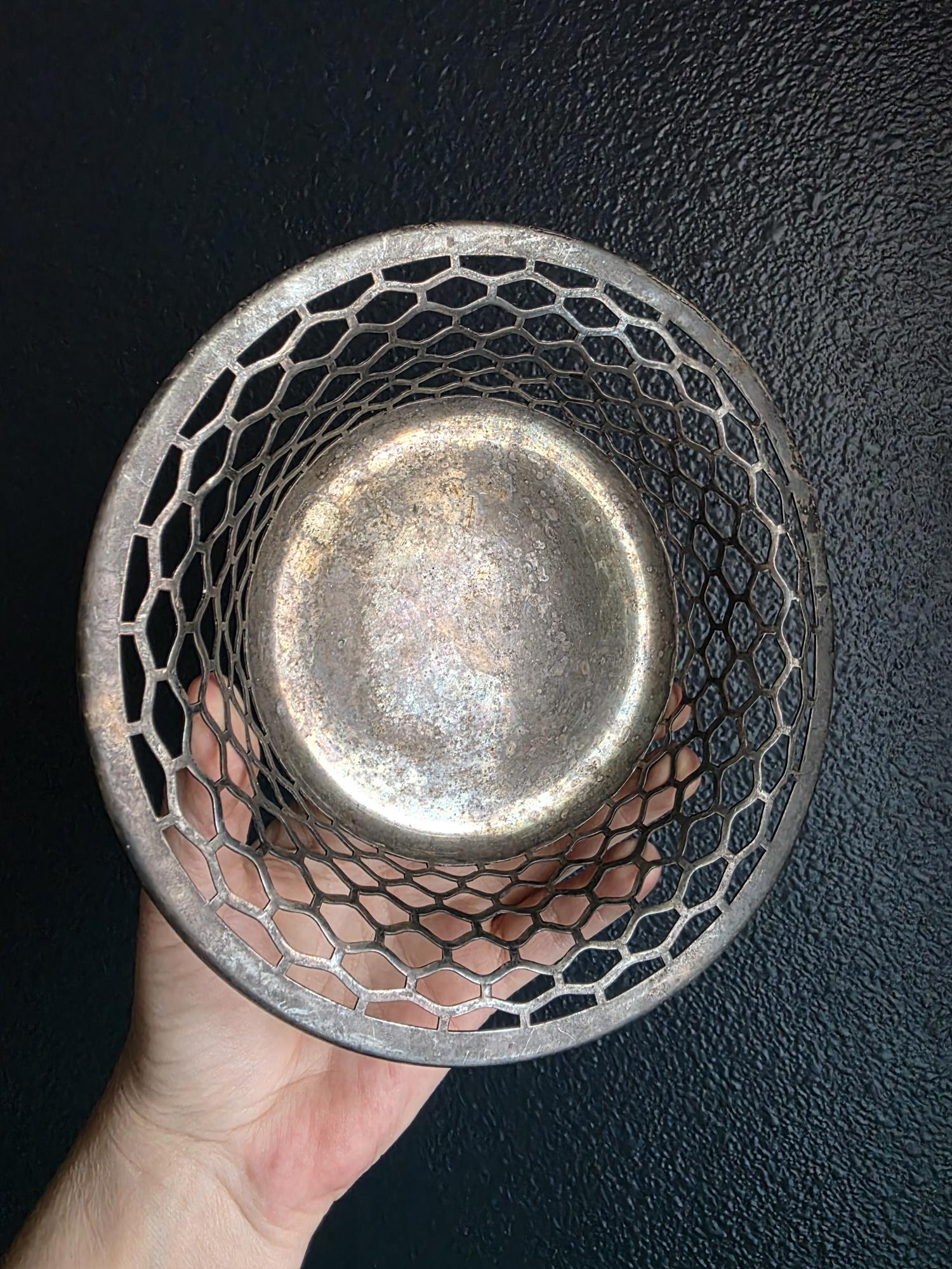 This charming antique trinket or candy dish is a fine example of early 20th-century silver plate, manufactured by the Canadian branch of the renowned Meriden Britannia Company in Hamilton, Ontario. The piece features a distinctively geometric, reticulated (pierced) honeycomb or hexagonal lattice design along the sides, rising to a smooth, rolled rim. It rests on three small, spherical ball feet that provide a stable and elegant lift. The underside is clearly stamped with the maker's mark: "EPNS / MADE AND GUARANTEED BY / MERIDEN B. CO. / HAMILTON, CANADA" along with the scales logo and model number 0651. Crafted from Electro-Plated Nickel Silver (EPNS), this dish has a solid base that shows signs of use consistent with its age, including visible tarnish (patina) and surface scuffing in the well. It is an ideal size for use as a jewelry catchall, a bonbon dish, or simply as a decorative accent for a vanity or side table.