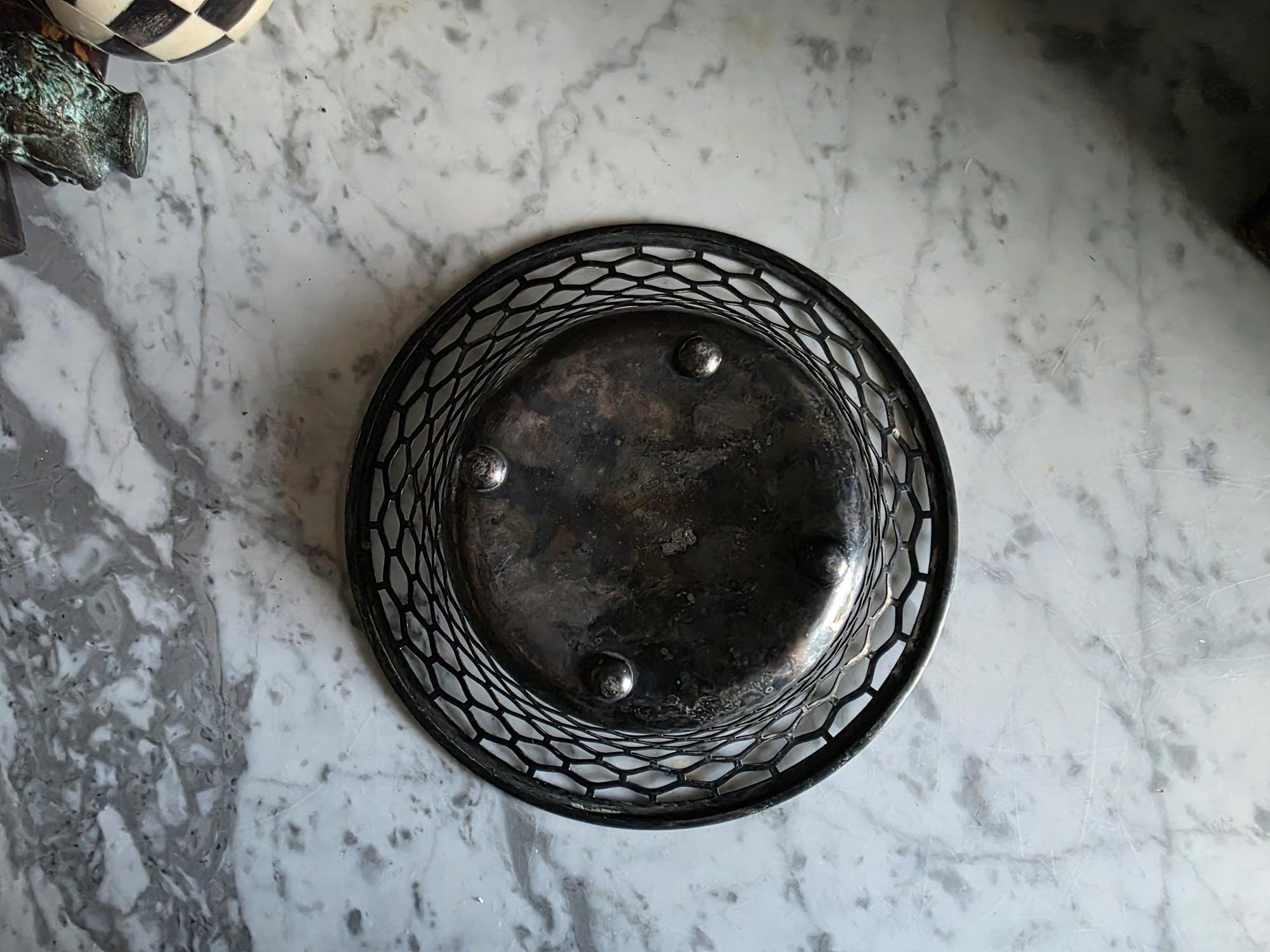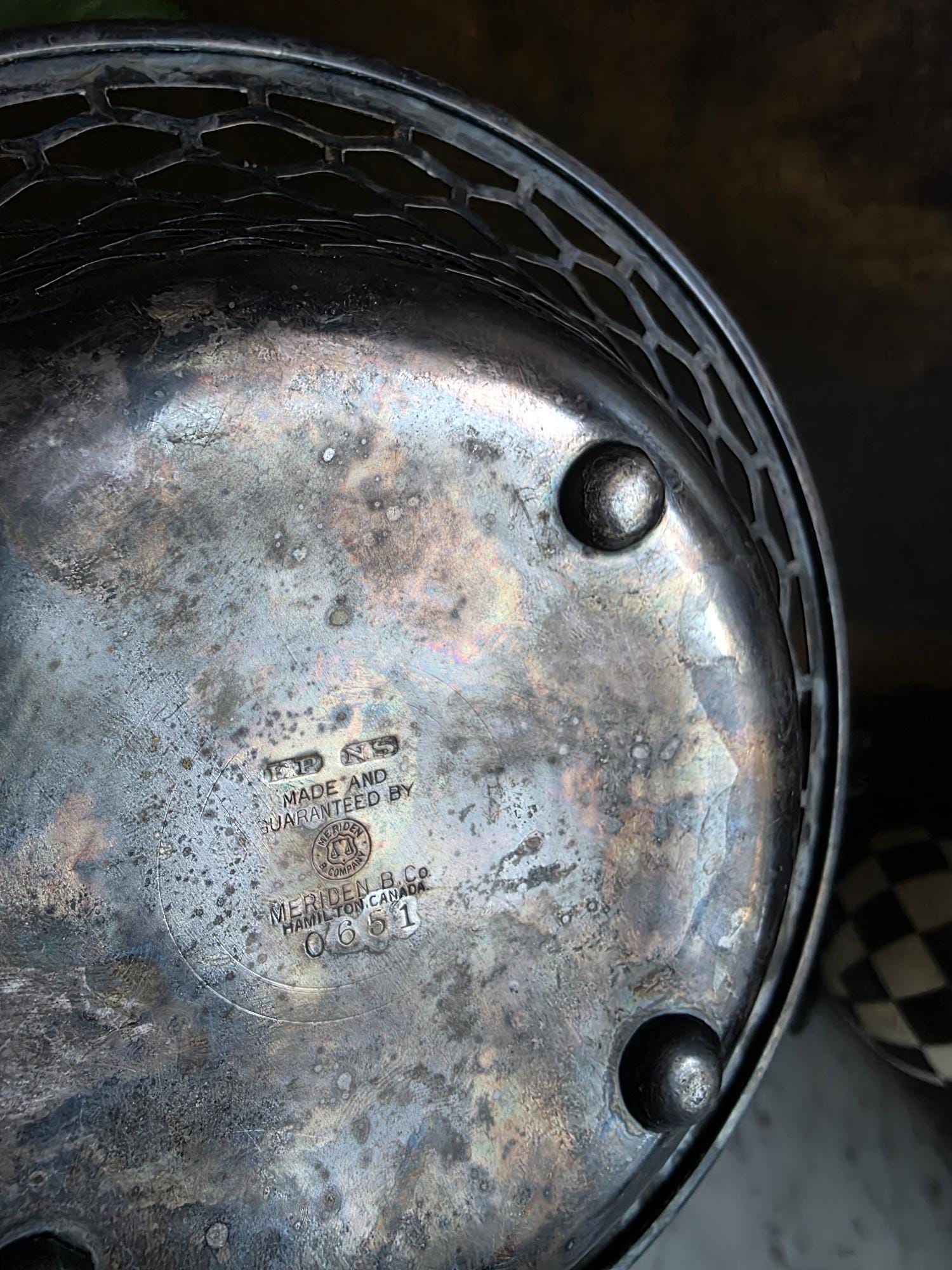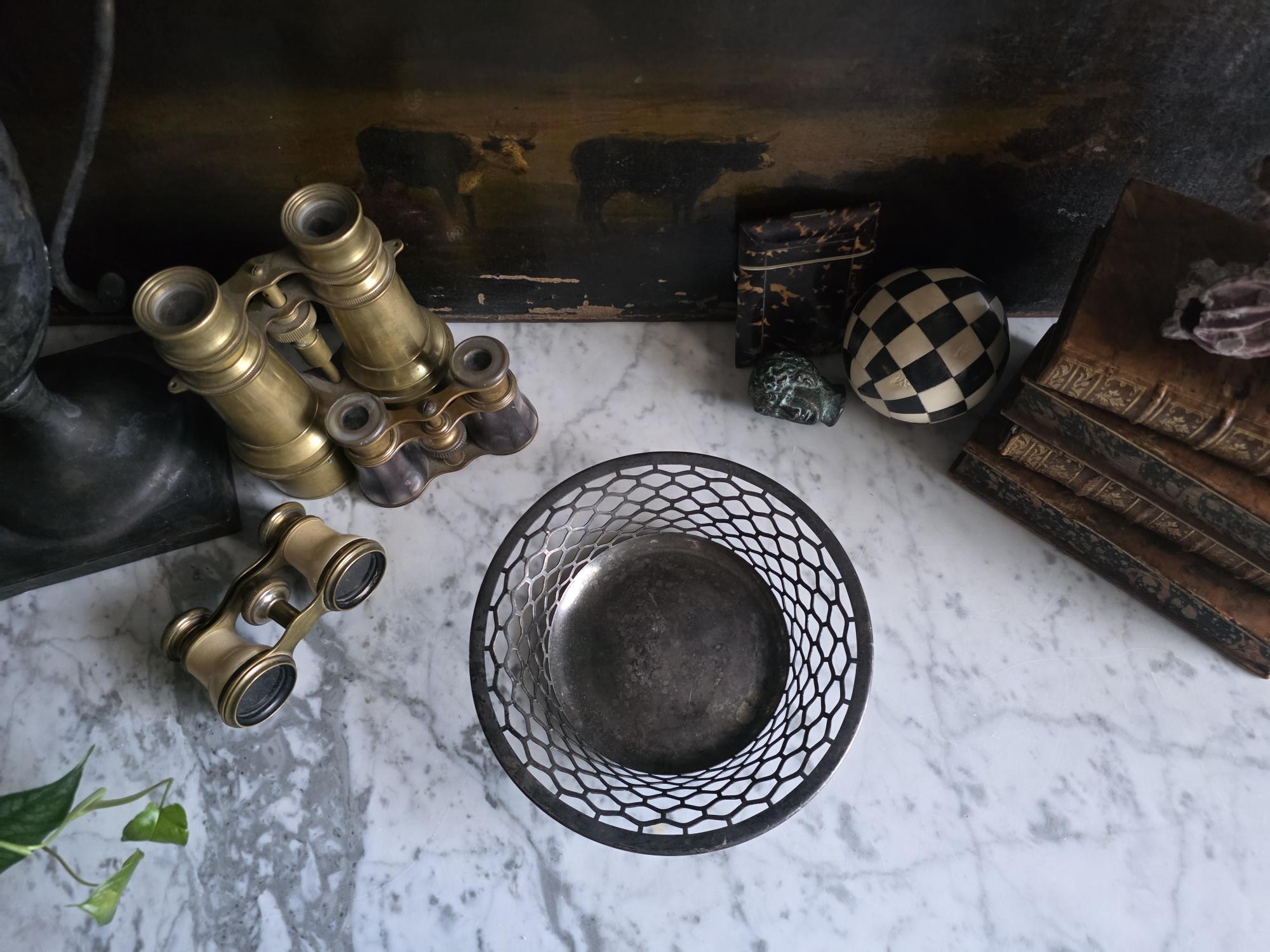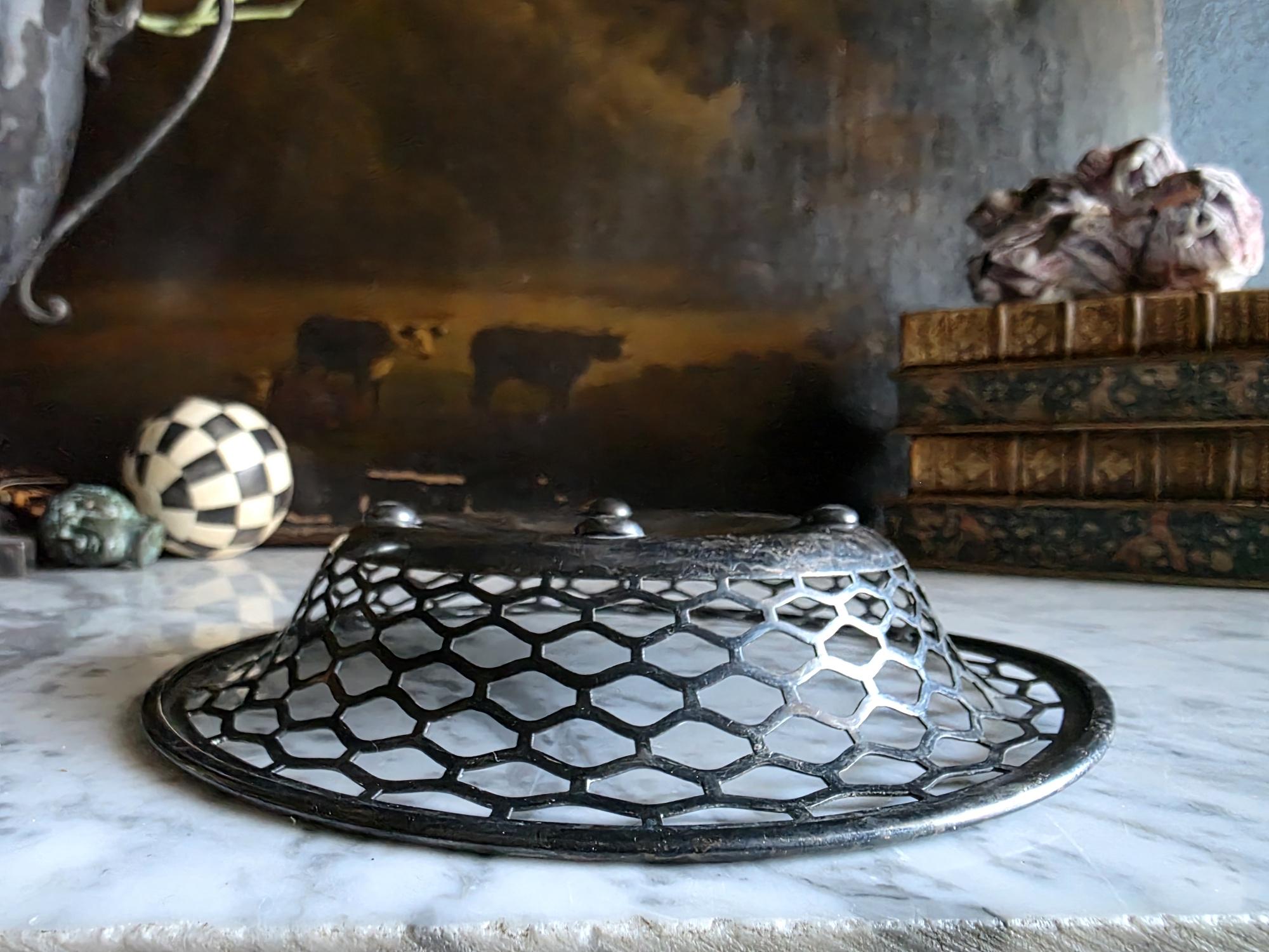 This charming antique trinket or candy dish is a fine example of early 20th-century silver plate, manufactured by the Canadian branch of the renowned Meriden Britannia Company in Hamilton, Ontario. The piece features a distinctively geometric, reticulated (pierced) honeycomb or hexagonal lattice design along the sides, rising to a smooth, rolled rim. It rests on three small, spherical ball feet that provide a stable and elegant lift. The underside is clearly stamped with the maker's mark: "EPNS / MADE AND GUARANTEED BY / MERIDEN B. CO. / HAMILTON, CANADA" along with the scales logo and model number 0651. Crafted from Electro-Plated Nickel Silver (EPNS), this dish has a solid base that shows signs of use consistent with its age, including visible tarnish (patina) and surface scuffing in the well. It is an ideal size for use as a jewelry catchall, a bonbon dish, or simply as a decorative accent for a vanity or side table.