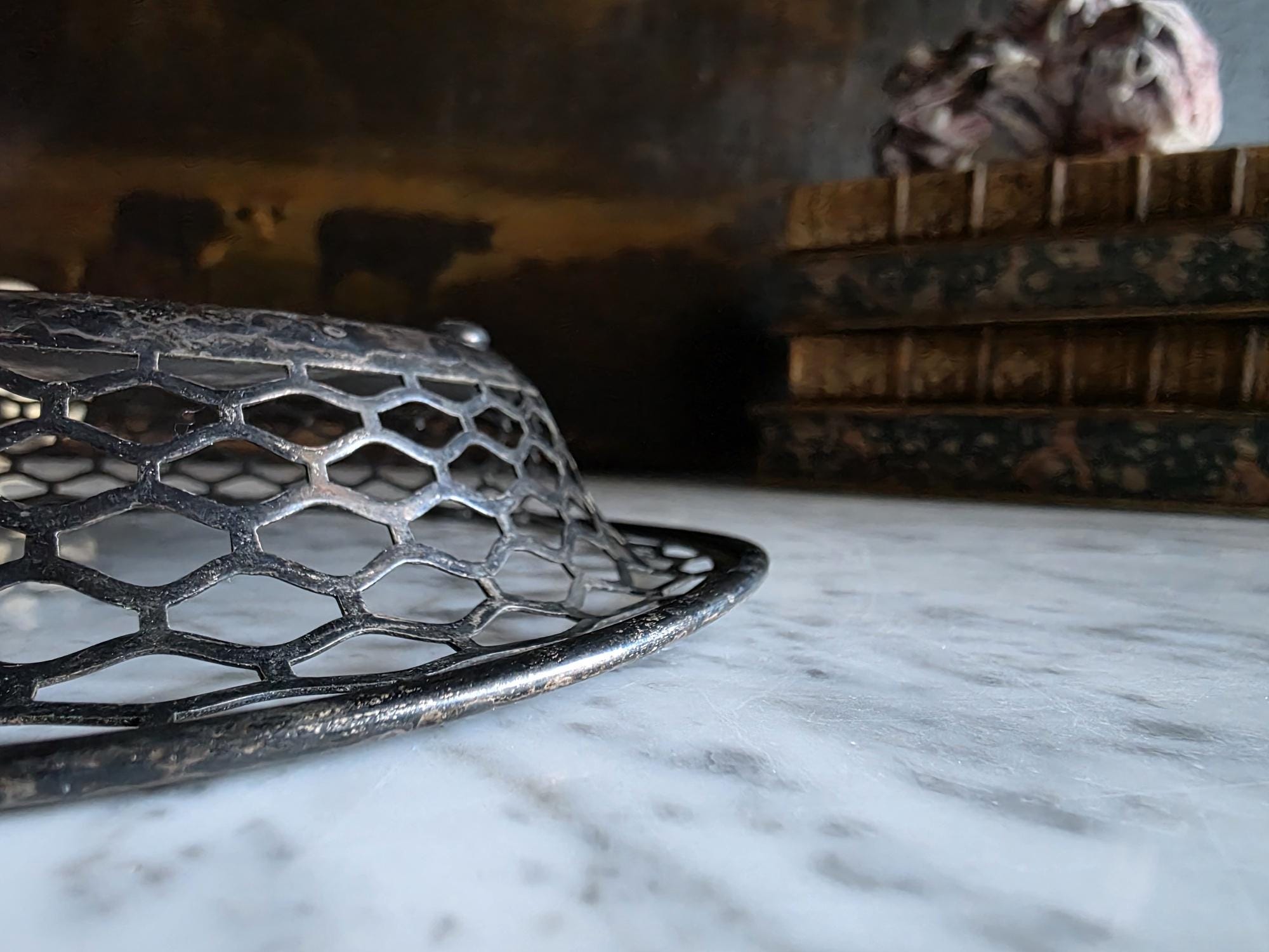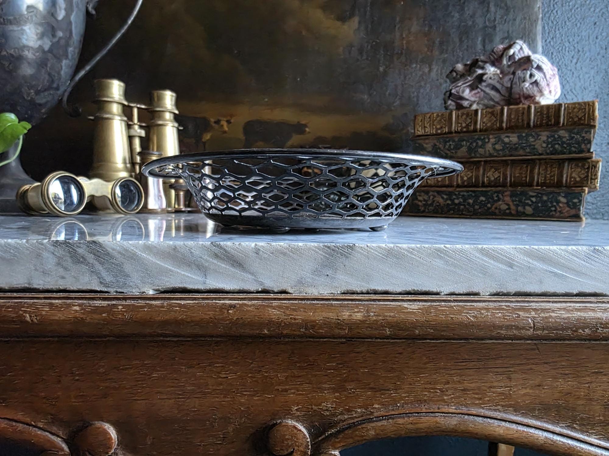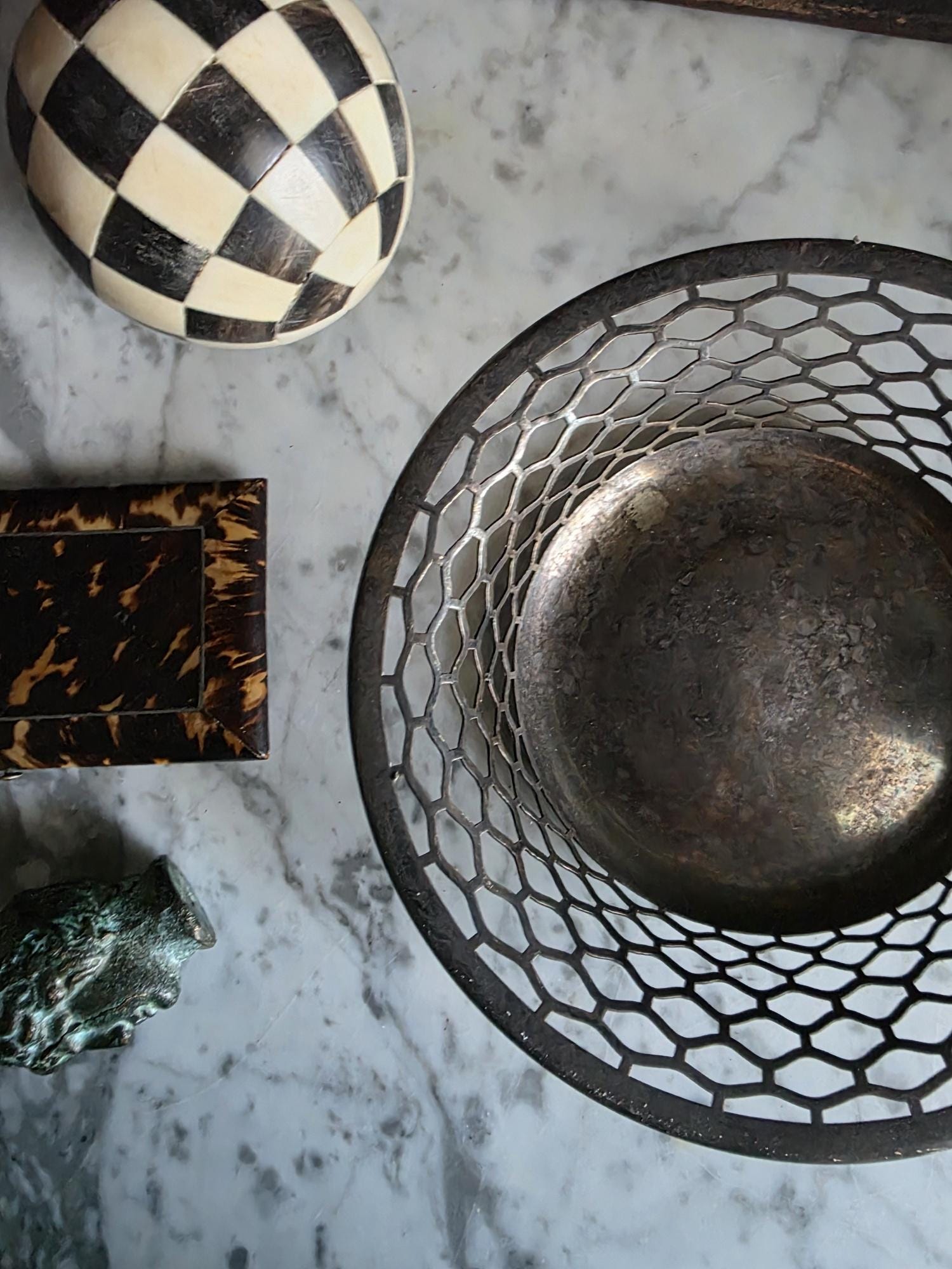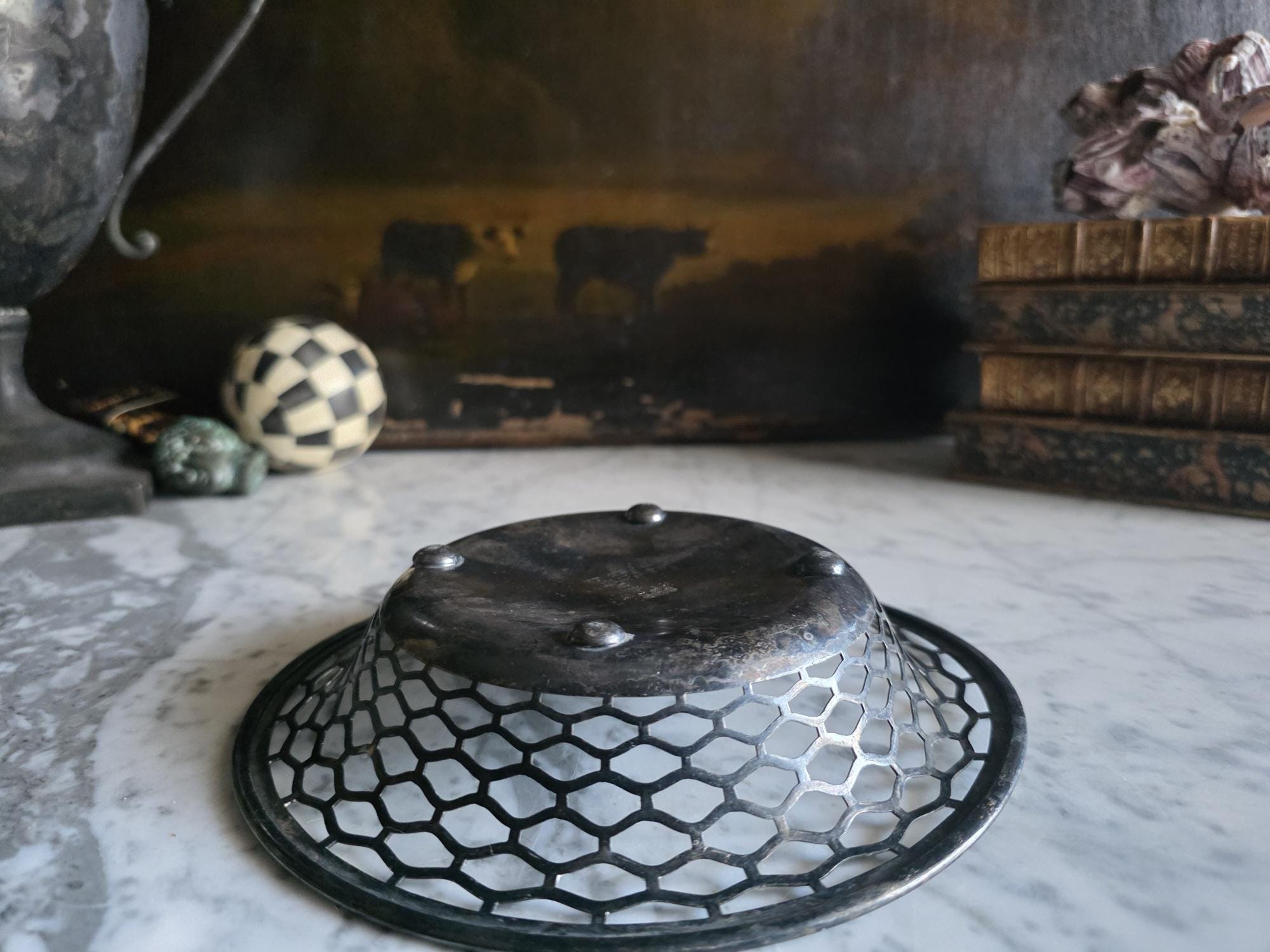 This charming antique trinket or candy dish is a fine example of early 20th-century silver plate, manufactured by the Canadian branch of the renowned Meriden Britannia Company in Hamilton, Ontario. The piece features a distinctively geometric, reticulated (pierced) honeycomb or hexagonal lattice design along the sides, rising to a smooth, rolled rim. It rests on three small, spherical ball feet that provide a stable and elegant lift. The underside is clearly stamped with the maker's mark: "EPNS / MADE AND GUARANTEED BY / MERIDEN B. CO. / HAMILTON, CANADA" along with the scales logo and model number 0651. Crafted from Electro-Plated Nickel Silver (EPNS), this dish has a solid base that shows signs of use consistent with its age, including visible tarnish (patina) and surface scuffing in the well. It is an ideal size for use as a jewelry catchall, a bonbon dish, or simply as a decorative accent for a vanity or side table.